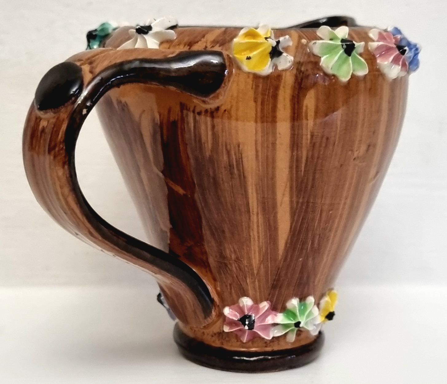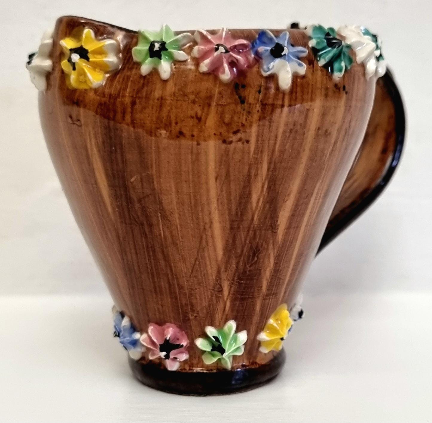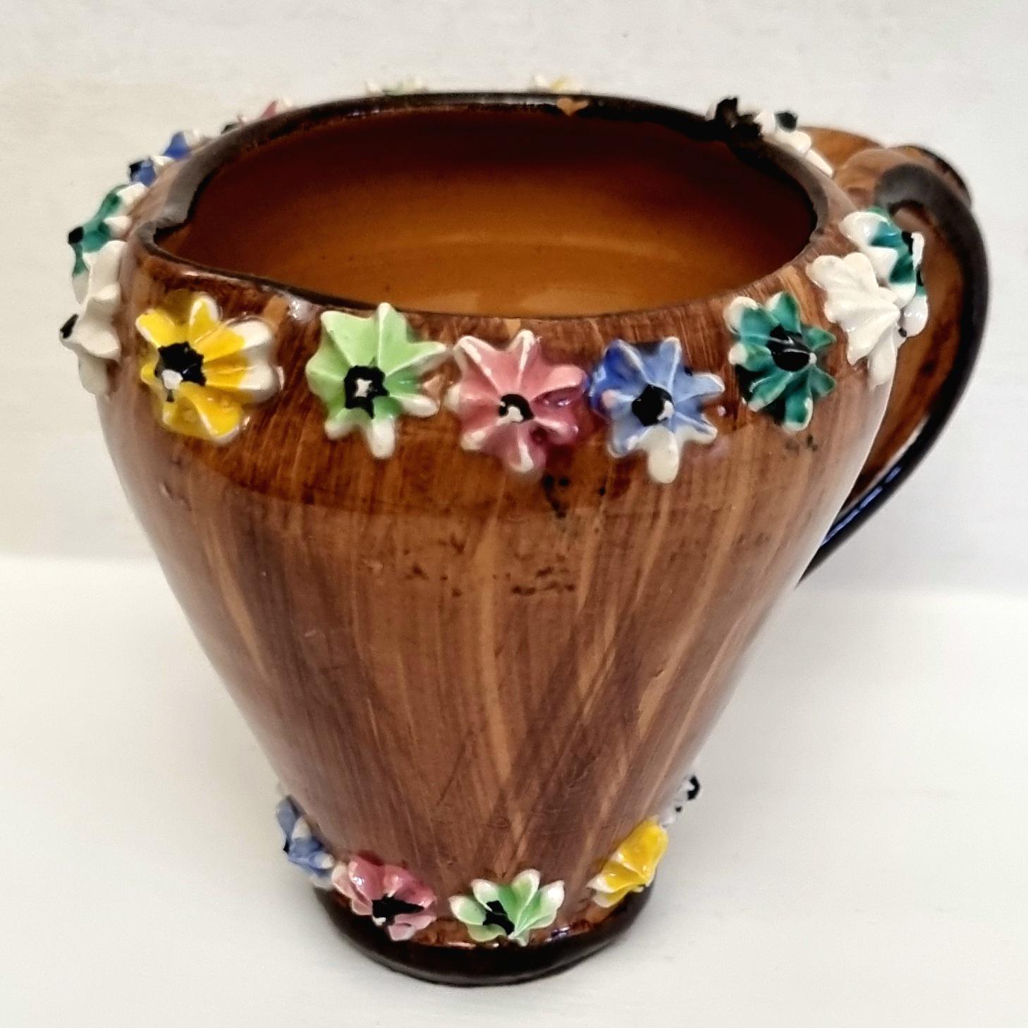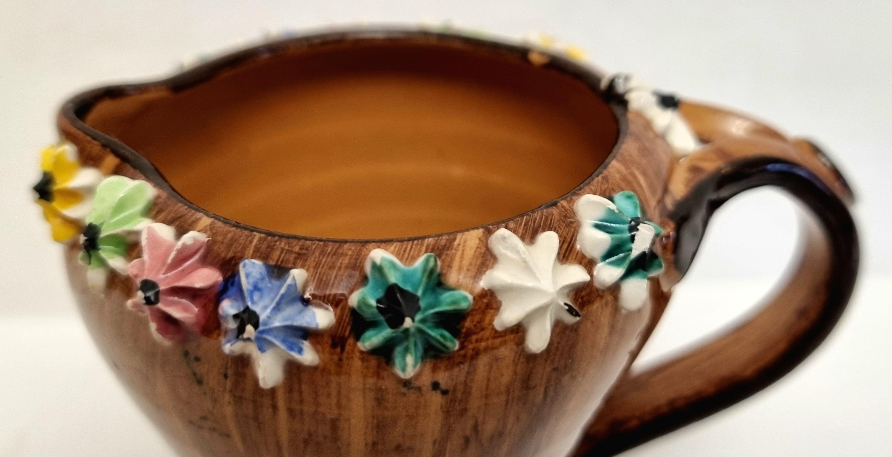The jug is decorated with hand-applied, small, multi-coloured ceramic flowers around the rim and base.