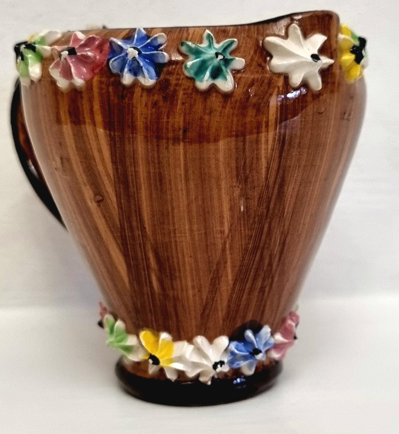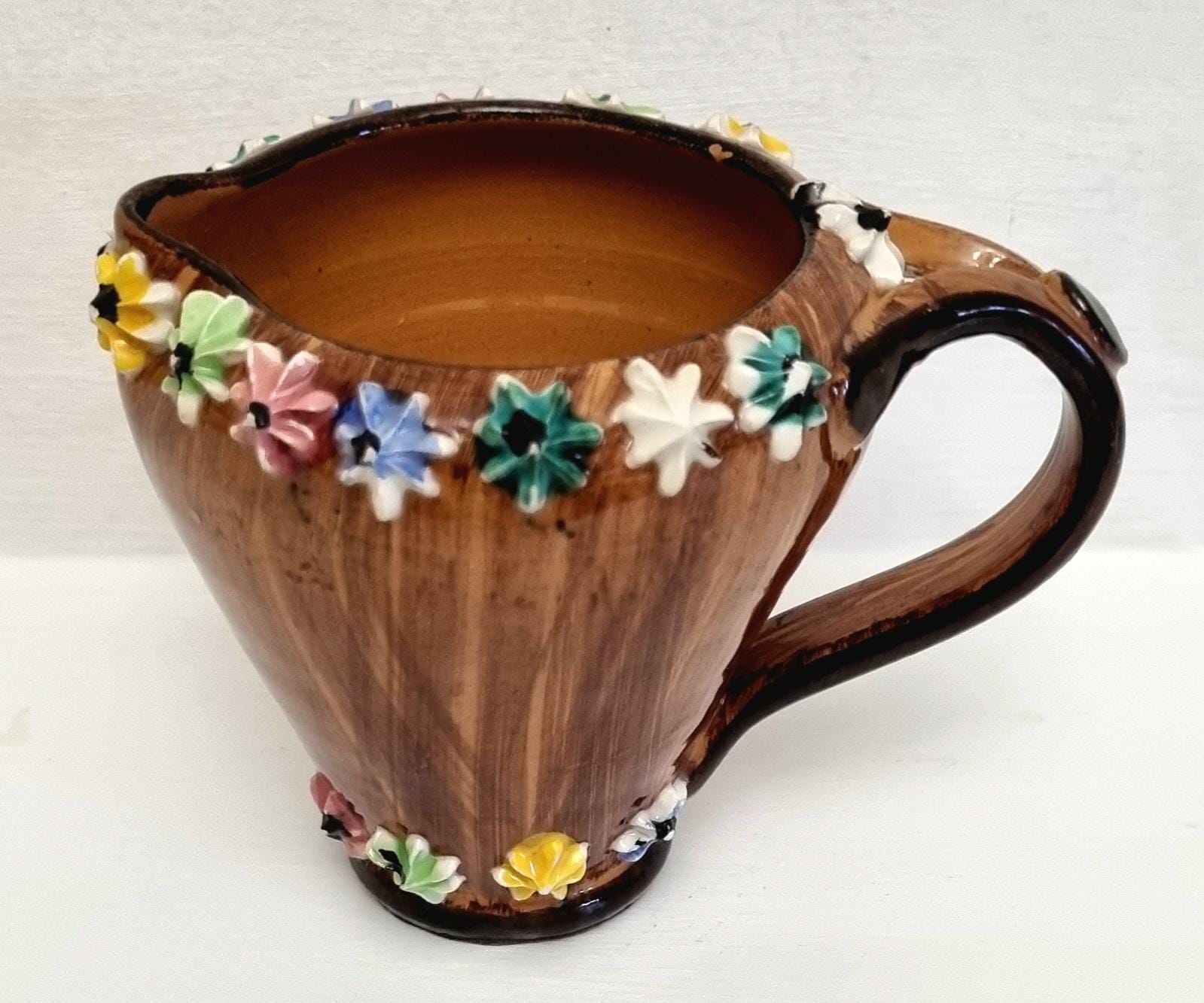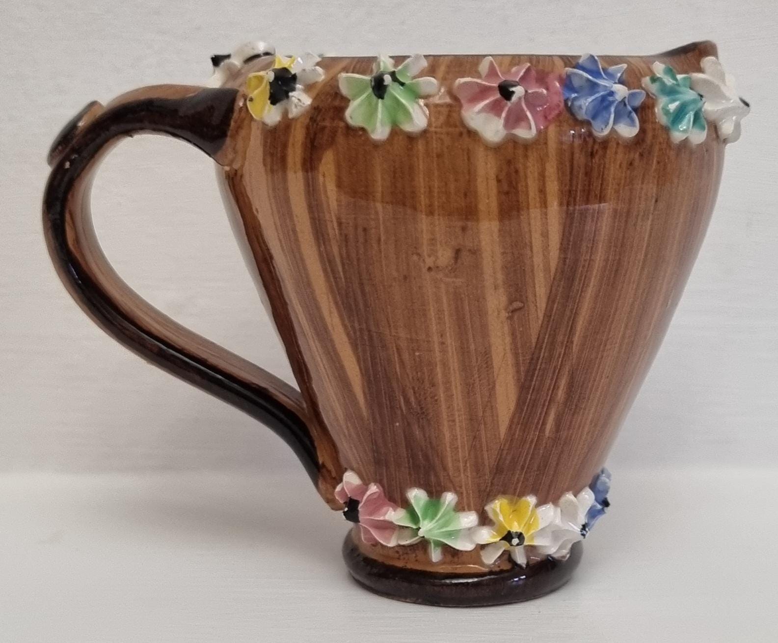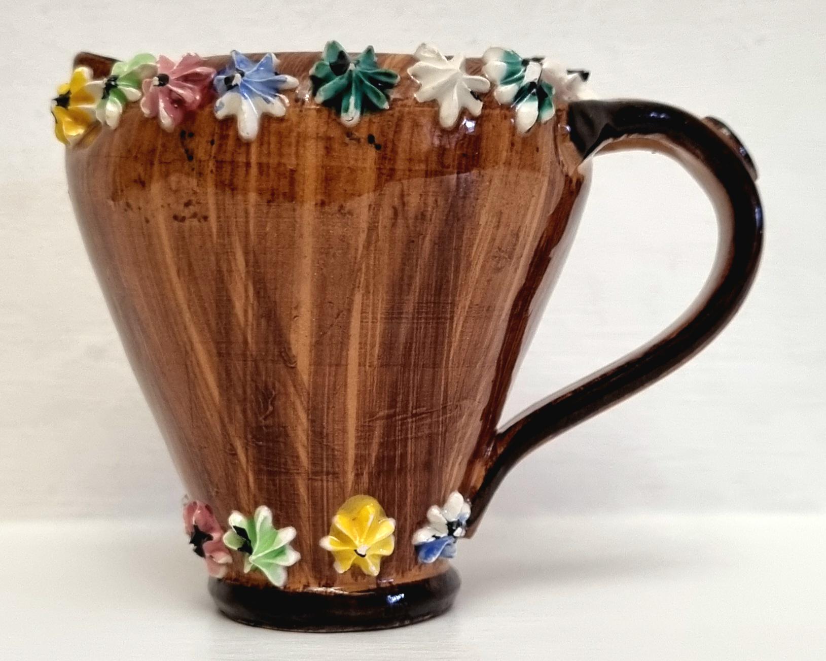 The jug is decorated with hand-applied, small, multi-coloured ceramic flowers around the rim and base.