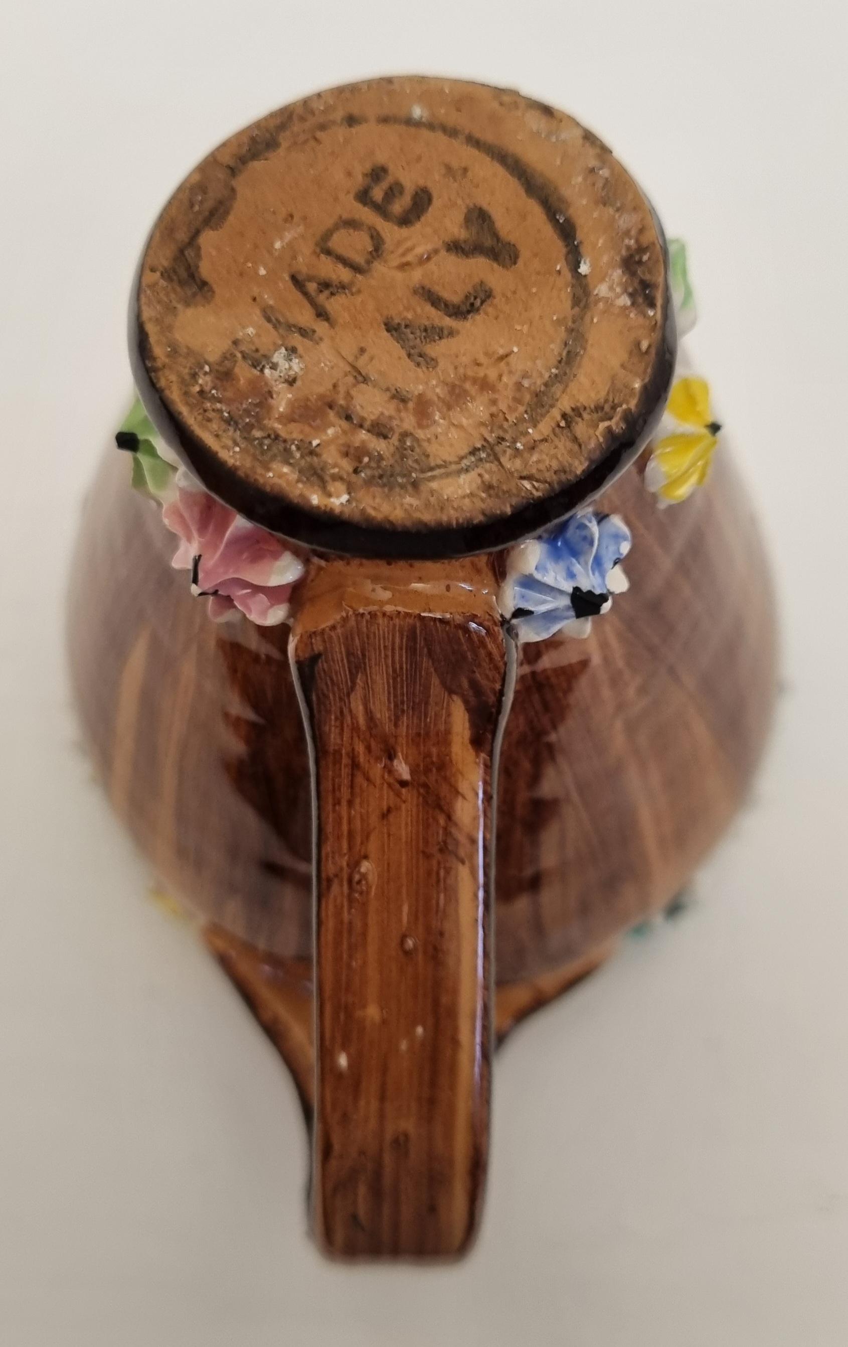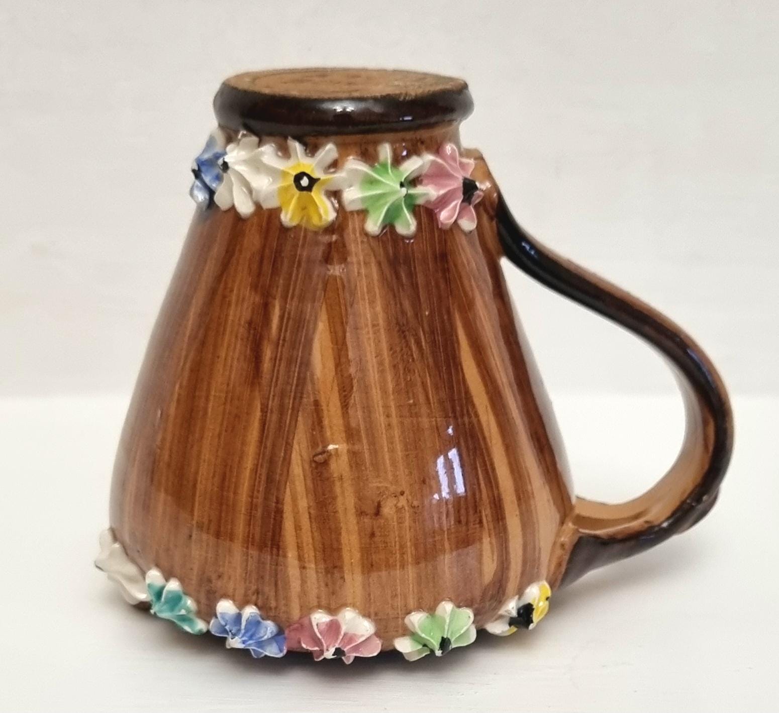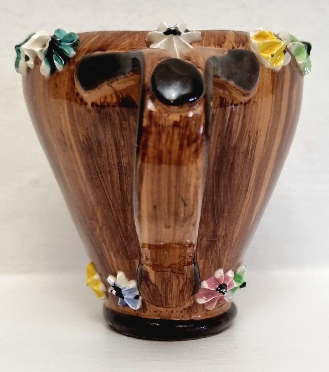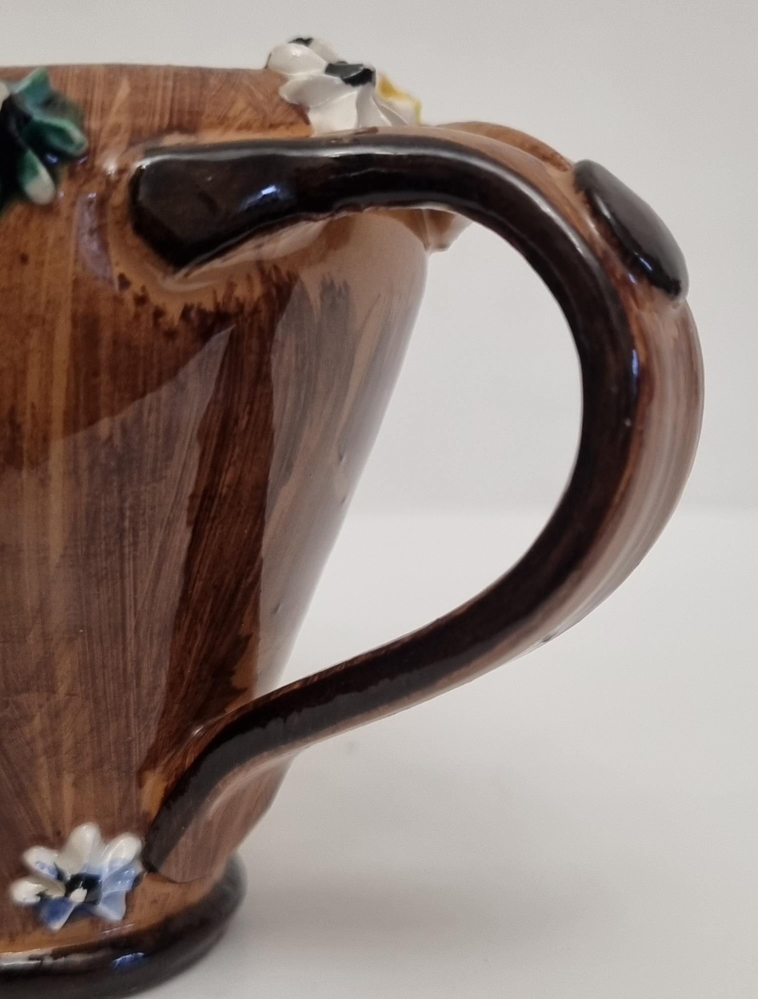 The jug is decorated with hand-applied, small, multi-coloured ceramic flowers around the rim and base.