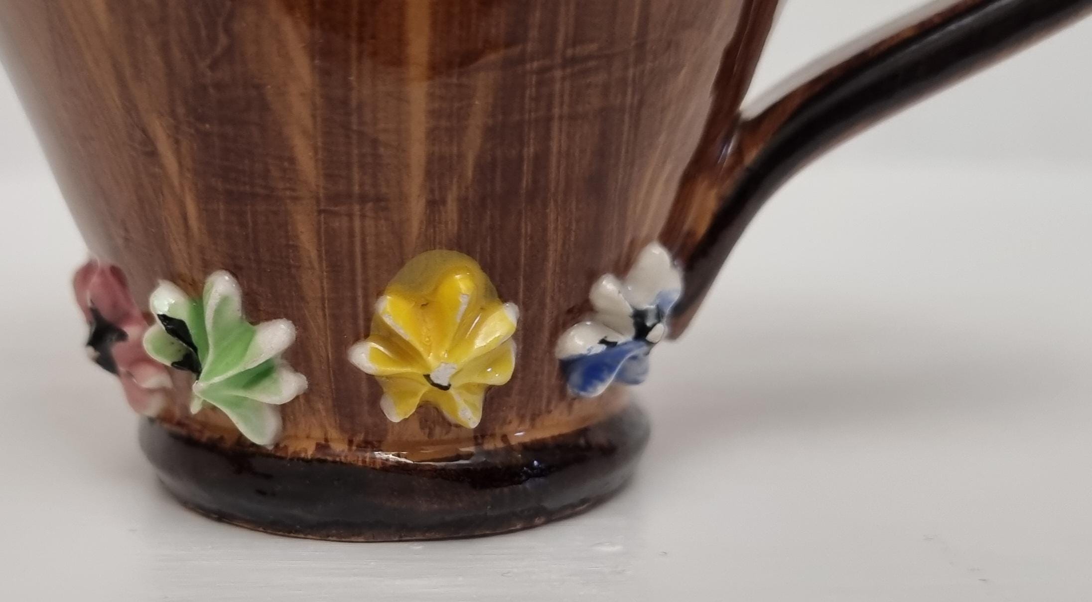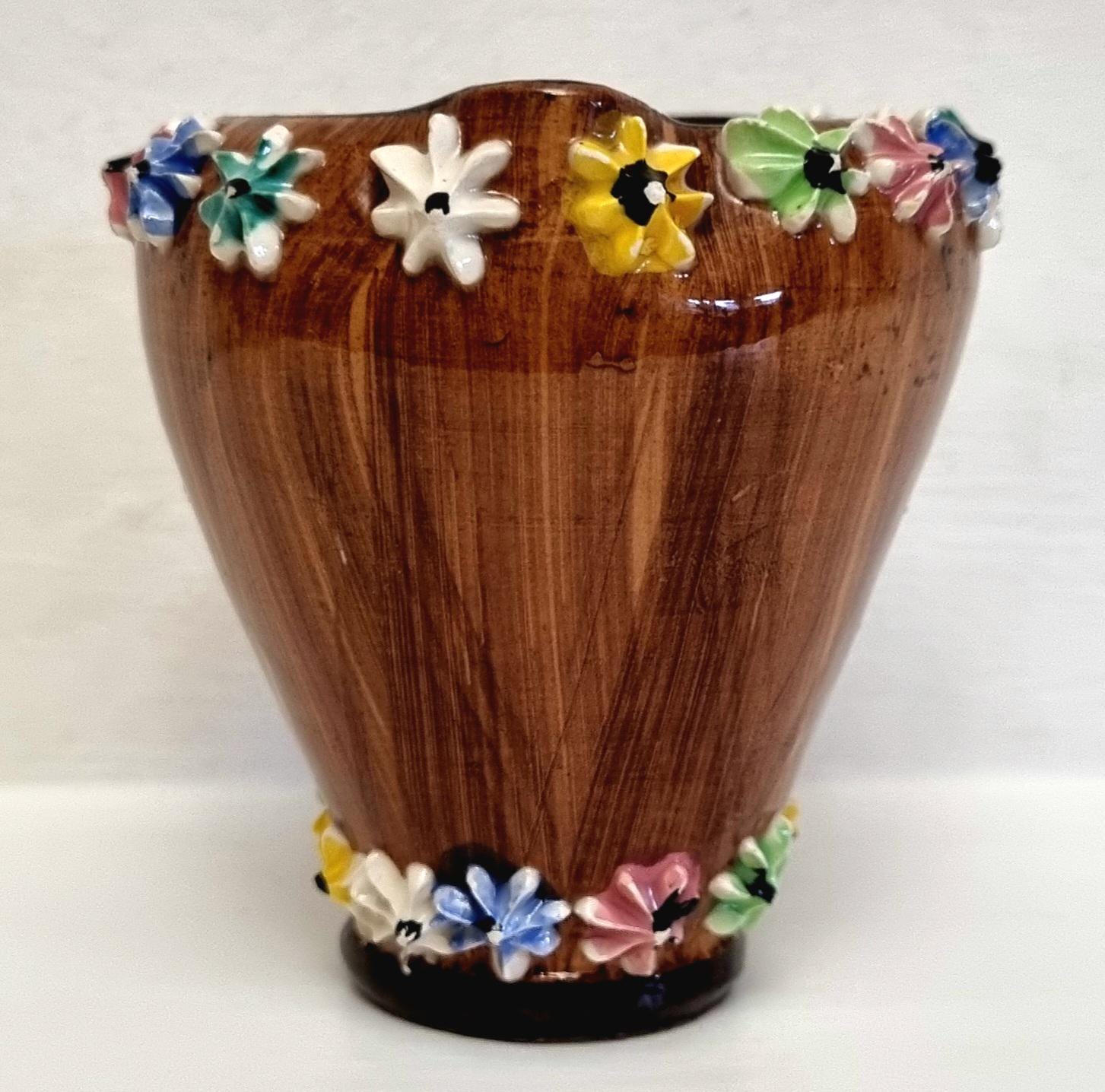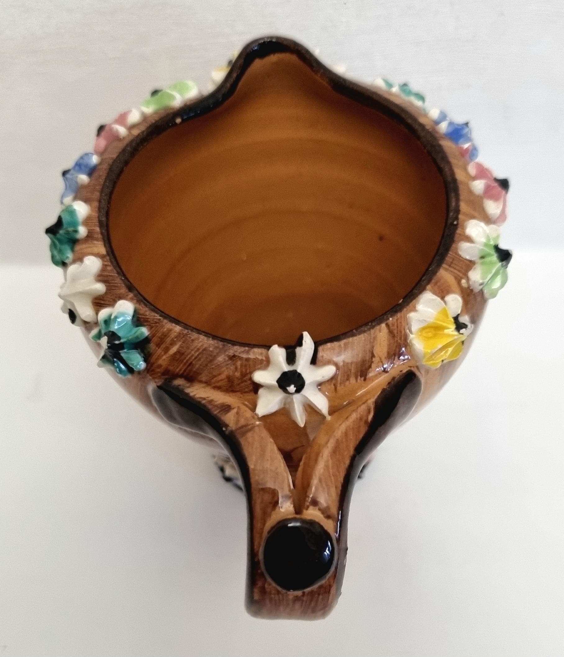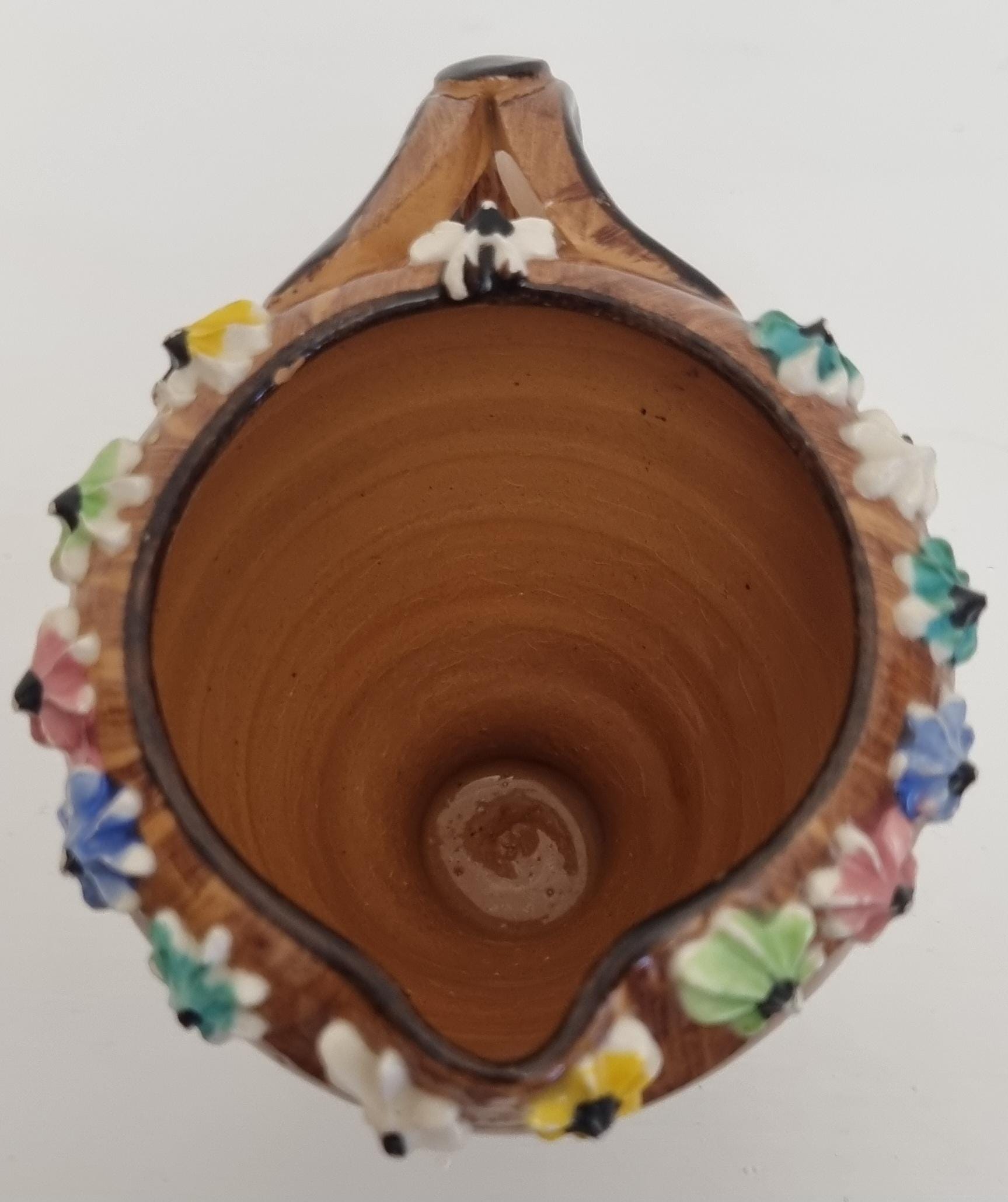 The jug is decorated with hand-applied, small, multi-coloured ceramic flowers around the rim and base.
