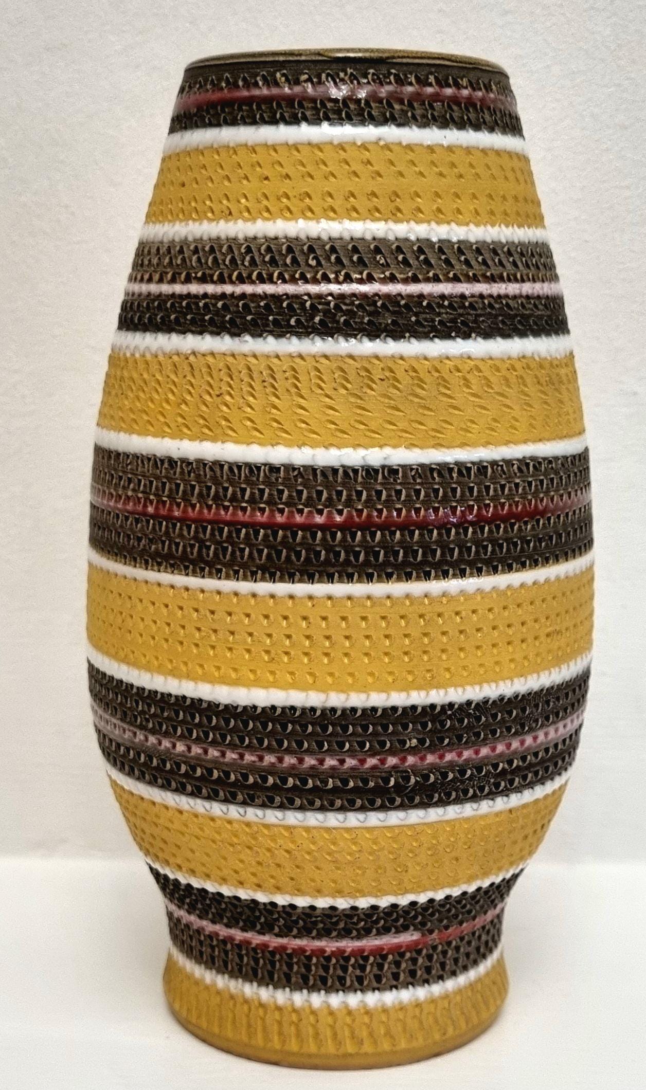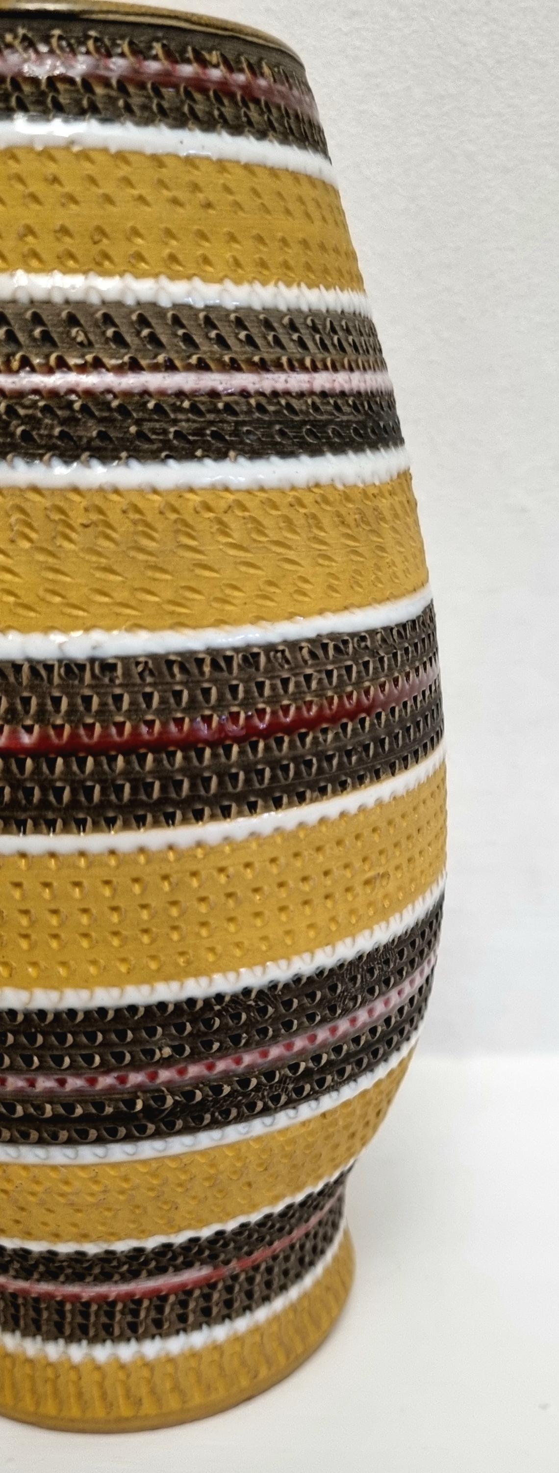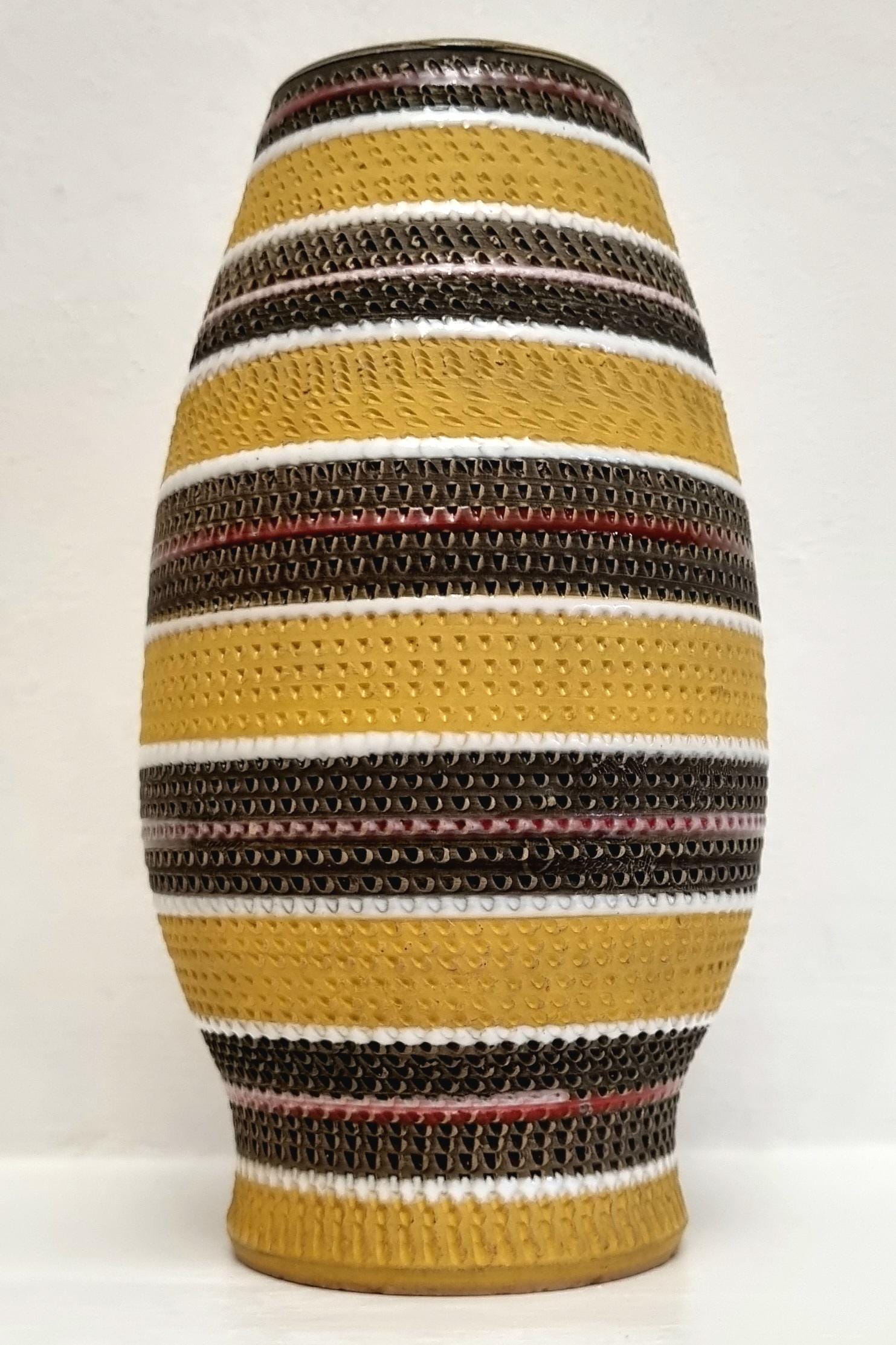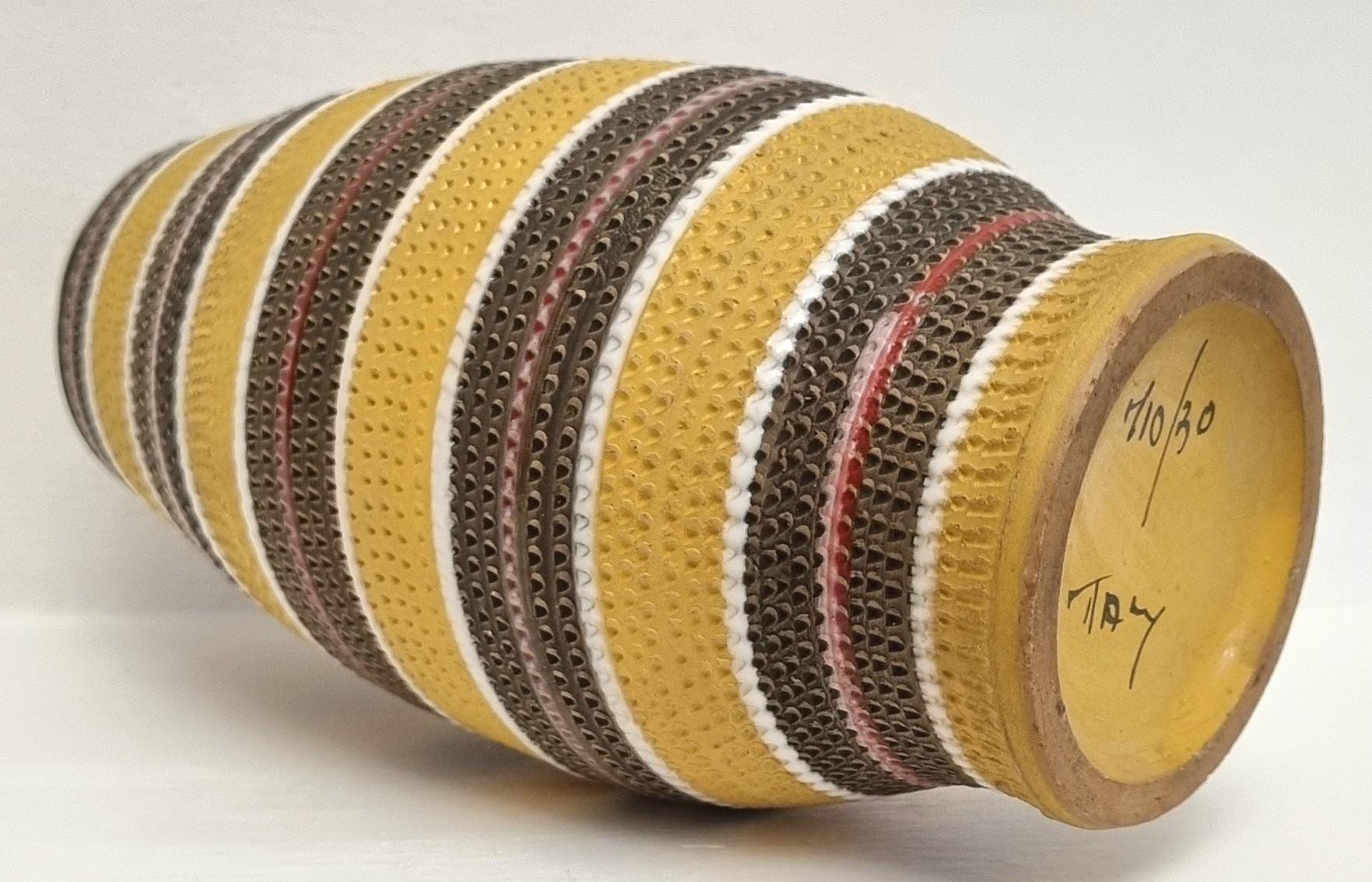 A very rare find, in this Bitossi Aldo Londi highly collectible vase. Tones of mustard yellow, brownish green with white and red glazed circular stripes. Signed 710/30 Italy on the base.