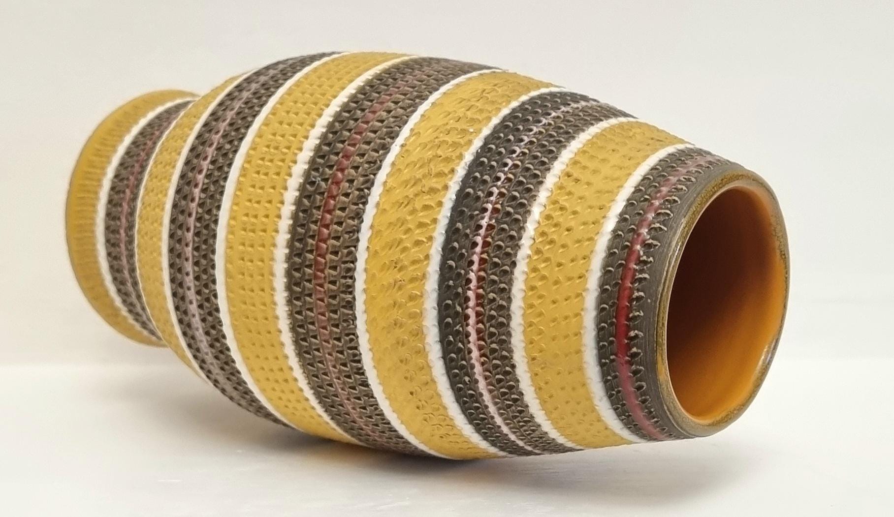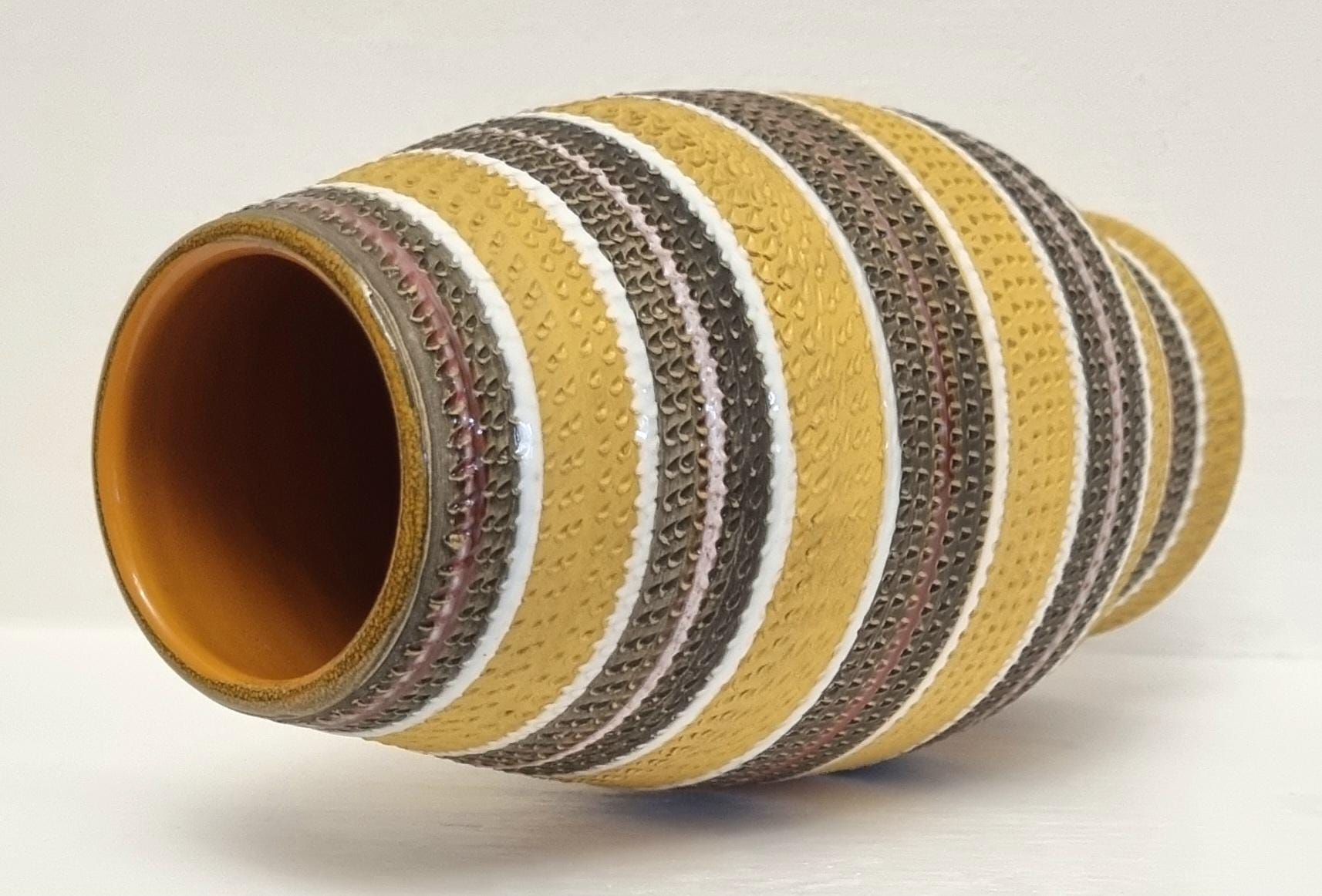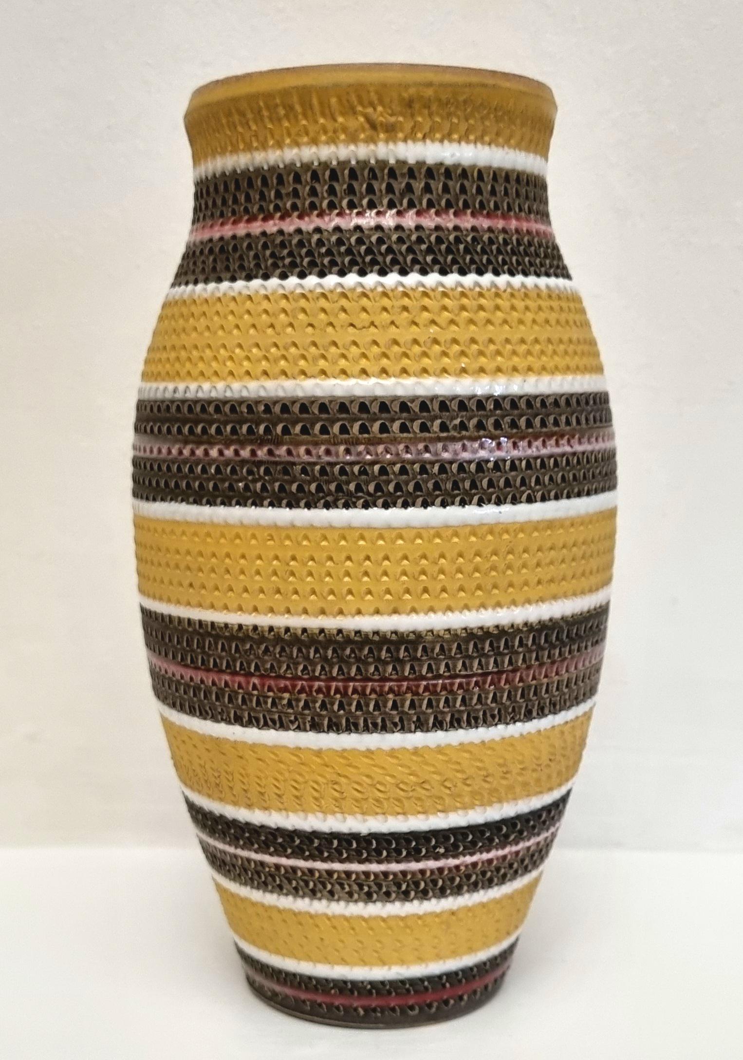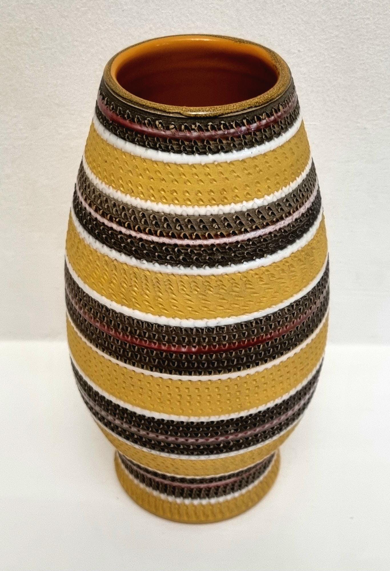 A very rare find, in this Bitossi Aldo Londi highly collectible vase. Tones of mustard yellow, brownish green with white and red glazed circular stripes. Signed 710/30 Italy on the base.