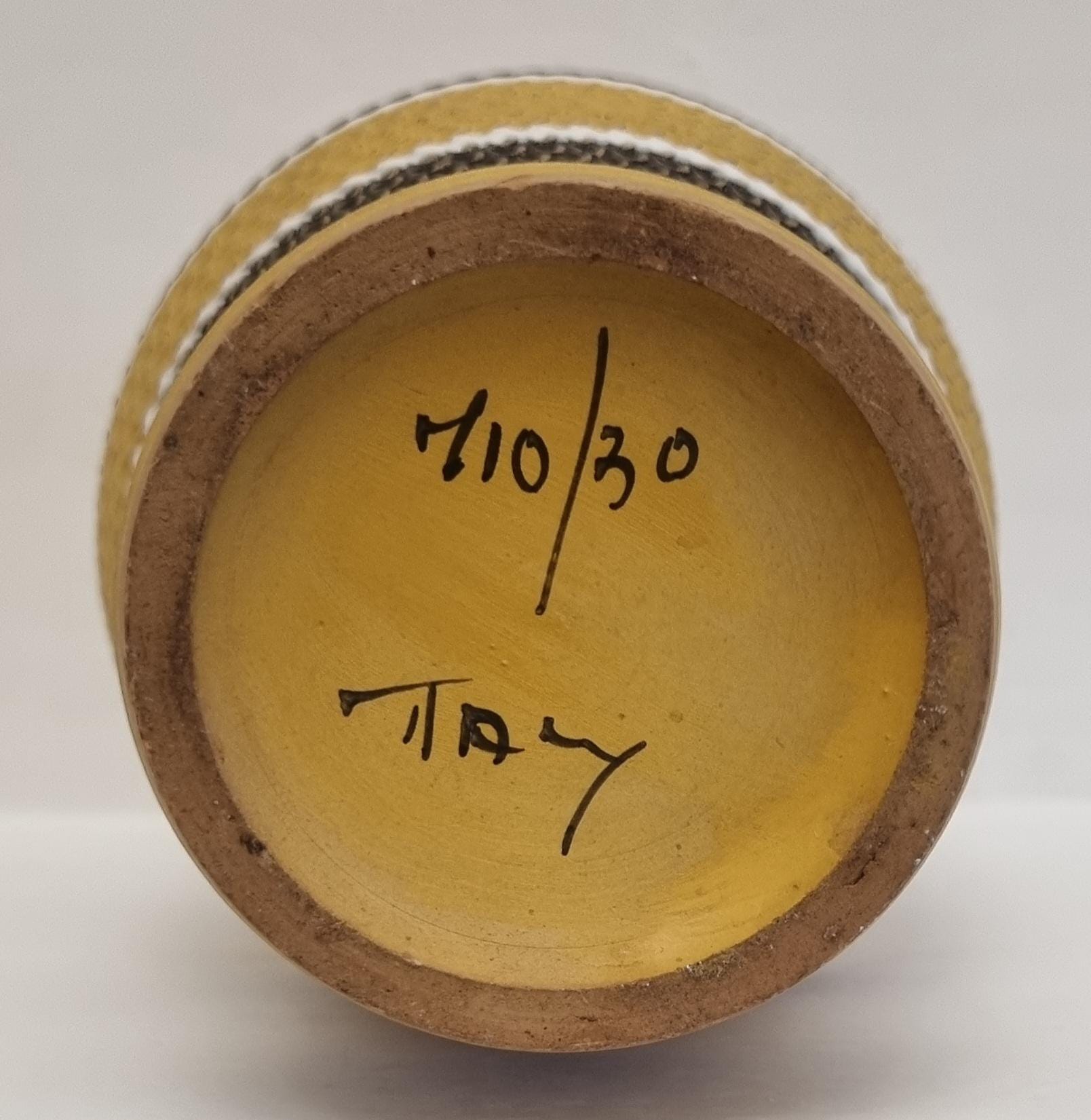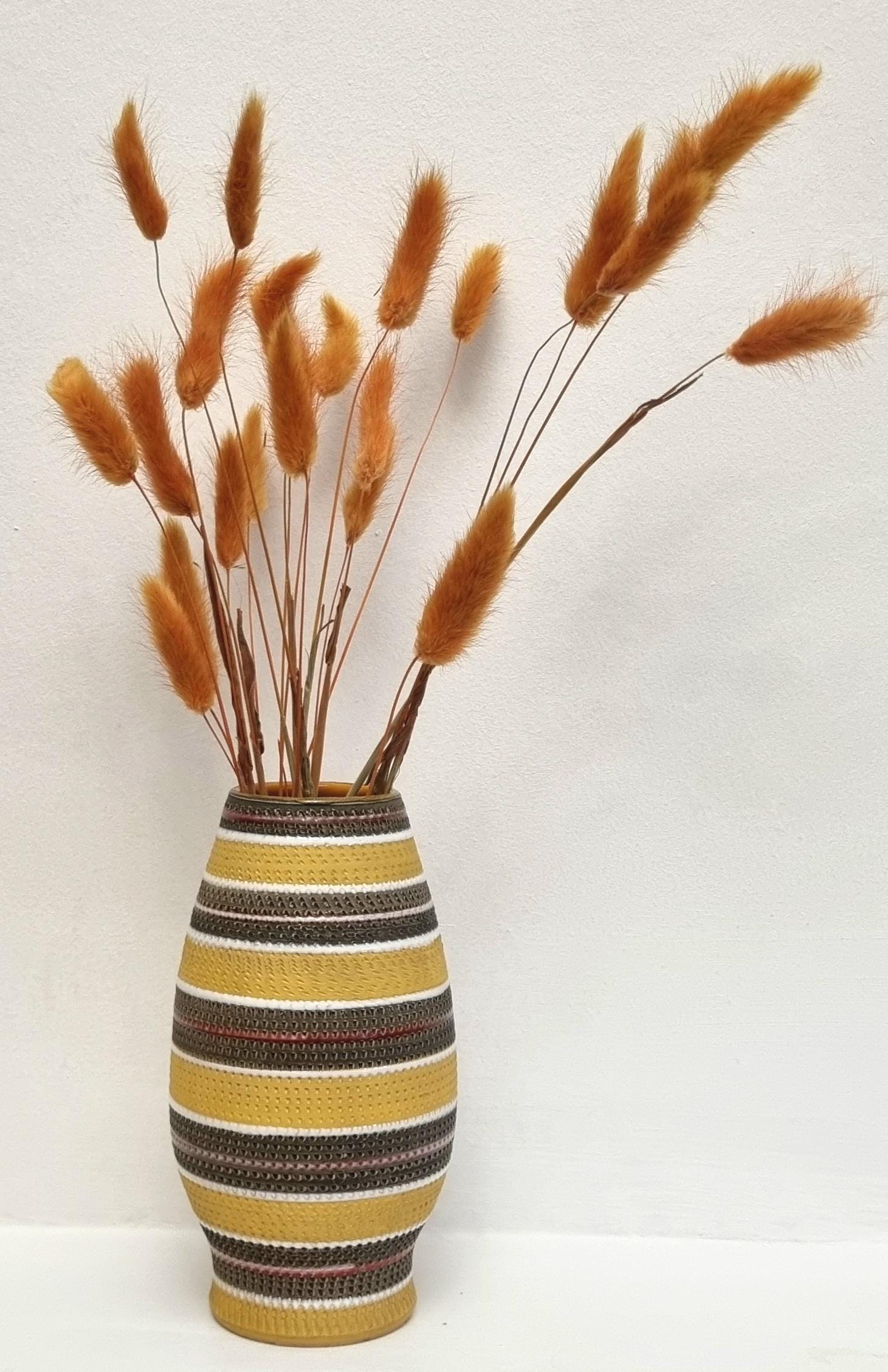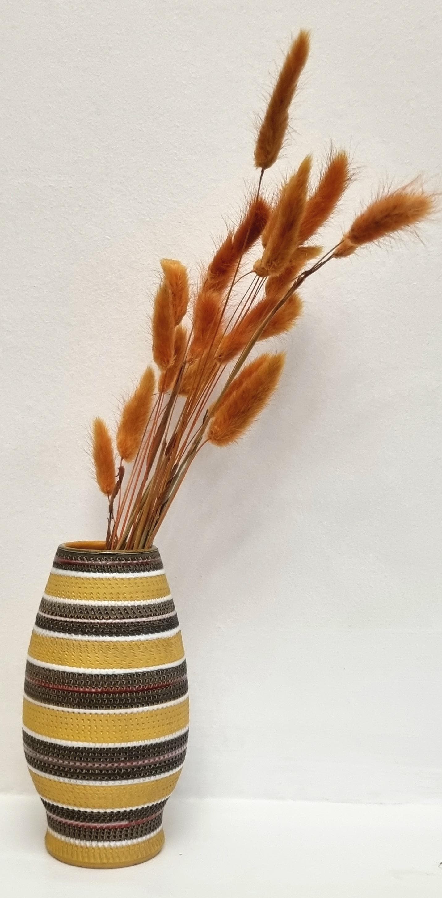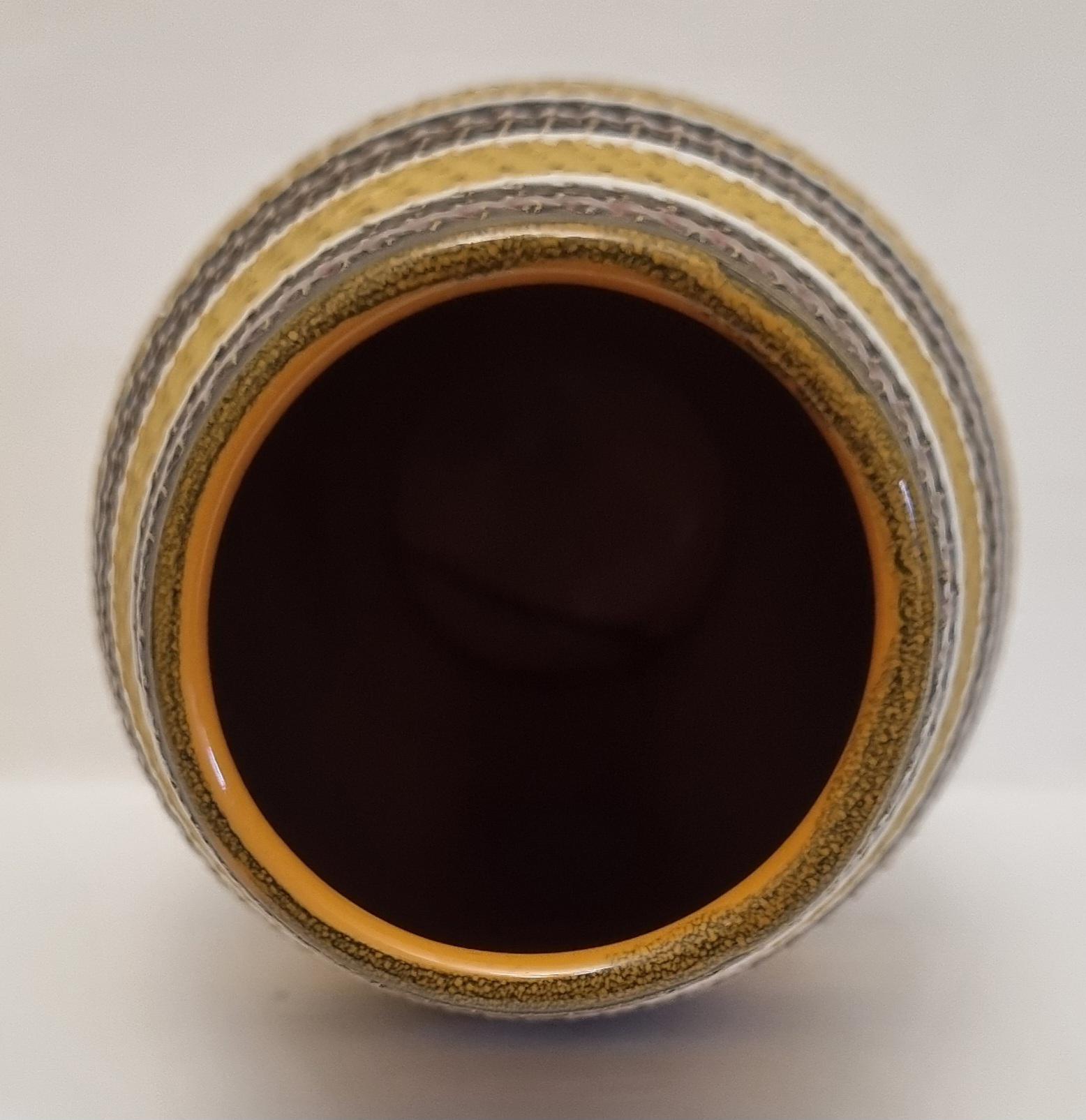 A very rare find, in this Bitossi Aldo Londi highly collectible vase. Tones of mustard yellow, brownish green with white and red glazed circular stripes. Signed 710/30 Italy on the base.