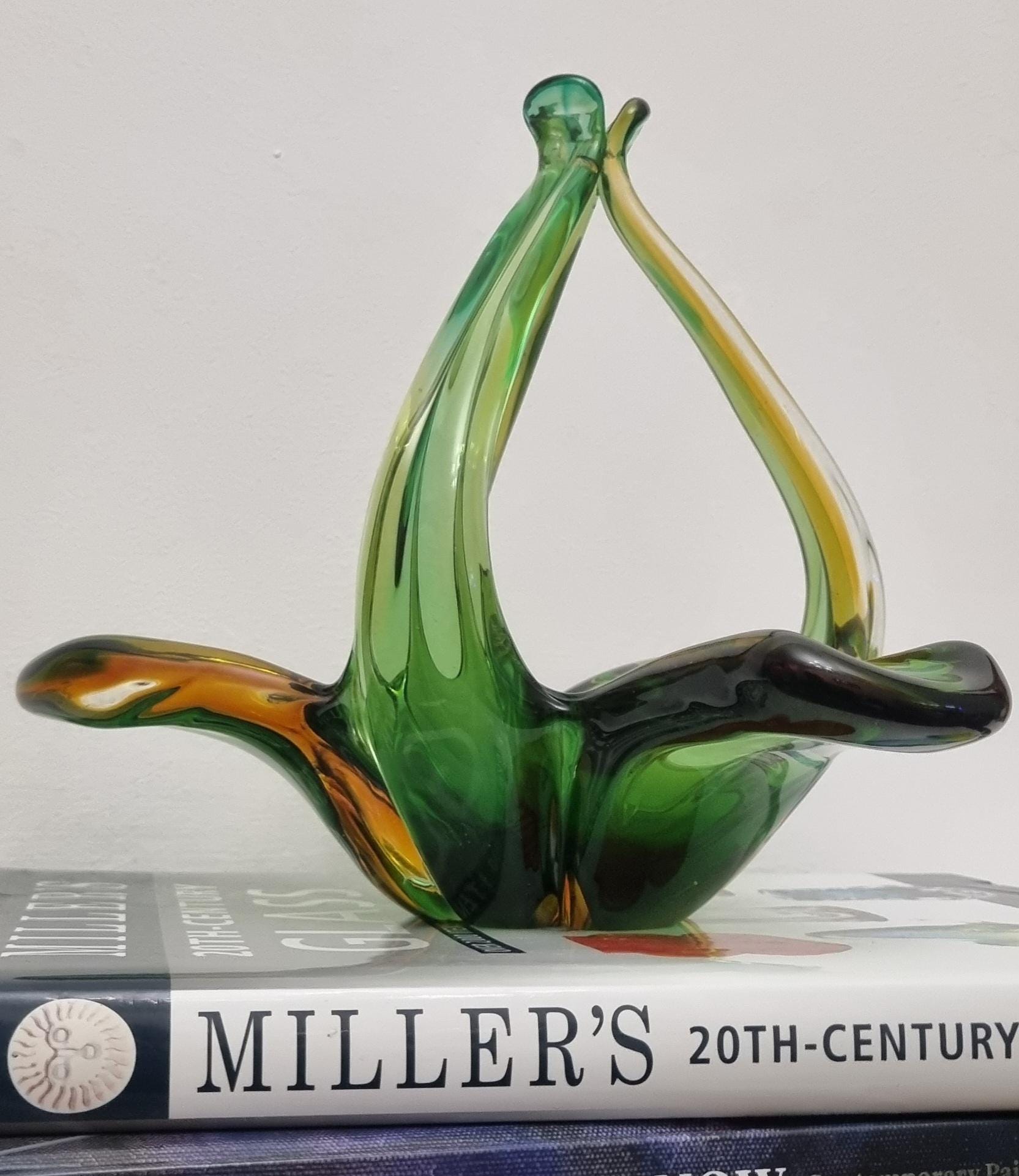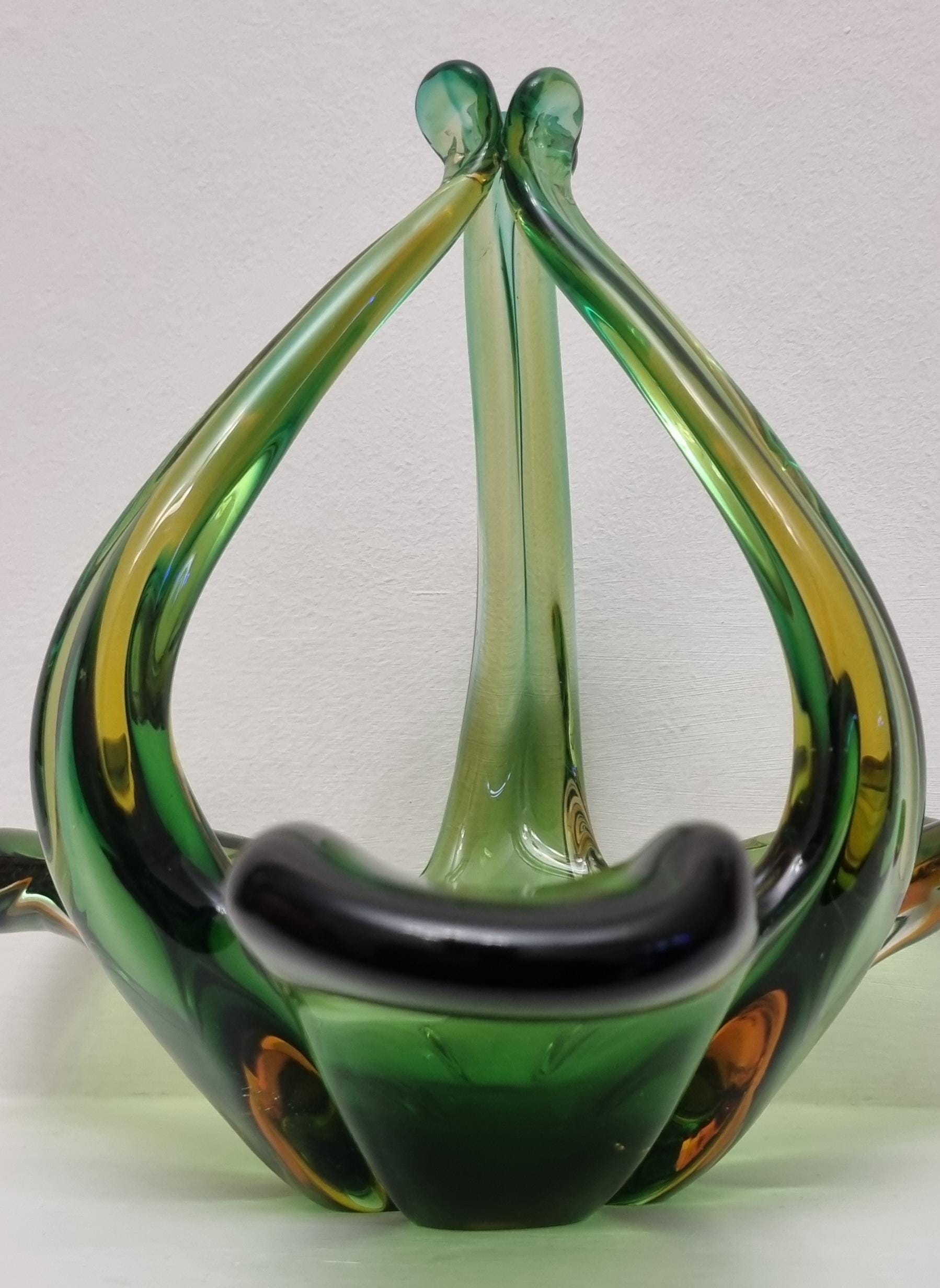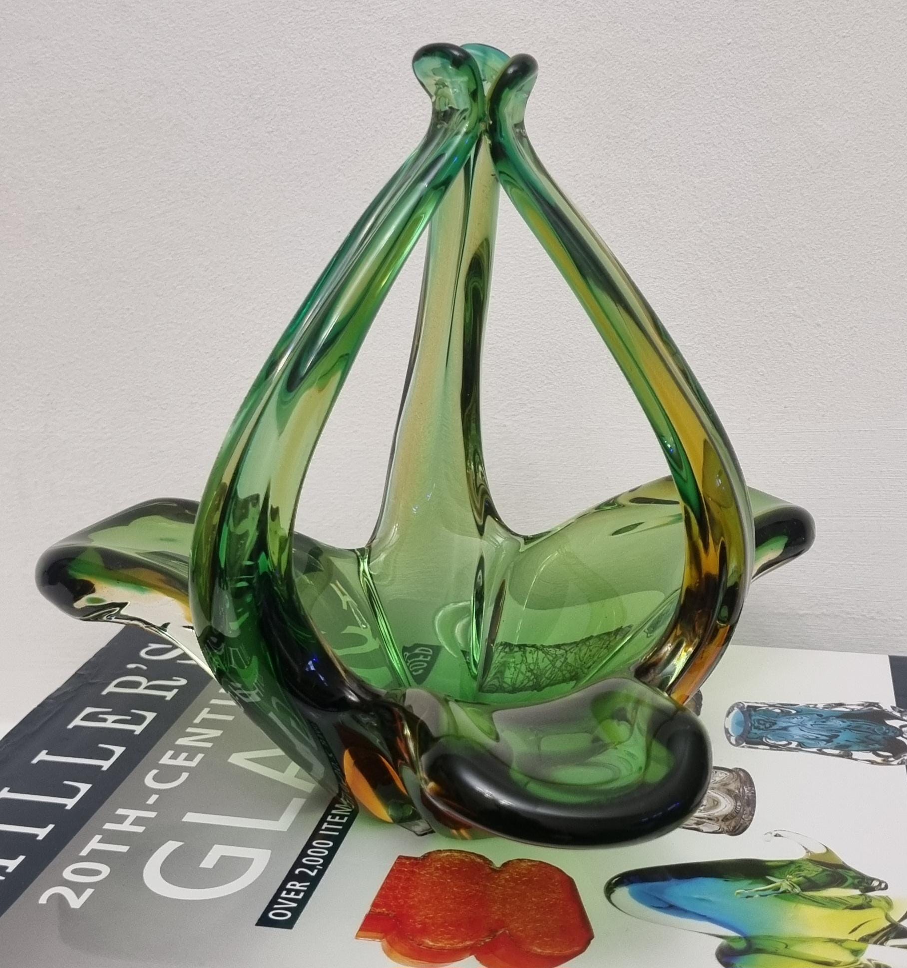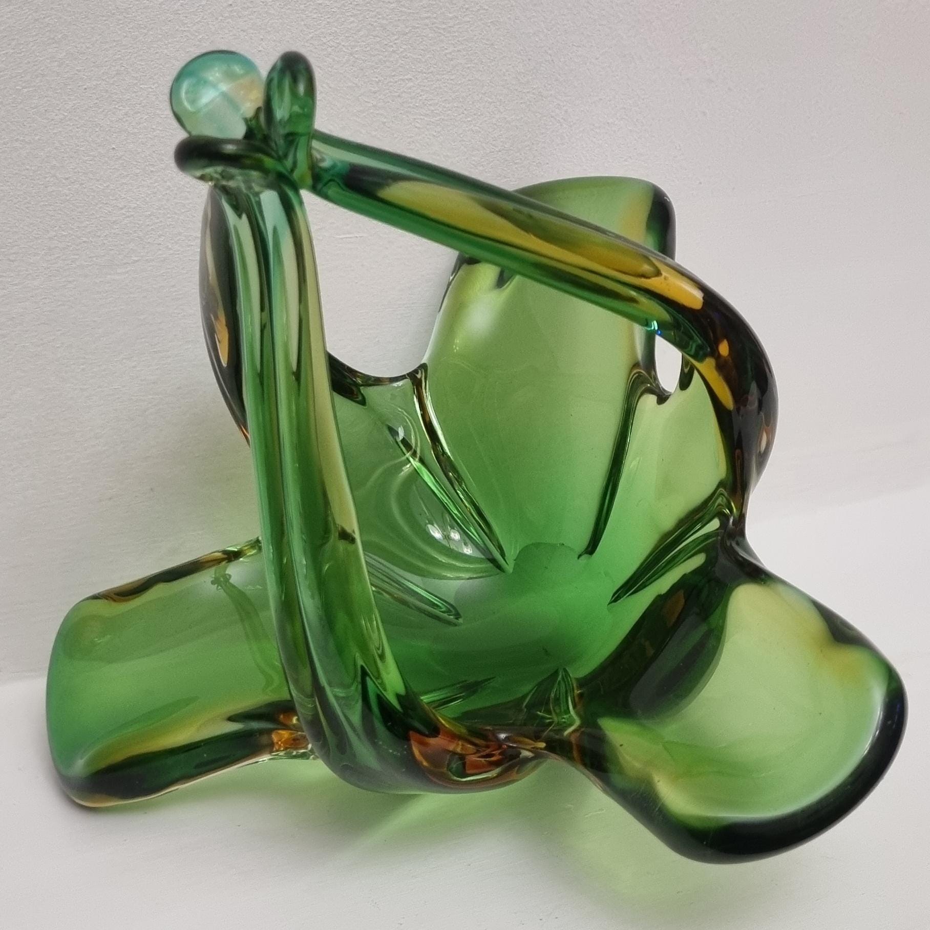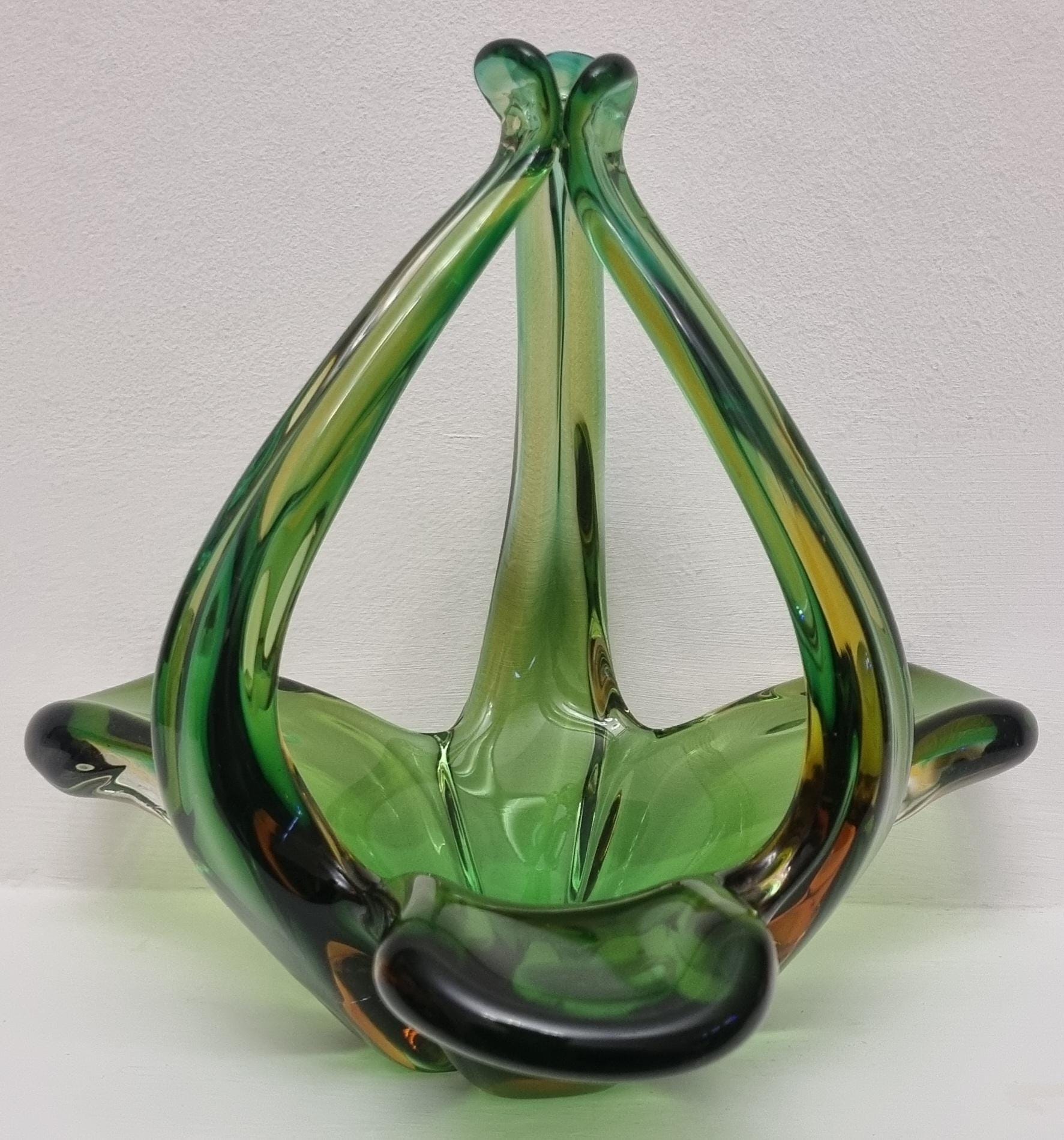 A stunning piece of glass that features a distinctive freeform, hand-blown design with a basket shape and applied handles. The glass uses a vibrant combination of green and amber/yellow colours, cased within clear glass.