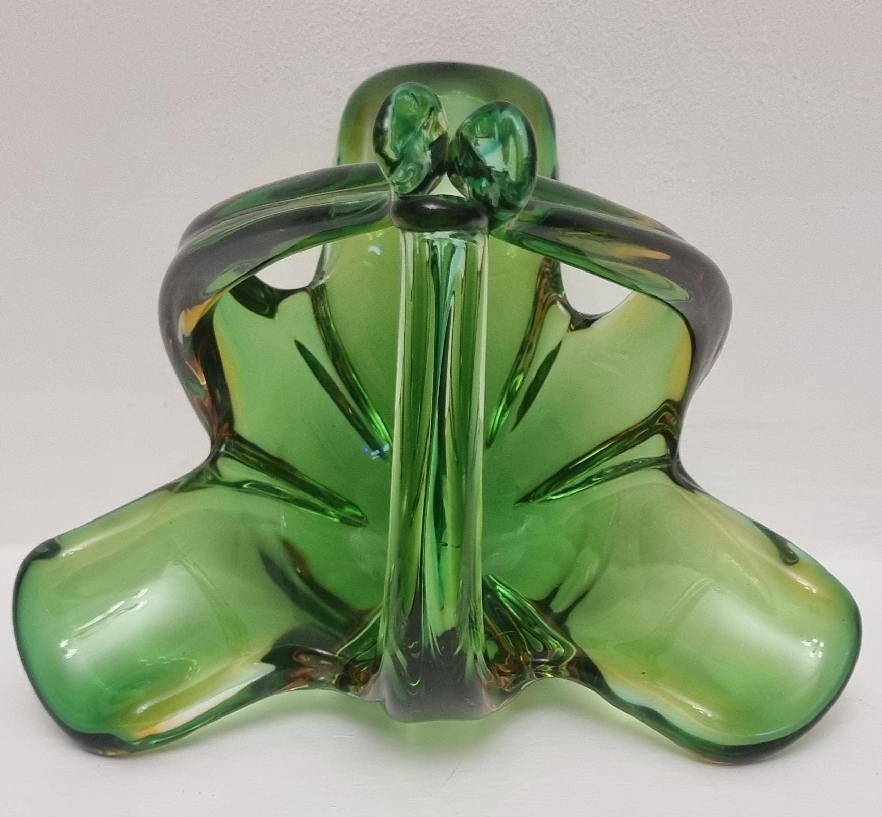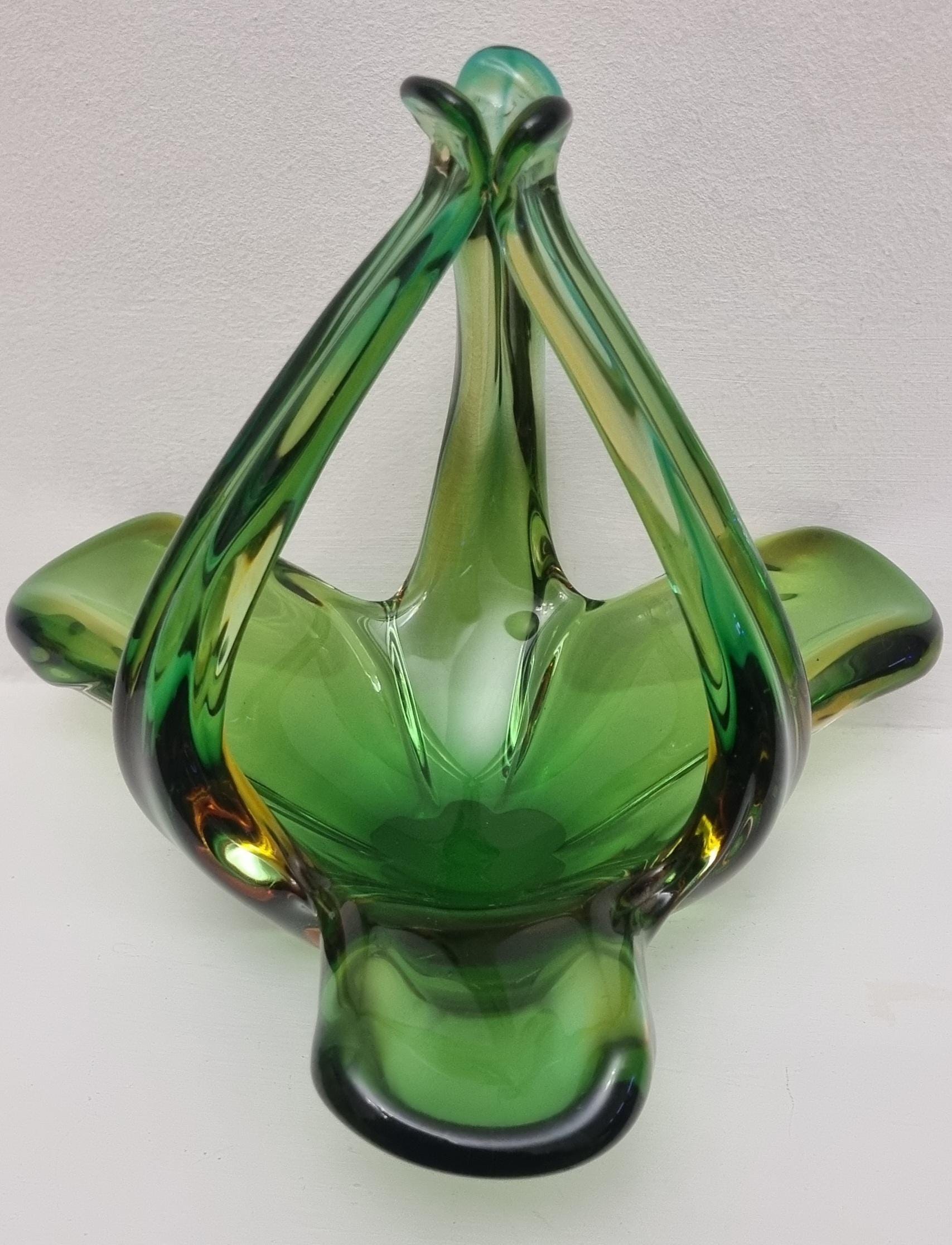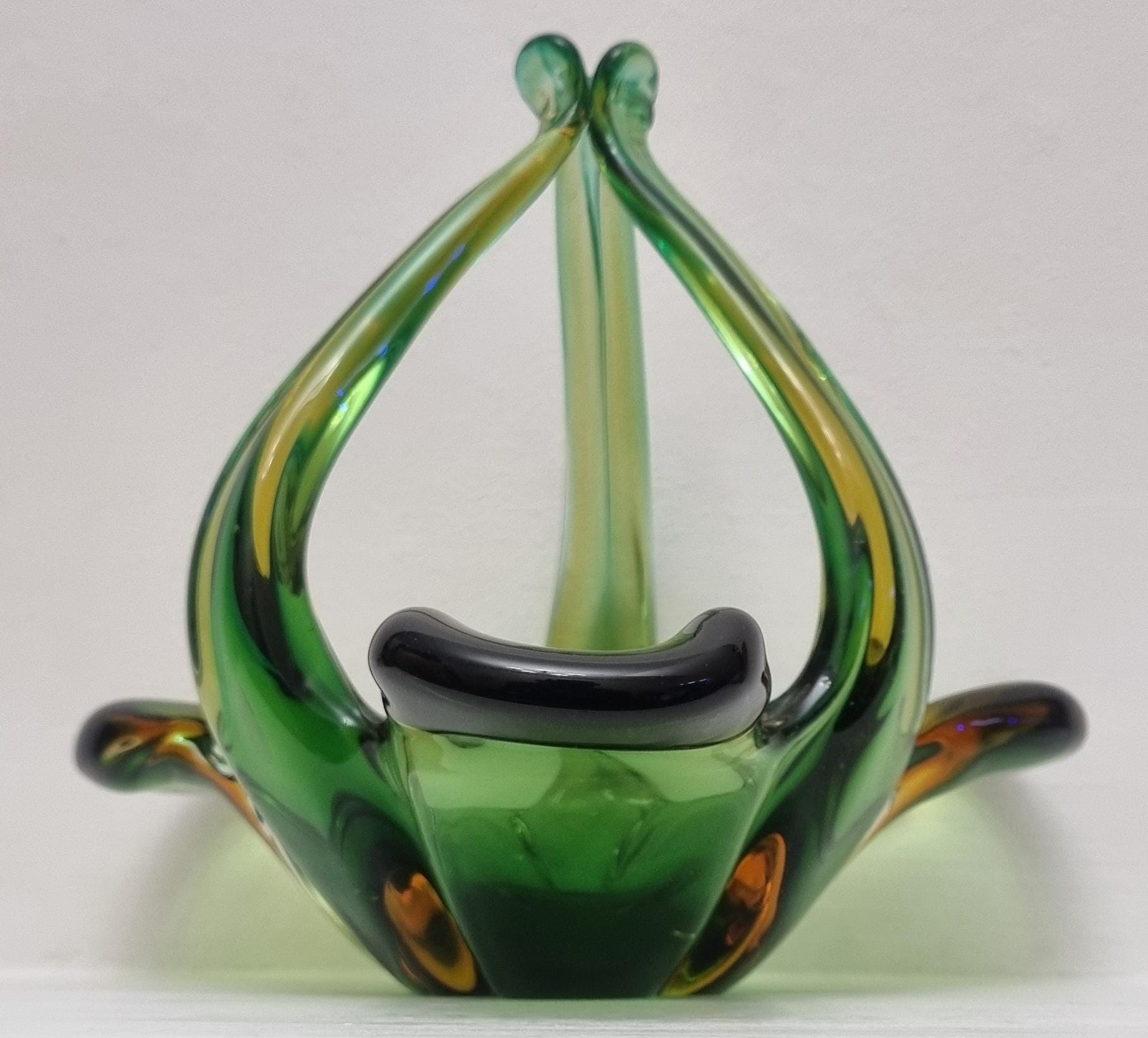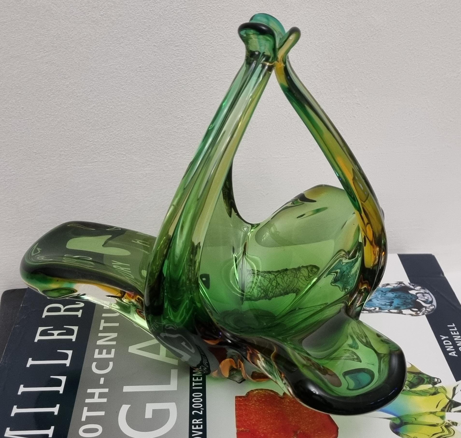 A stunning piece of glass that features a distinctive freeform, hand-blown design with a basket shape and applied handles. The glass uses a vibrant combination of green and amber/yellow colours, cased within clear glass.