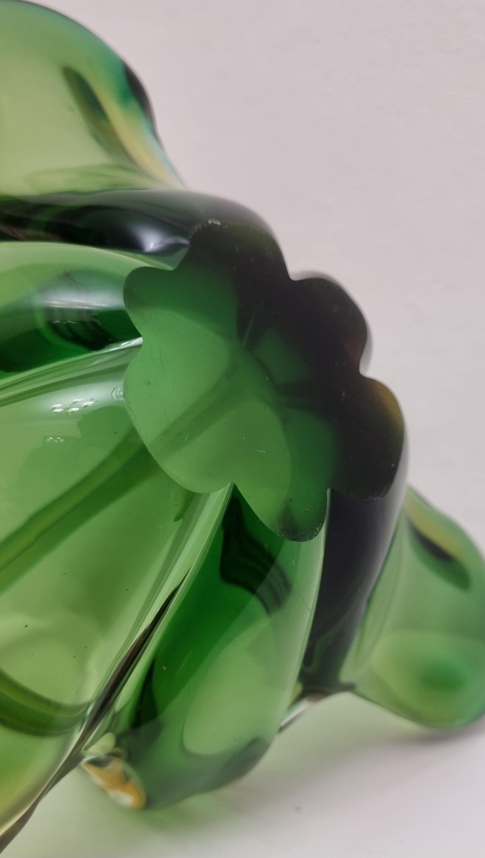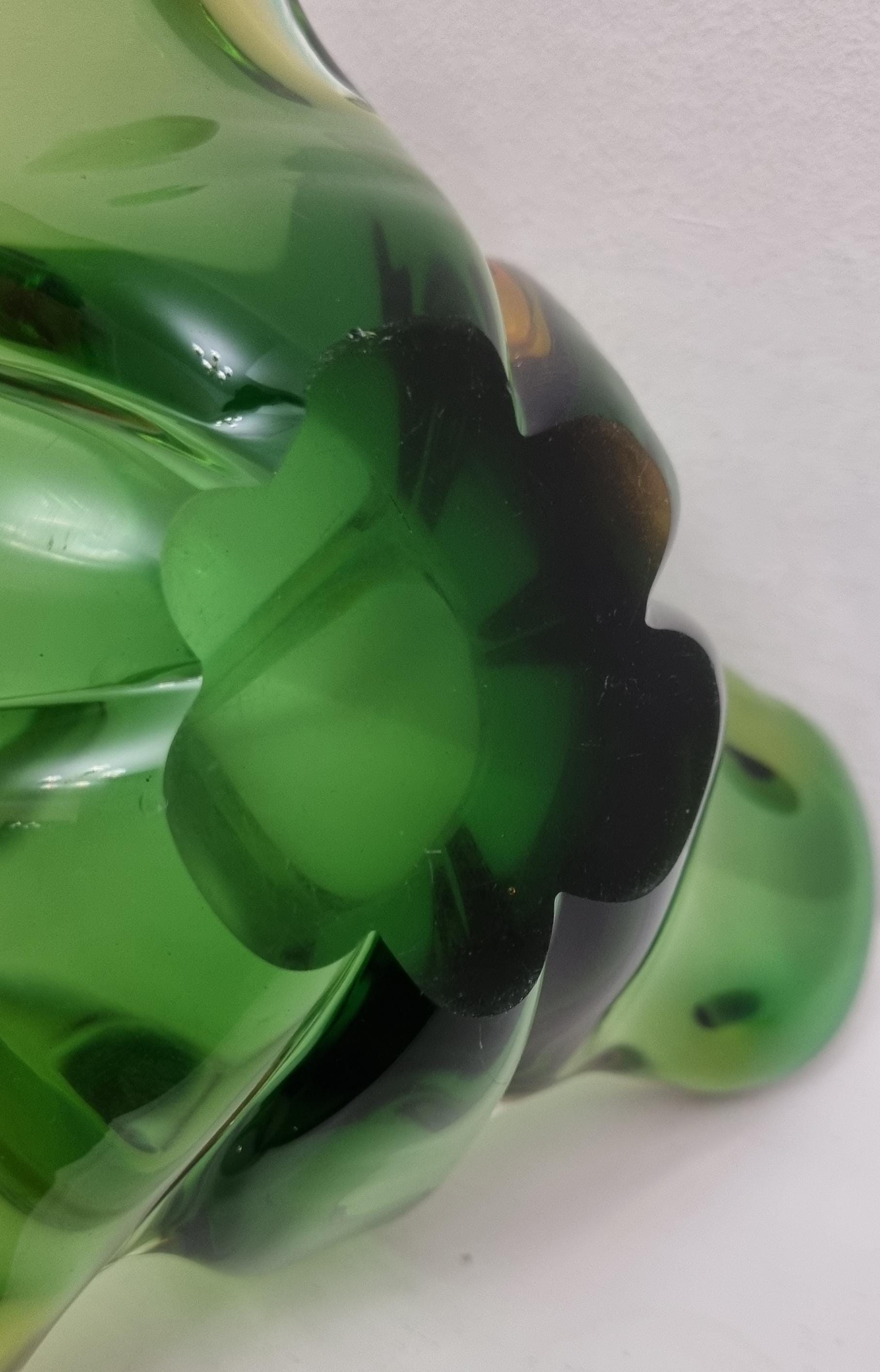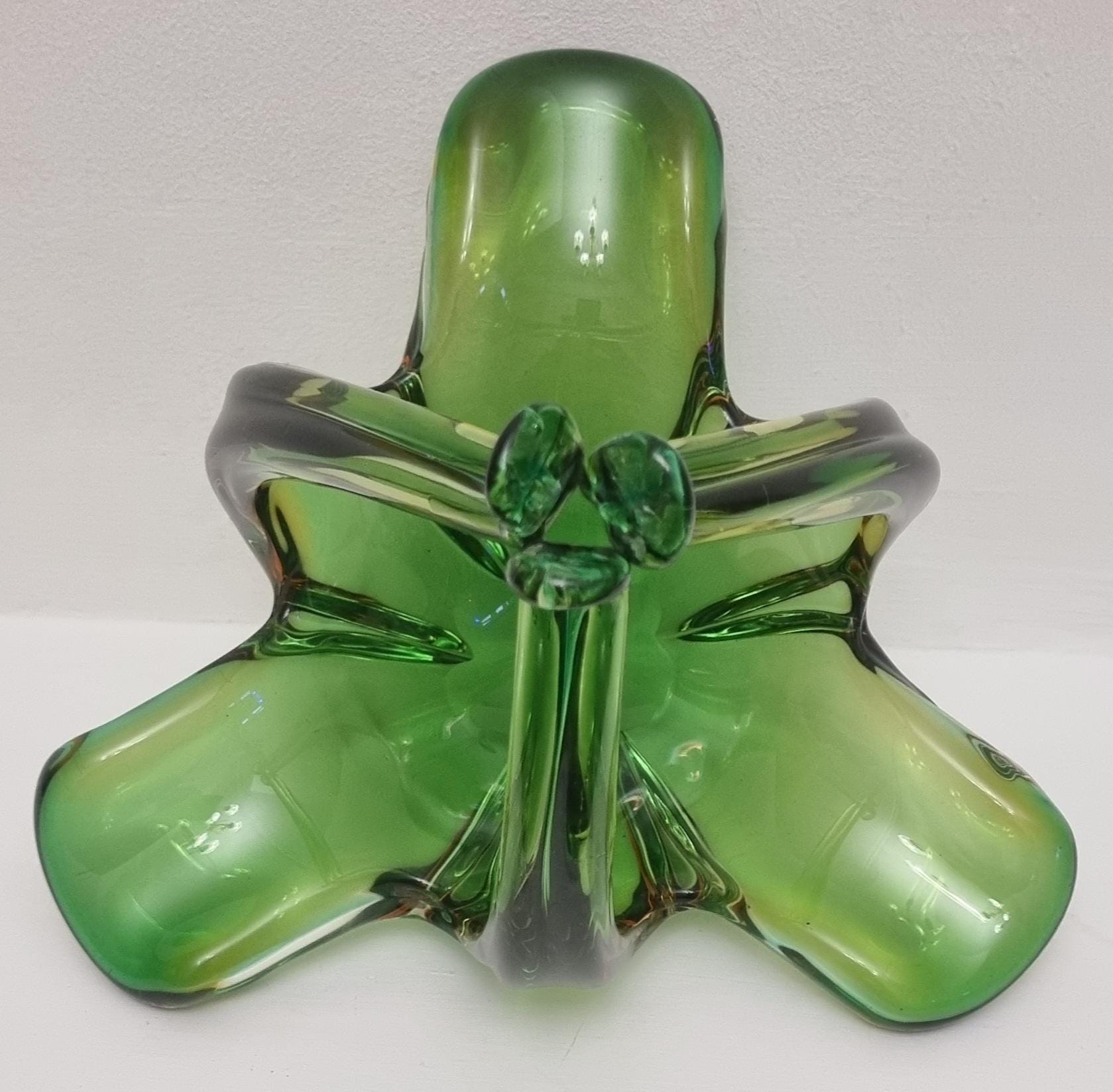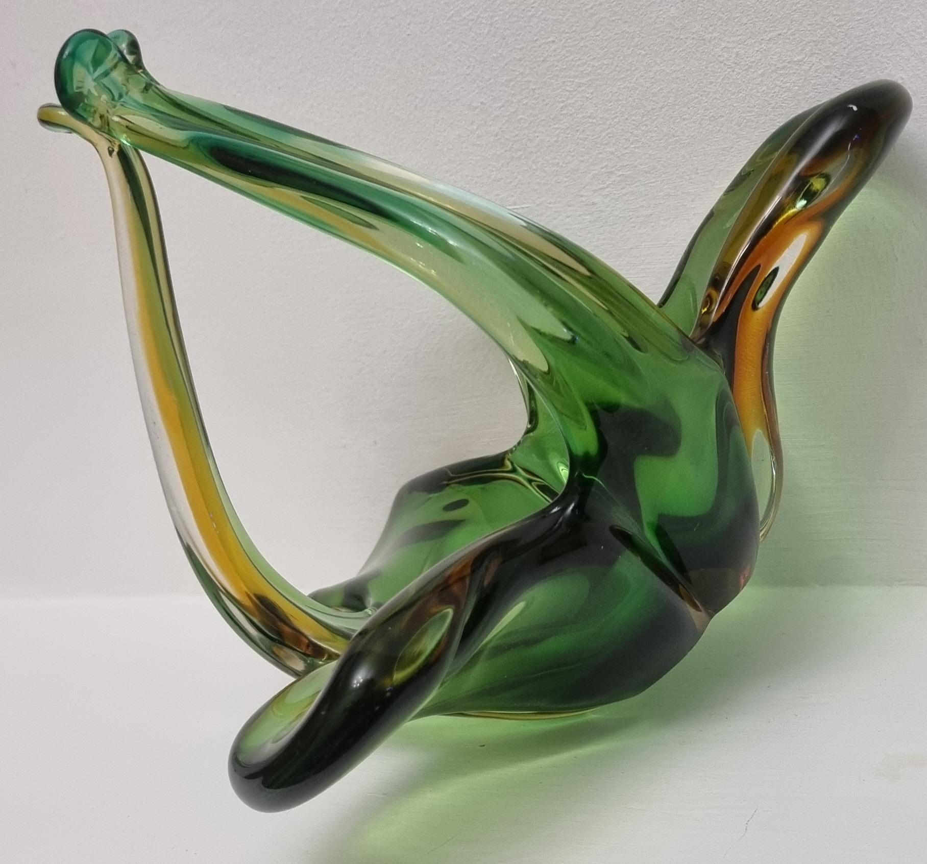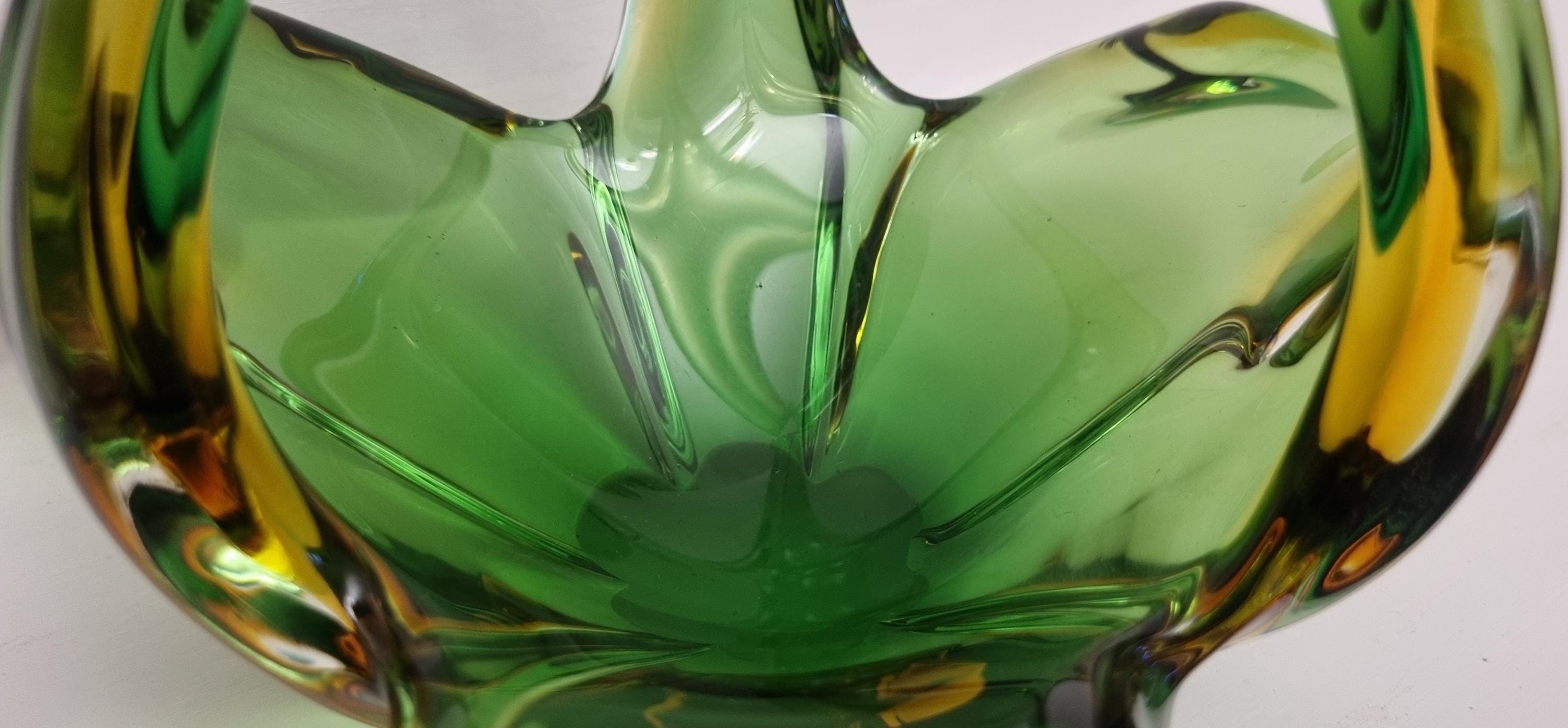 A stunning piece of glass that features a distinctive freeform, hand-blown design with a basket shape and applied handles. The glass uses a vibrant combination of green and amber/yellow colours, cased within clear glass.