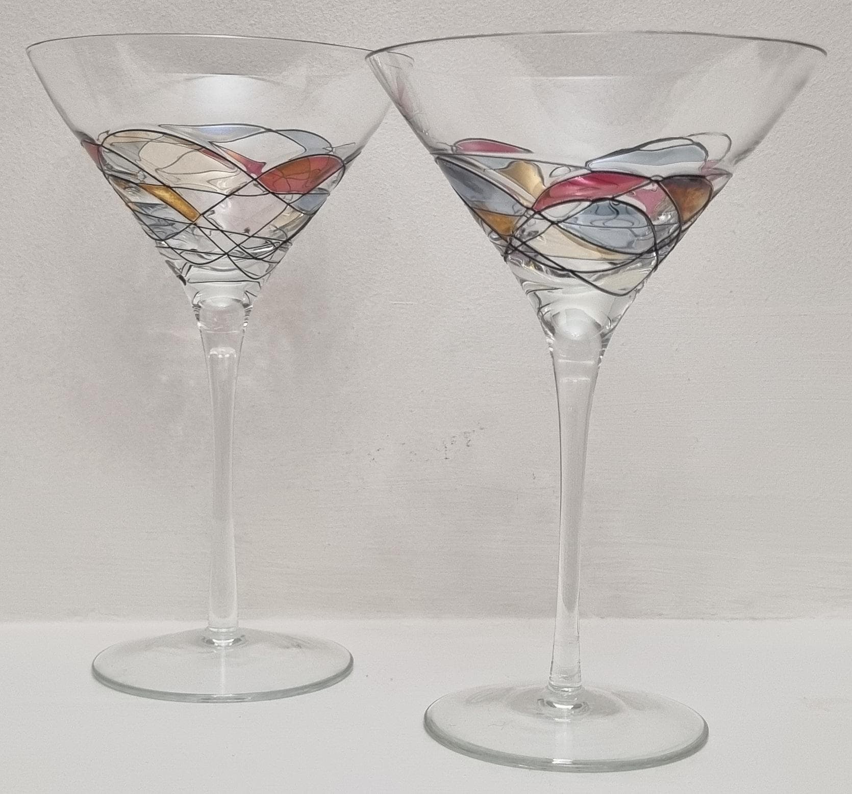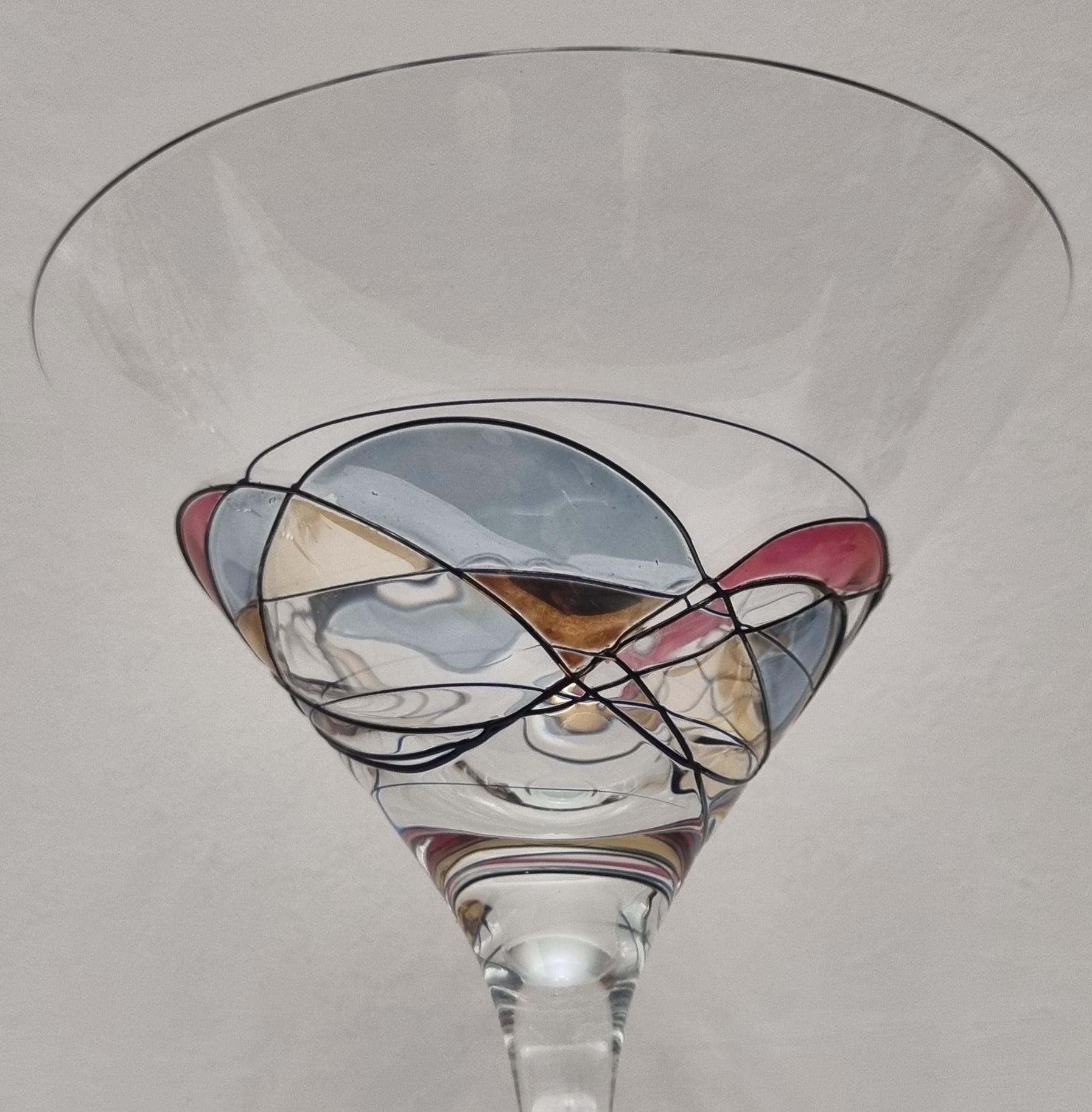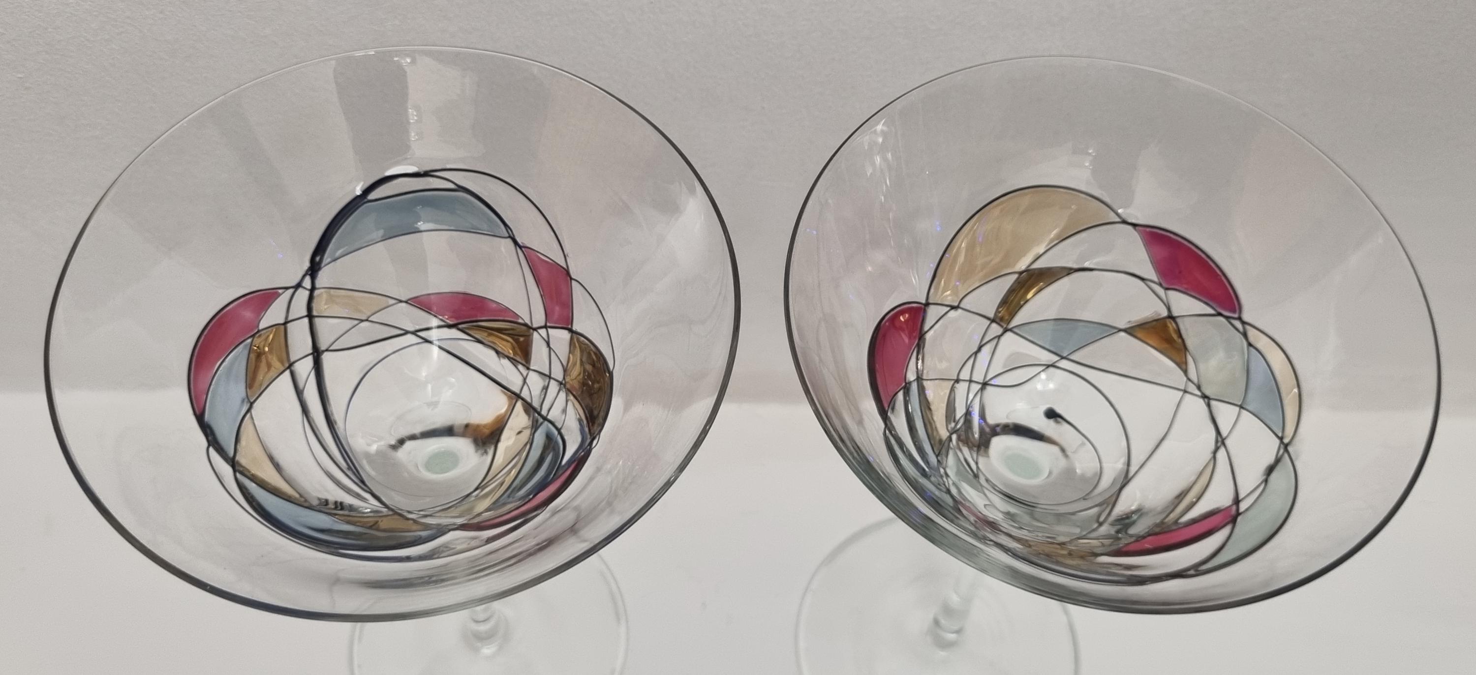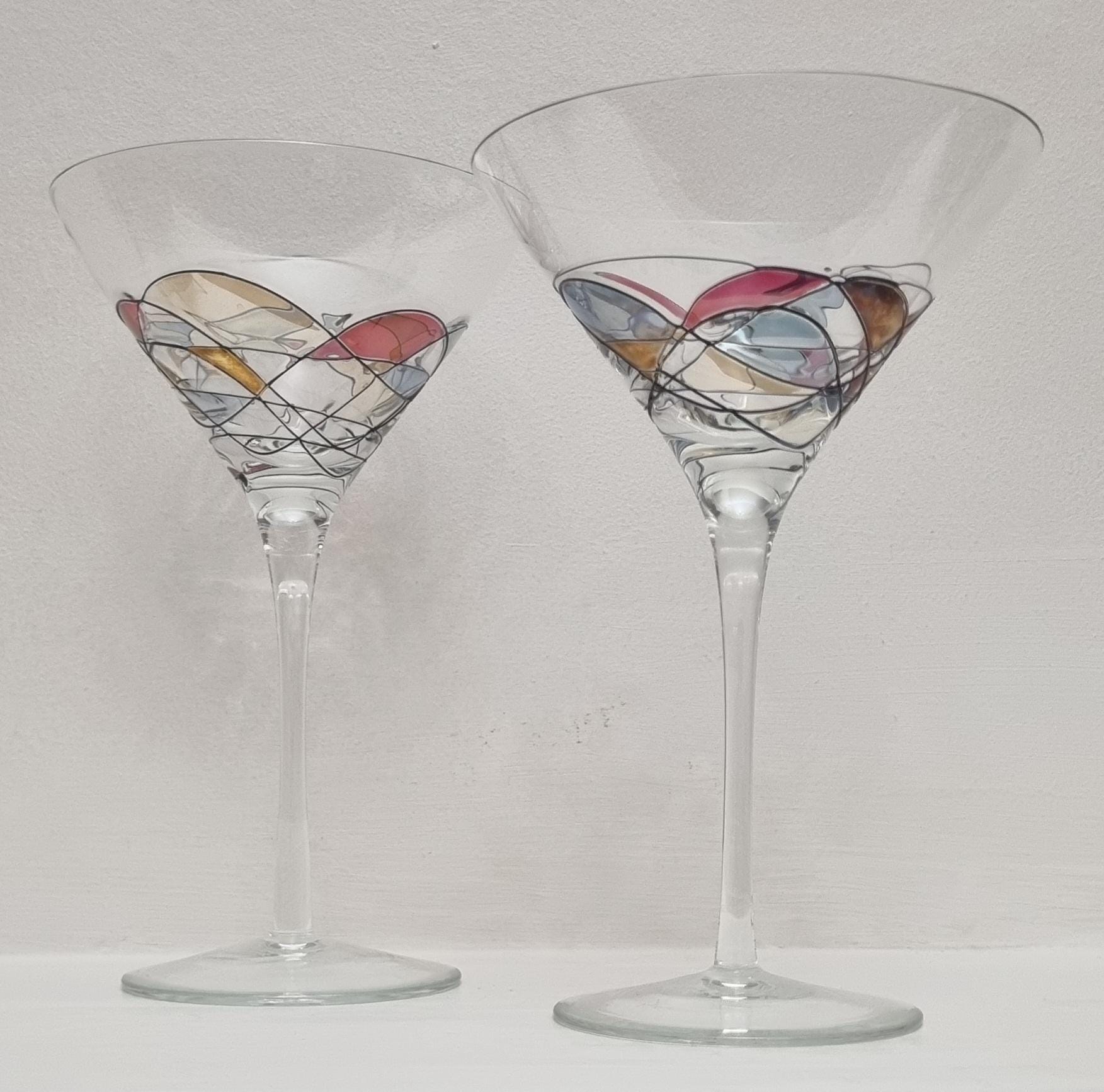 Stylish Artland Romania Helios Martini Glasses, known for their distinctive hand-painted, abstract stained-glass design. Each piece is mouth-blown and handcrafted. Please note the different sizes.
