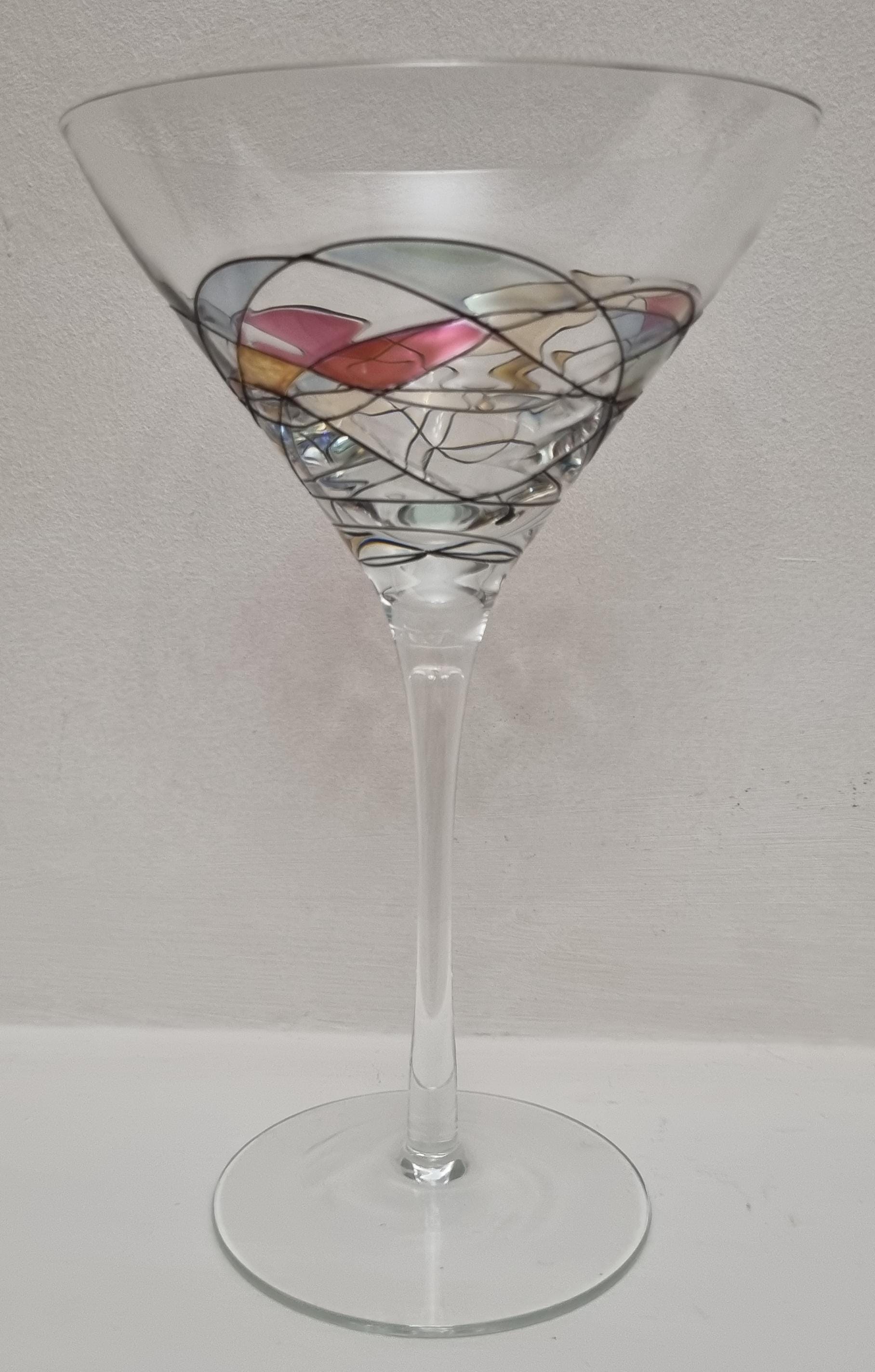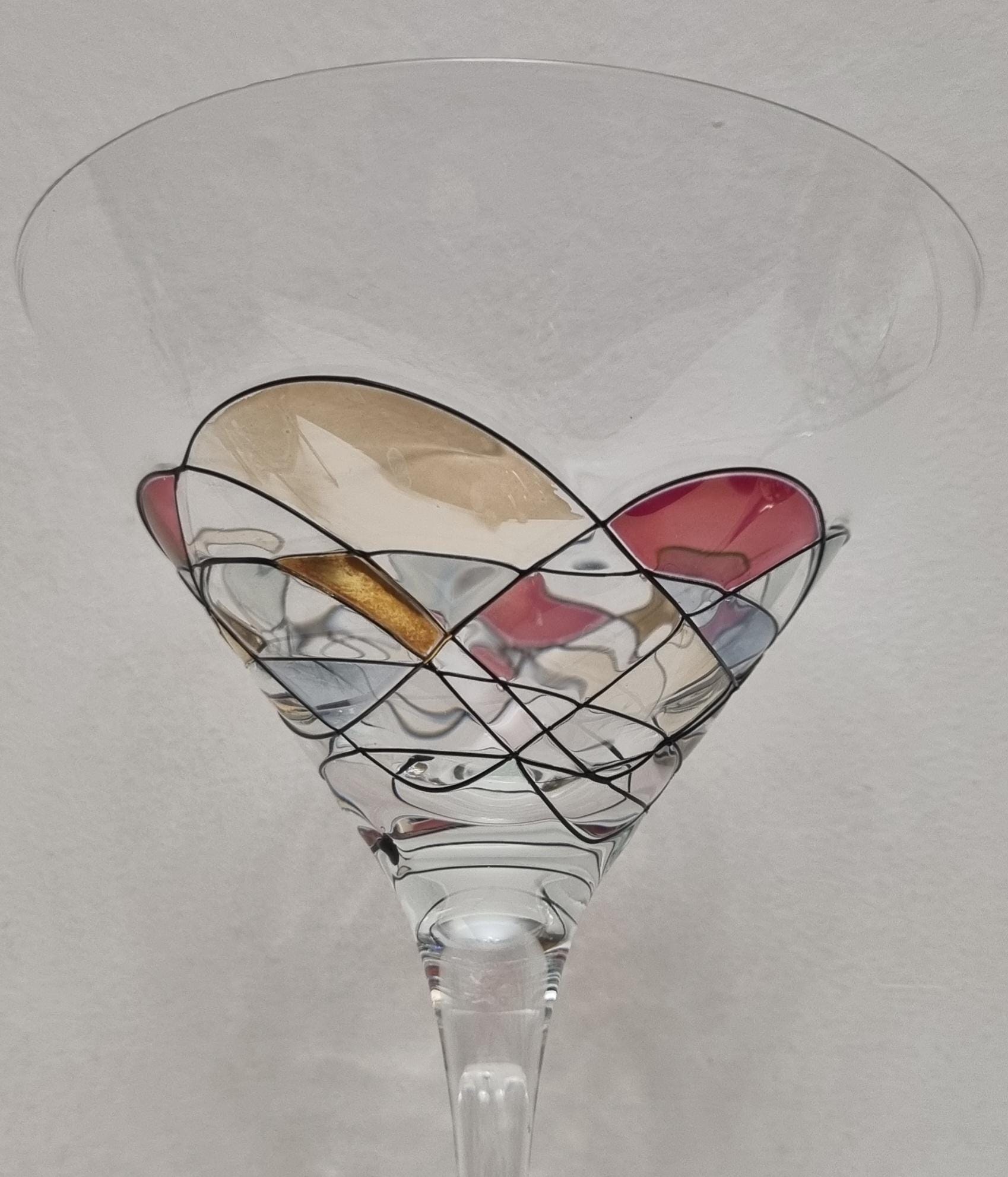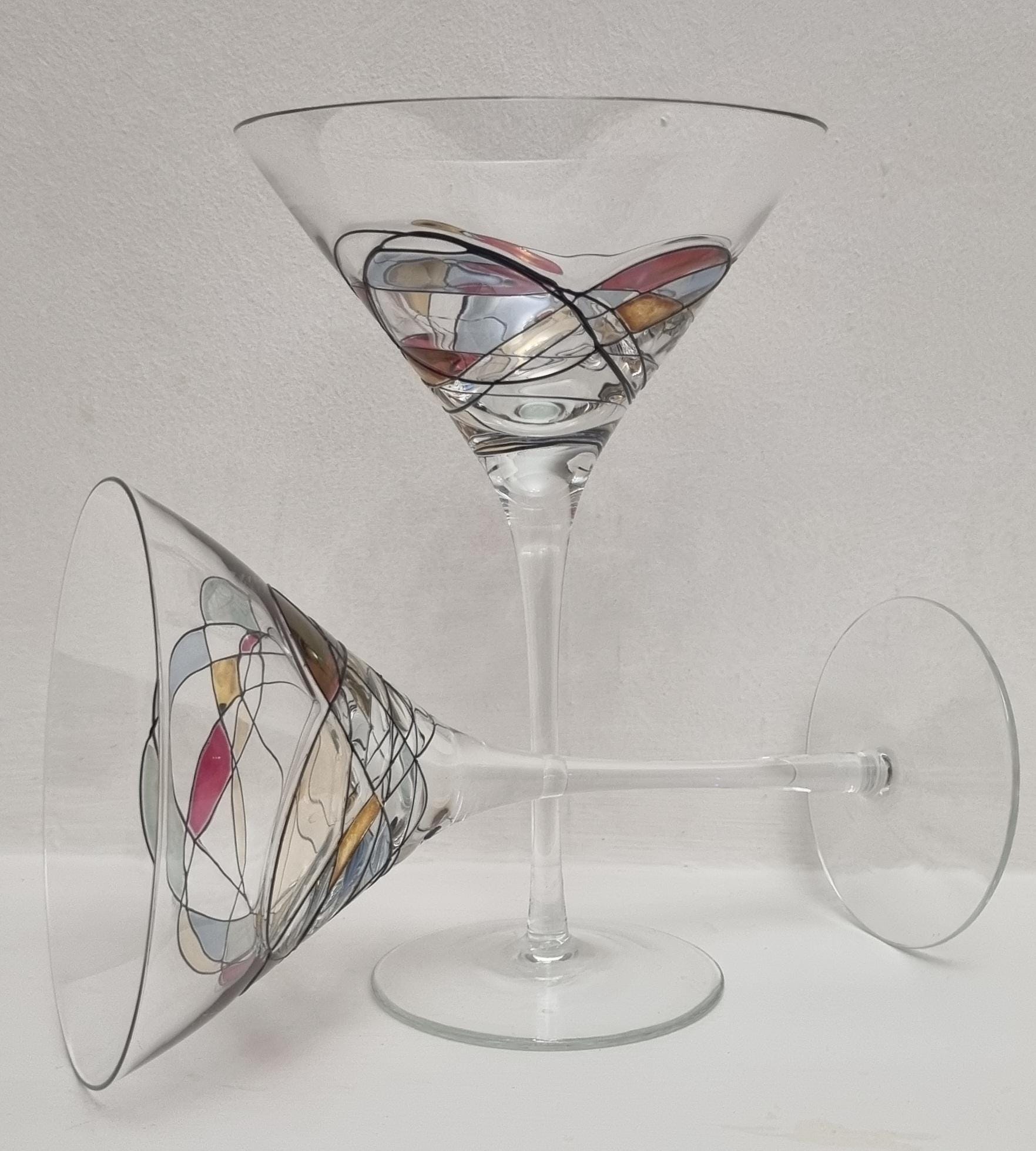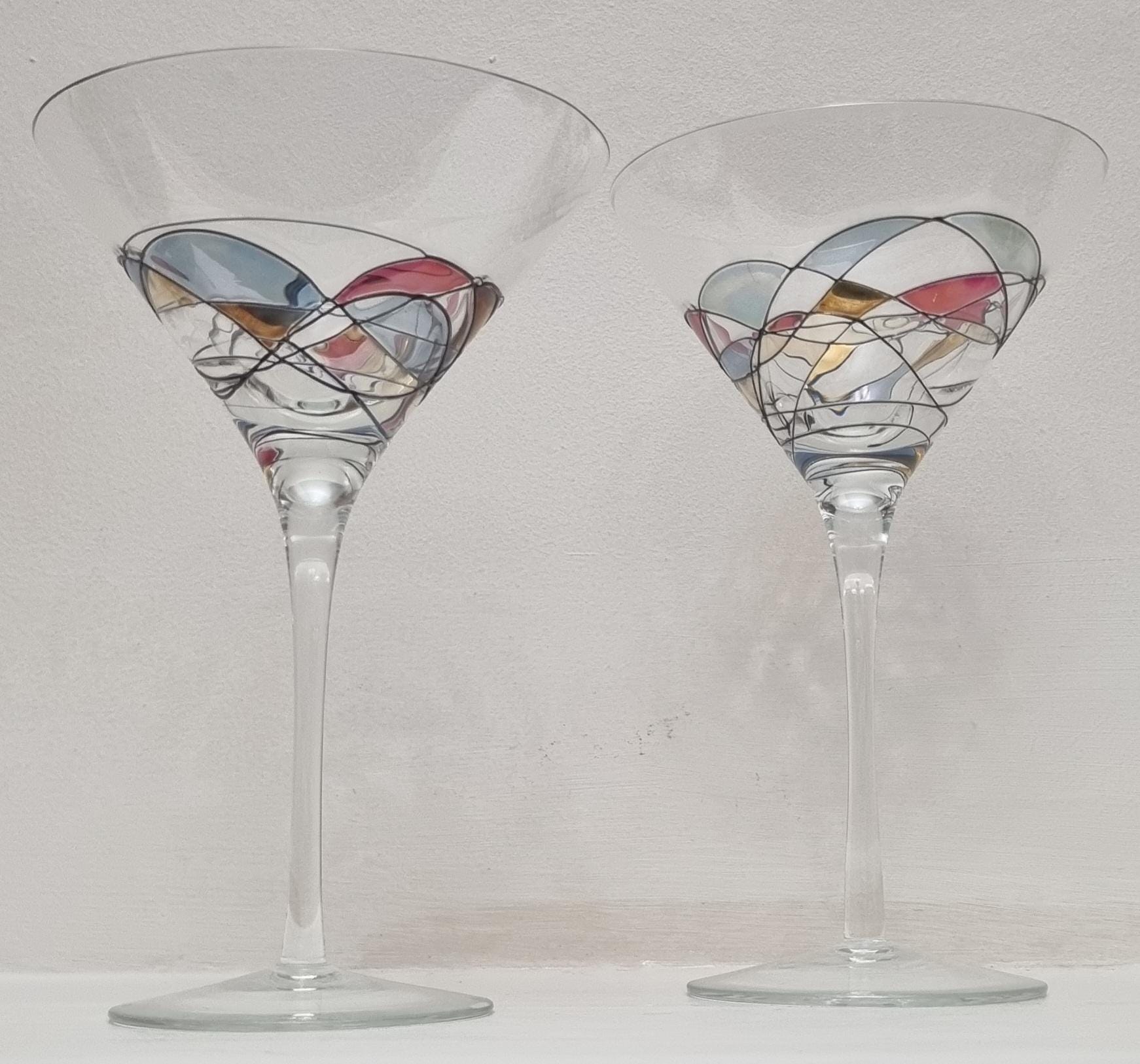 Stylish Artland Romania Helios Martini Glasses, known for their distinctive hand-painted, abstract stained-glass design. Each piece is mouth-blown and handcrafted. Please note the different sizes.