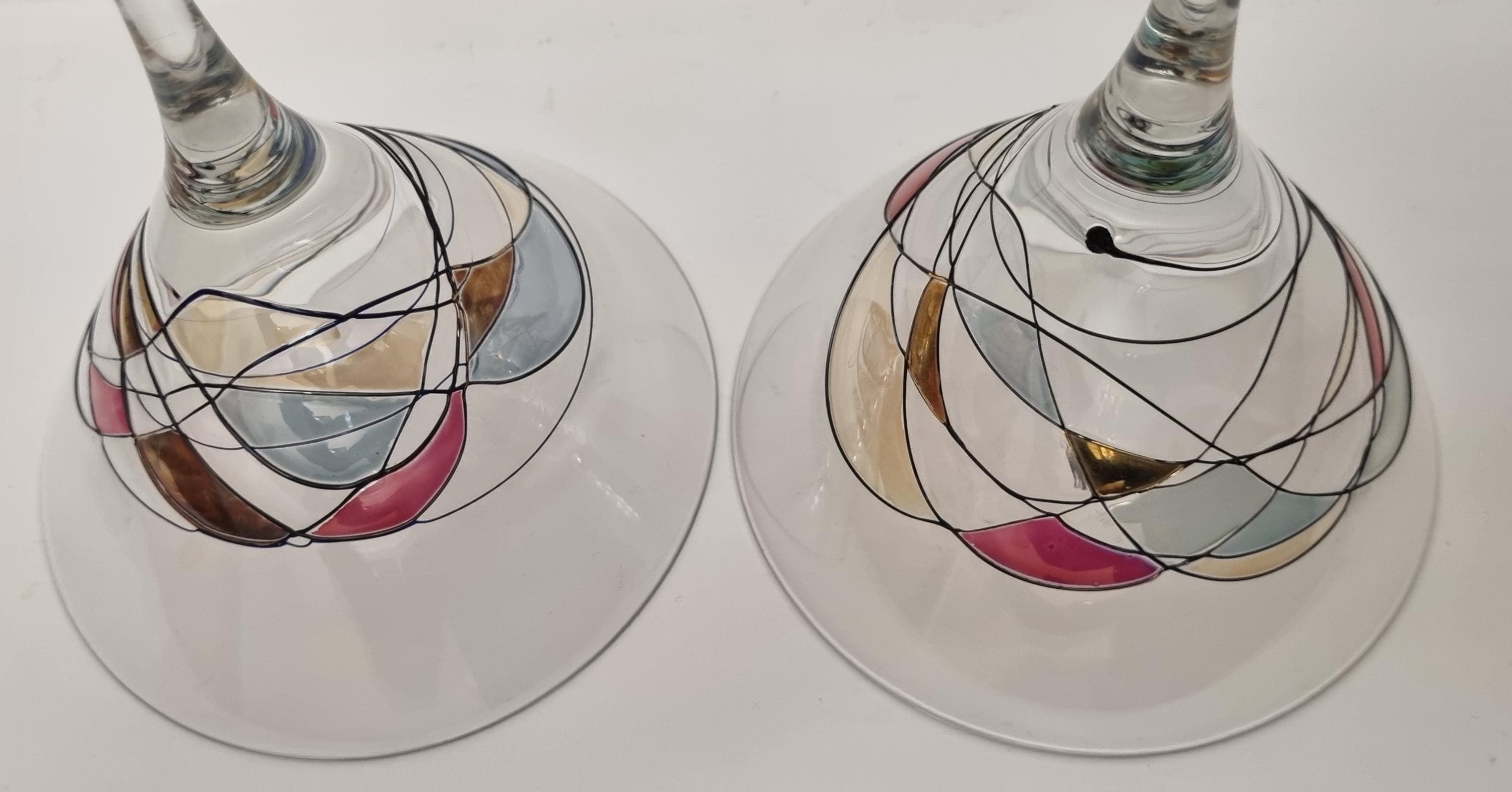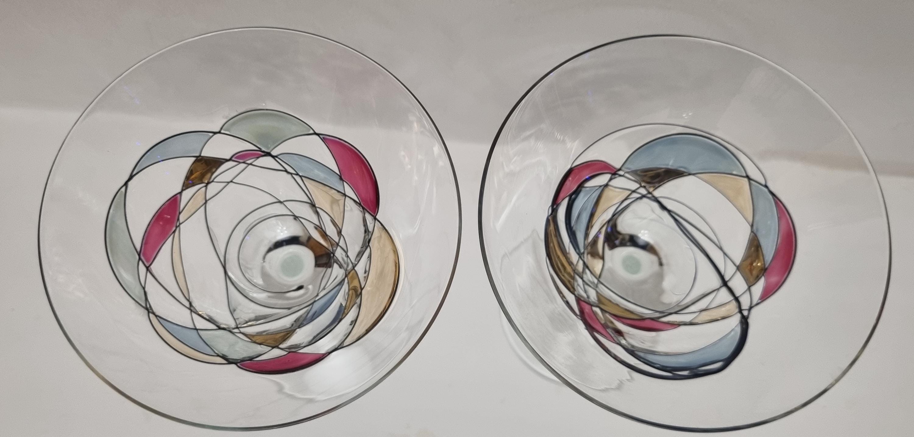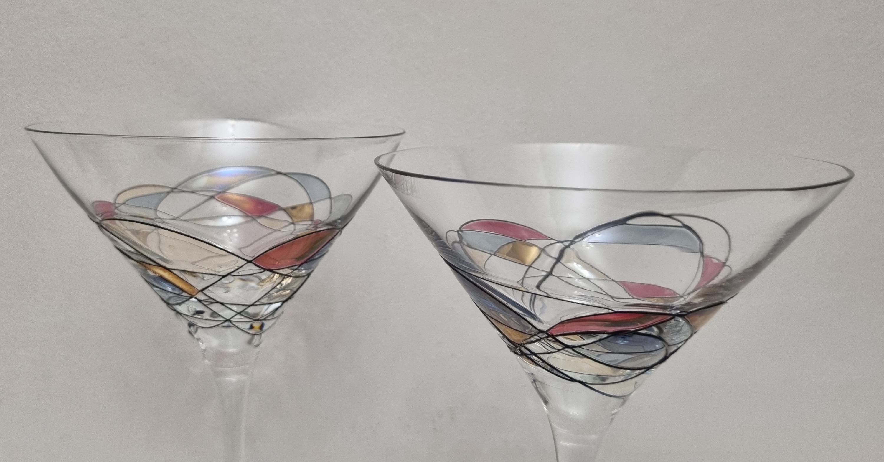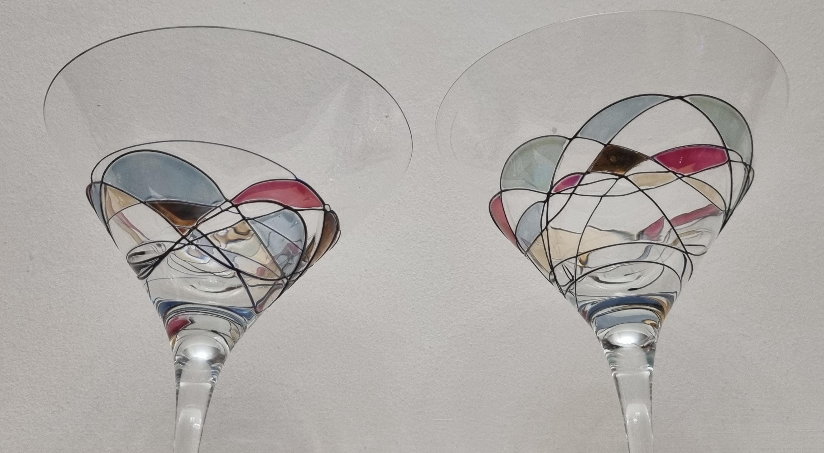 Stylish Artland Romania Helios Martini Glasses, known for their distinctive hand-painted, abstract stained-glass design. Each piece is mouth-blown and handcrafted. Please note the different sizes.