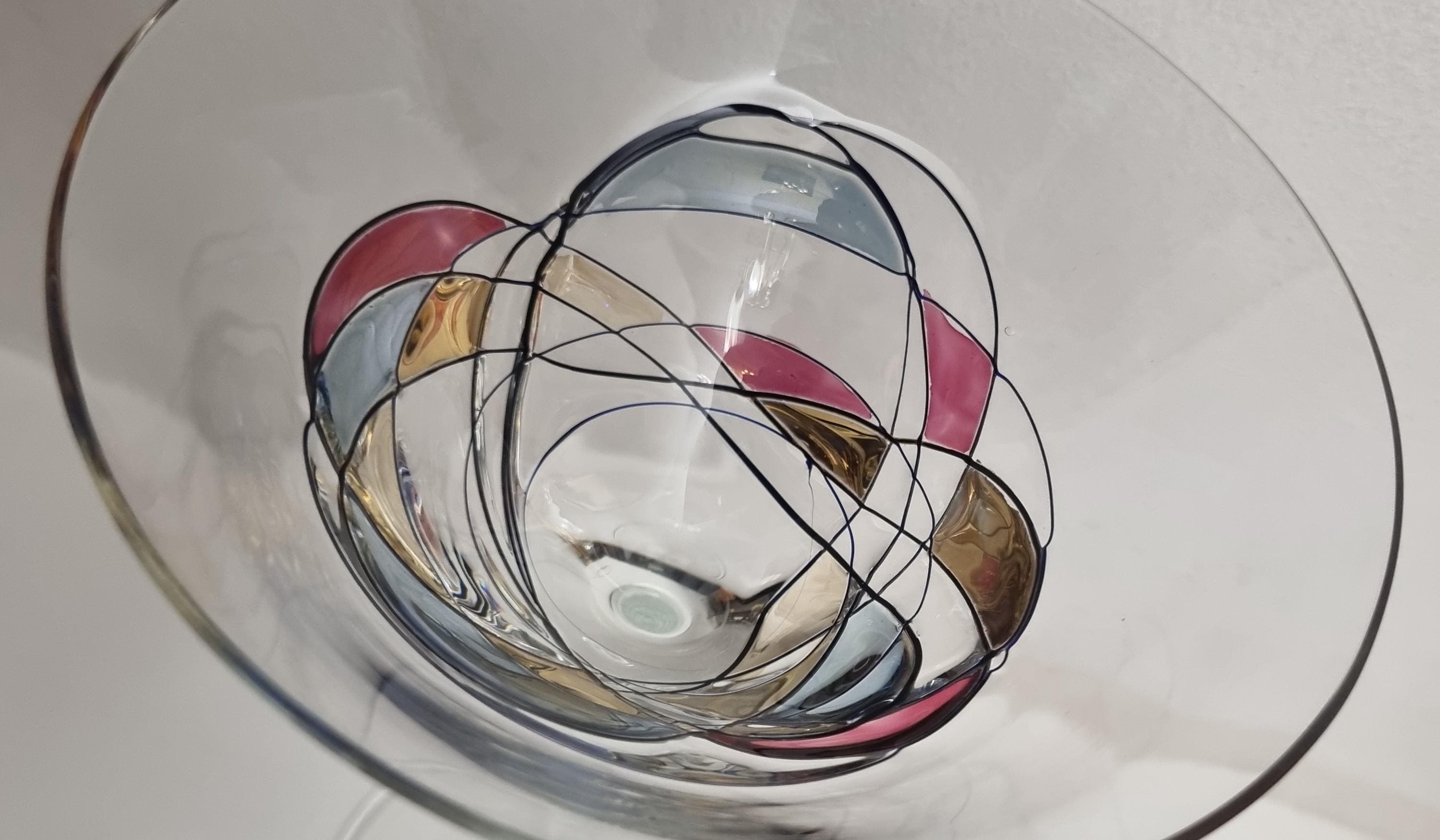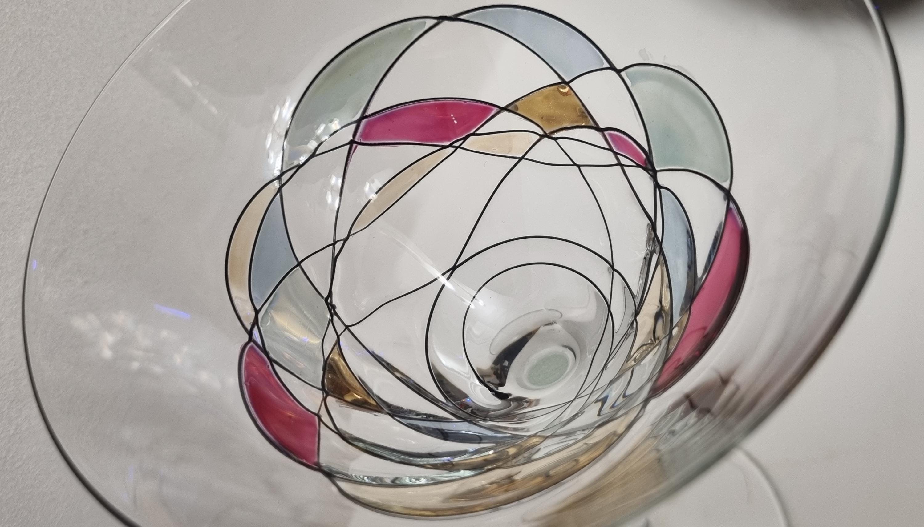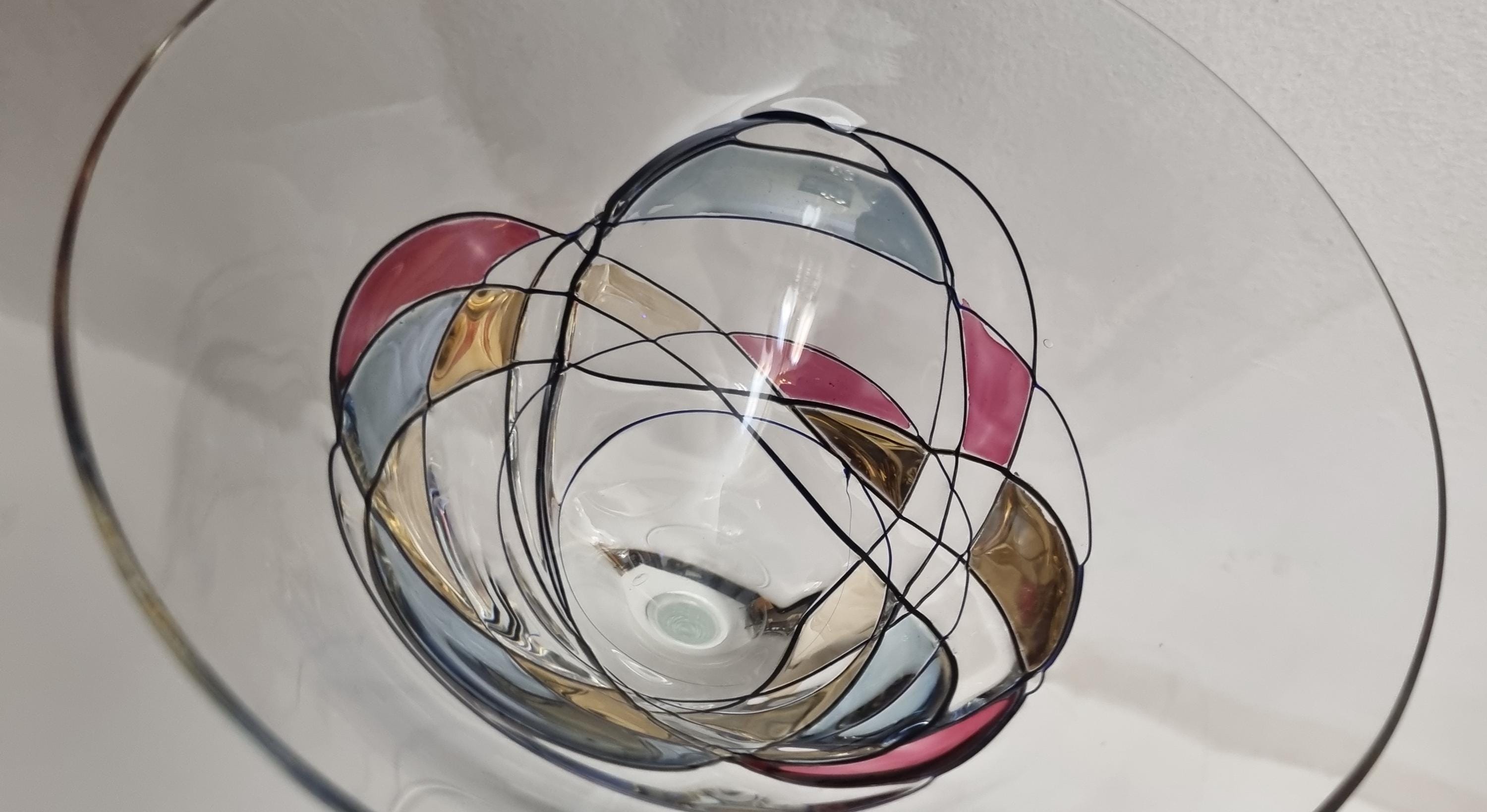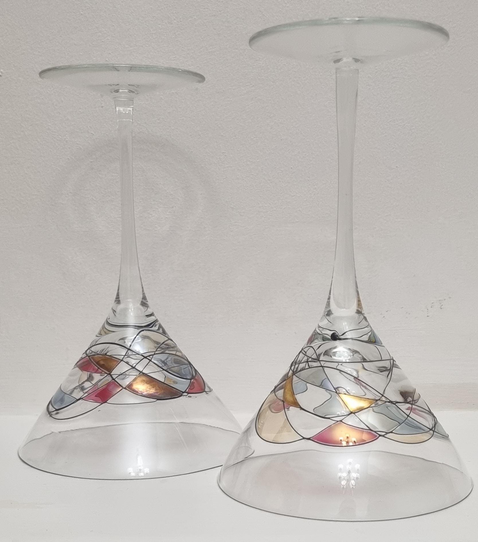 Stylish Artland Romania Helios Martini Glasses, known for their distinctive hand-painted, abstract stained-glass design. Each piece is mouth-blown and handcrafted. Please note the different sizes.