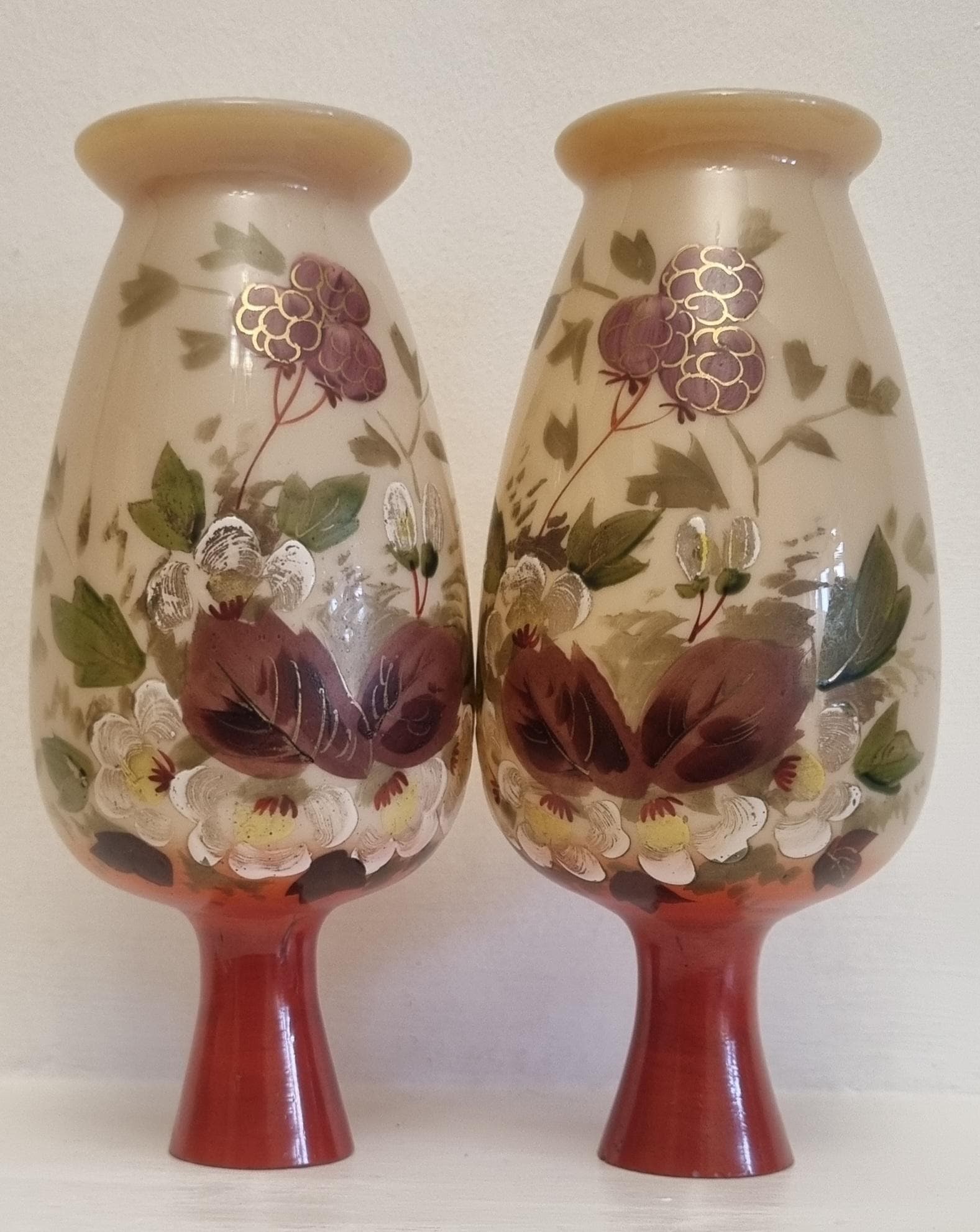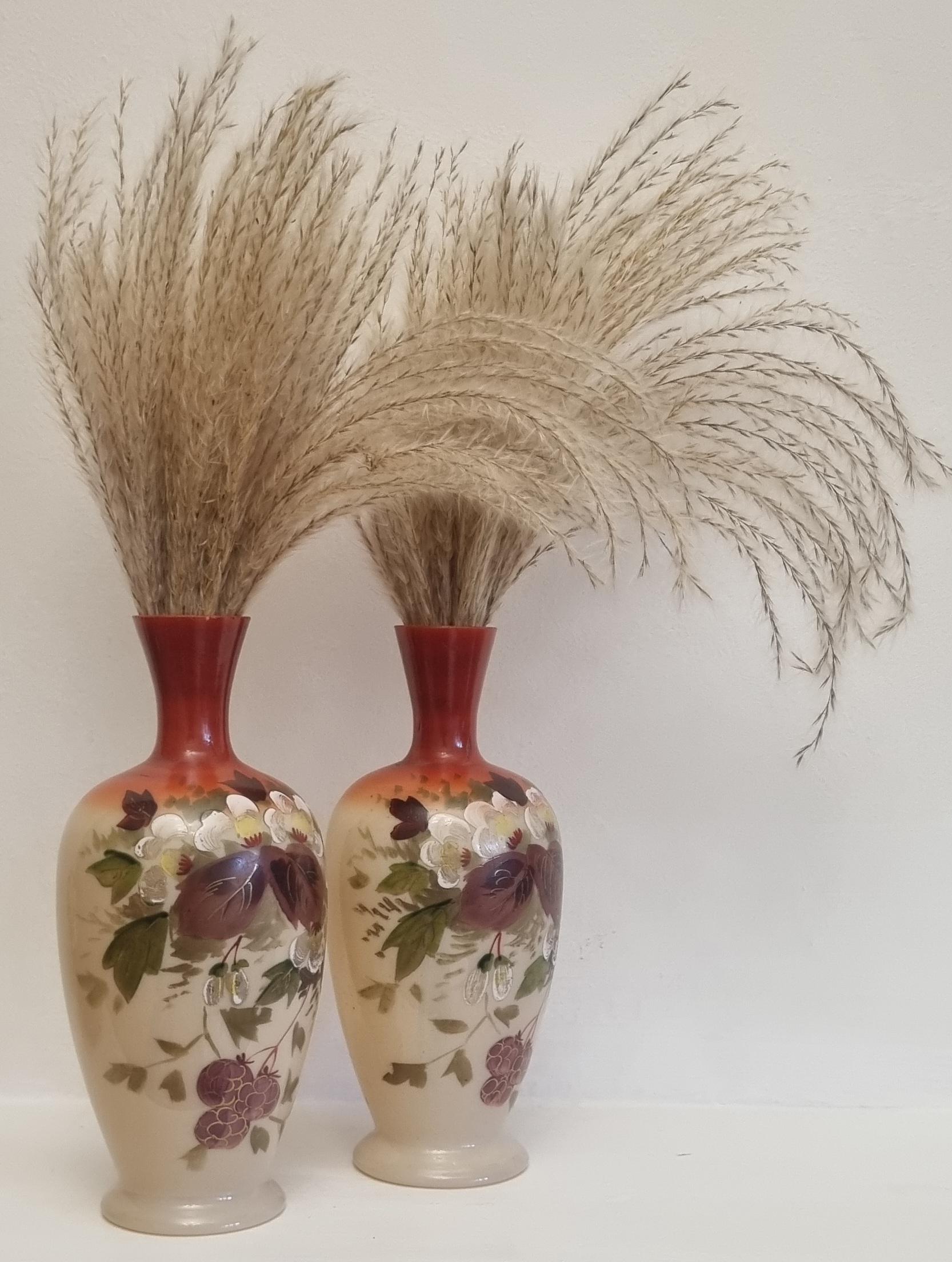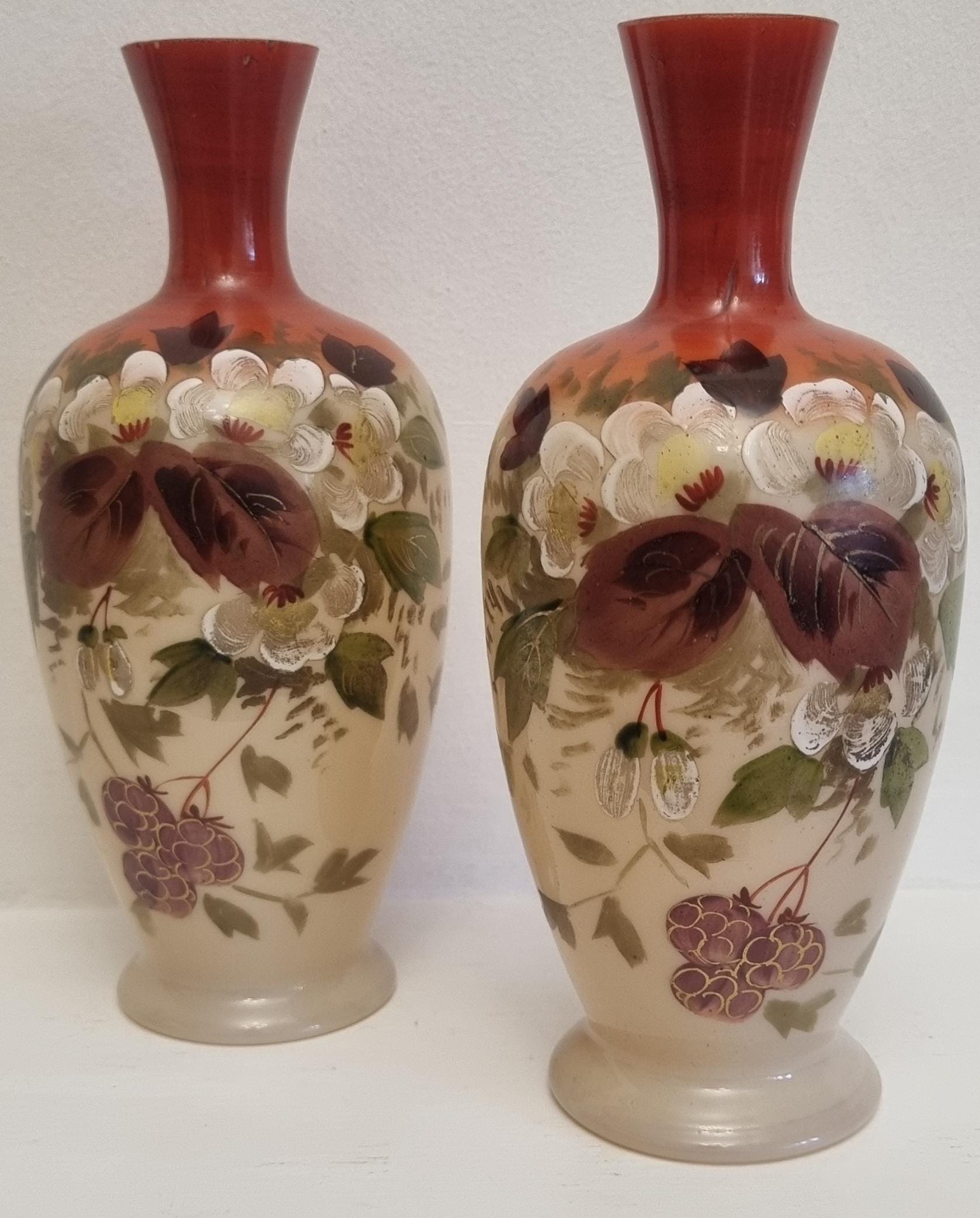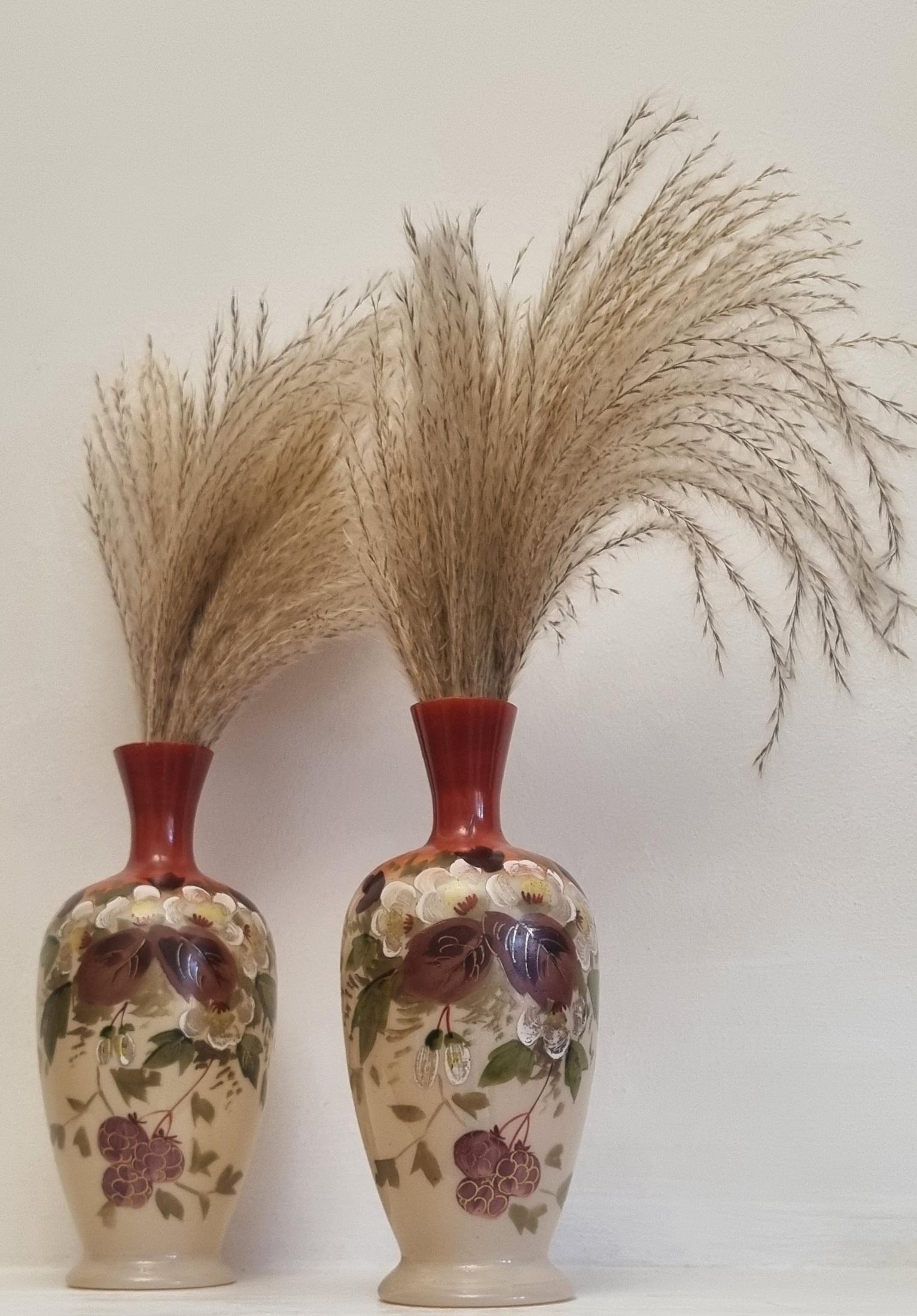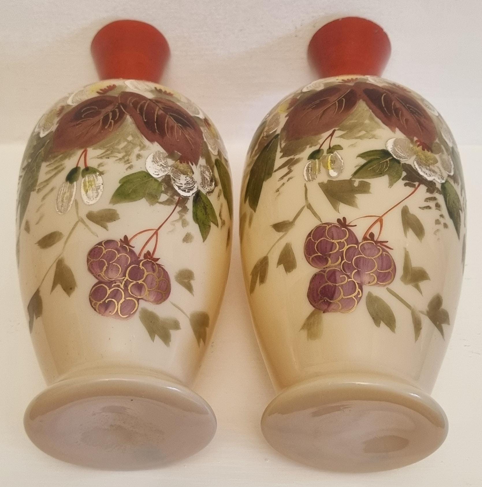 Decorative and Collectible hand-painted opaline vases. They feature a floral and berry design on a beige/cream-colored opaline glass body, with a reddish-brown neck.