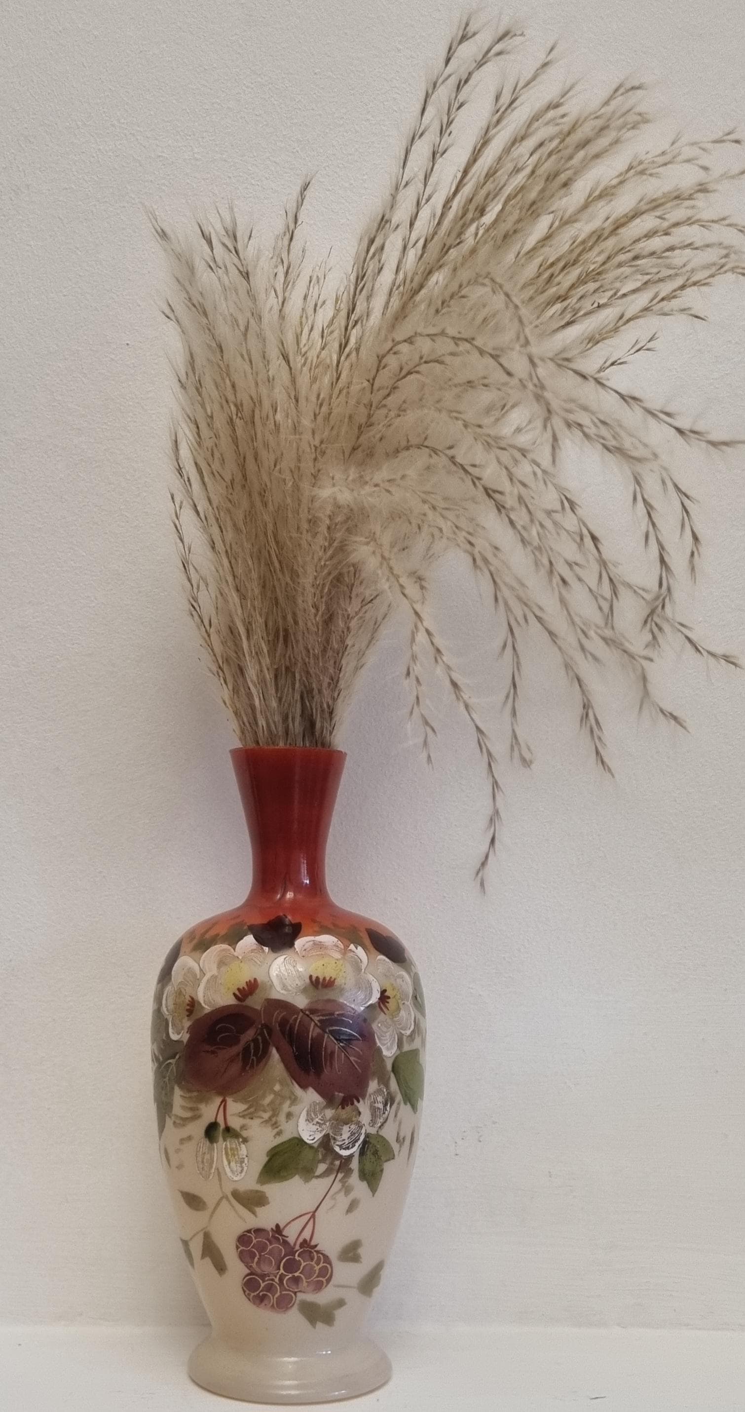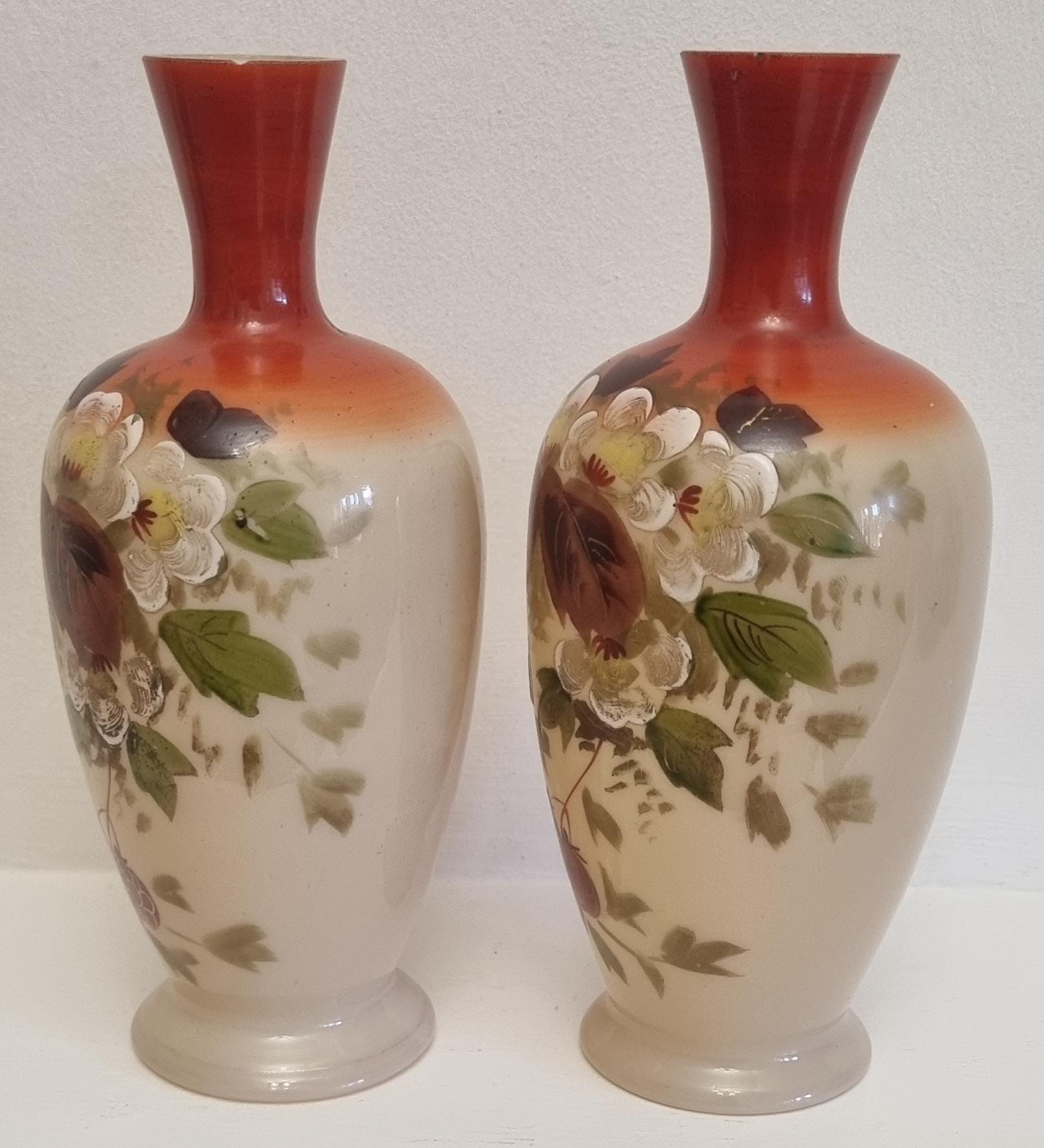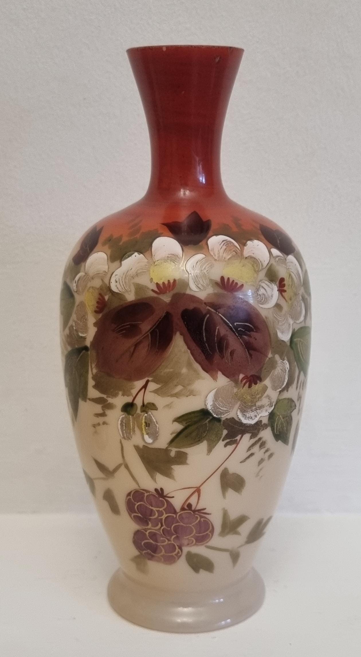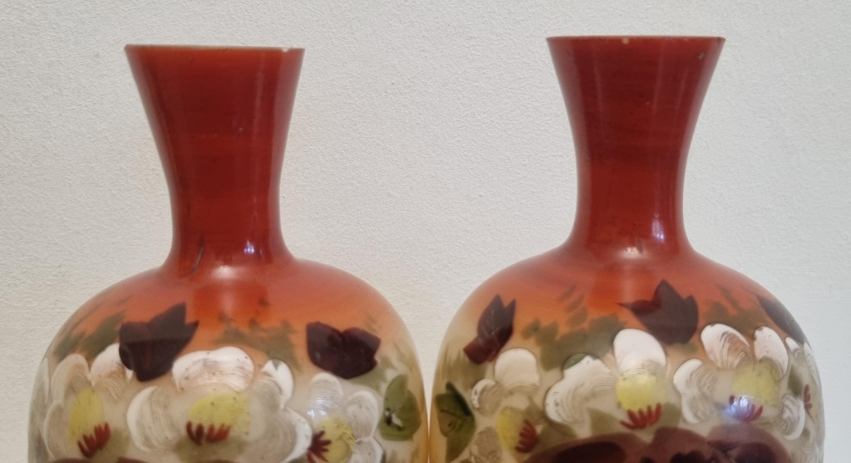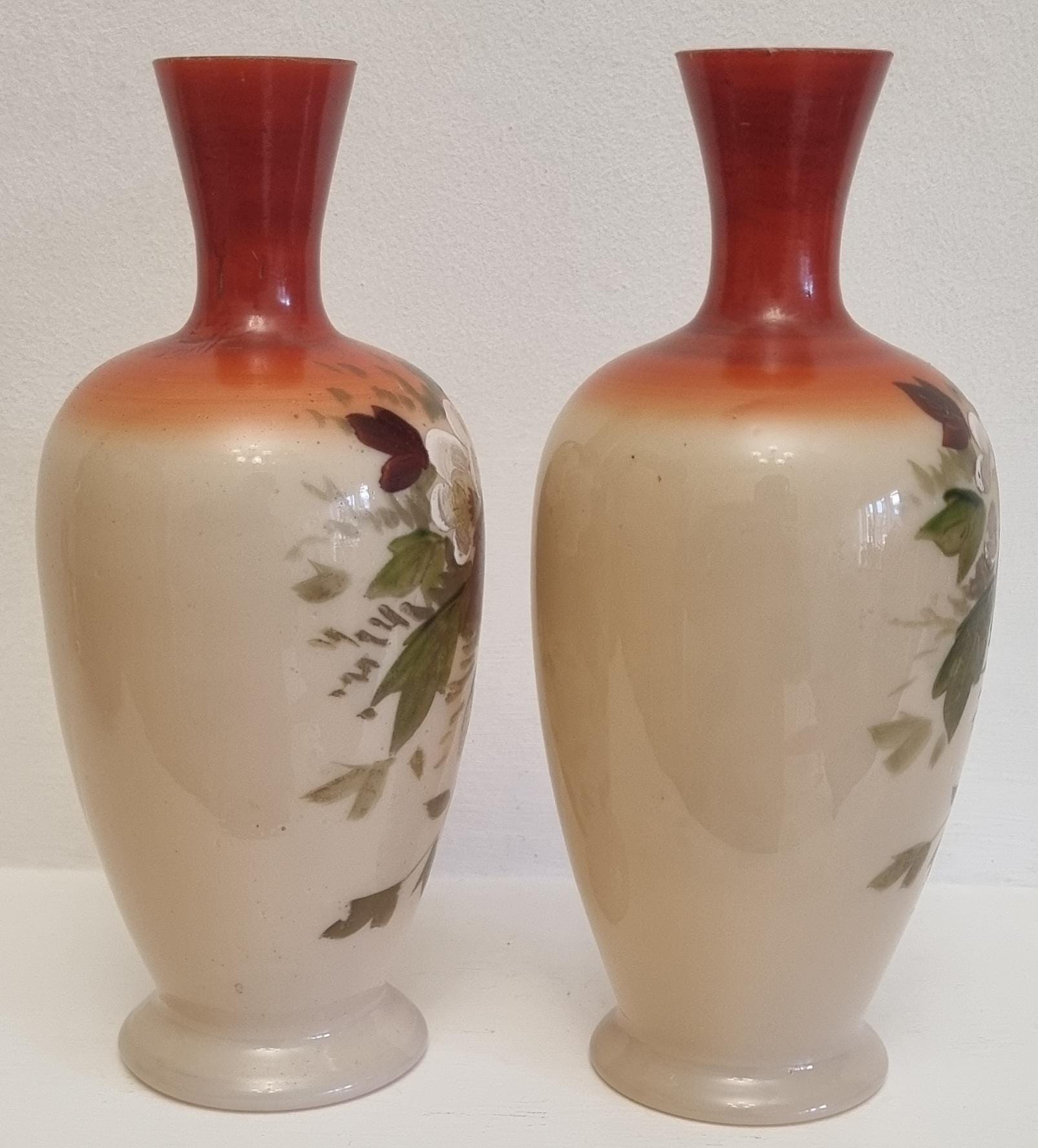 Decorative and Collectible hand-painted opaline vases. They feature a floral and berry design on a beige/cream-colored opaline glass body, with a reddish-brown neck.