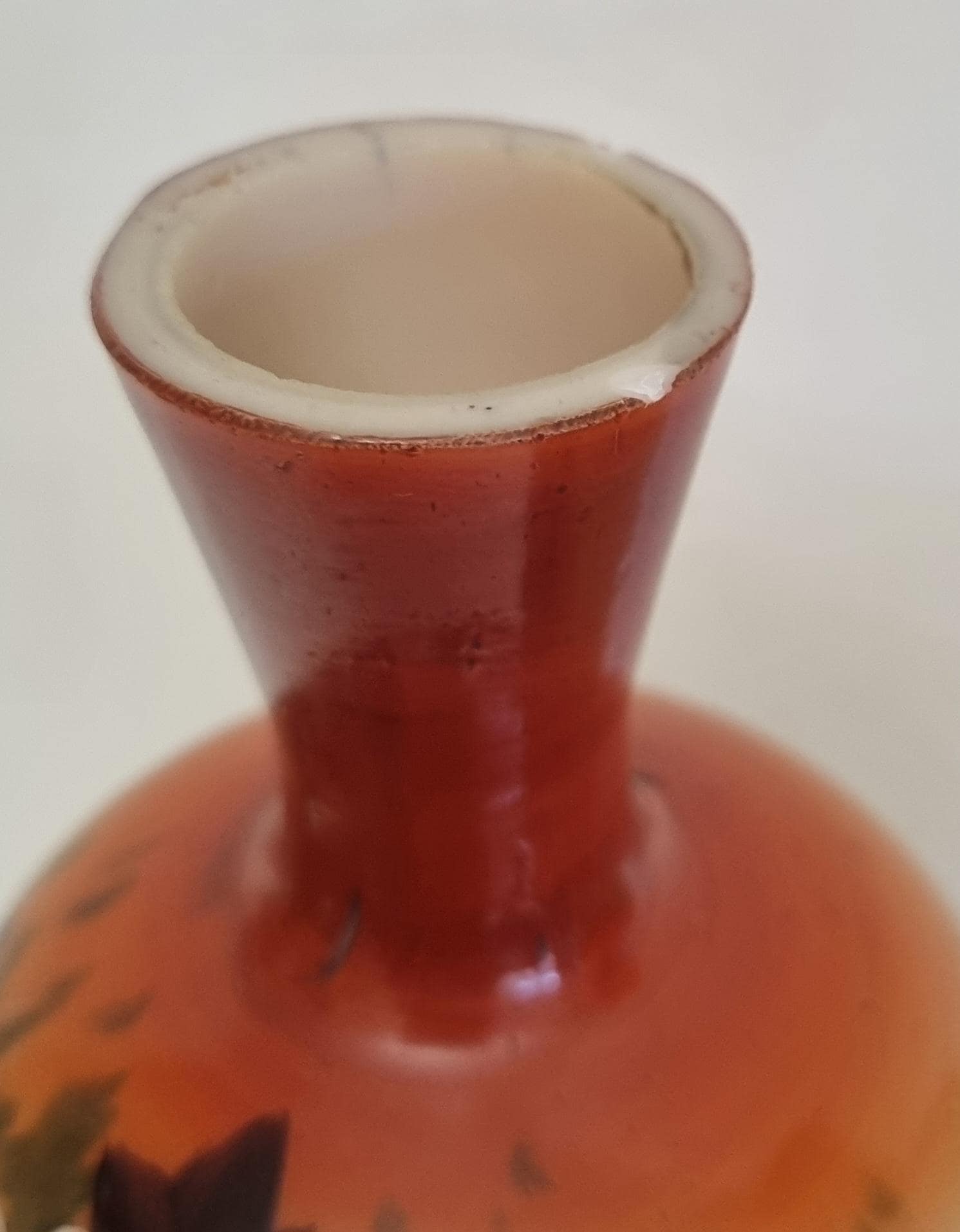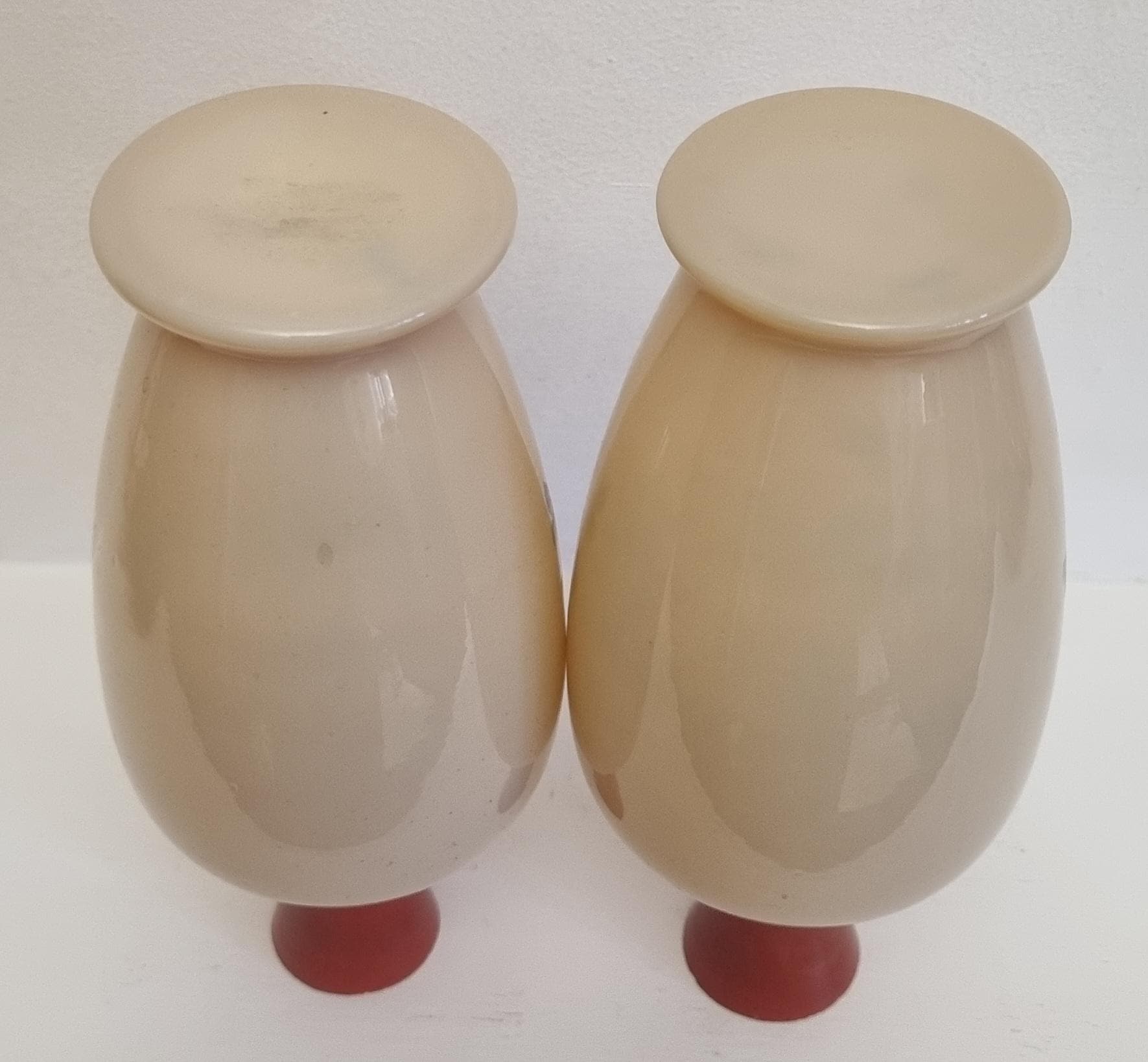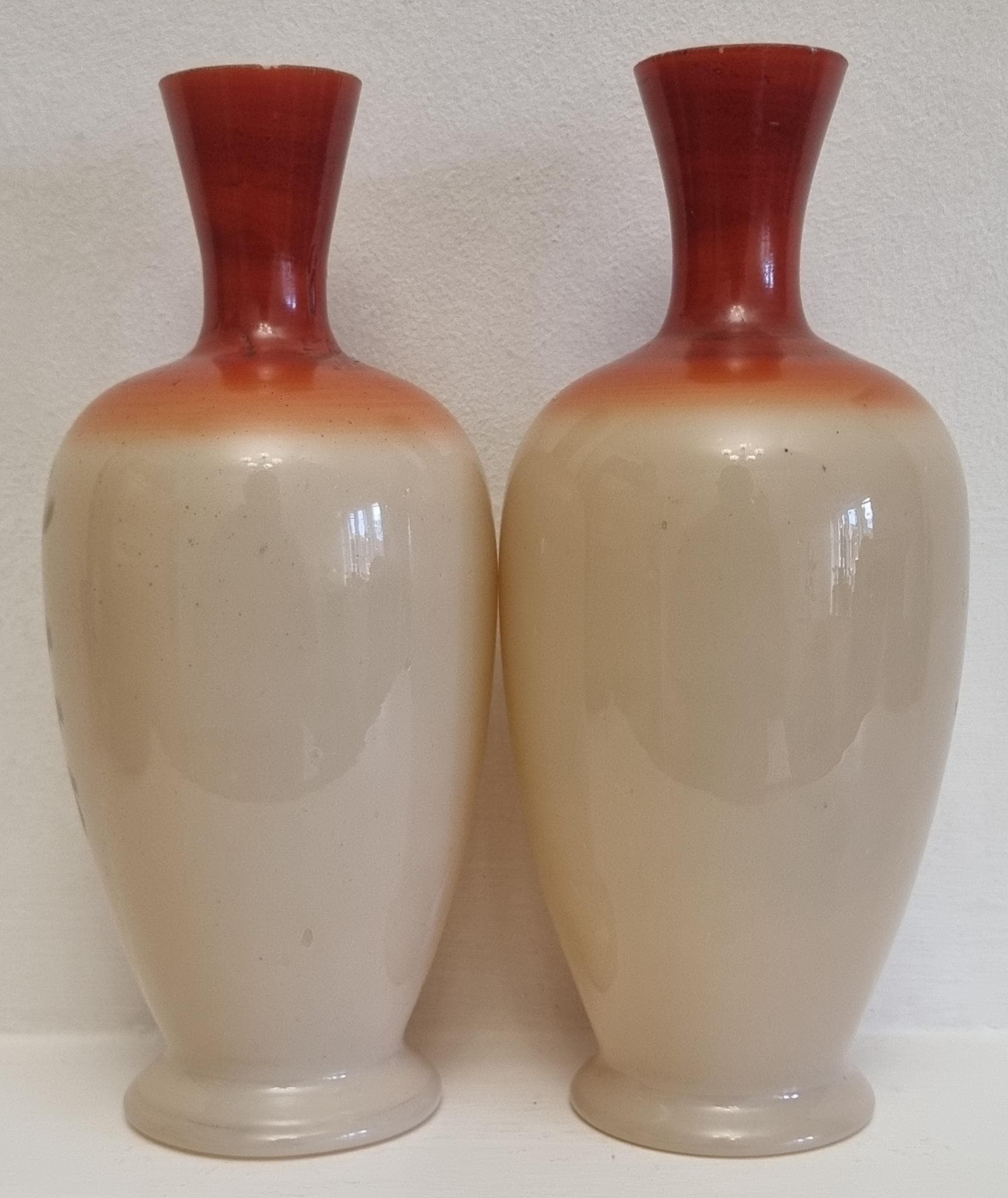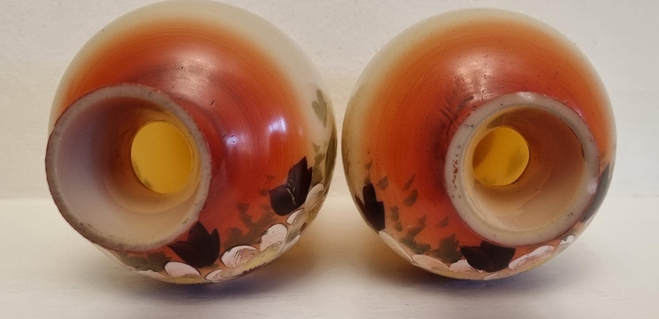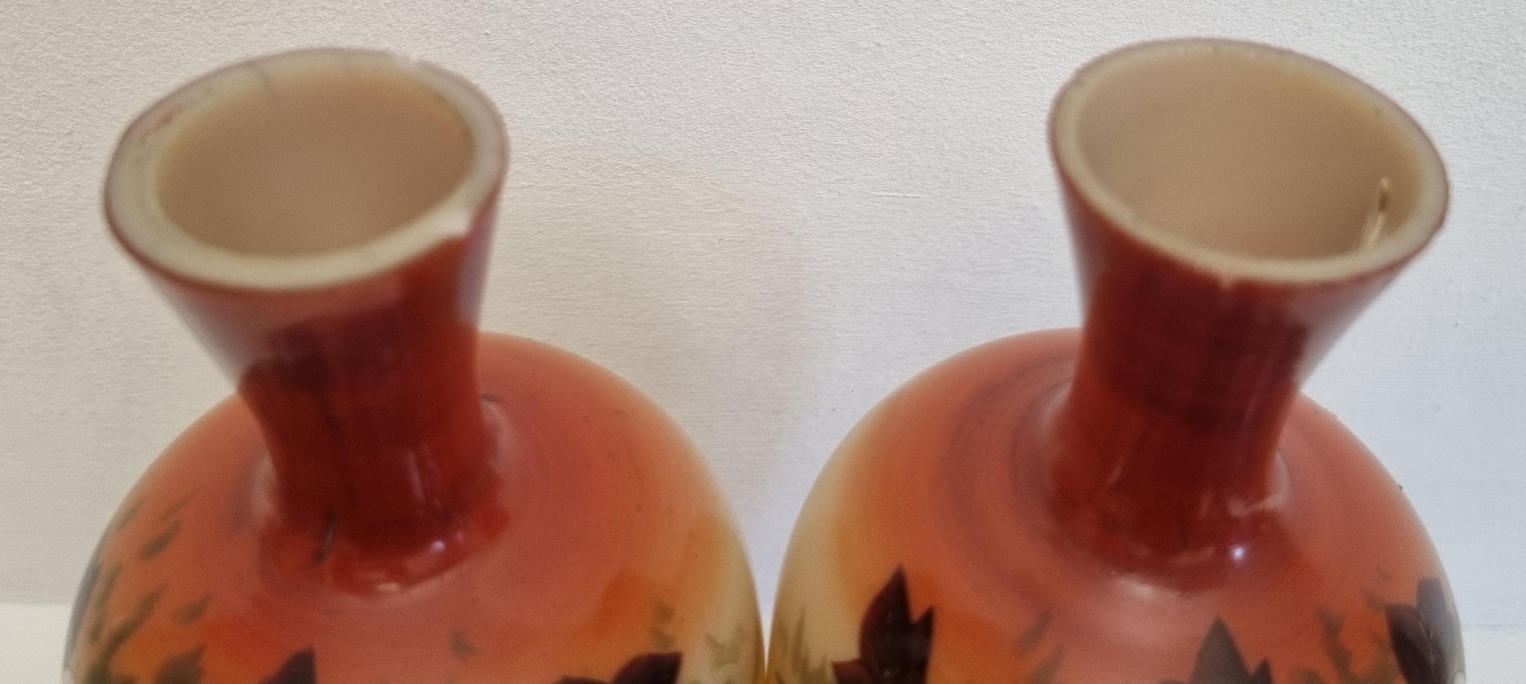Decorative and Collectible hand-painted opaline vases. They feature a floral and berry design on a beige/cream-colored opaline glass body, with a reddish-brown neck.