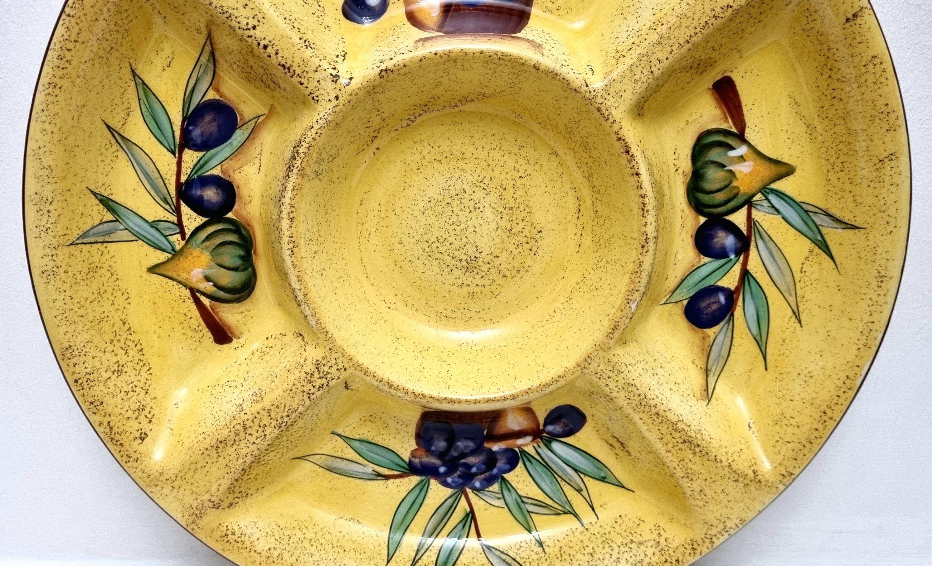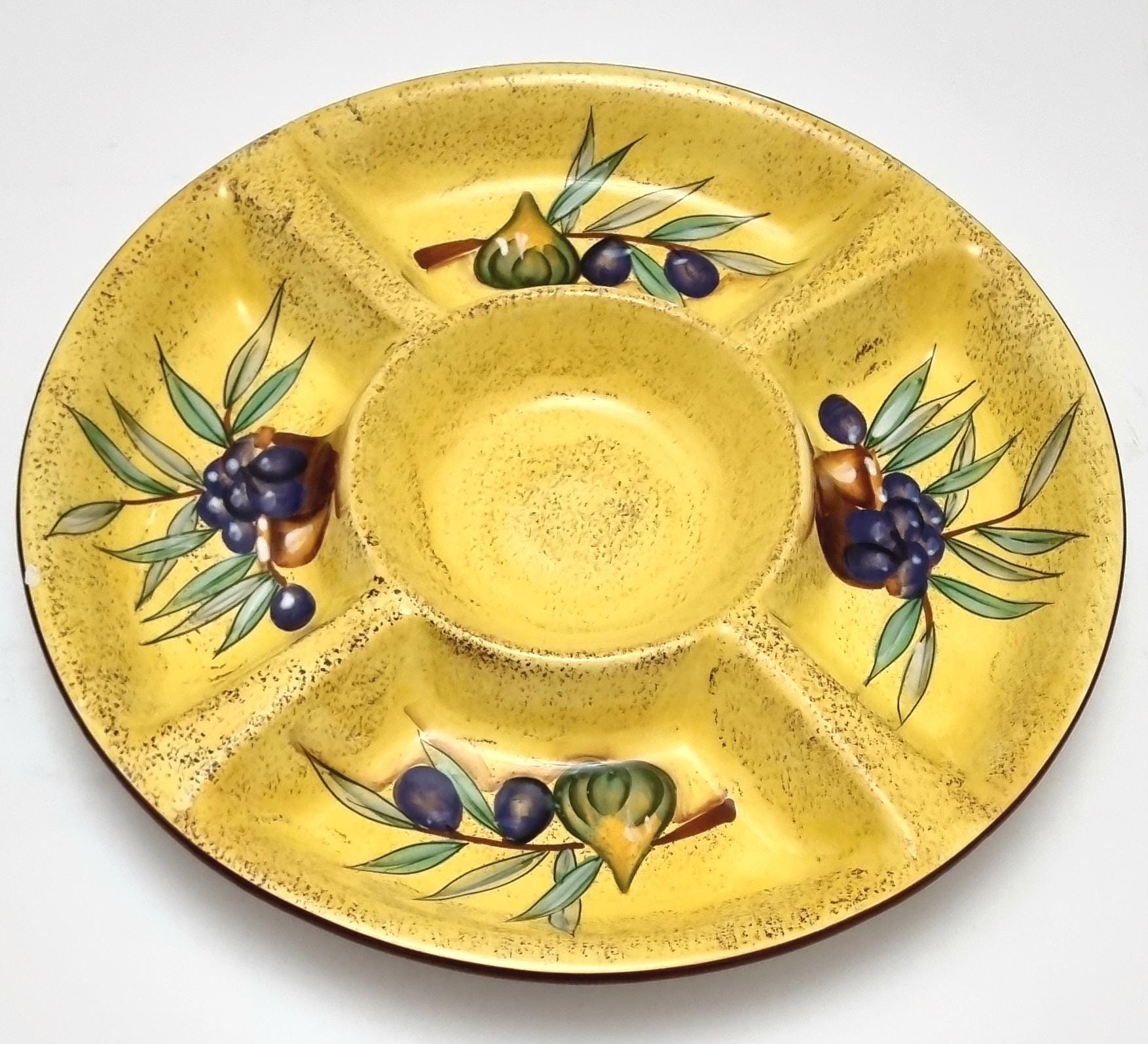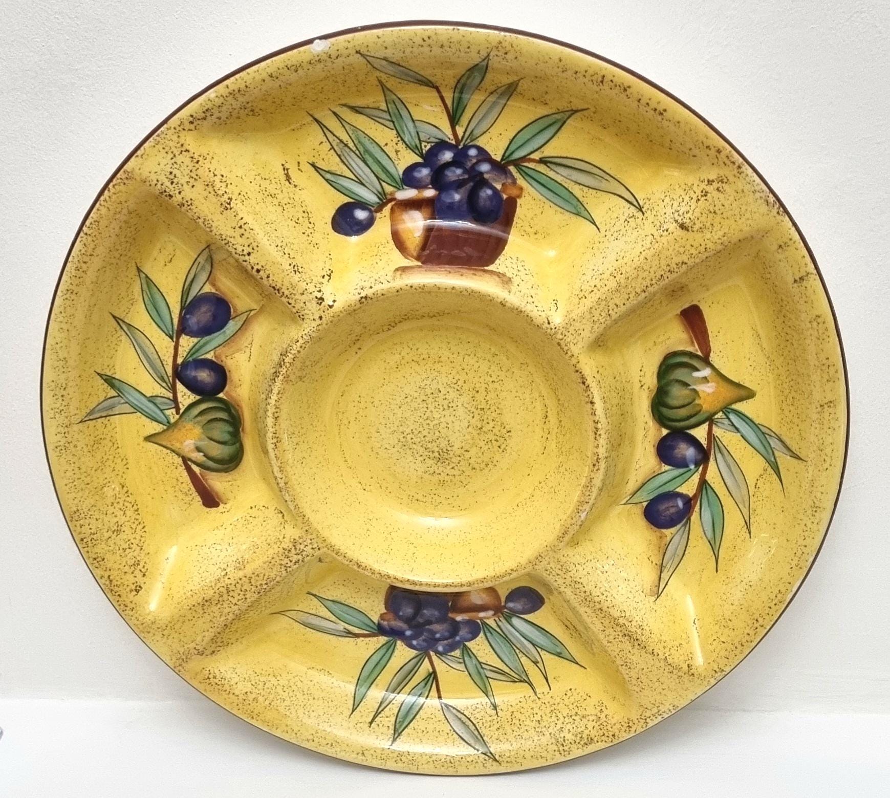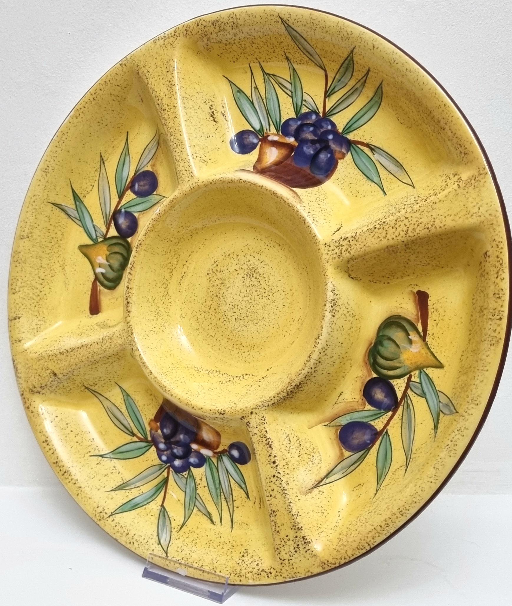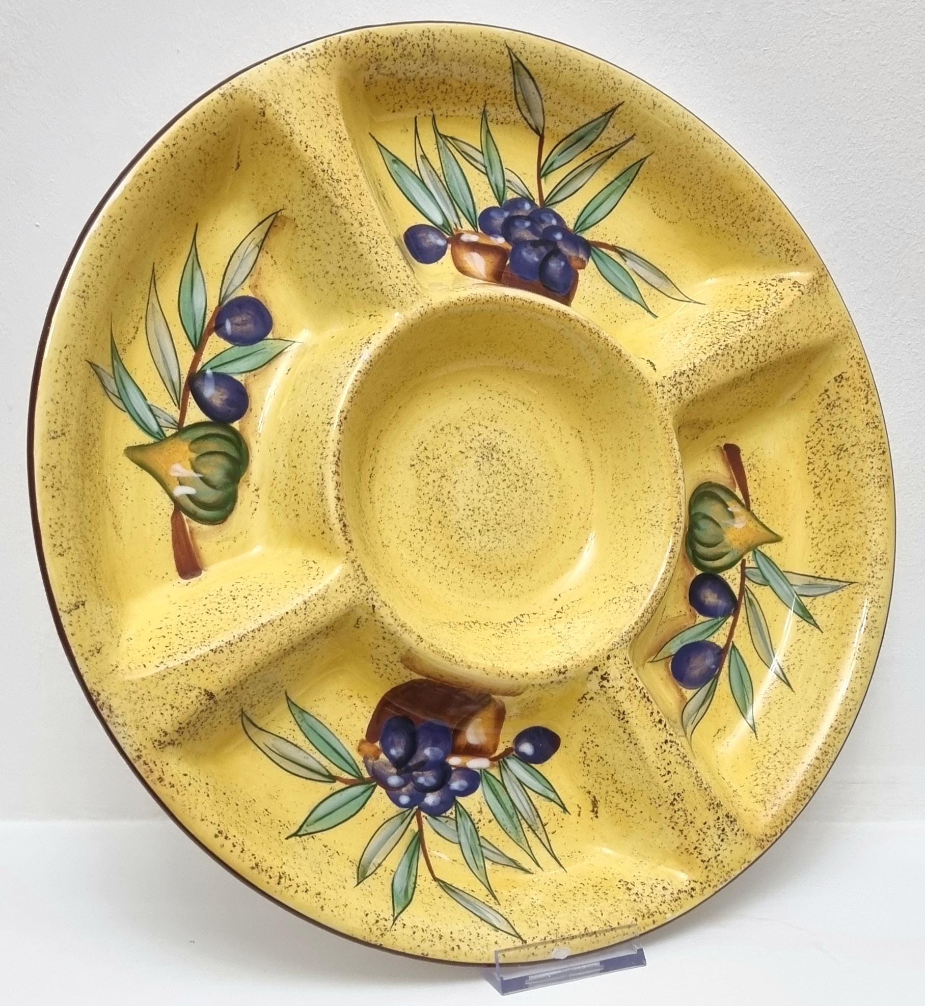 A fun serving platter featuring hand-painted olives and figs. This five-compartment platter is designed for serving snacks, appetizers, dips, and olives.
