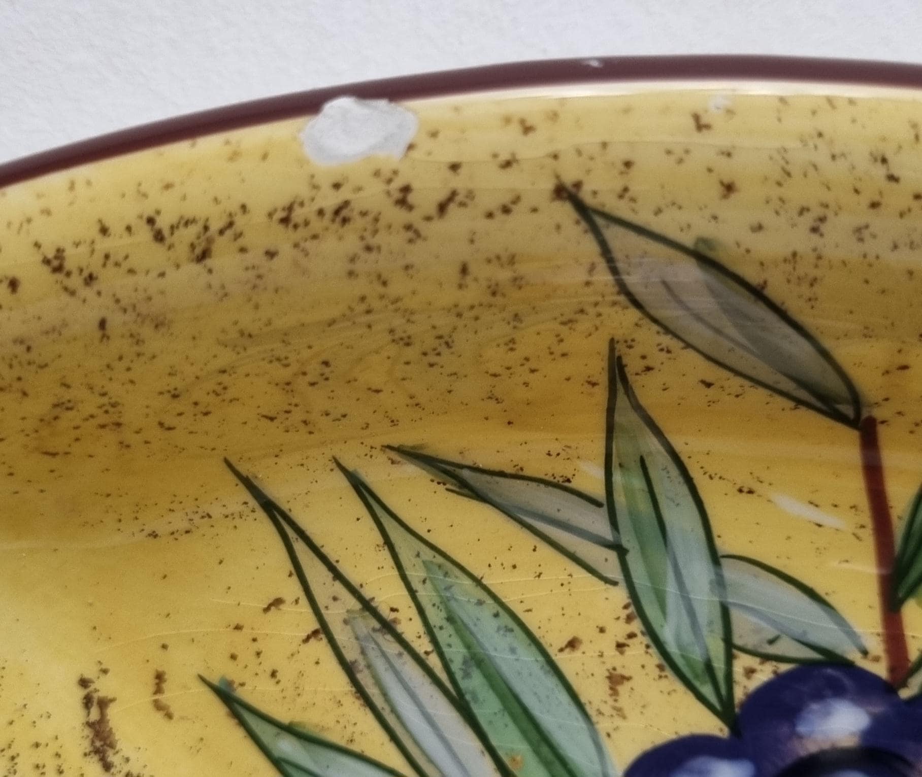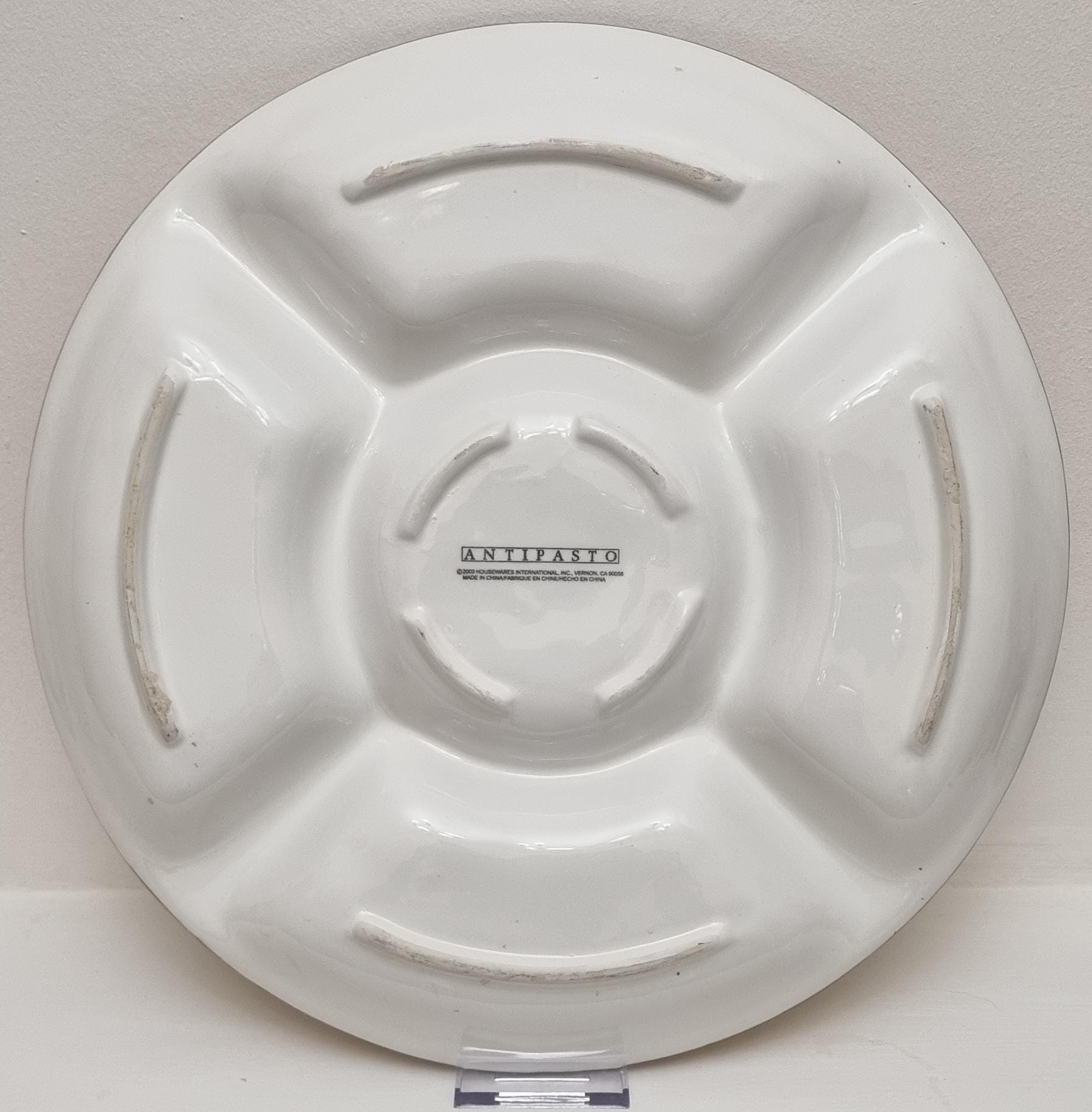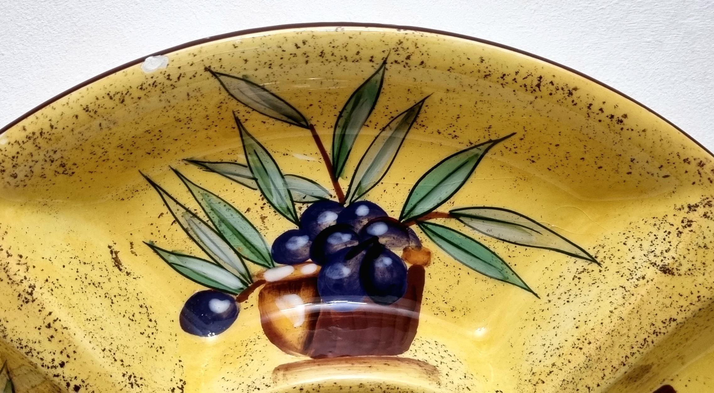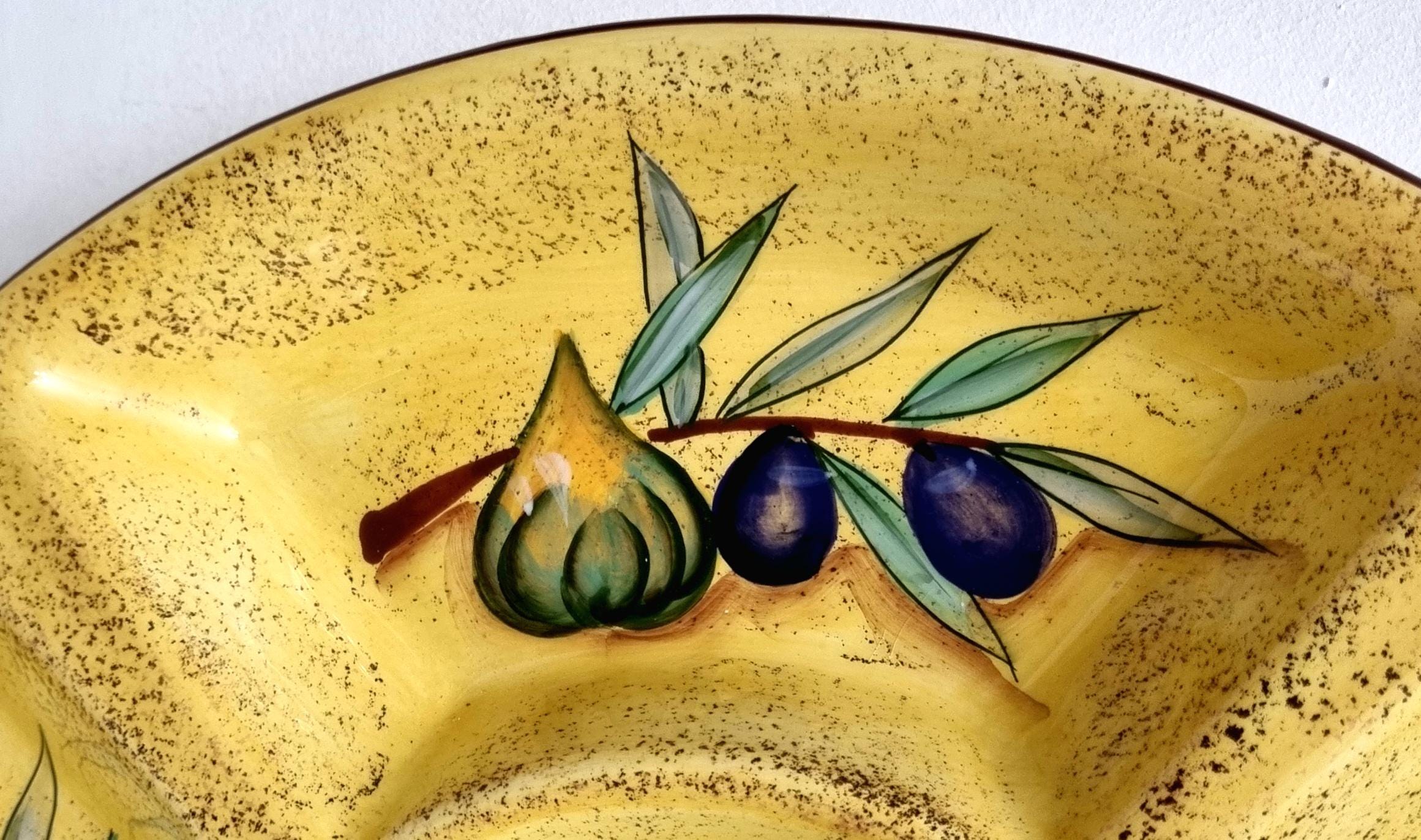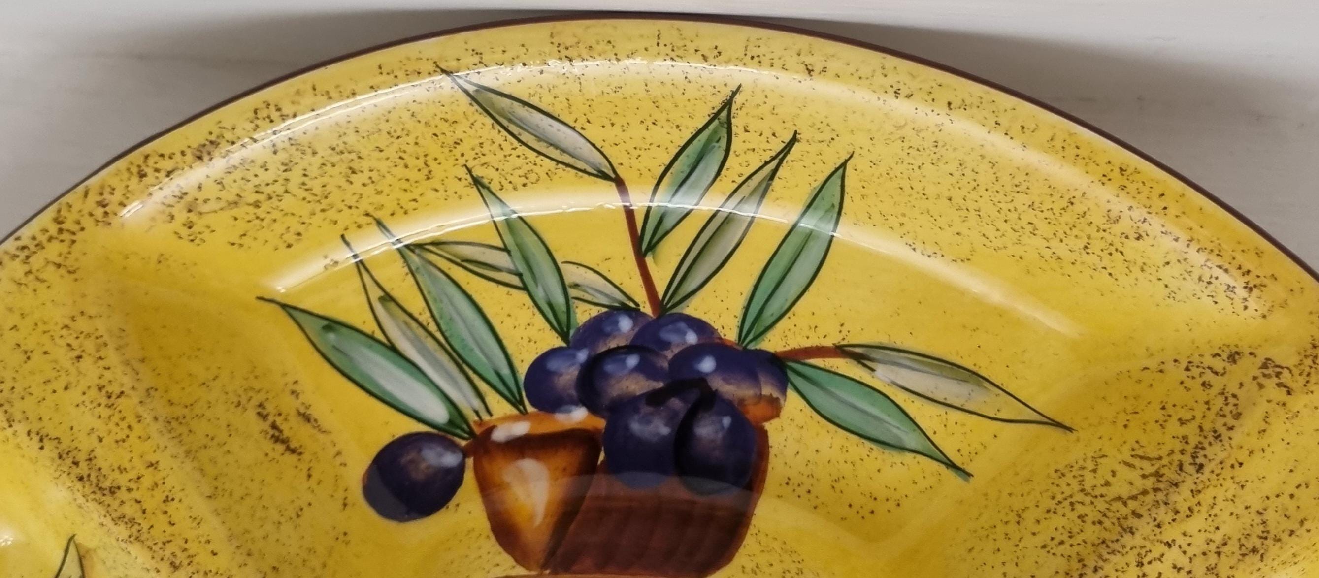 A fun serving platter featuring hand-painted olives and figs. This five-compartment platter is designed for serving snacks, appetizers, dips, and olives.