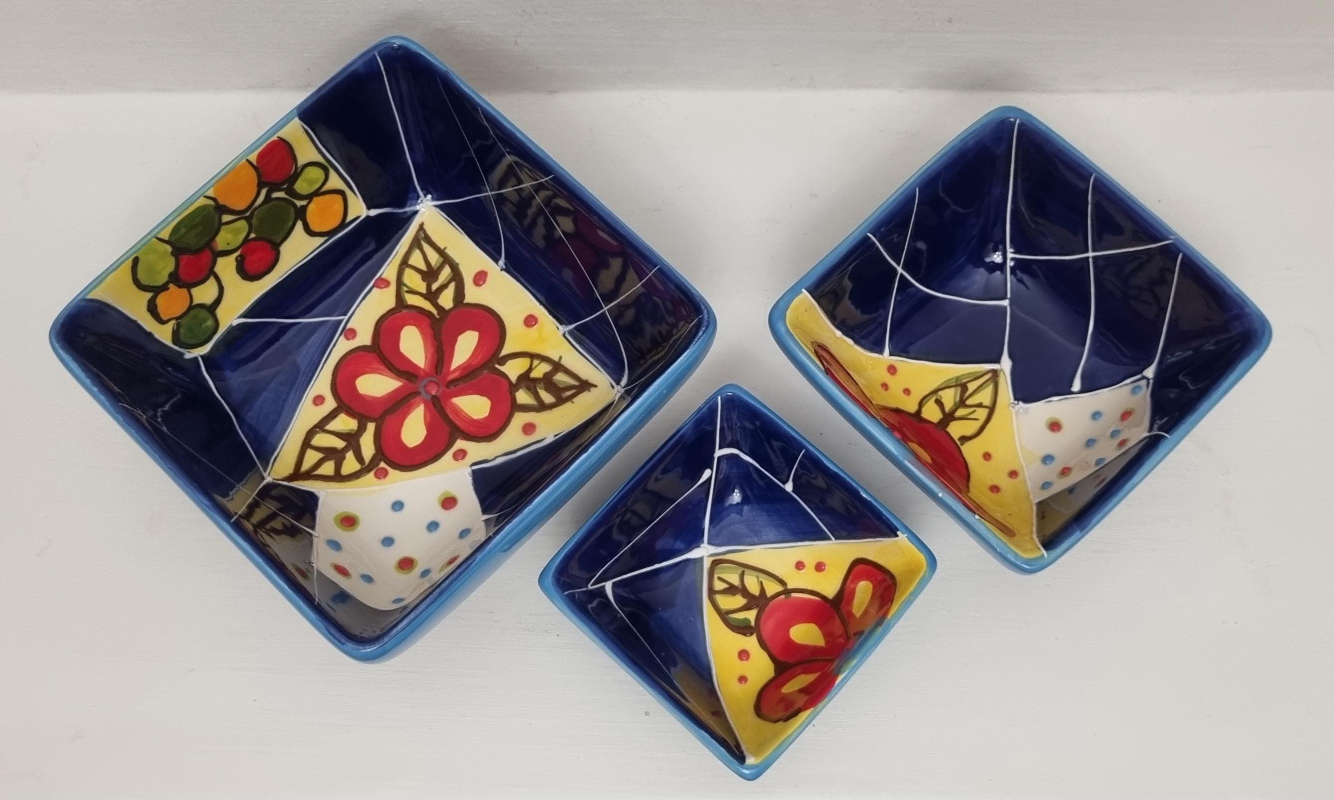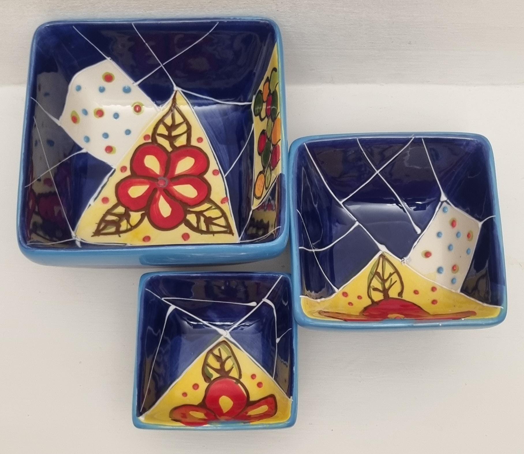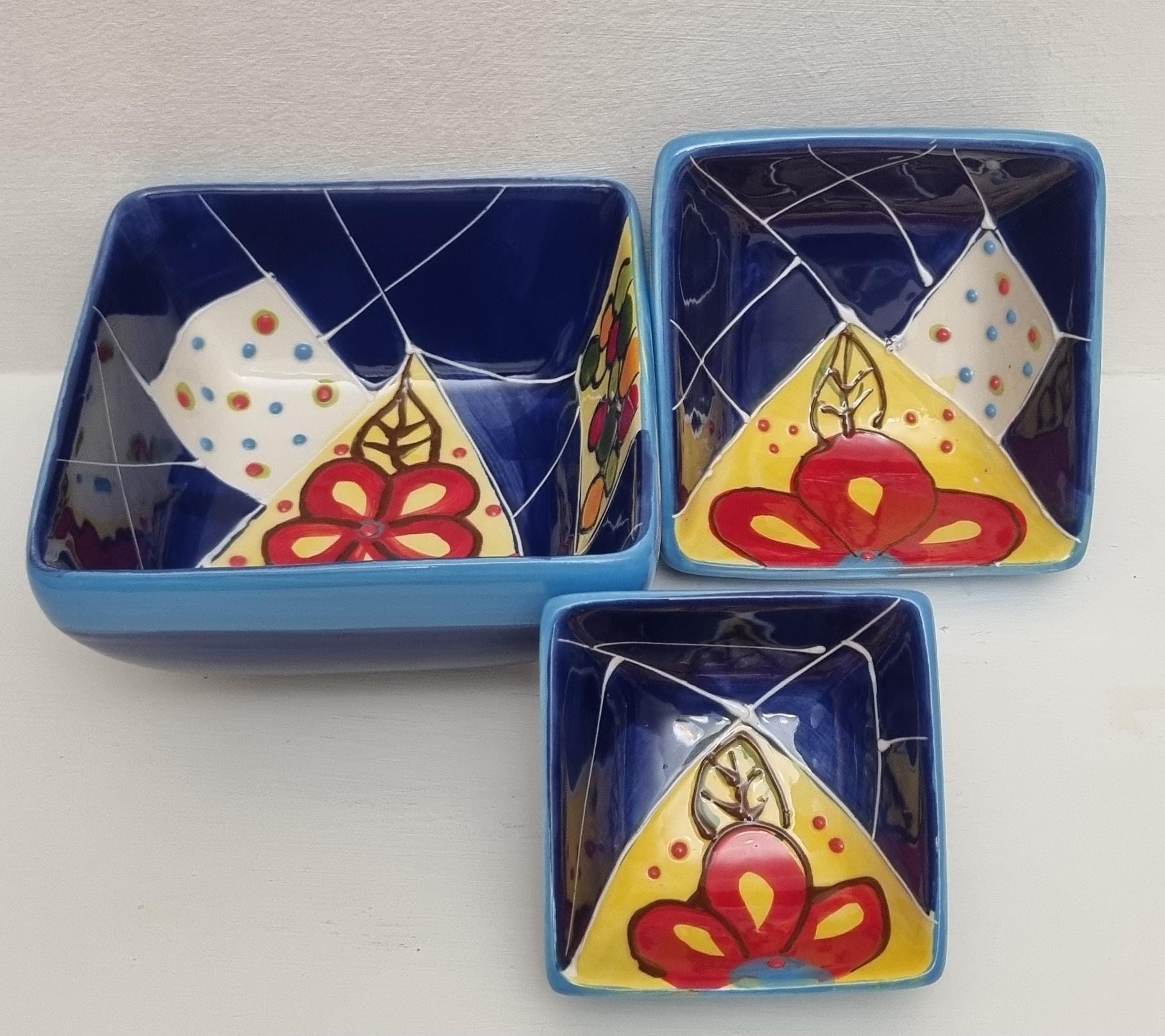 Fun brightly coloured hand-painted Ceramica Del Rio Salado Bowls. This set of 3 will be perfect for serving appetizers, tapas, salsas, candies, or nuts.