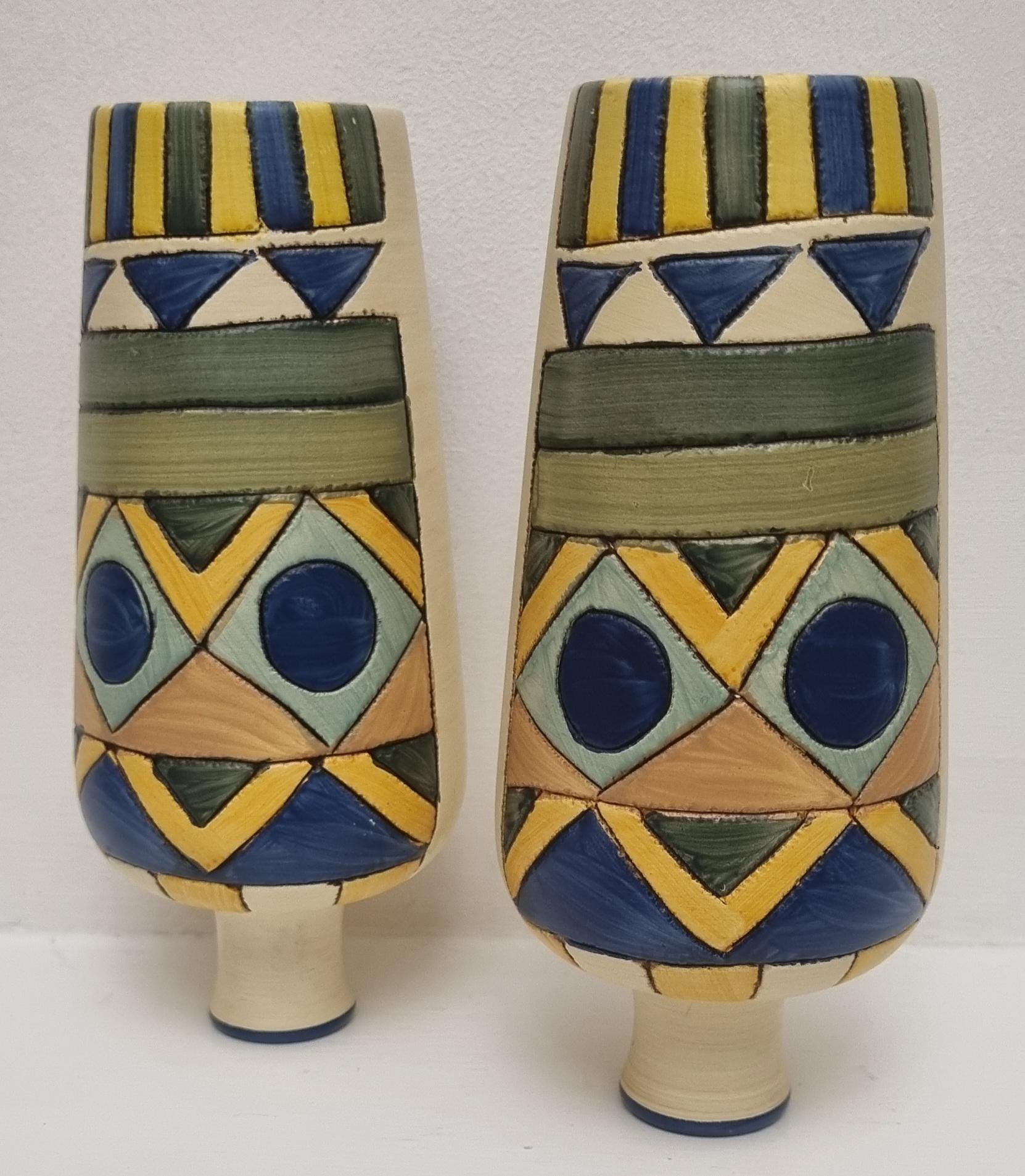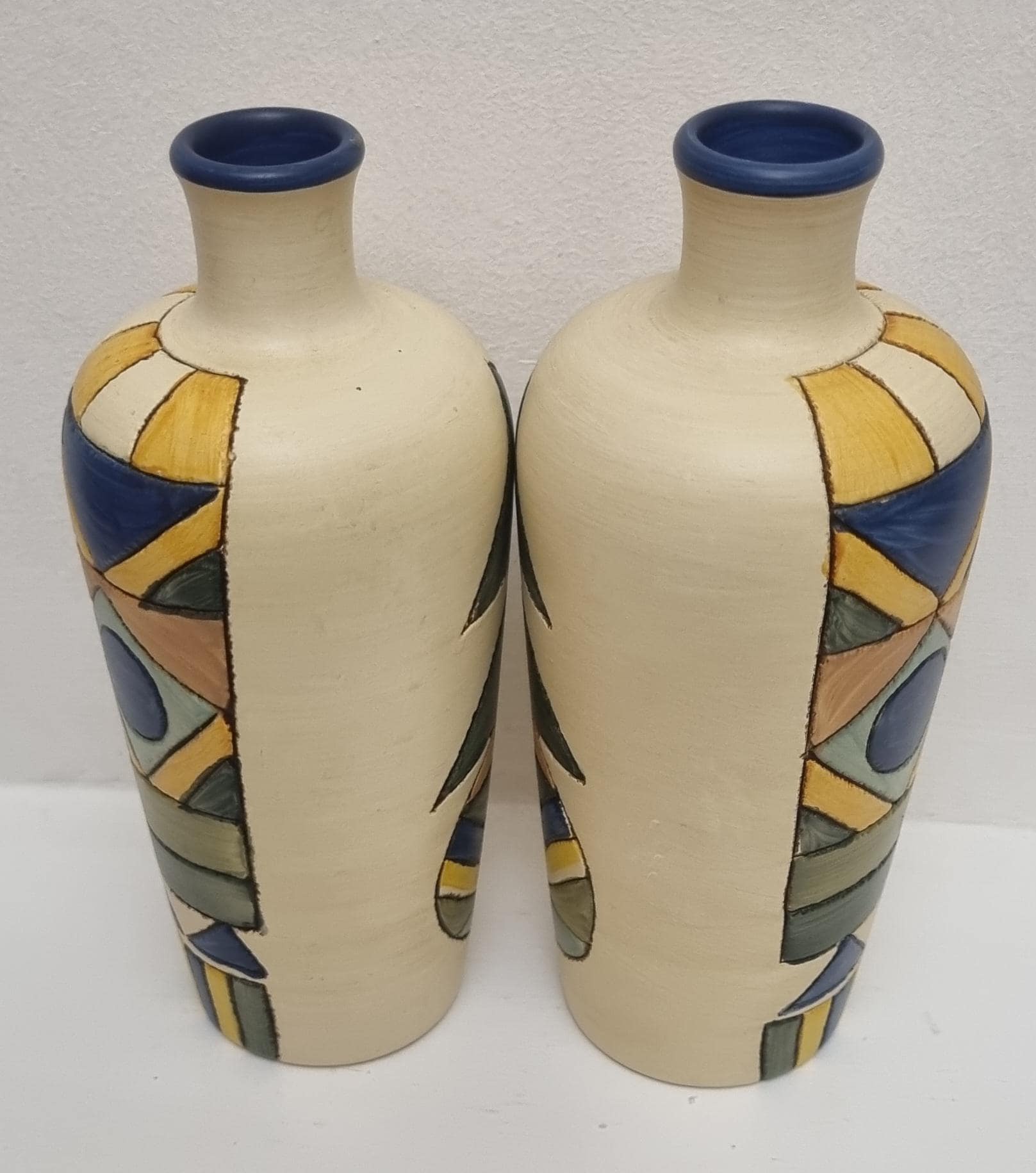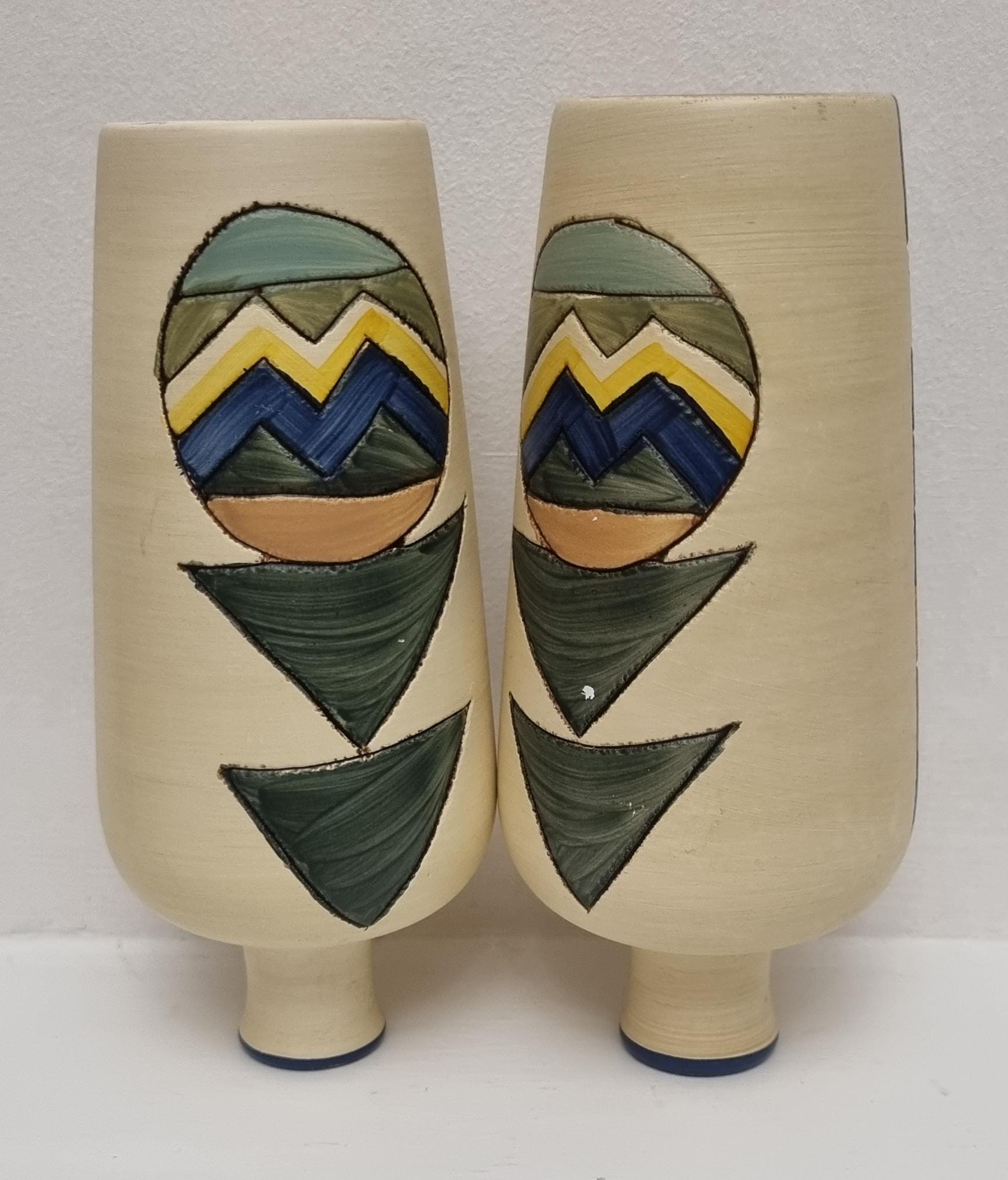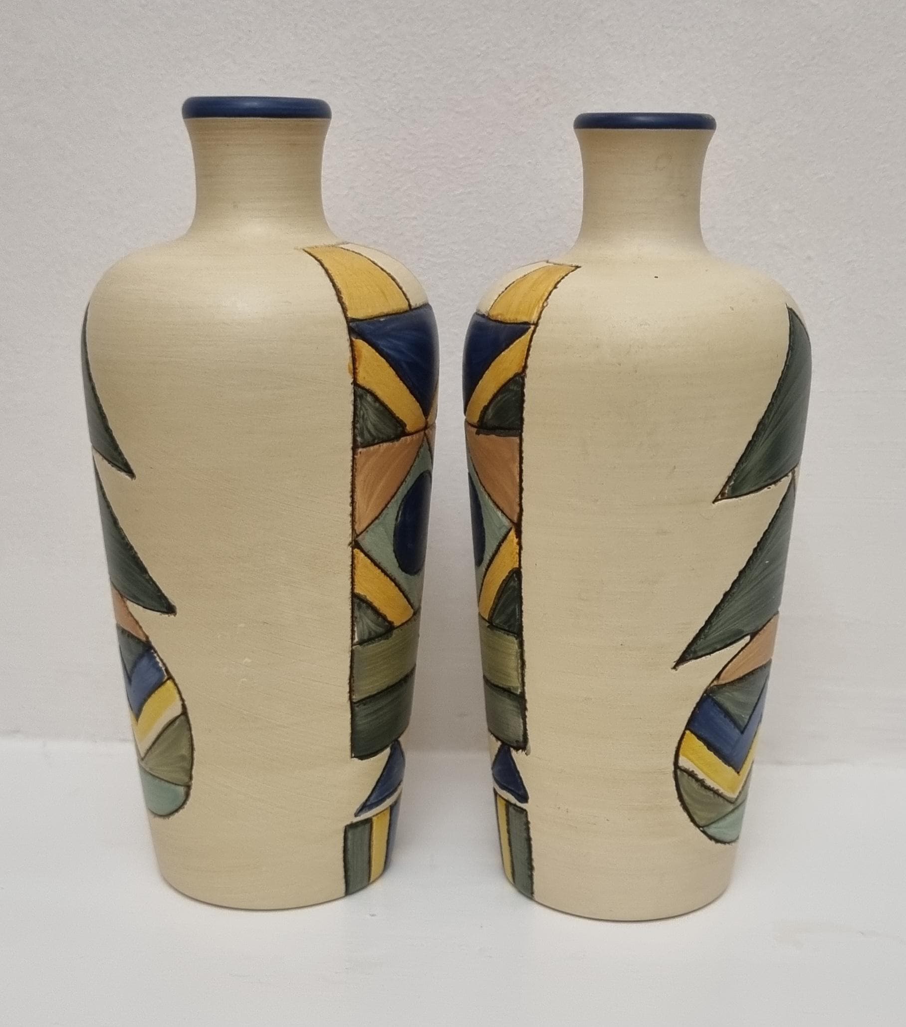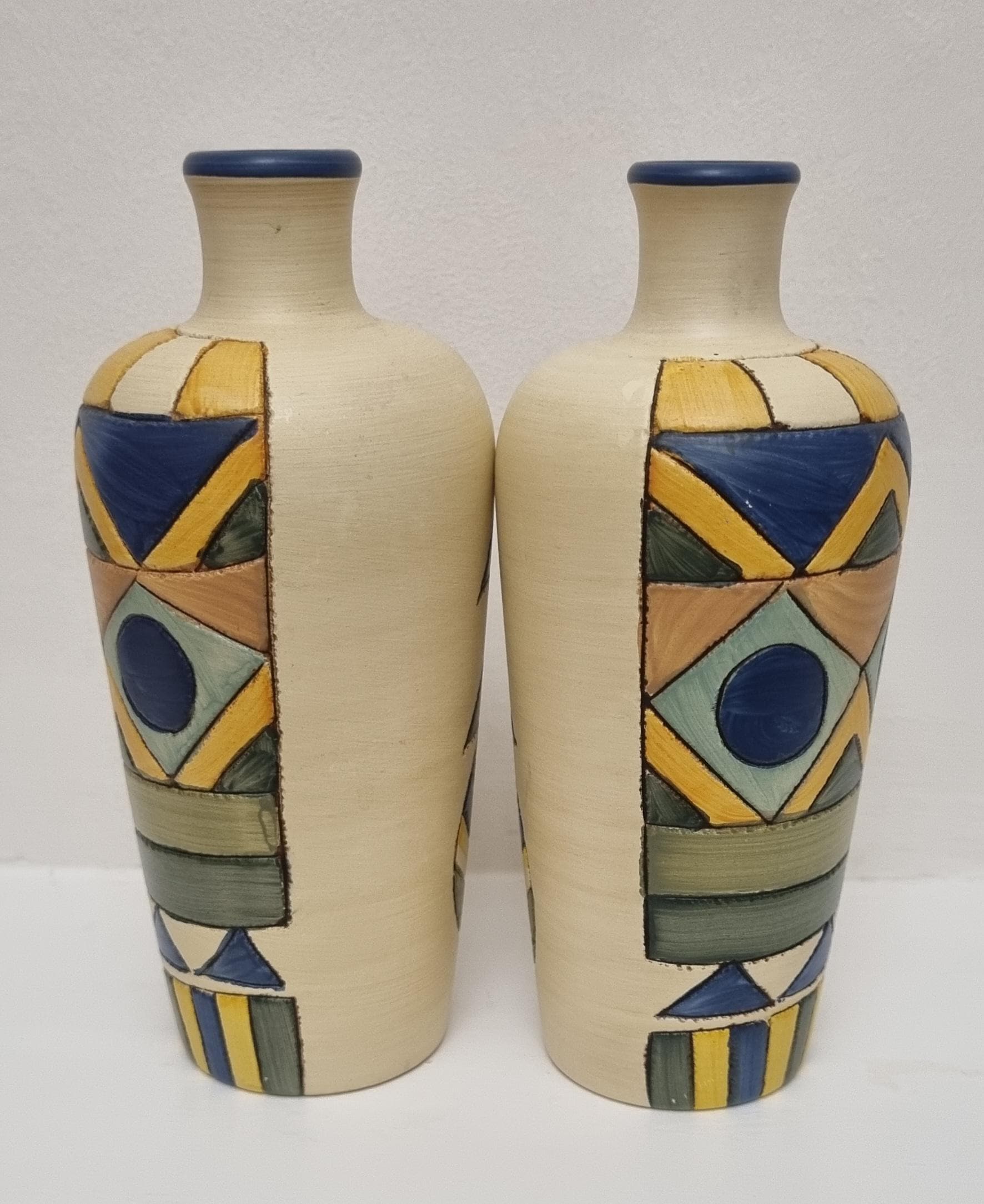 A pair of studio pottery ceramic art vases with an abstract and geometric design. Hand-painted in wonderful hues of blues and yellow on a cream background. Unmarked.