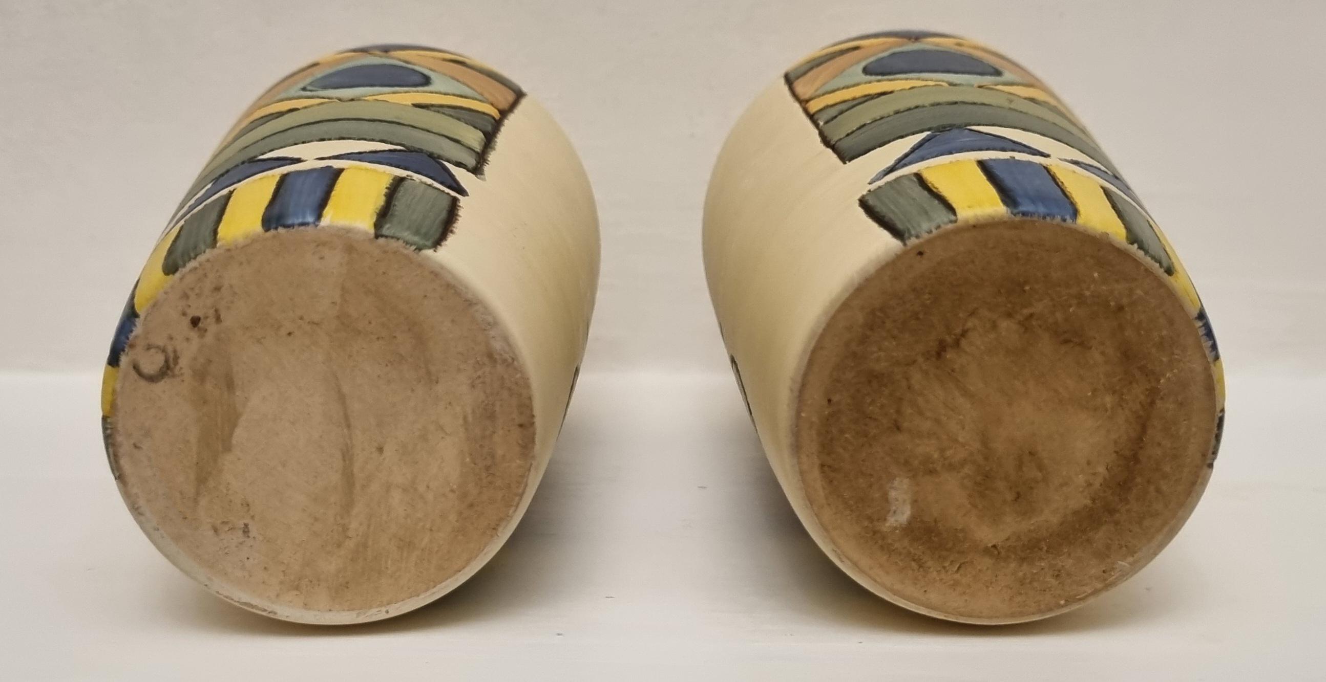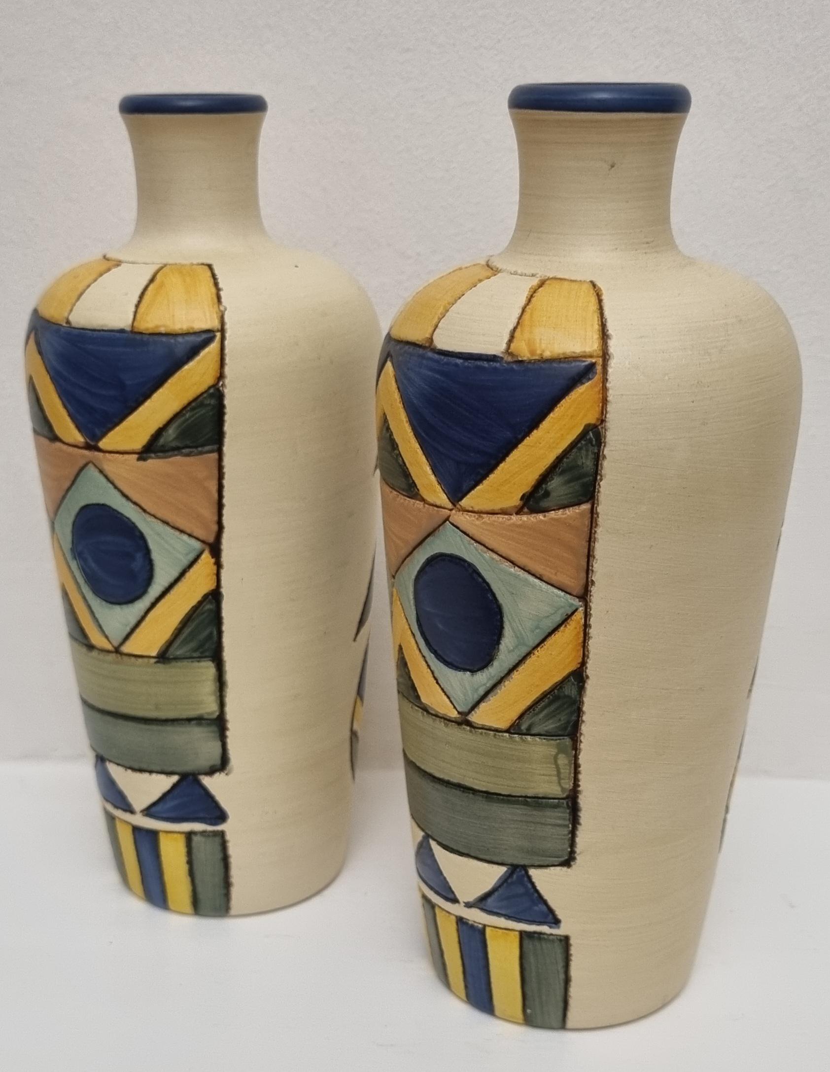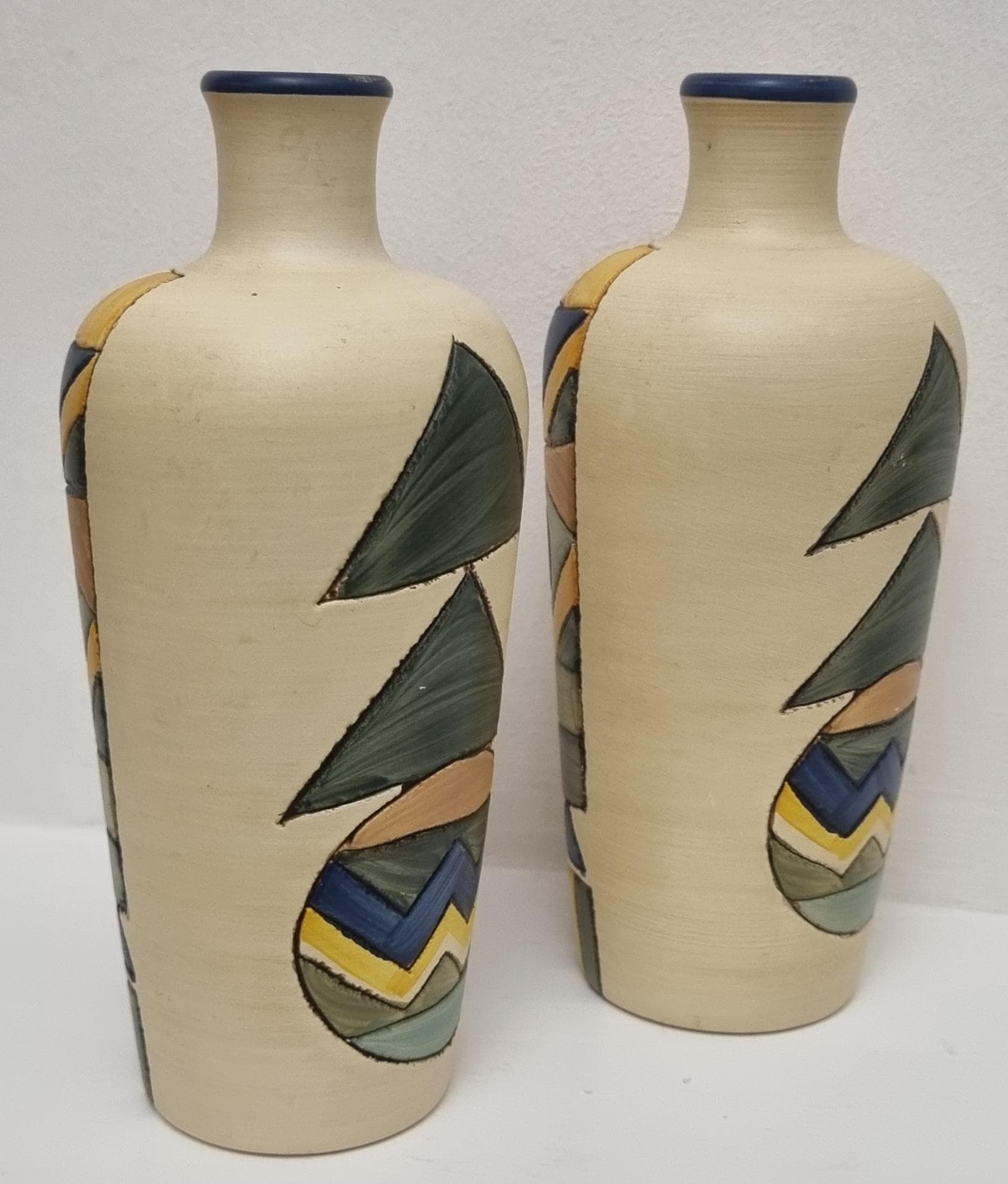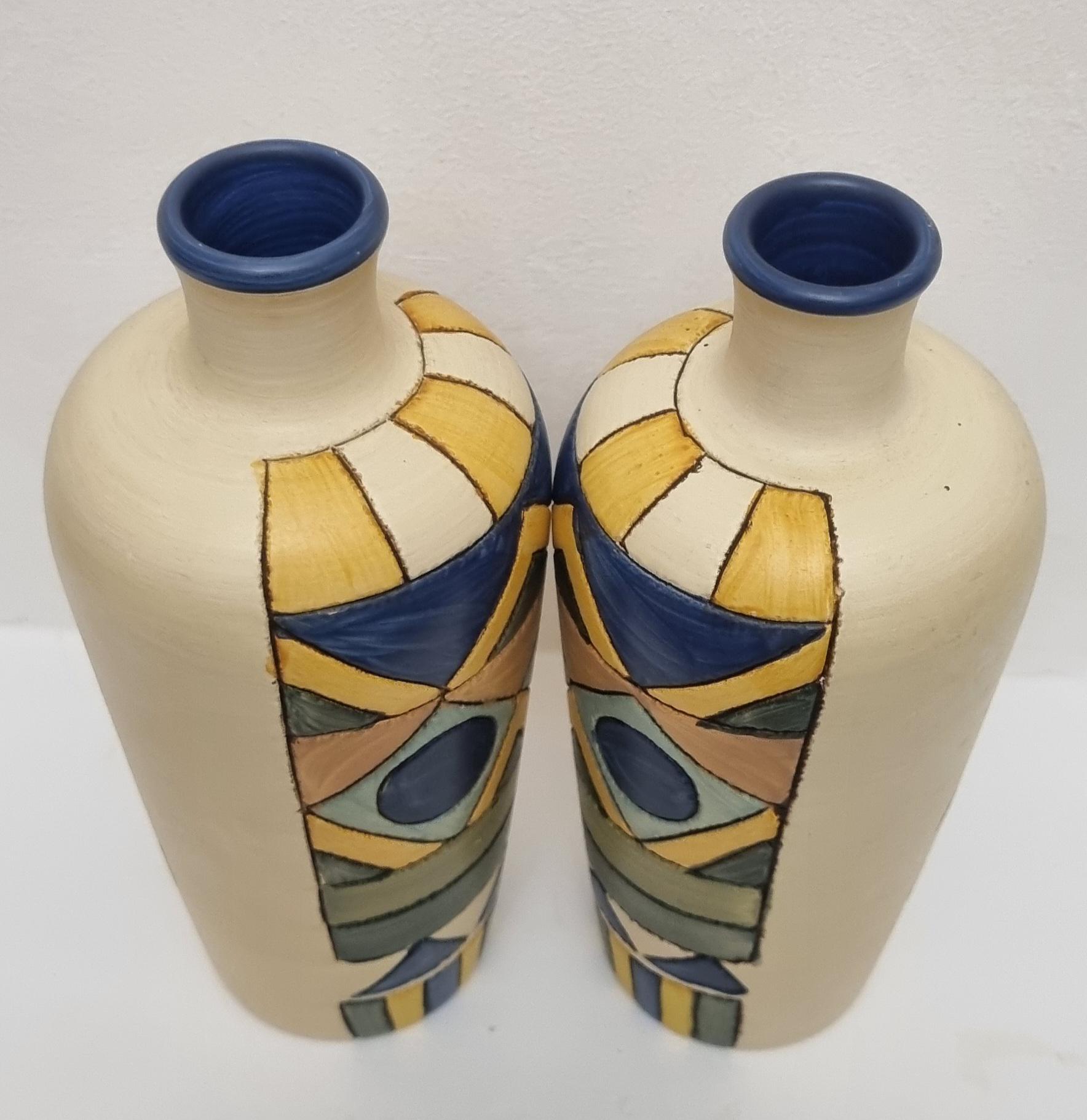 A pair of studio pottery ceramic art vases with an abstract and geometric design. Hand-painted in wonderful hues of blues and yellow on a cream background. Unmarked.