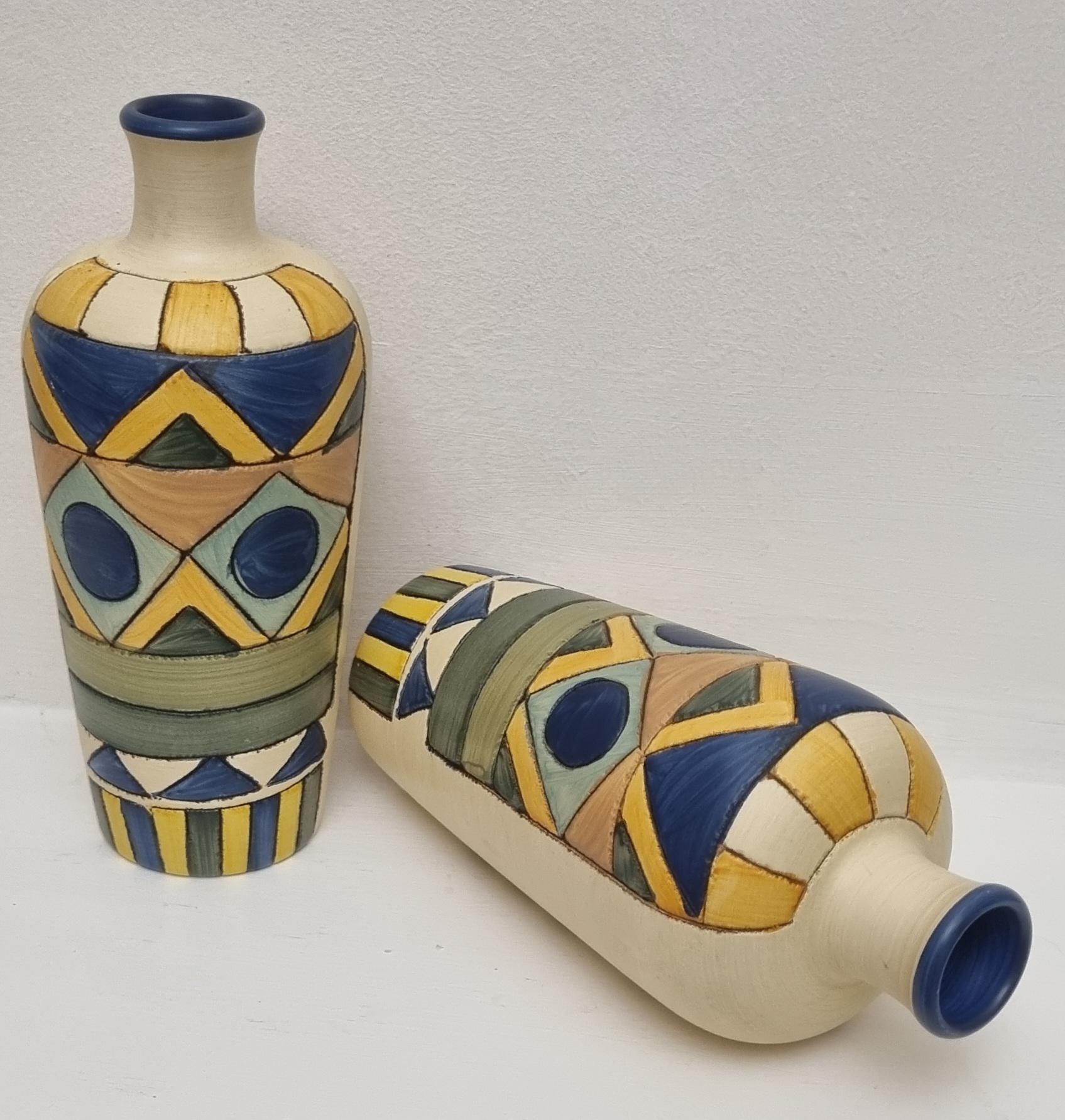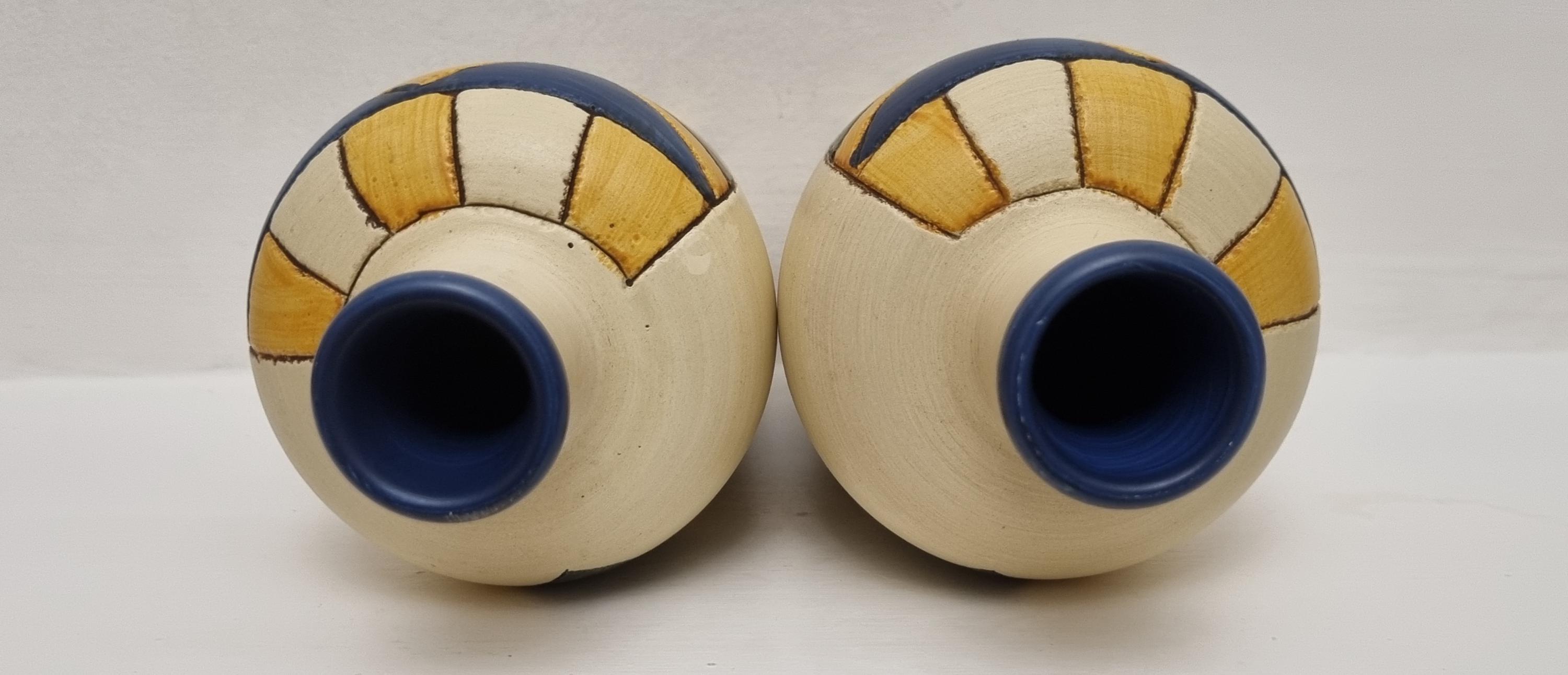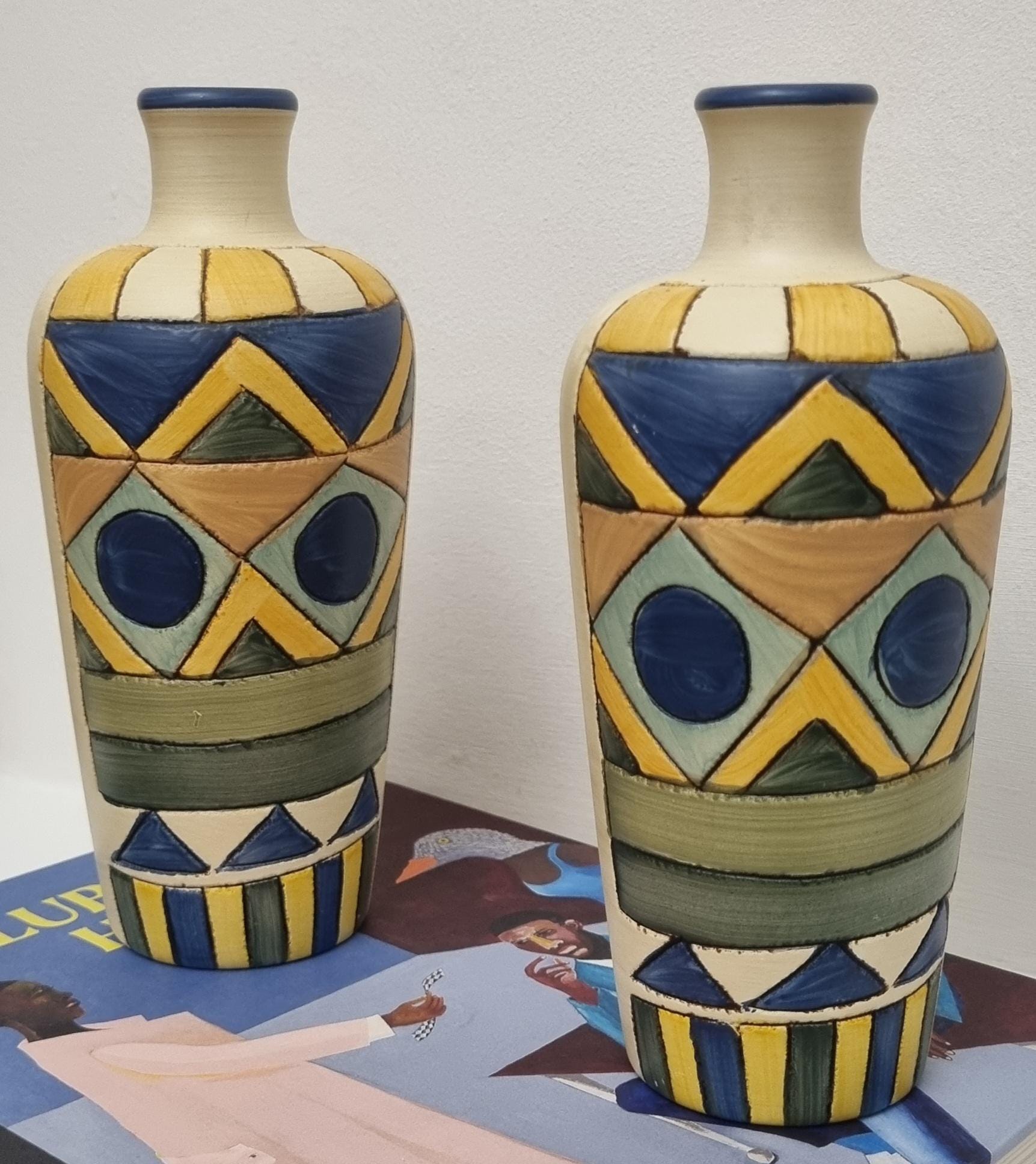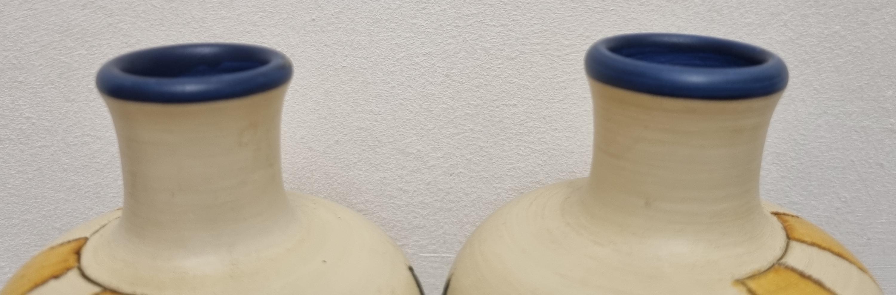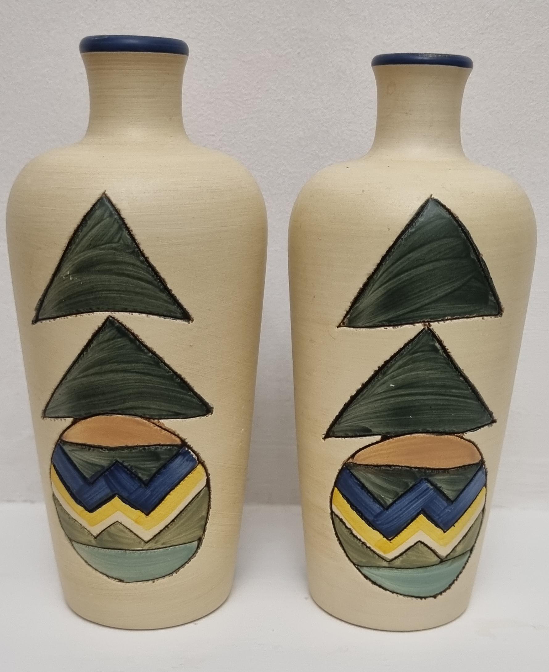 A pair of studio pottery ceramic art vases with an abstract and geometric design. Hand-painted in wonderful hues of blues and yellow on a cream background. Unmarked.