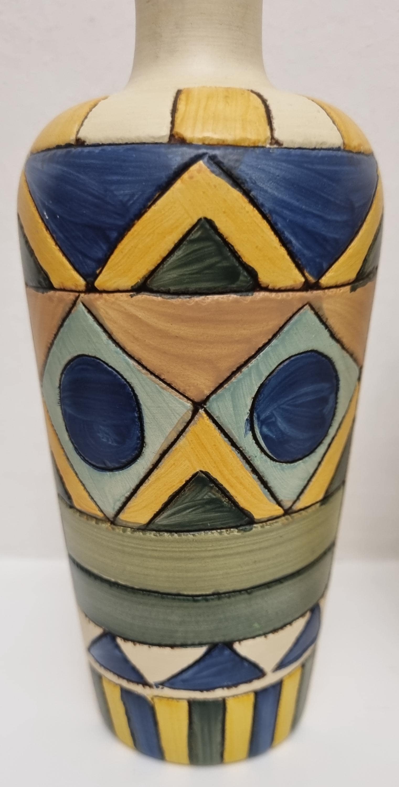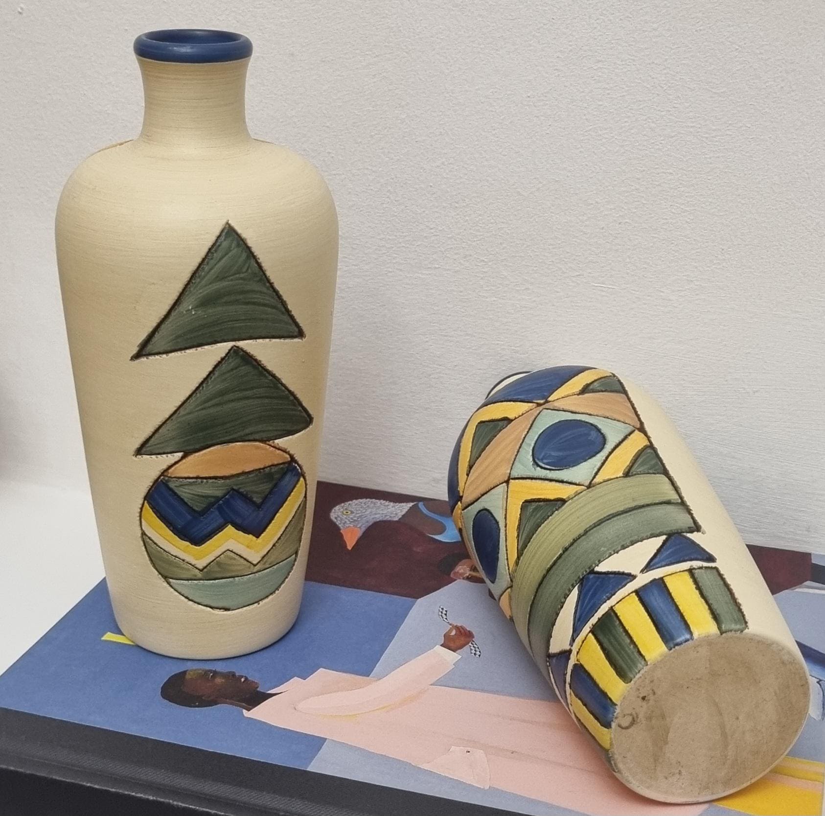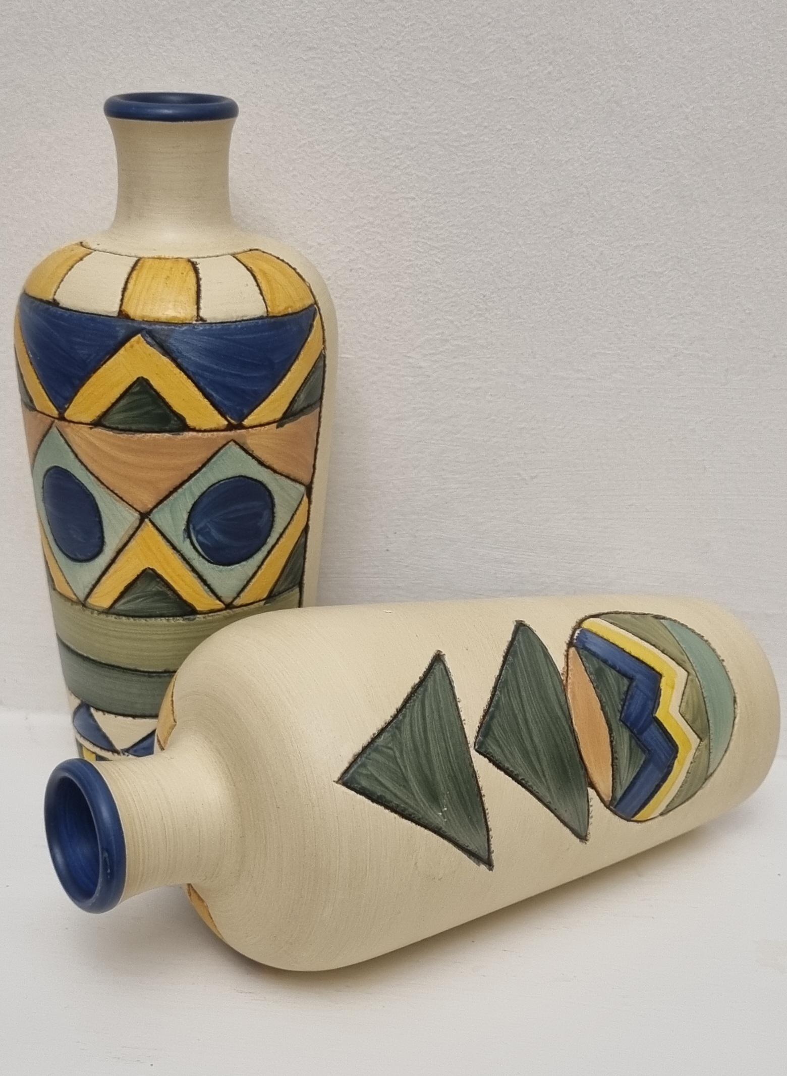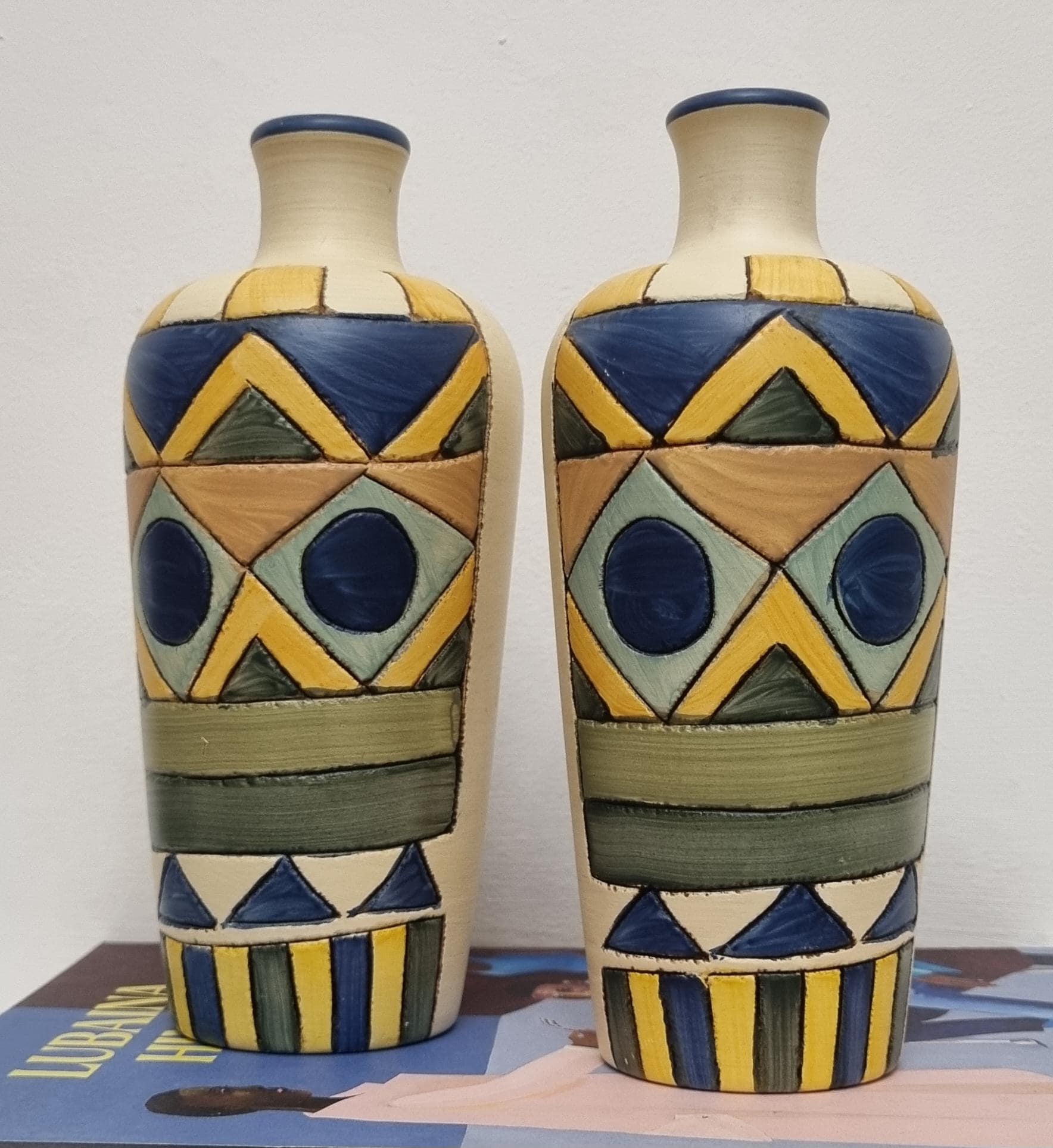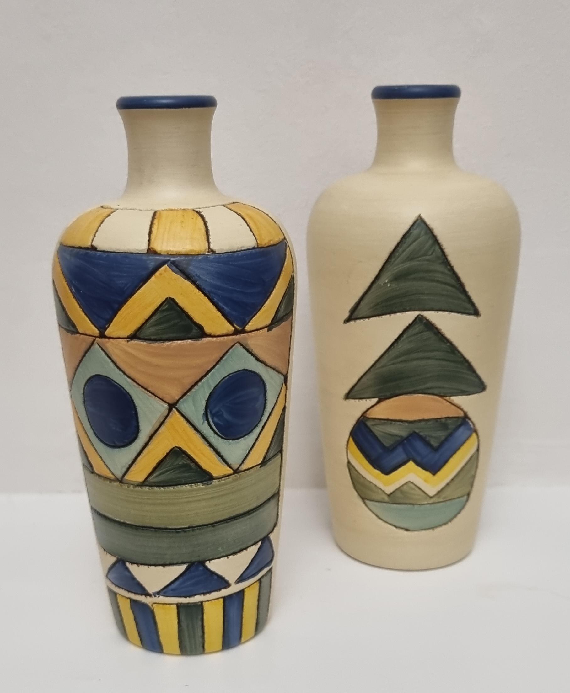 A pair of studio pottery ceramic art vases with an abstract and geometric design. Hand-painted in wonderful hues of blues and yellow on a cream background. Unmarked.