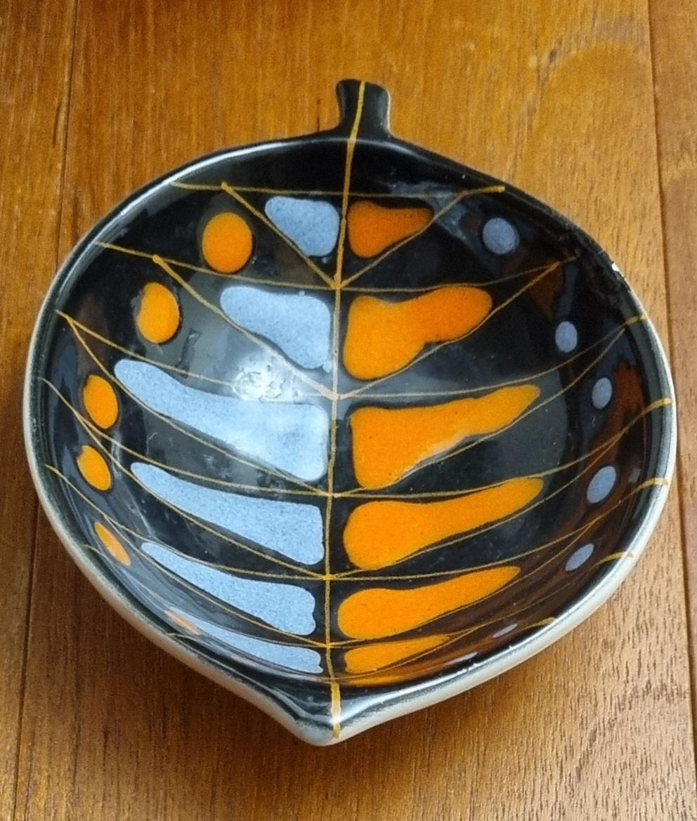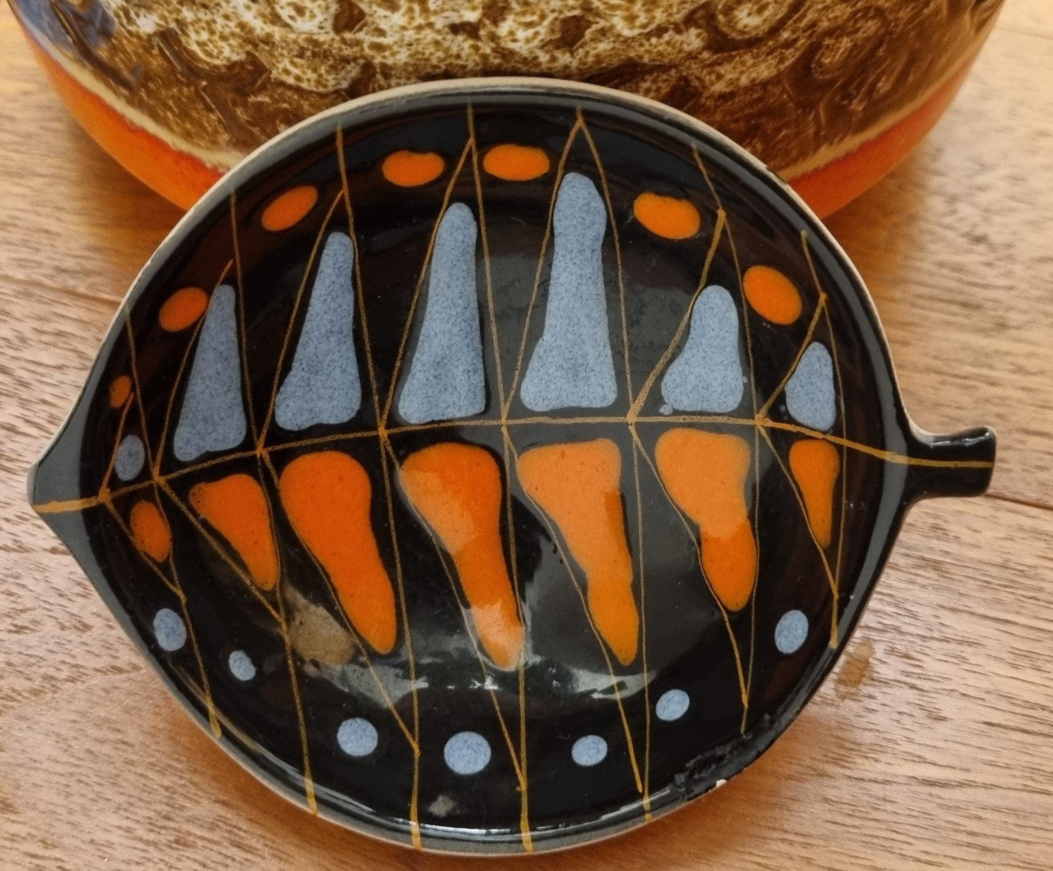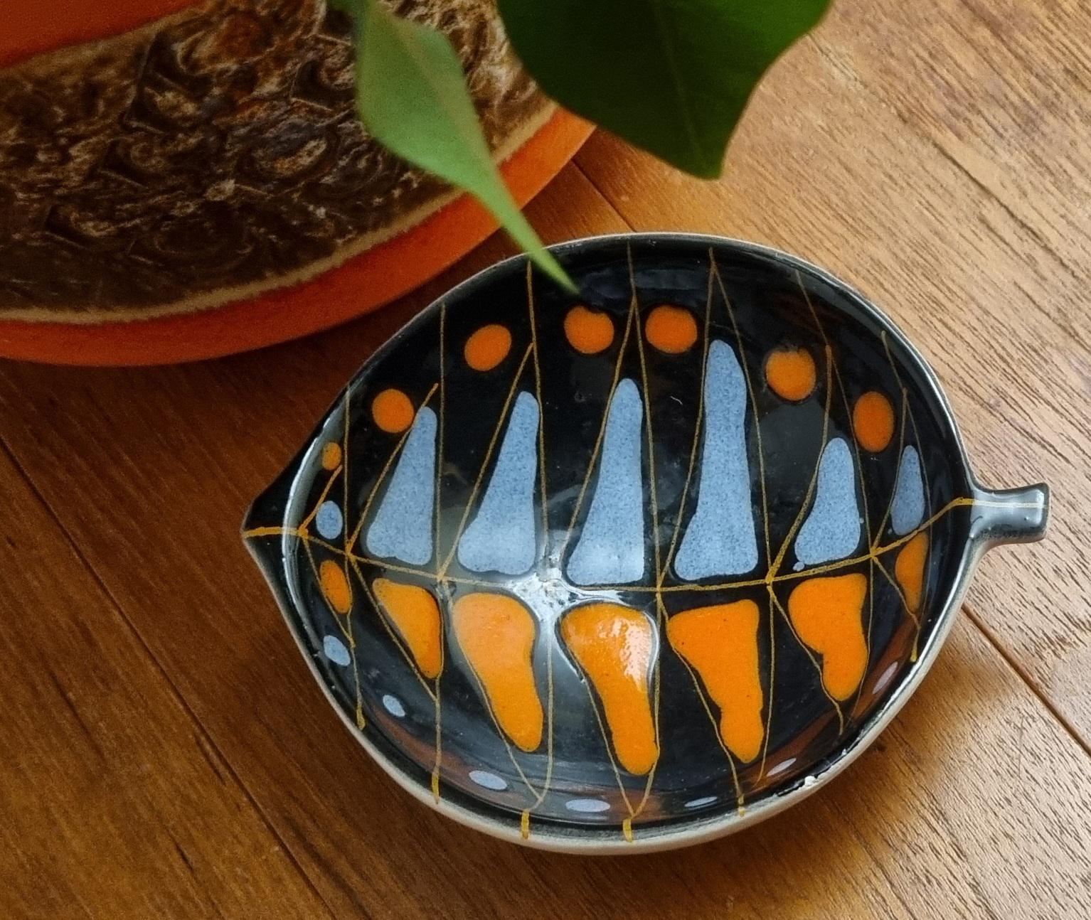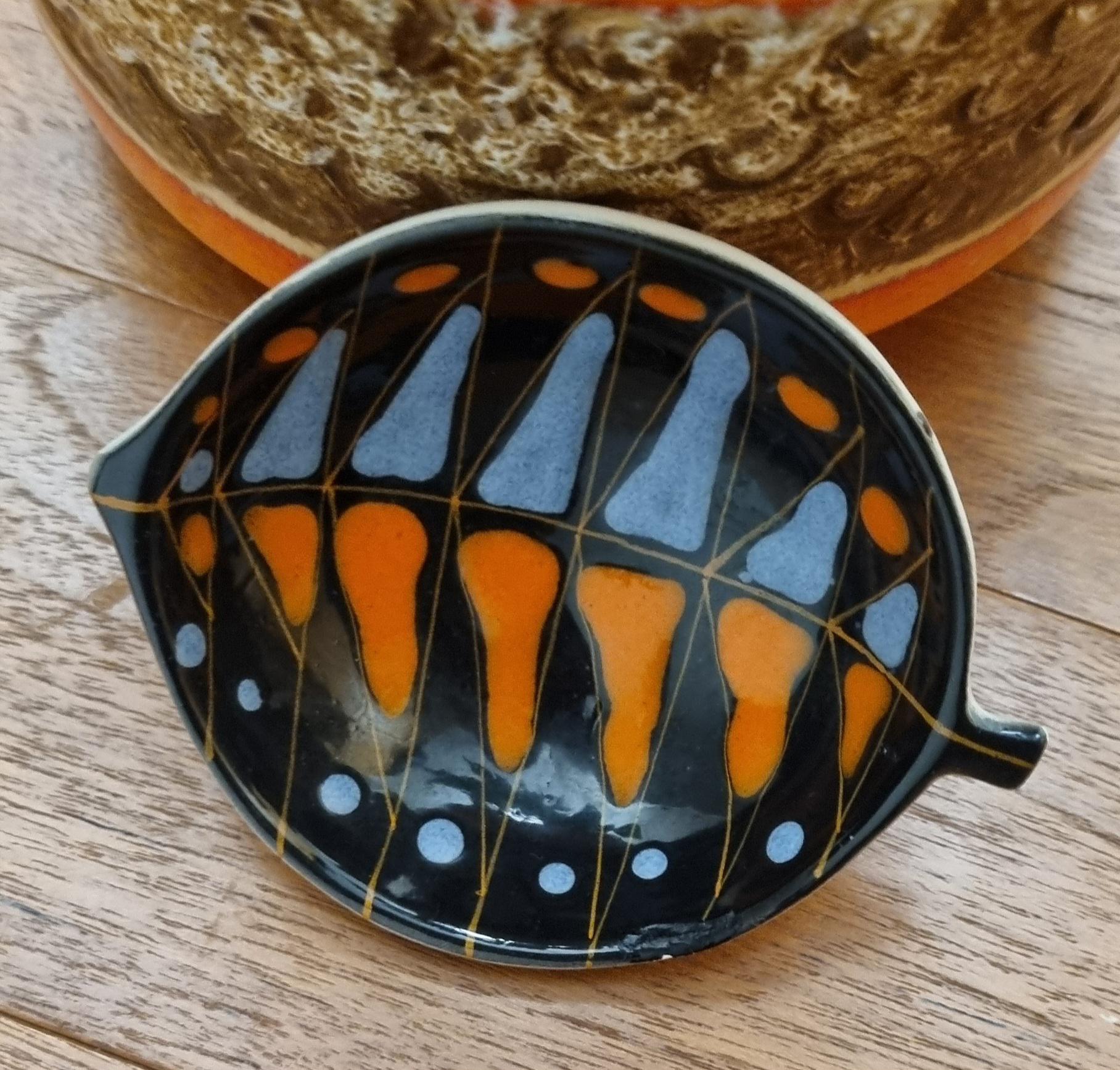 Decorative mid century modern, Italian little orange, blue & black glaze ceramic fish shaped trinket bowl.