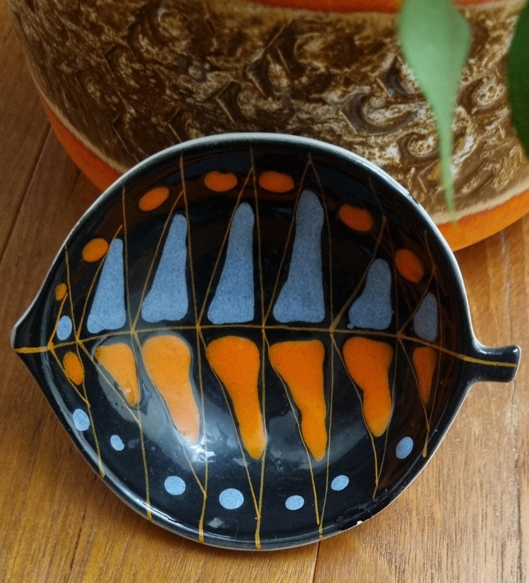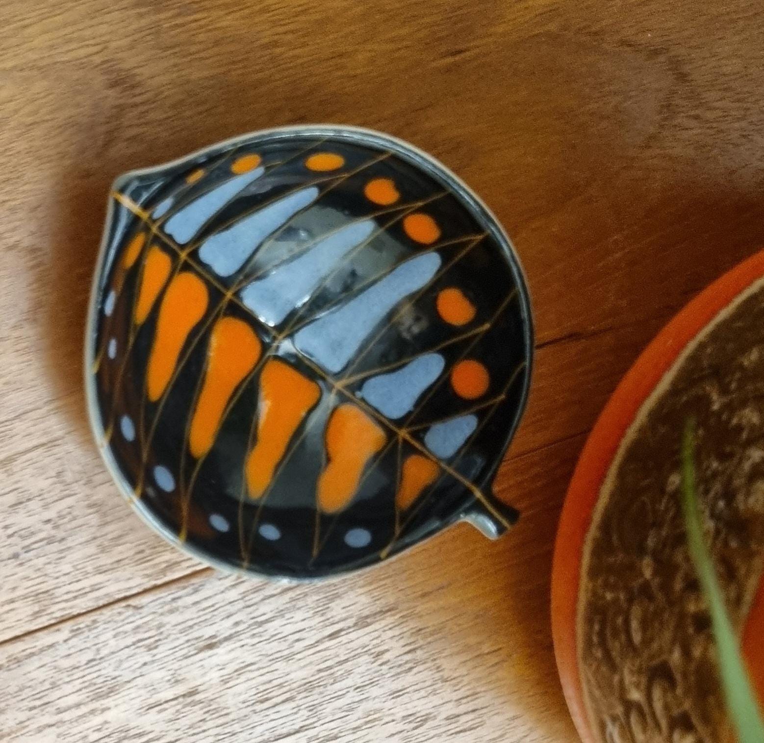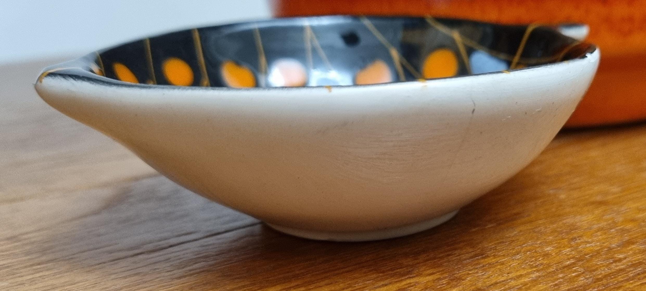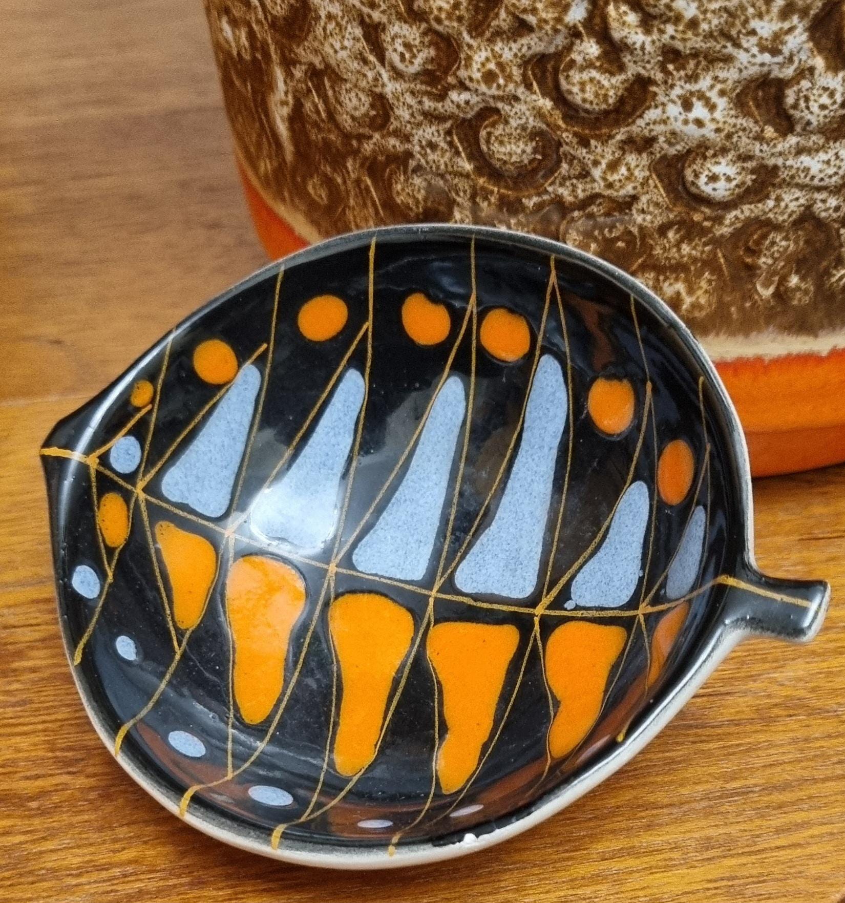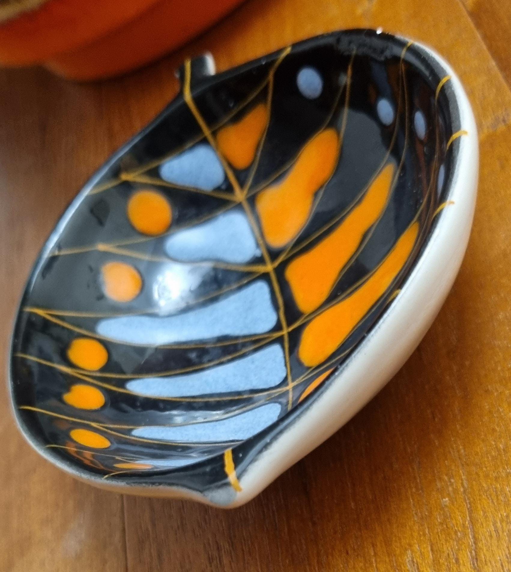 Decorative mid century modern, Italian little orange, blue & black glaze ceramic fish shaped trinket bowl.