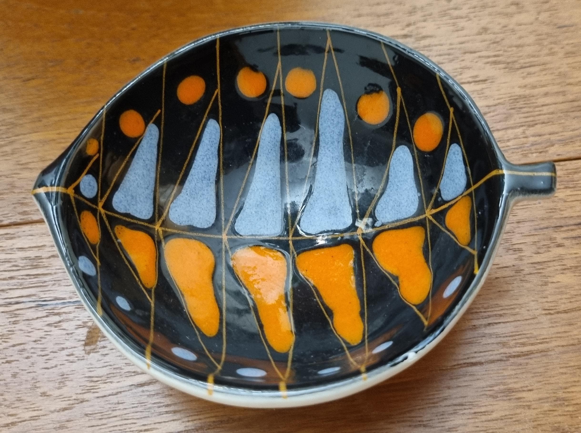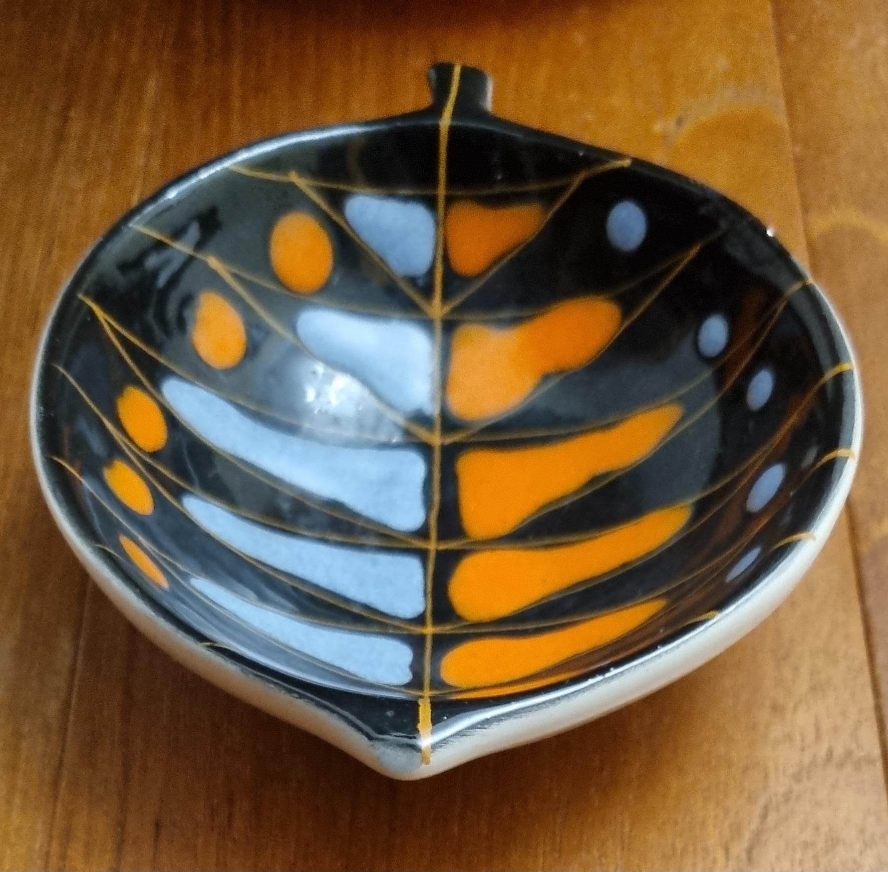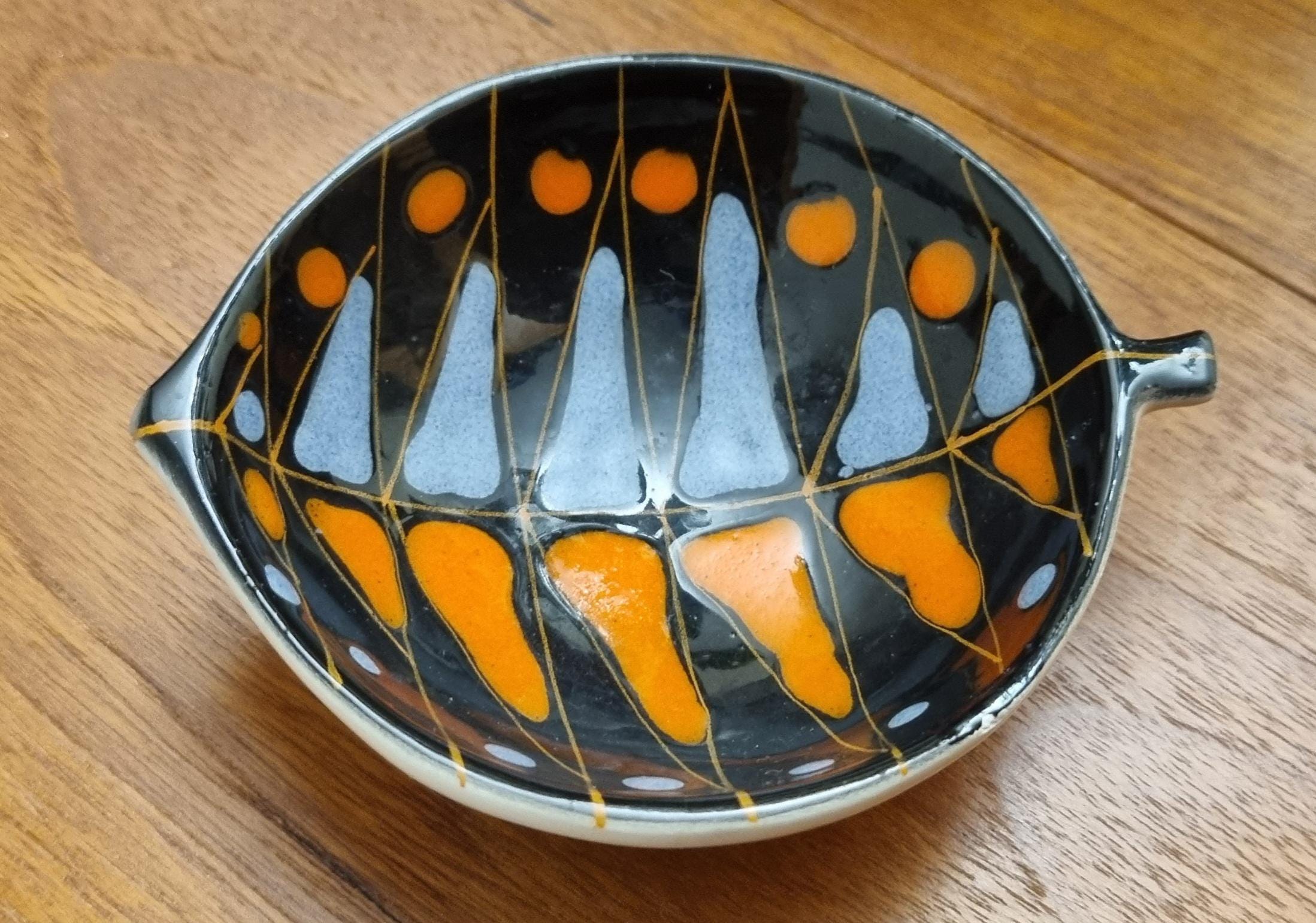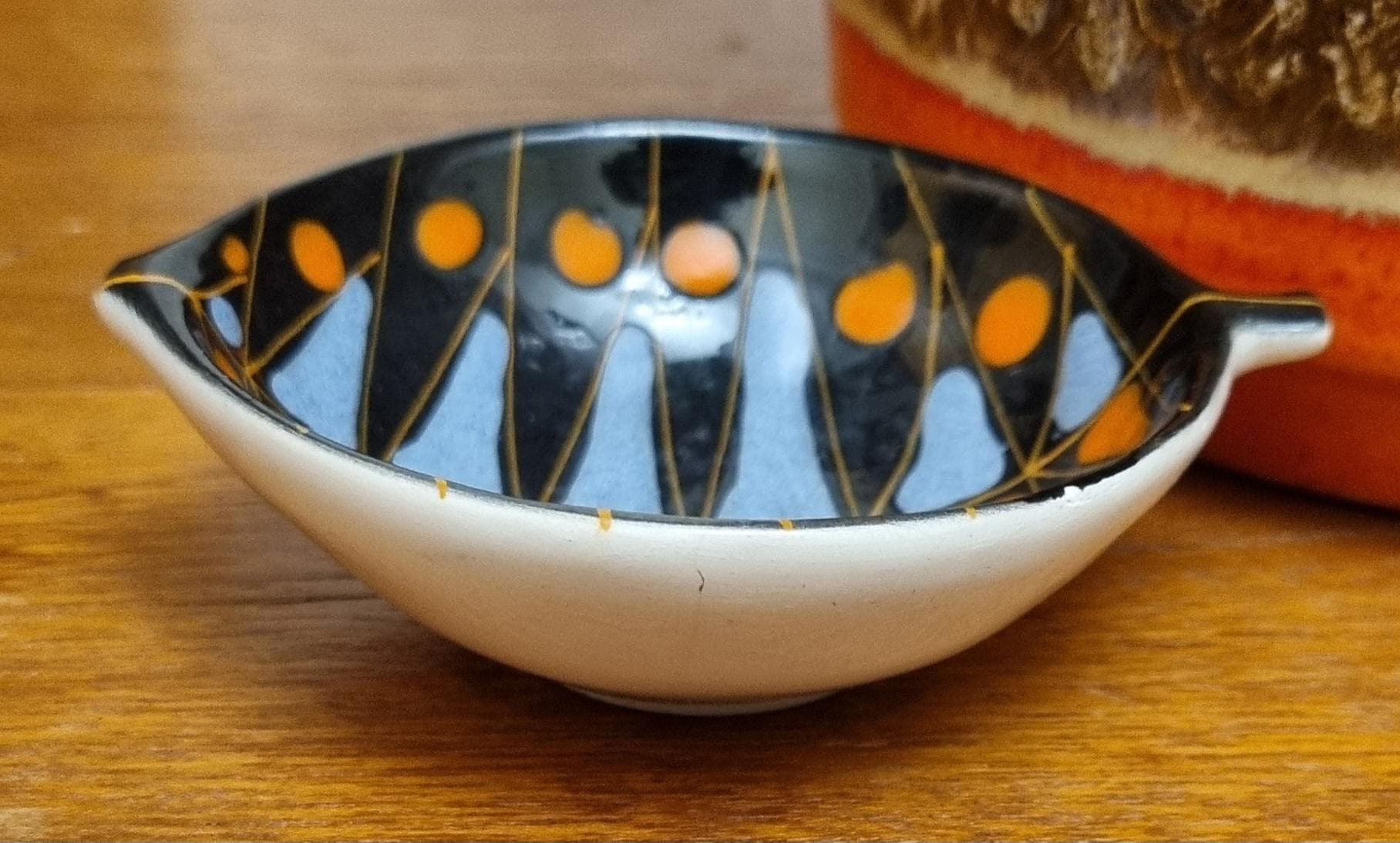 Decorative mid century modern, Italian little orange, blue & black glaze ceramic fish shaped trinket bowl.