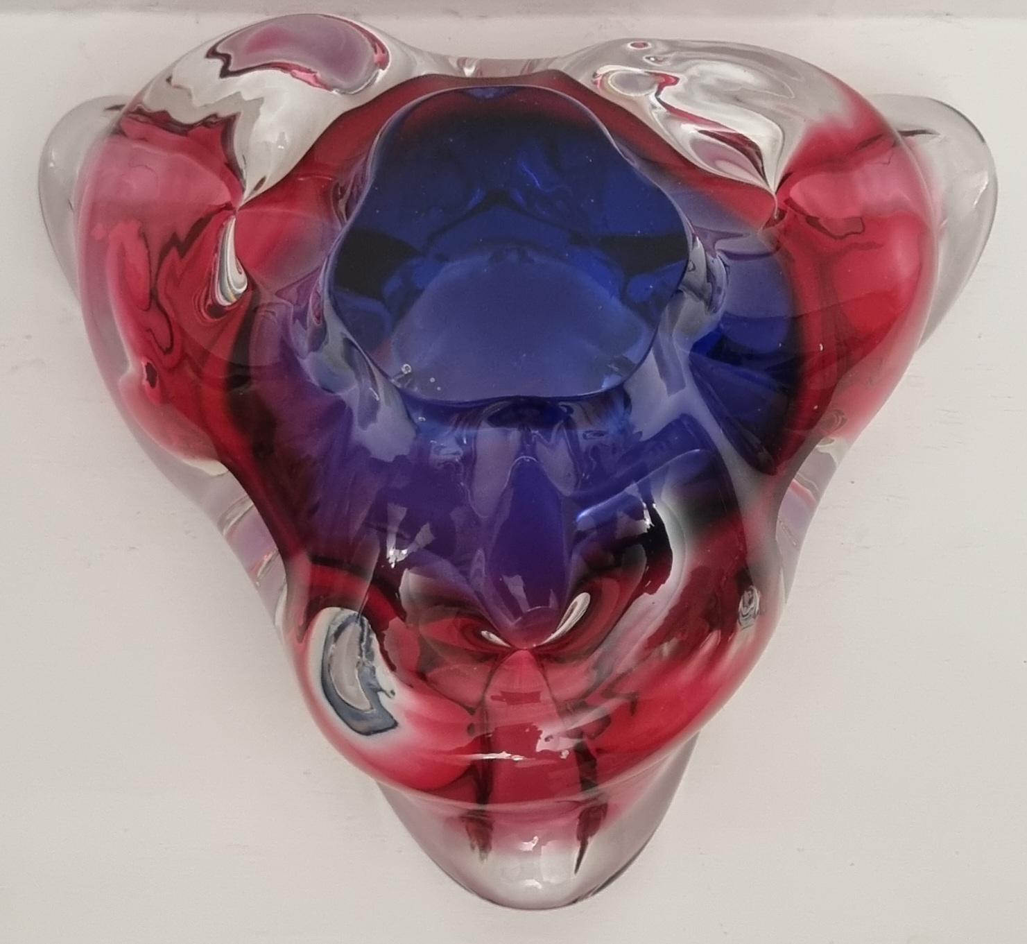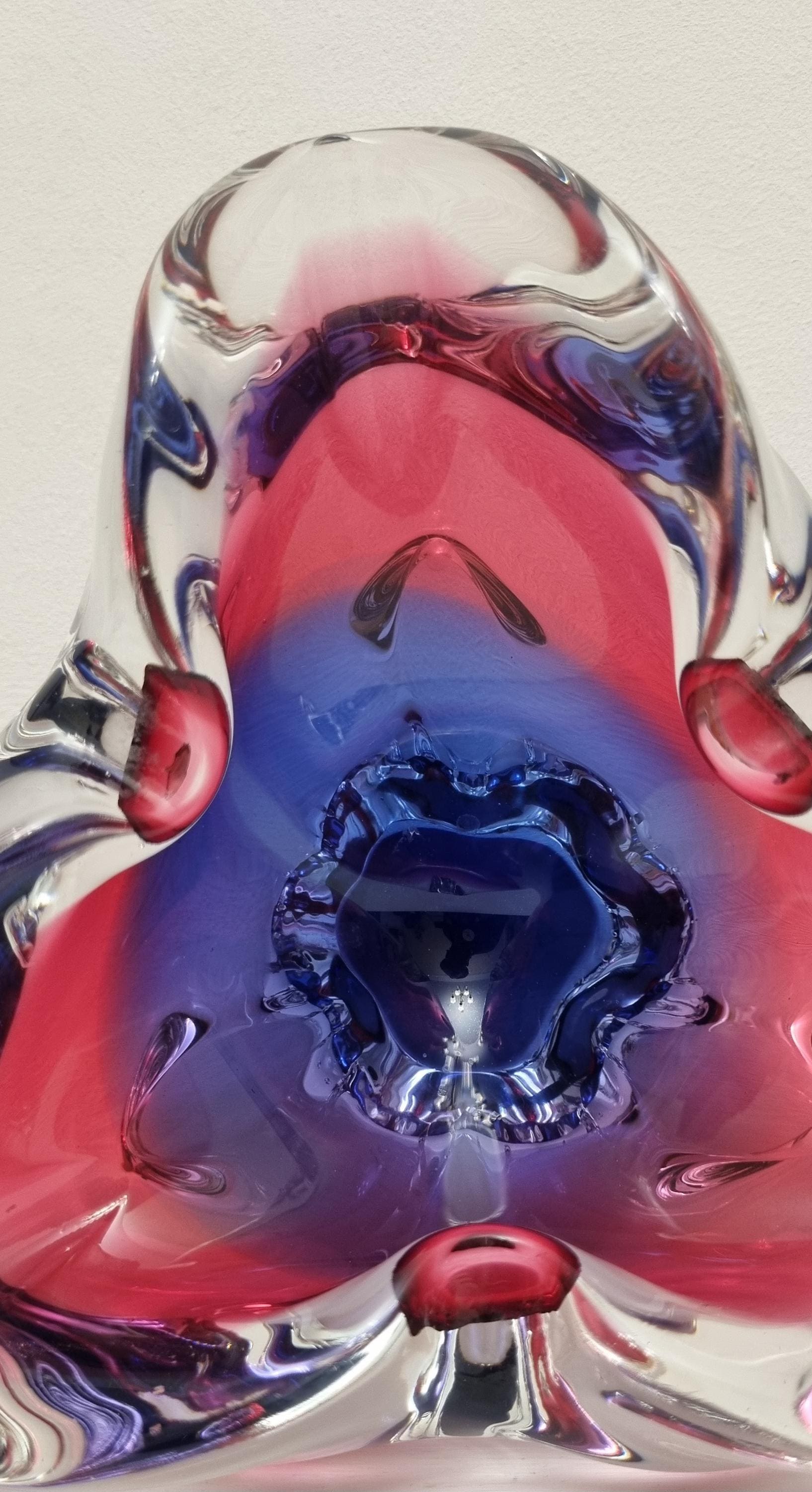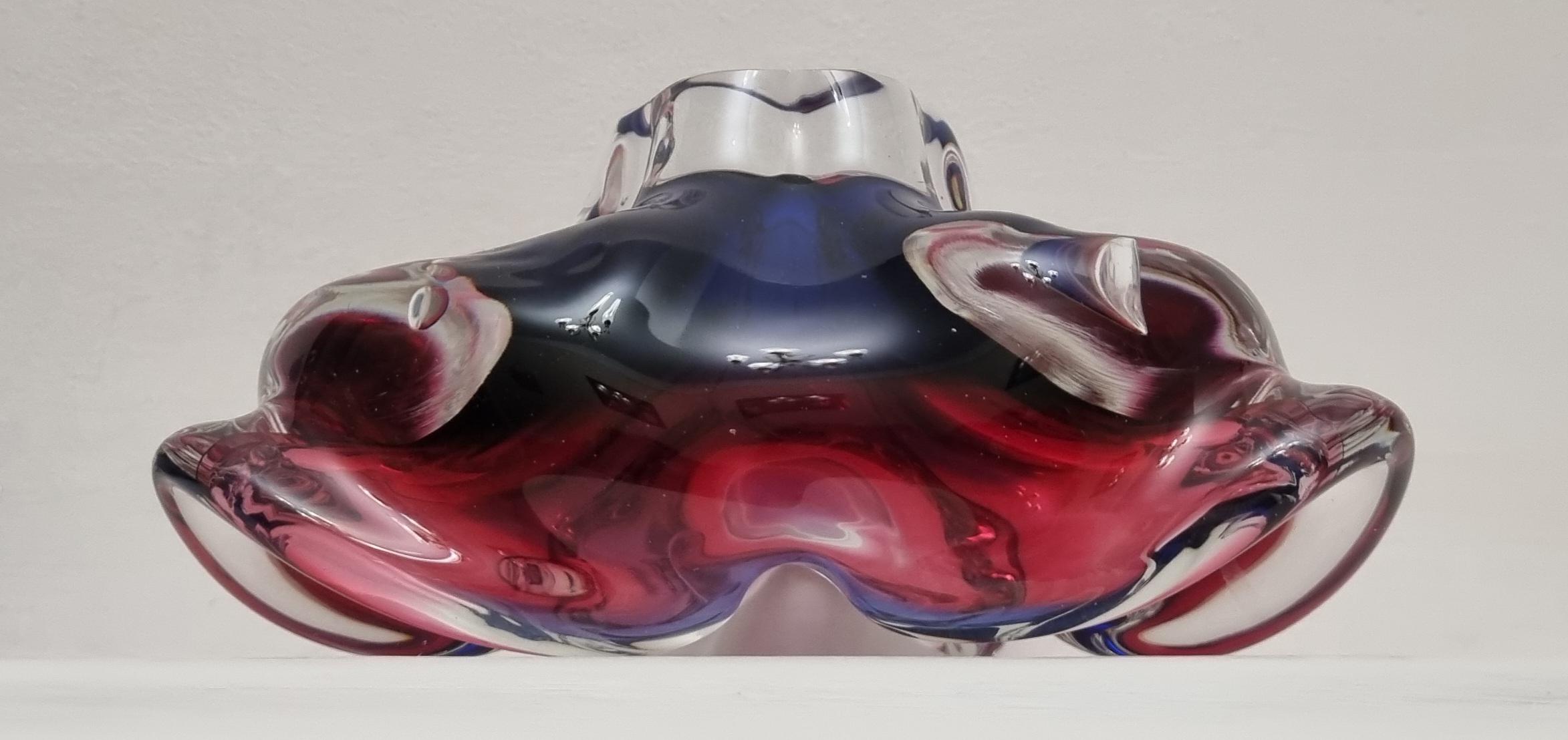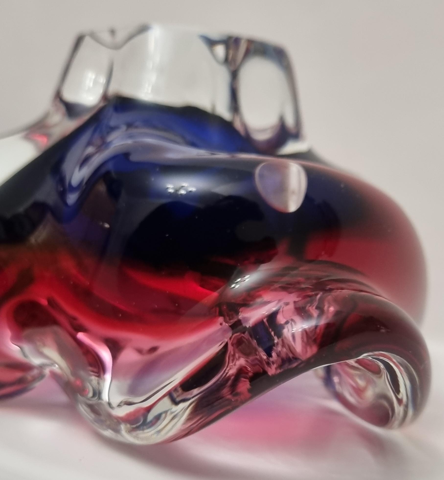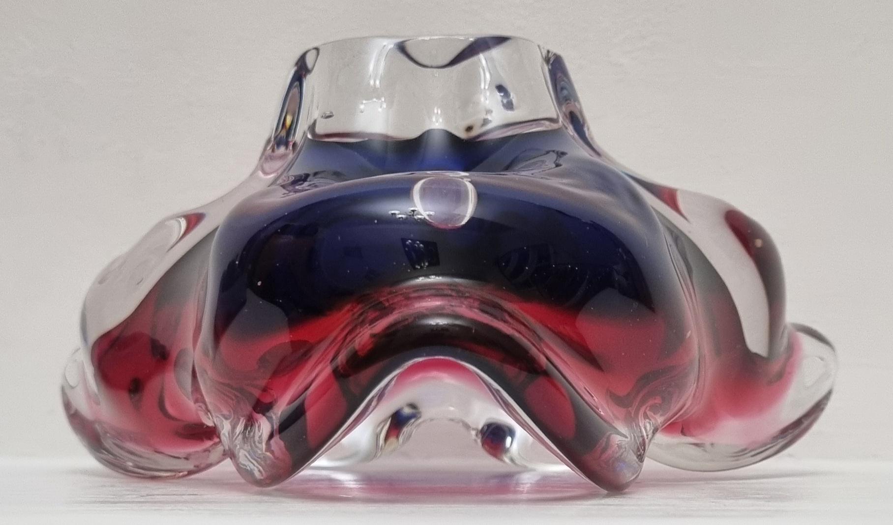 This Czech Organic Sommerso Art Glass Bowl by Josef Hospodka for Chribska Glass is simply stunning. With rich tones of purple and pink, this is definitely a work of art. This particular model has a recorded pattern No. 240 5 20 and dating back from the 60s.