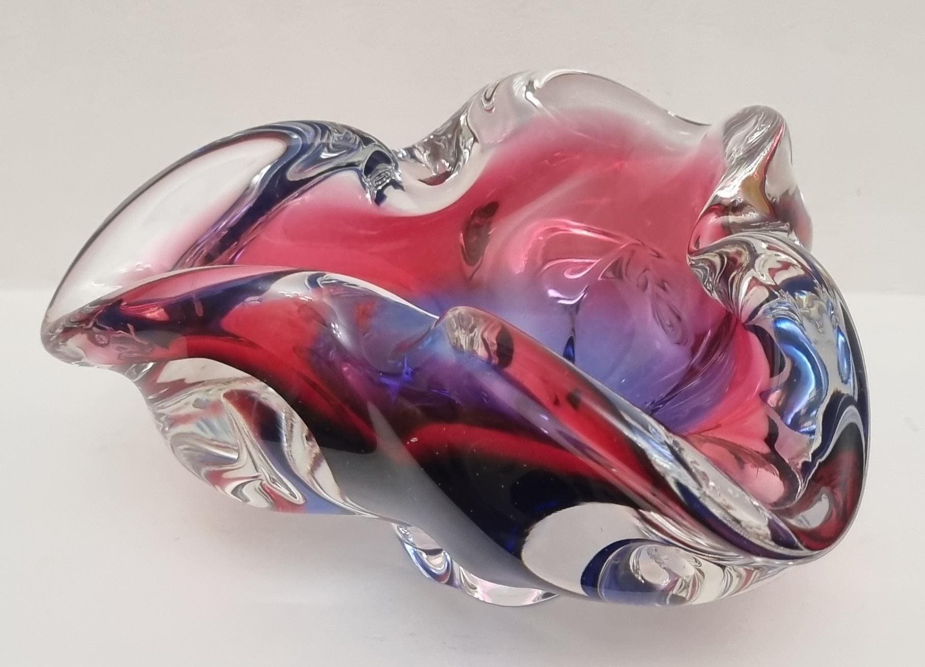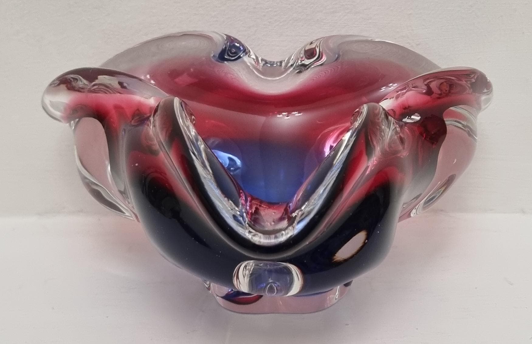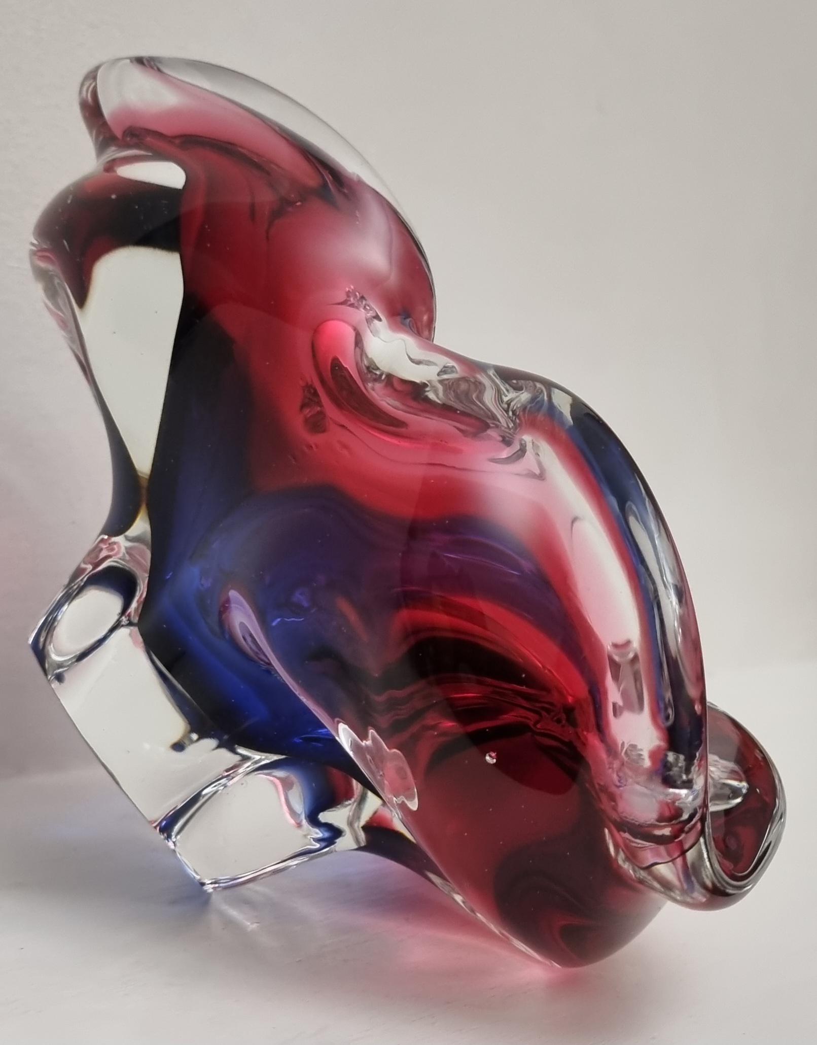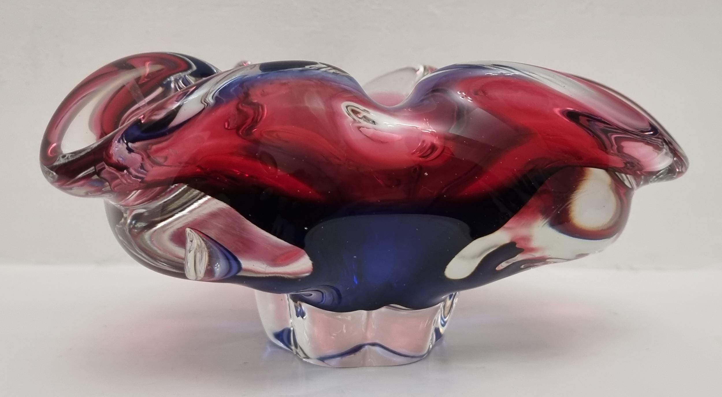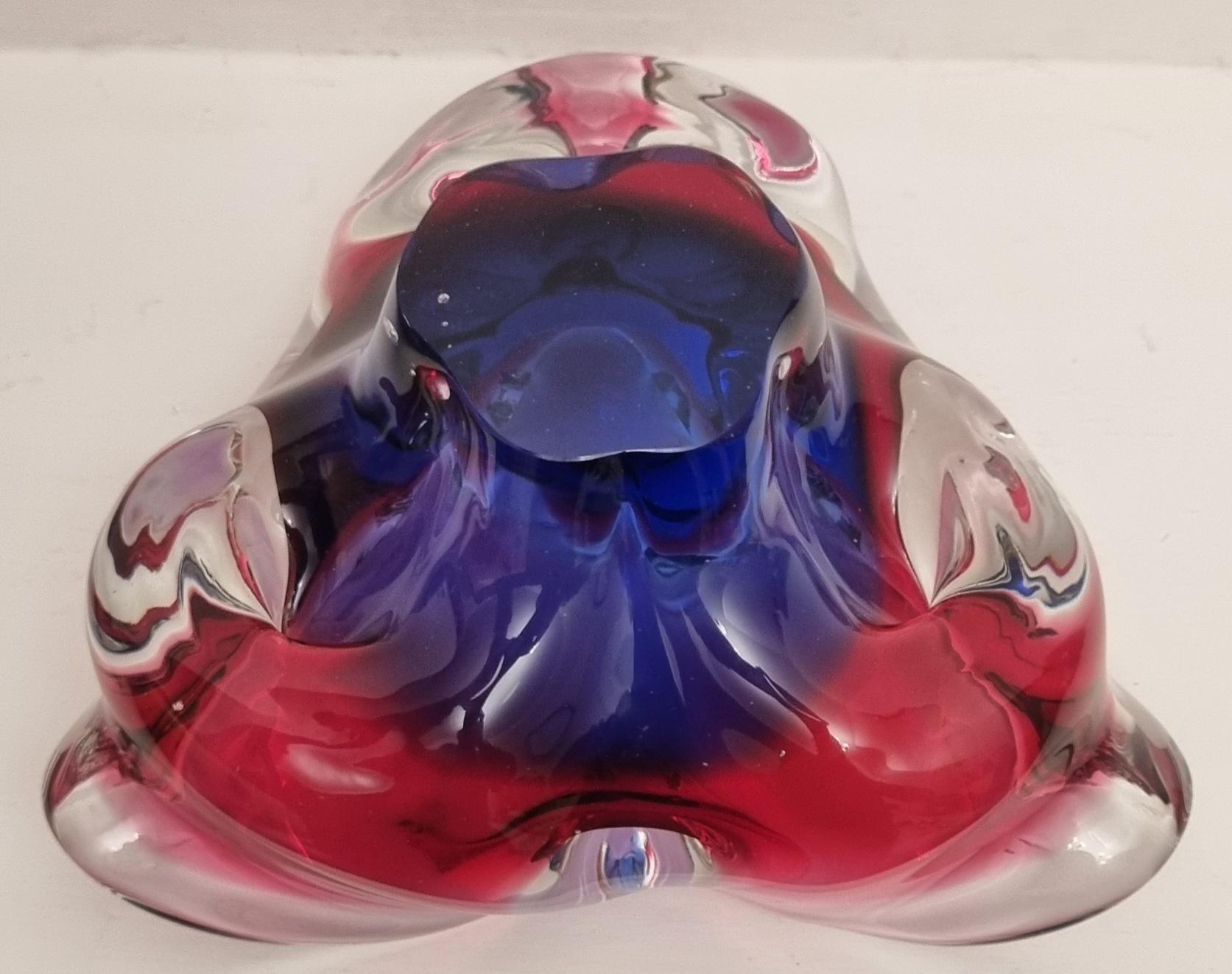 This Czech Organic Sommerso Art Glass Bowl by Josef Hospodka for Chribska Glass is simply stunning. With rich tones of purple and pink, this is definitely a work of art. This particular model has a recorded pattern No. 240 5 20 and dating back from the 60s.