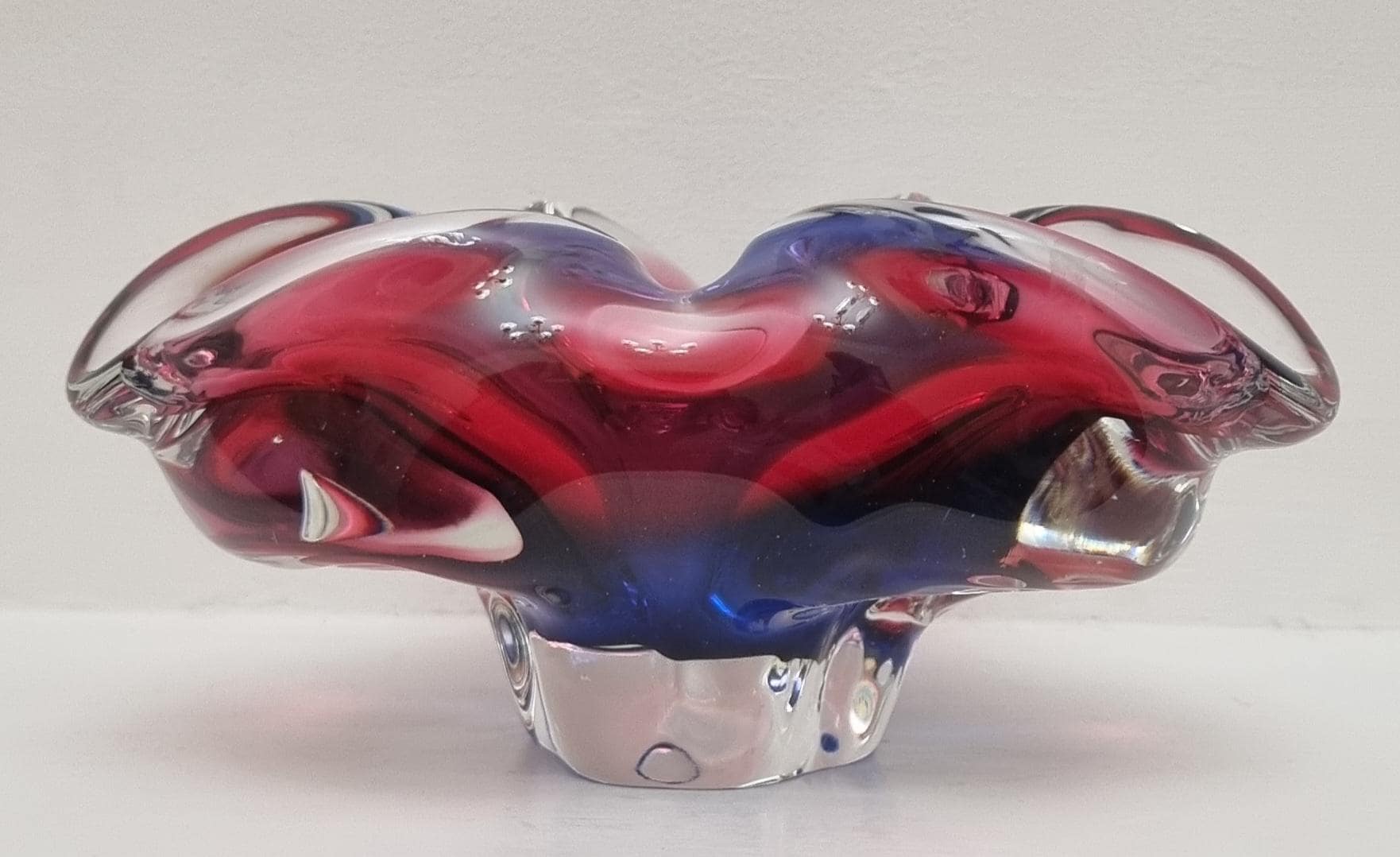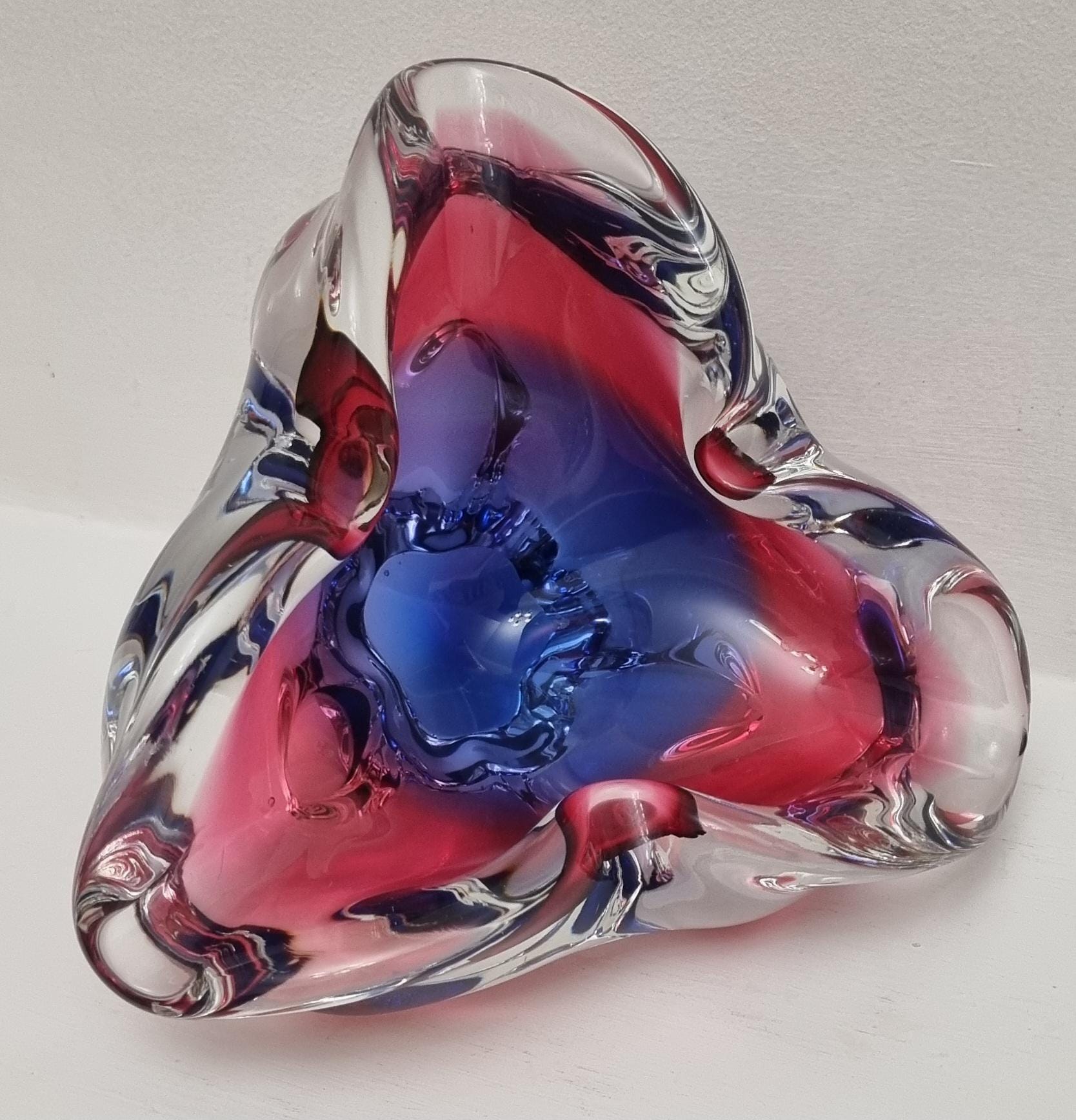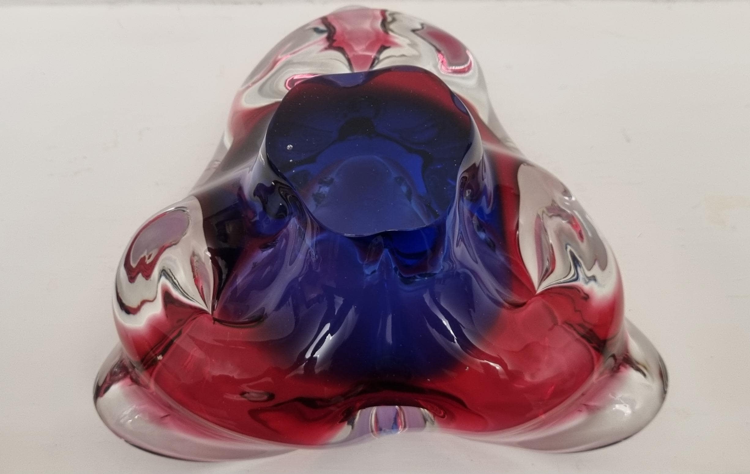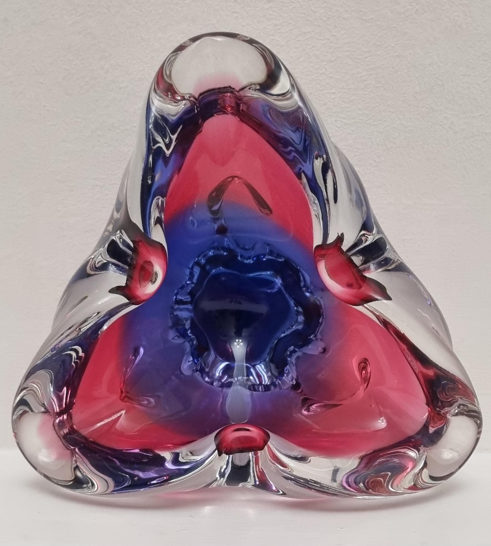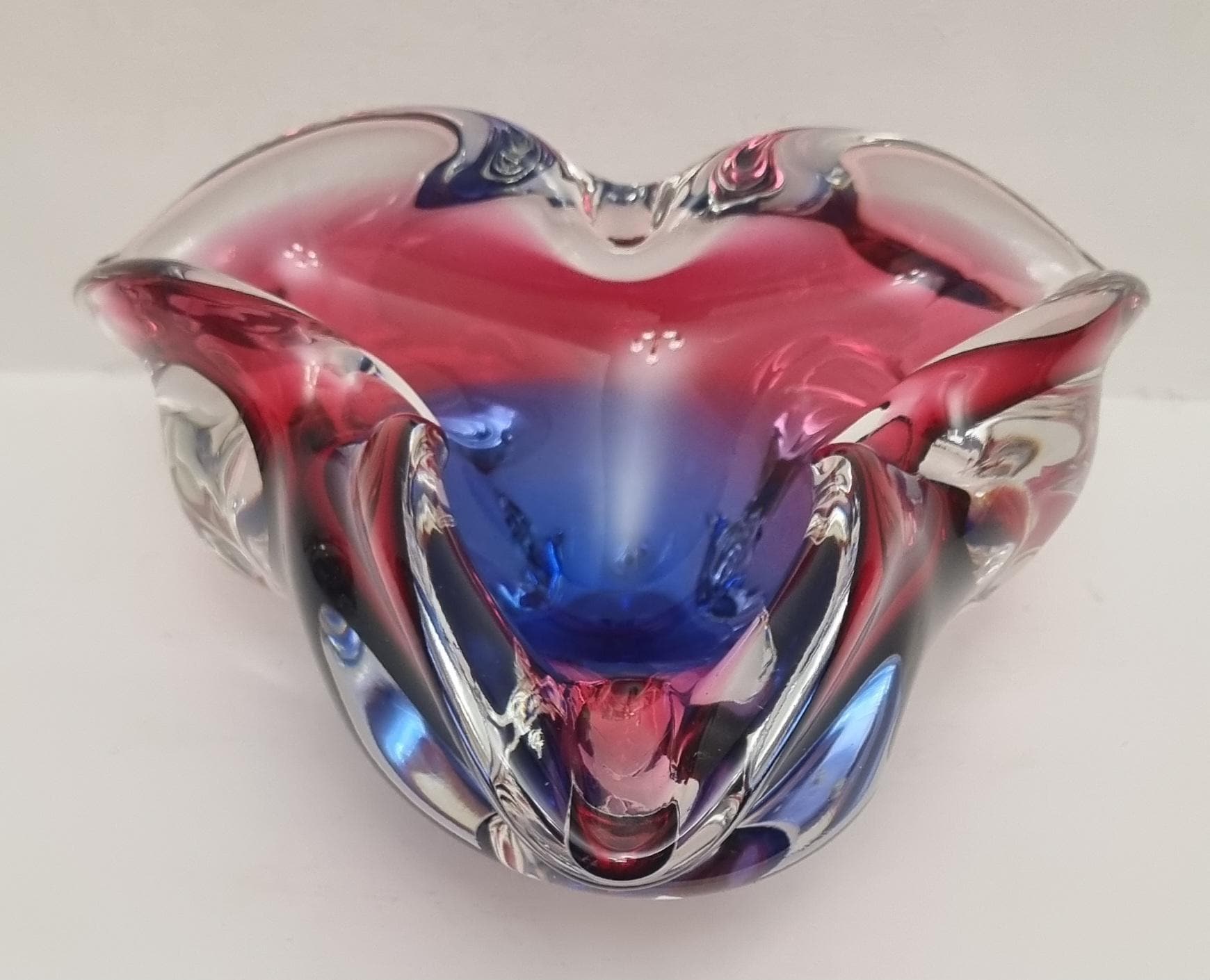 This Czech Organic Sommerso Art Glass Bowl by Josef Hospodka for Chribska Glass is simply stunning. With rich tones of purple and pink, this is definitely a work of art. This particular model has a recorded pattern No. 240 5 20 and dating back from the 60s.