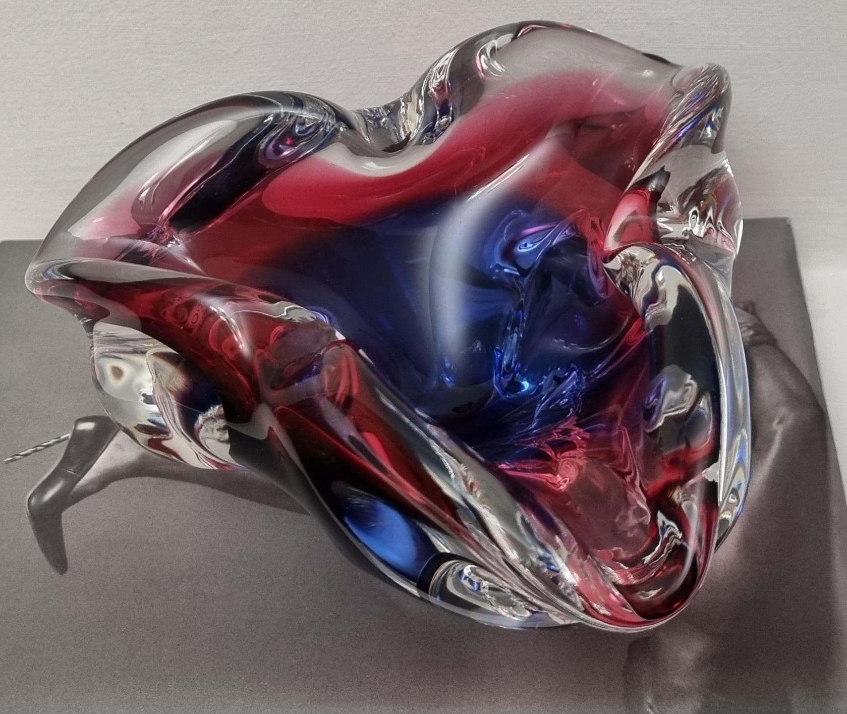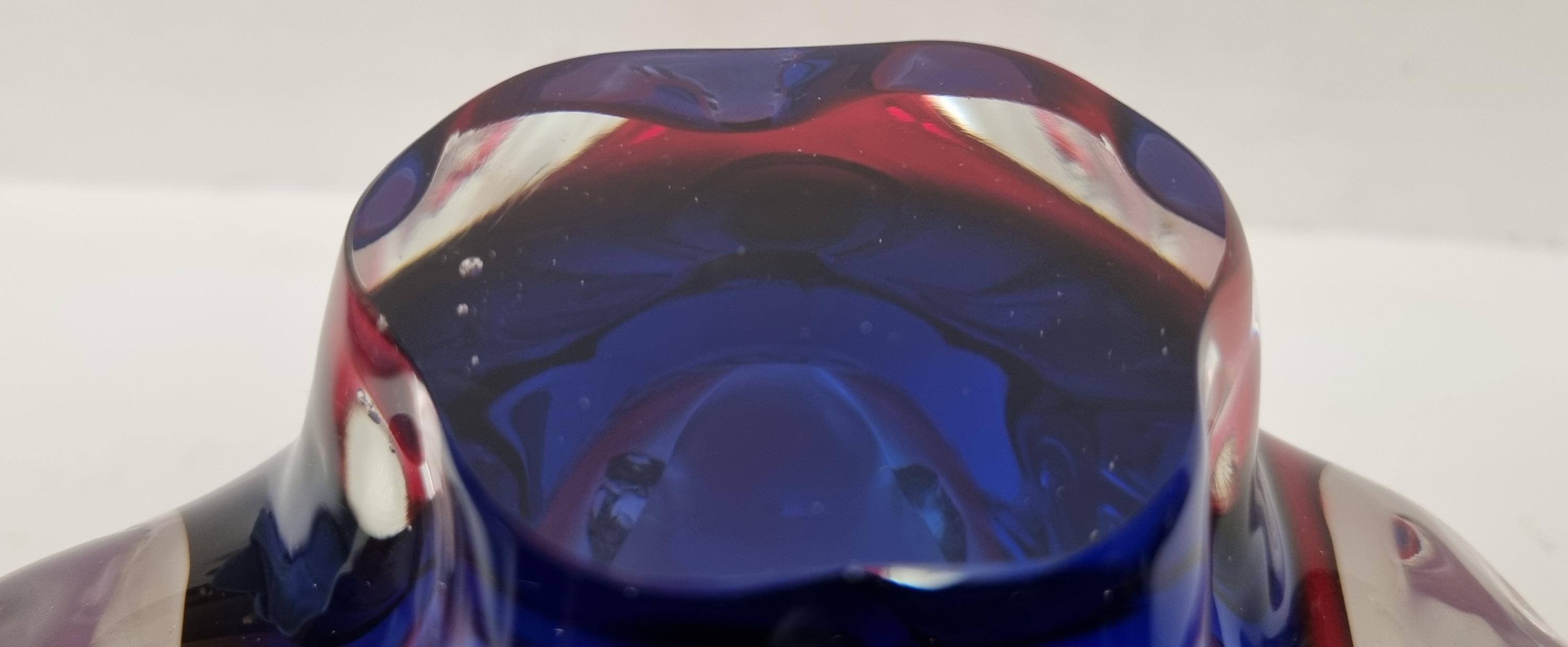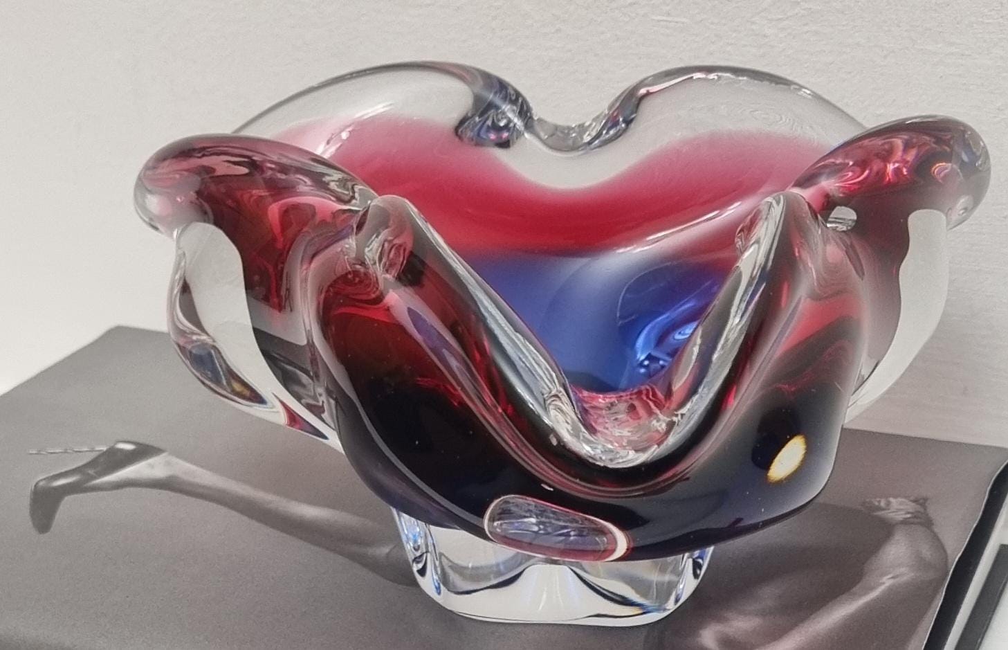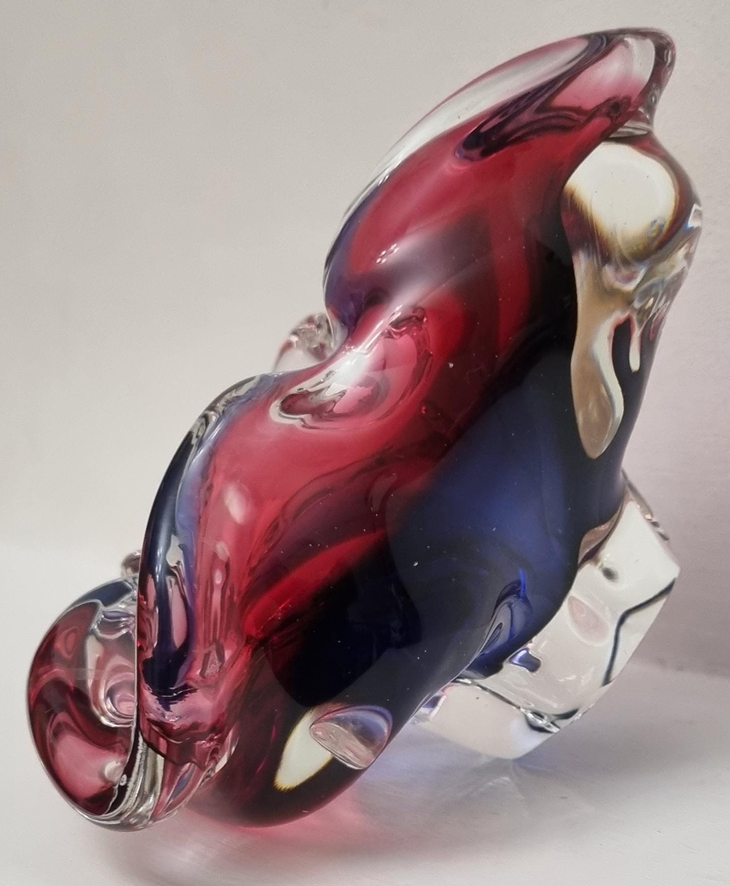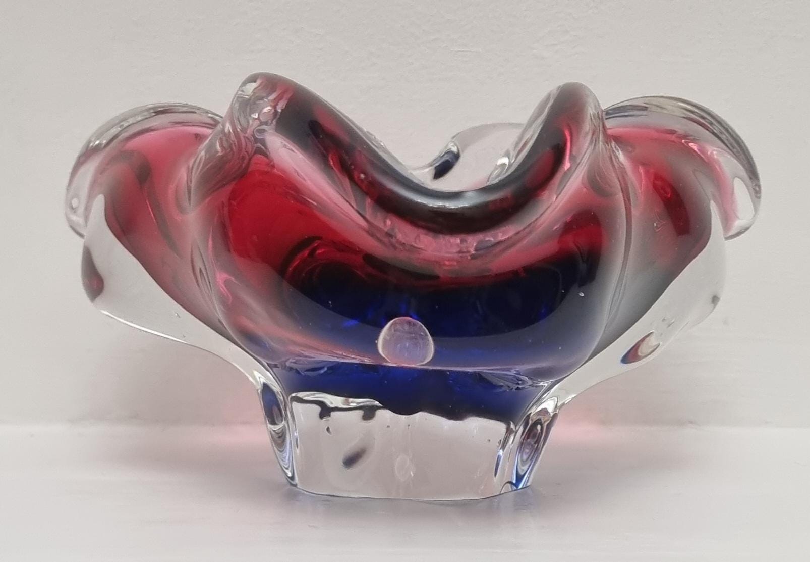 This Czech Organic Sommerso Art Glass Bowl by Josef Hospodka for Chribska Glass is simply stunning. With rich tones of purple and pink, this is definitely a work of art. This particular model has a recorded pattern No. 240 5 20 and dating back from the 60s.