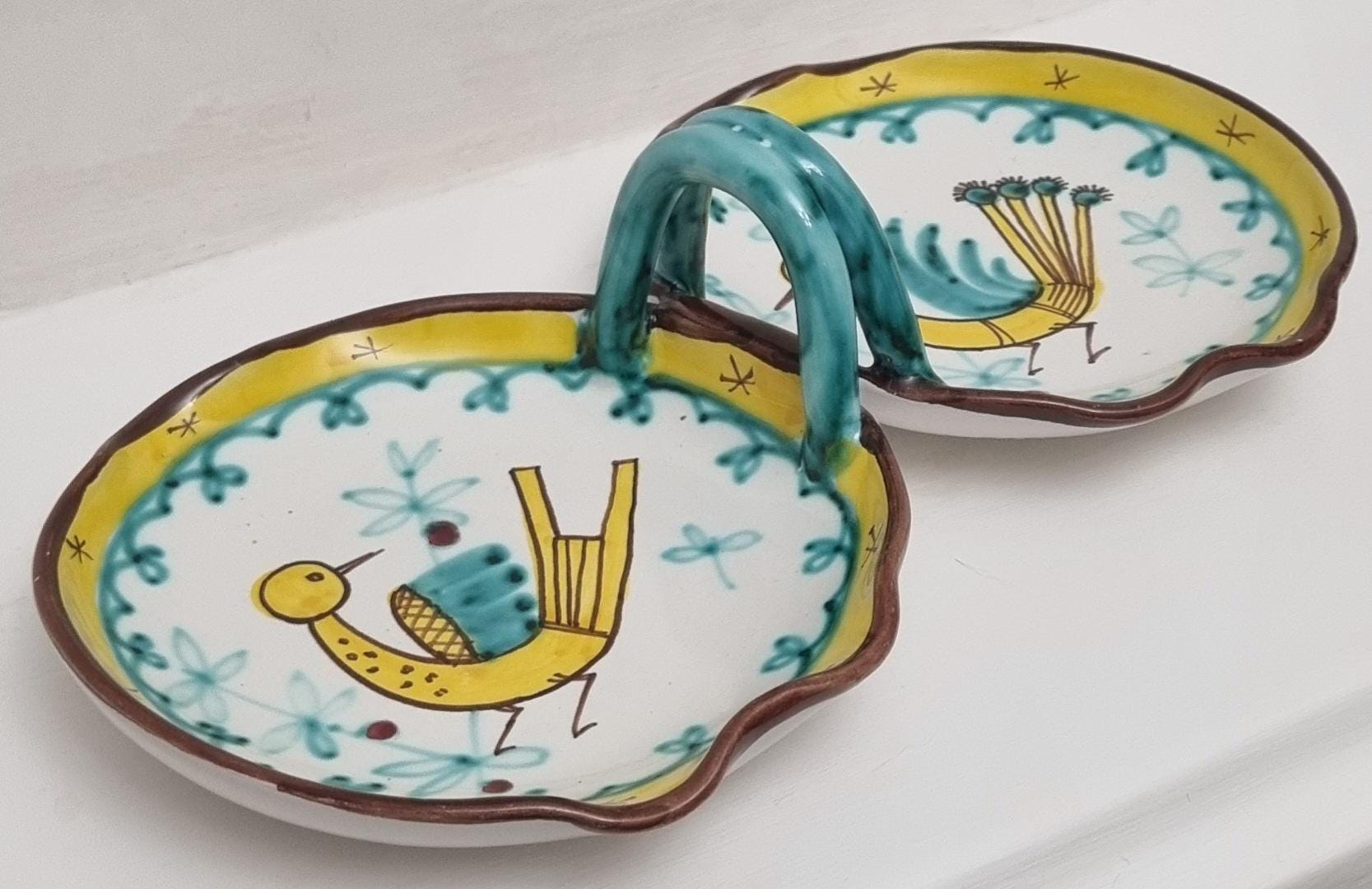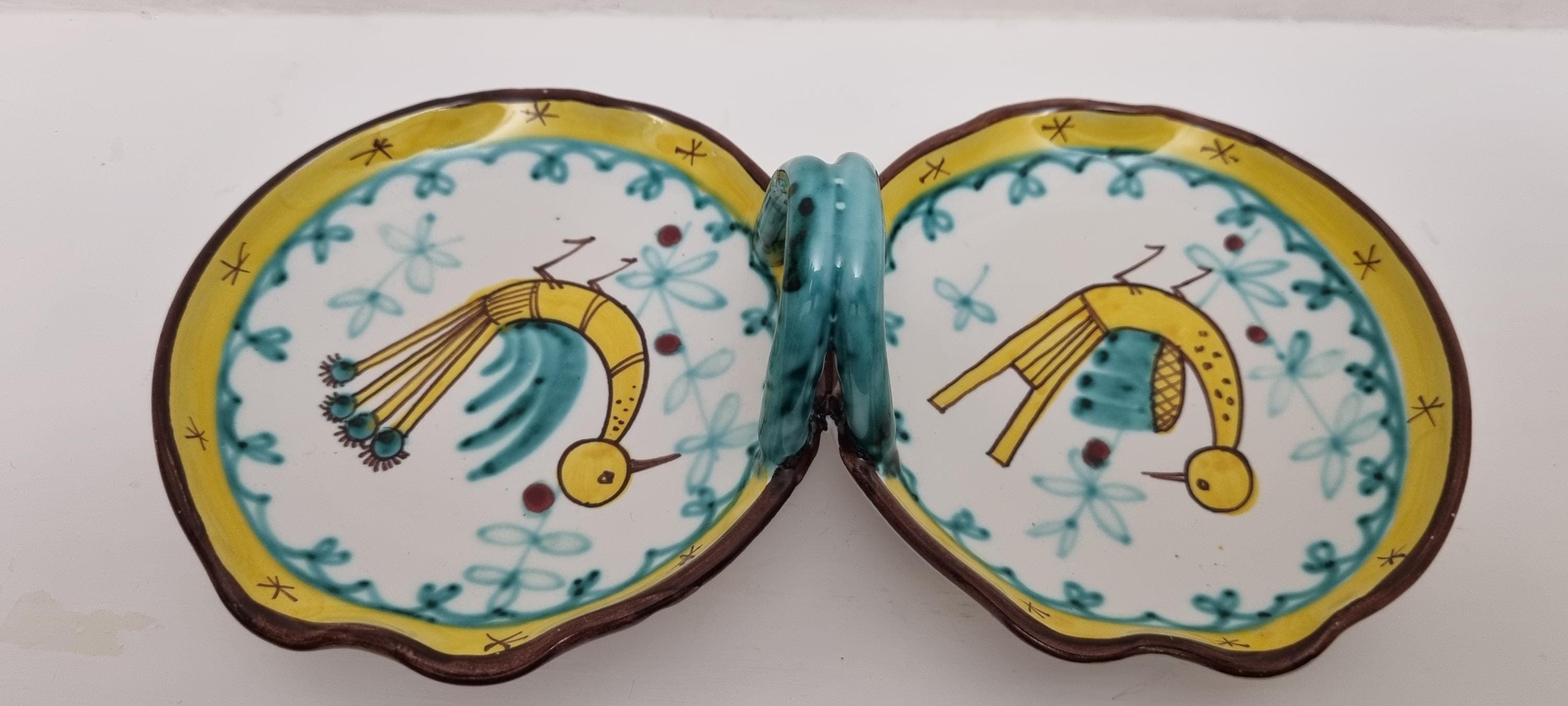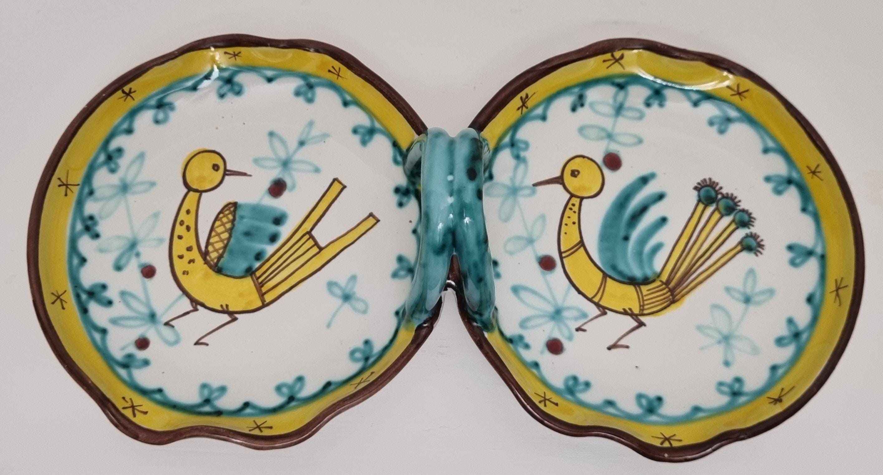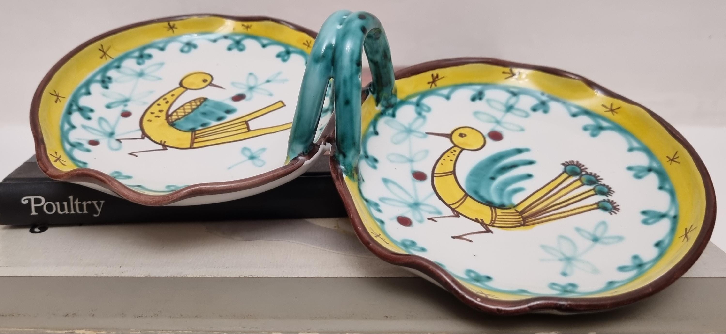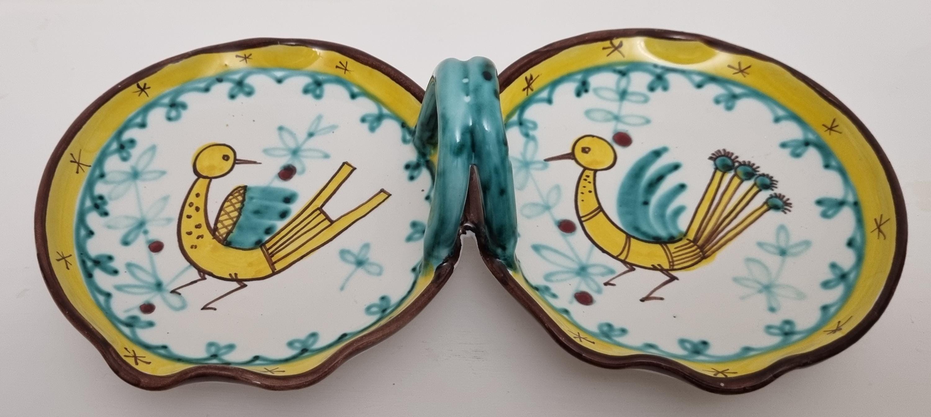A very fun handled double dish which are often referred to as a relish or antipasti tray. The particular tray is Numbered 07 819.