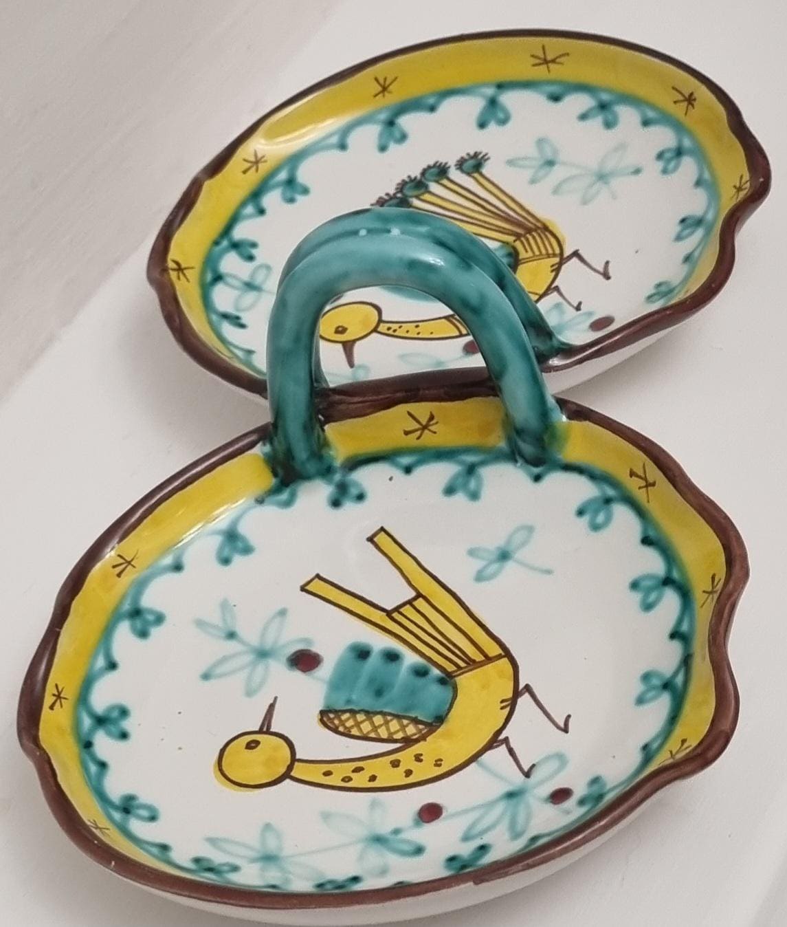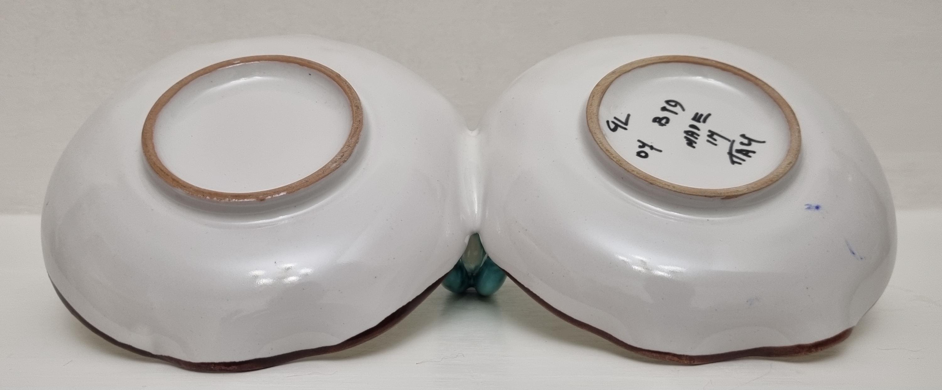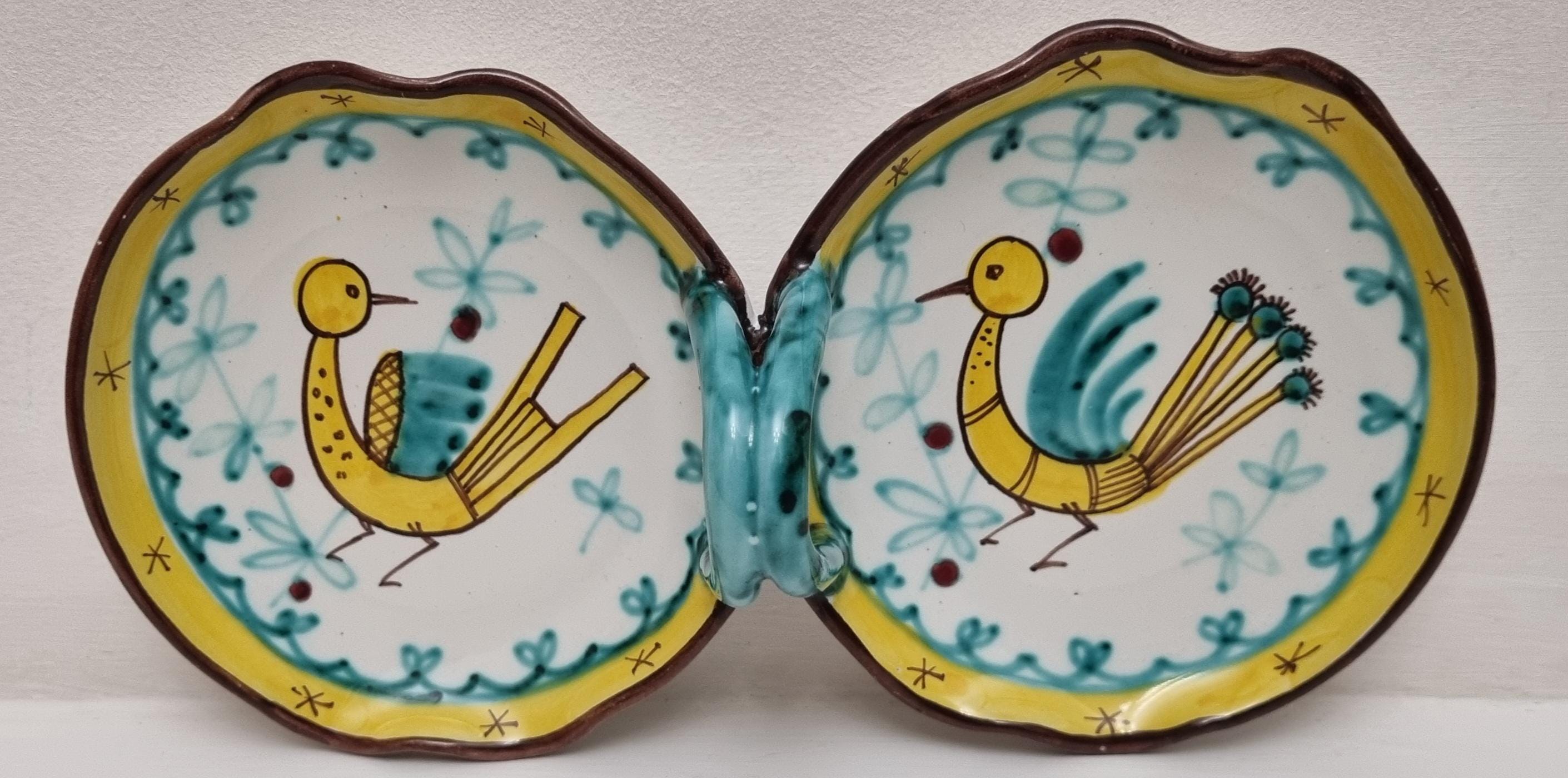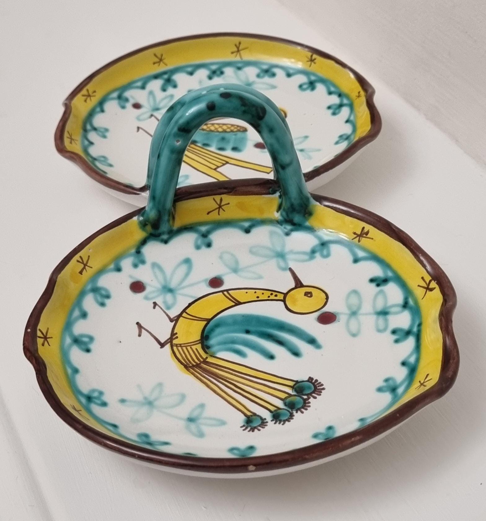 A very fun handled double dish which are often referred to as a relish or antipasti tray. The particular tray is Numbered 07 819.