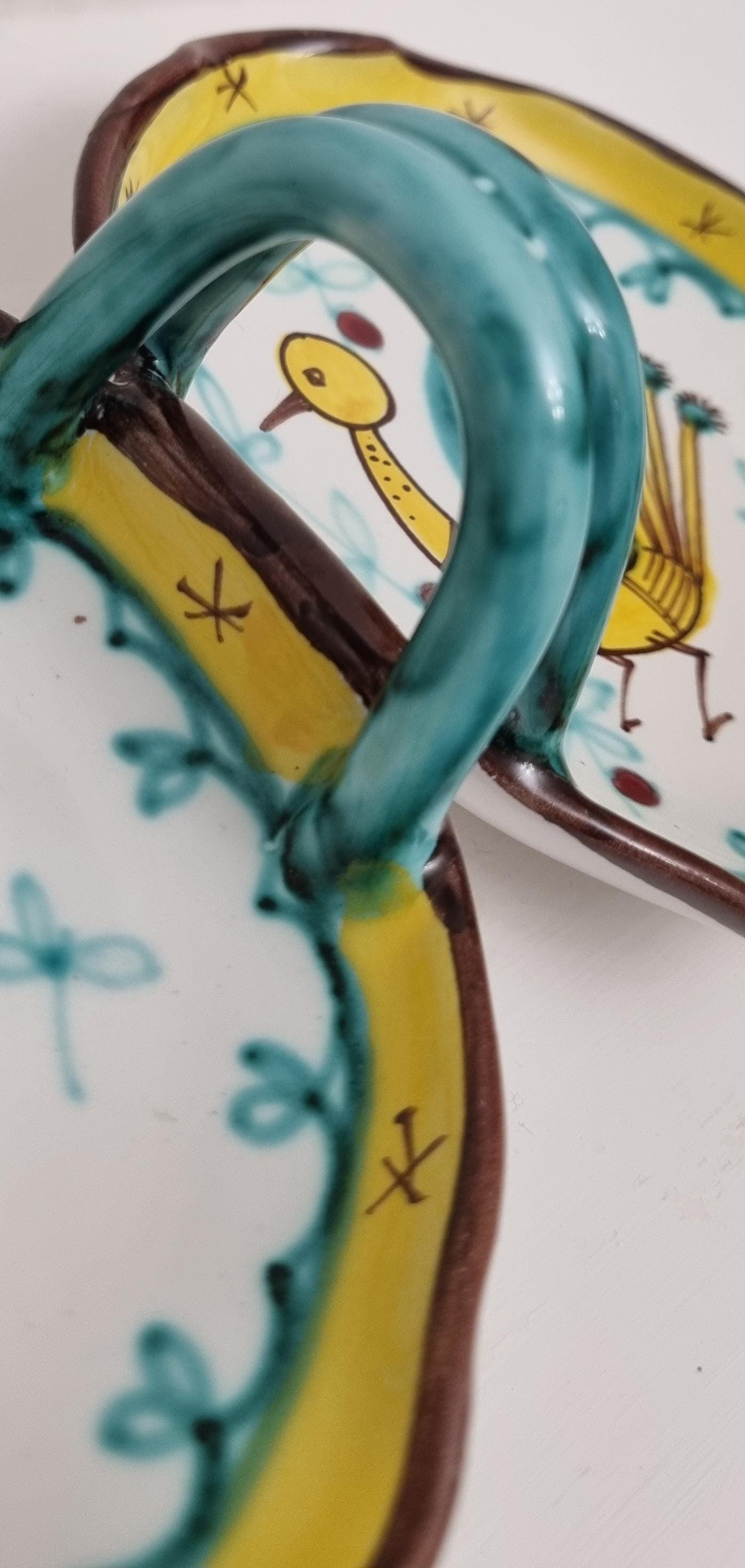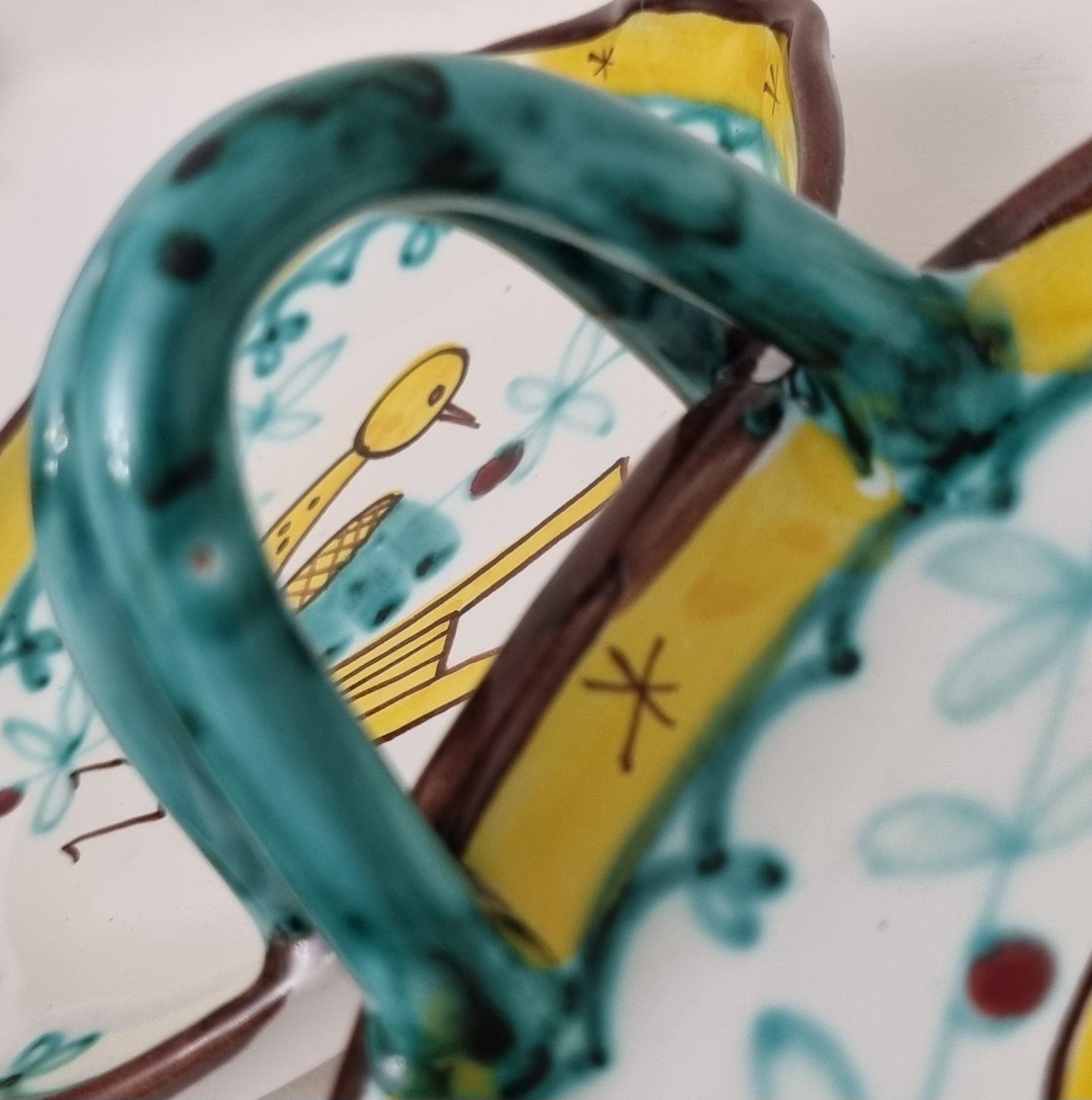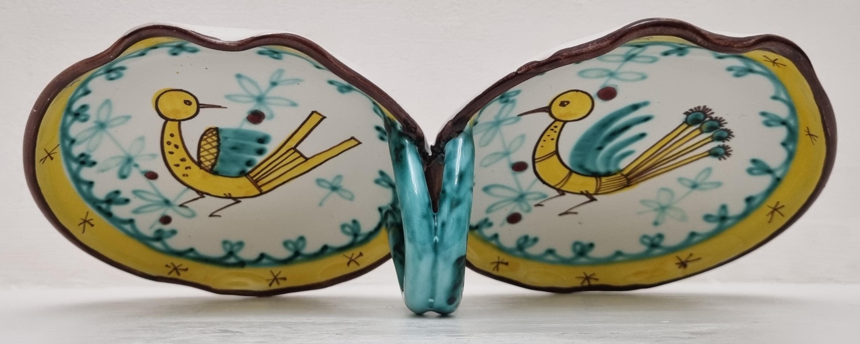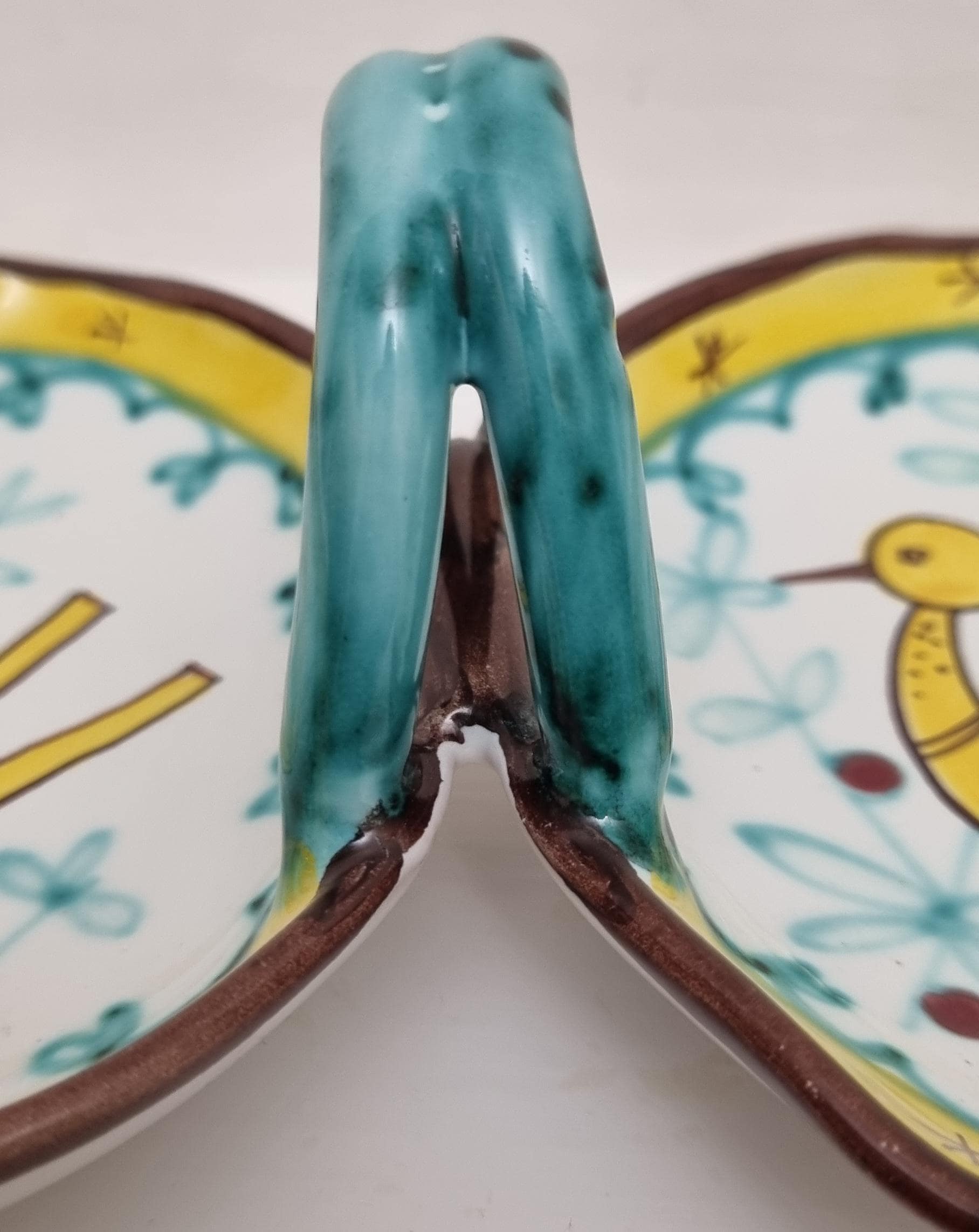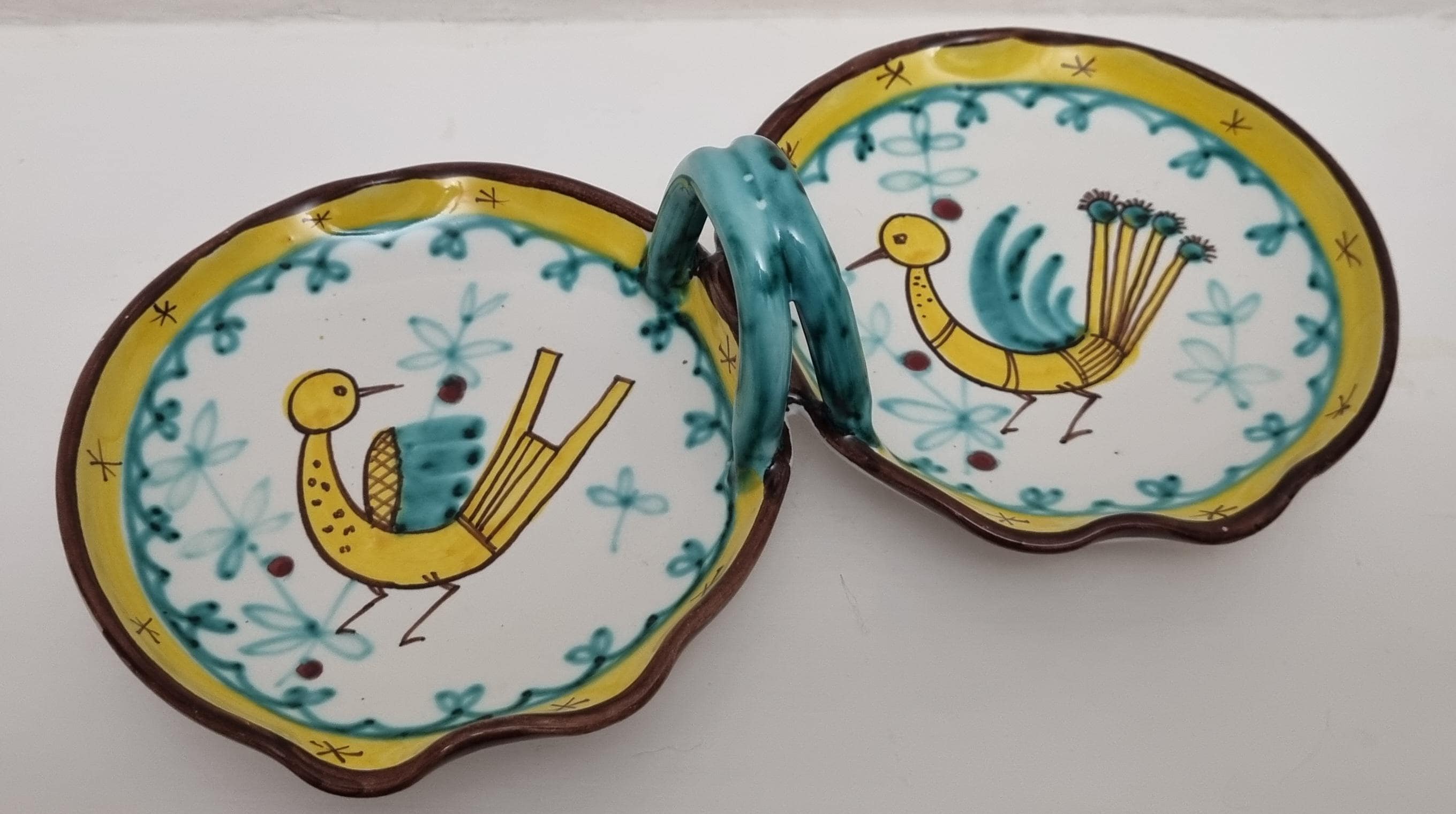 A very fun handled double dish which are often referred to as a relish or antipasti tray. The particular tray is Numbered 07 819.