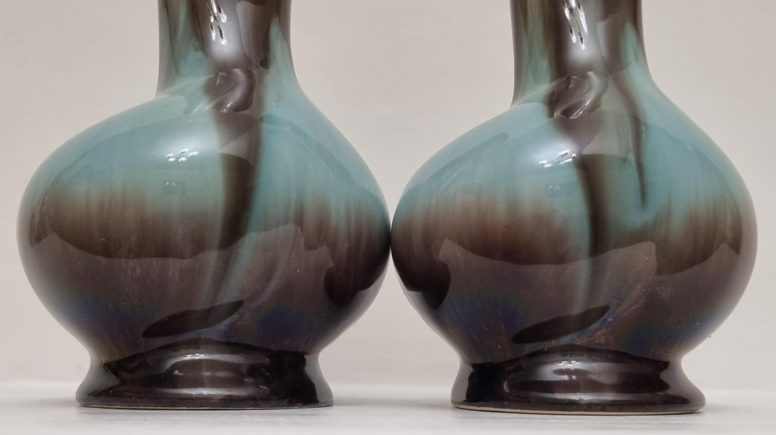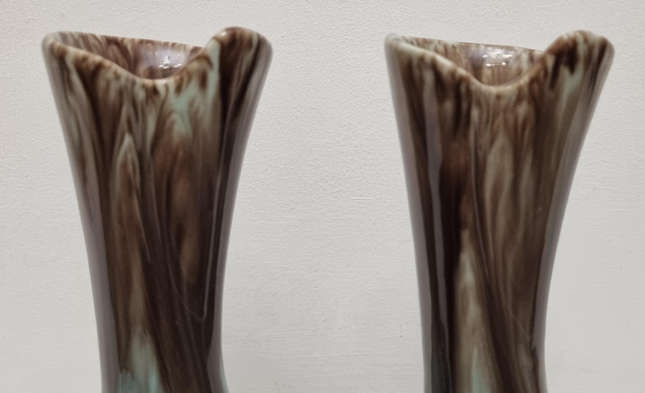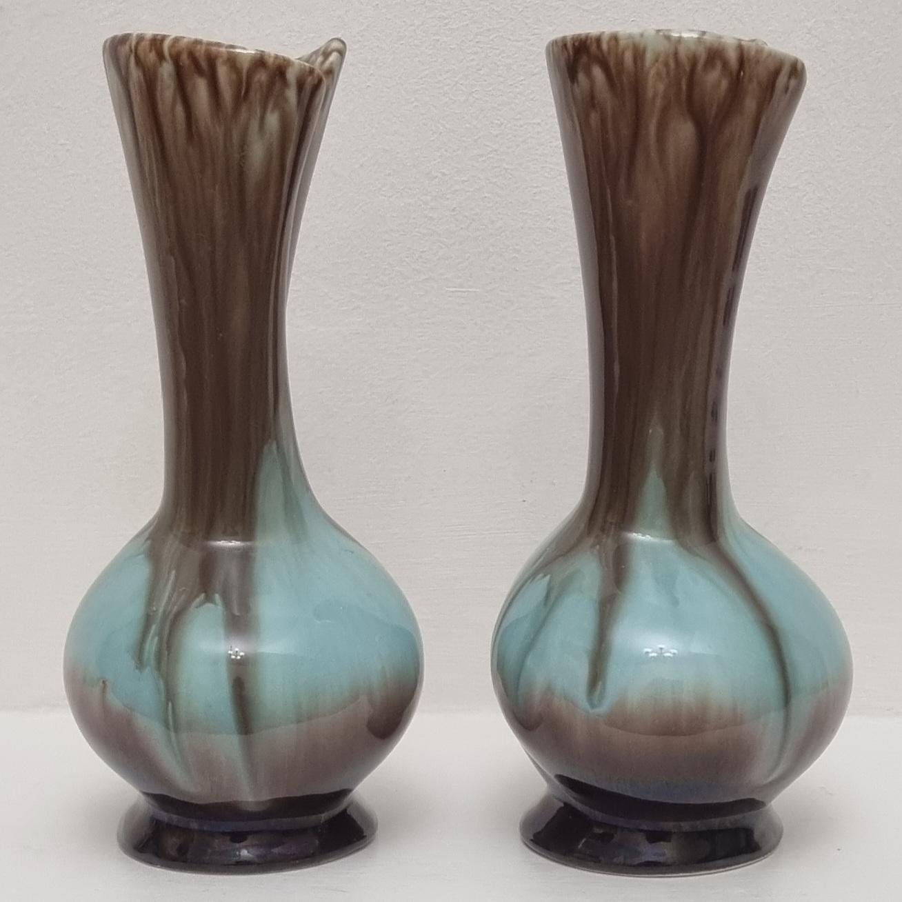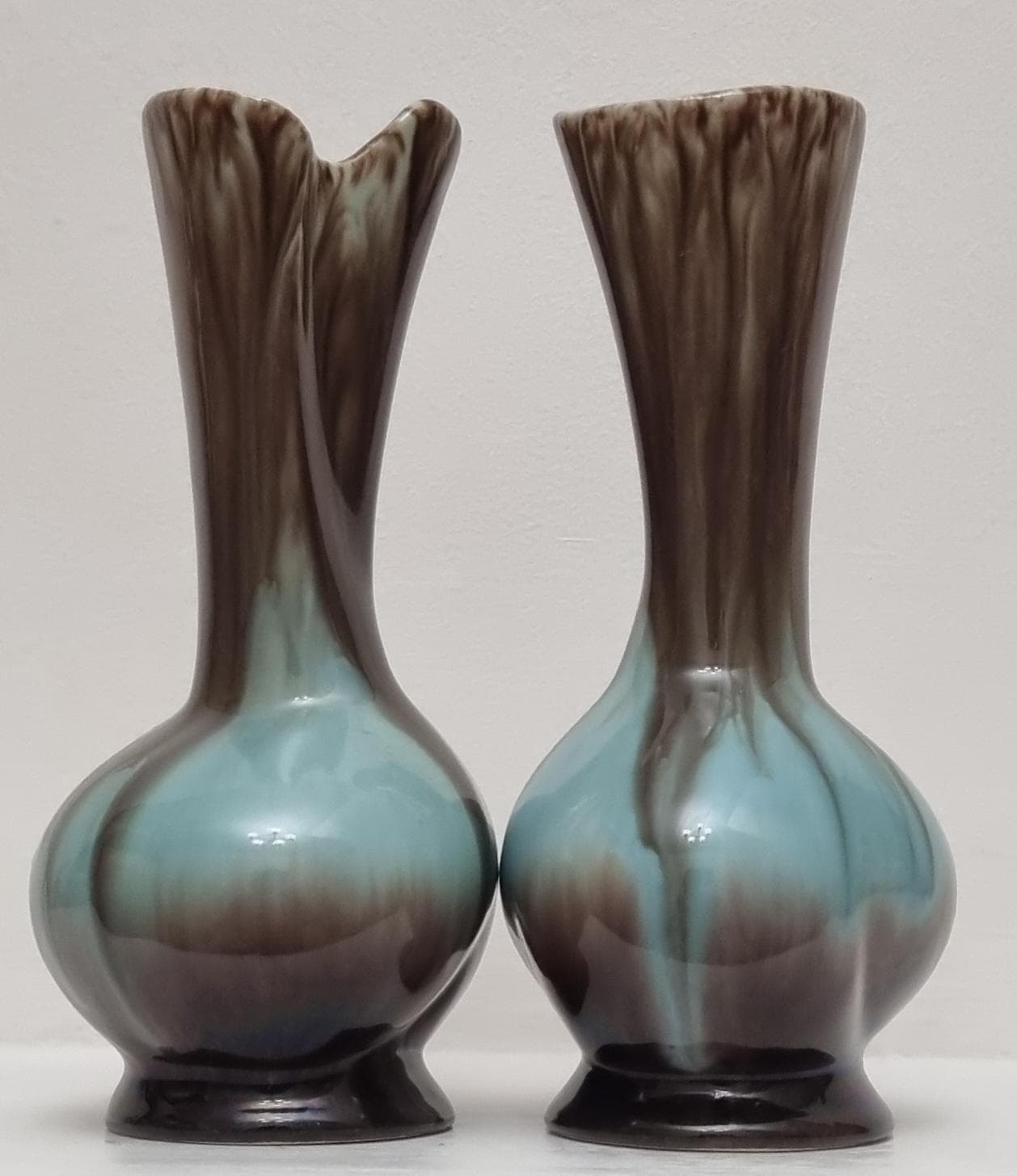 A pair of MCM West German Pottery Ceramic brown drip glaze long neck vases. Model 541 17.