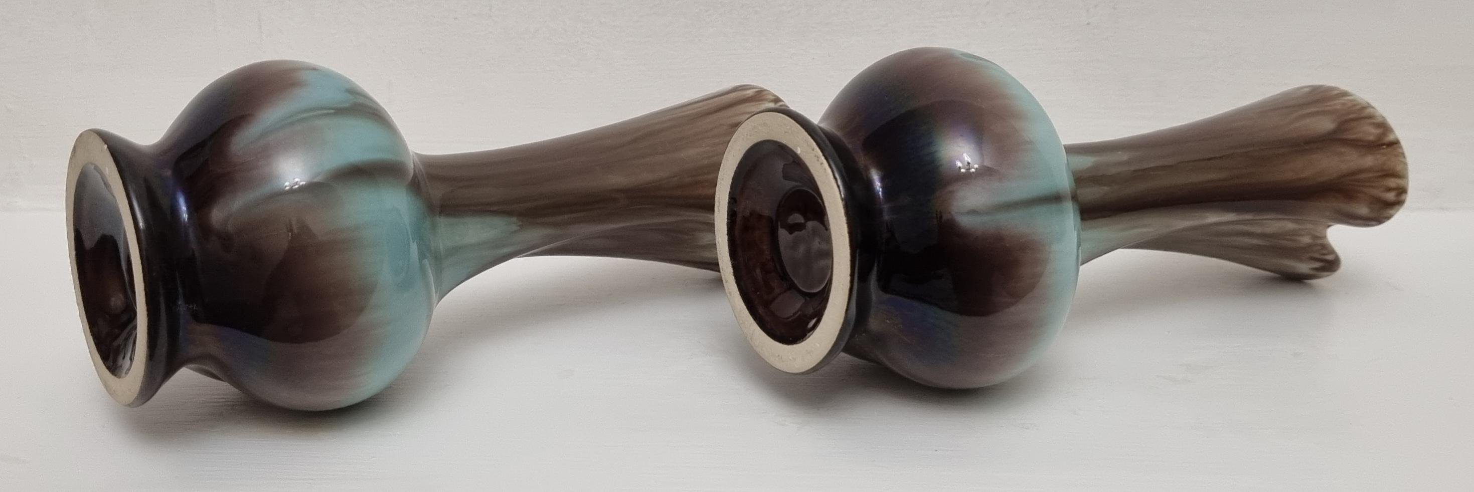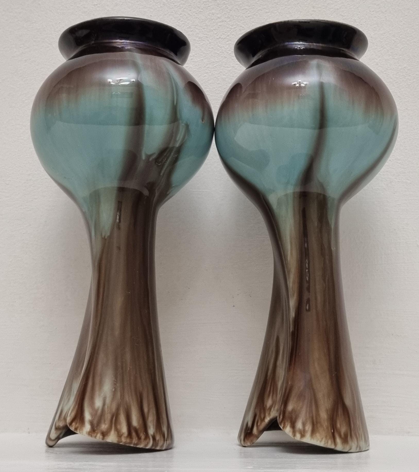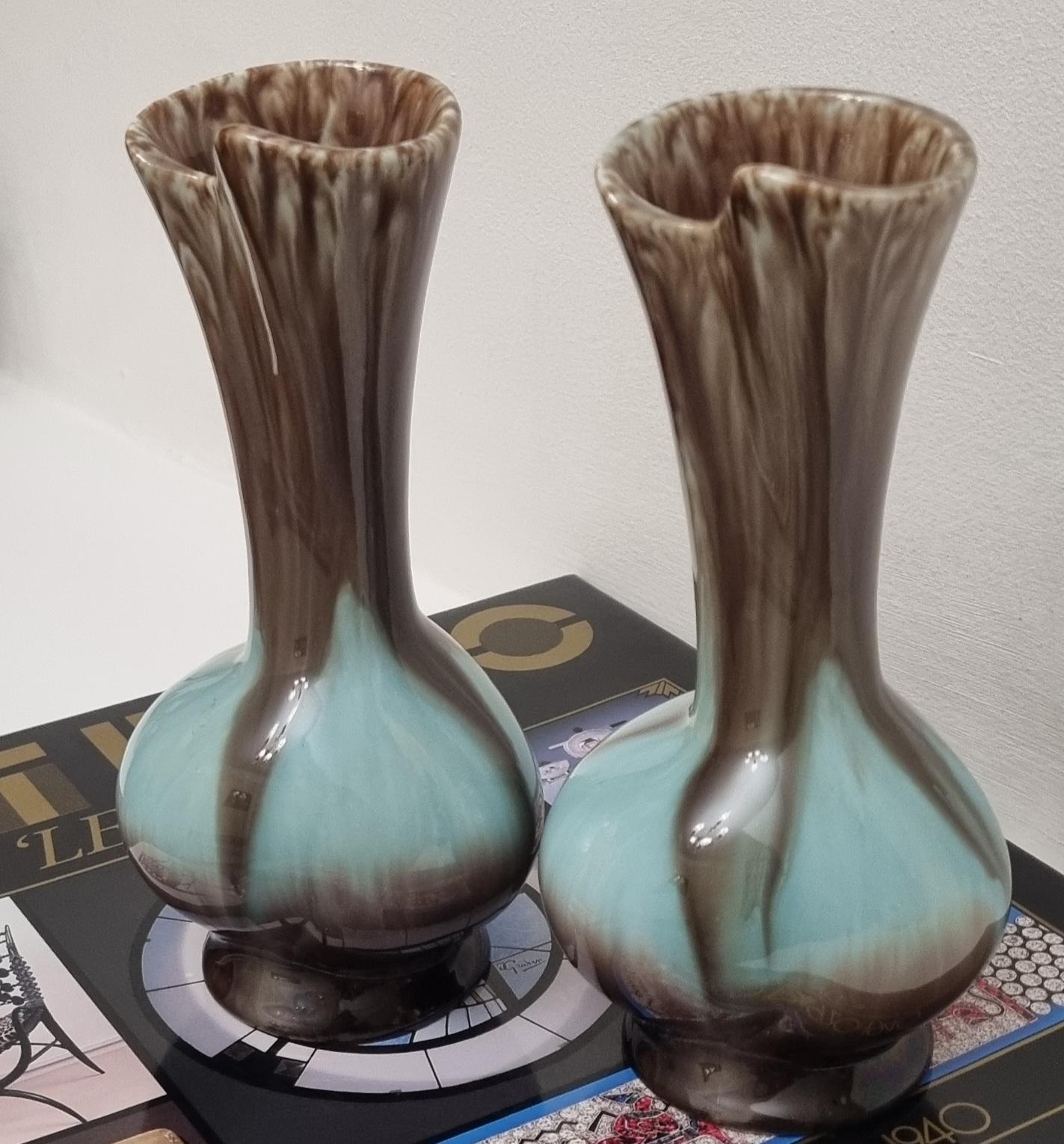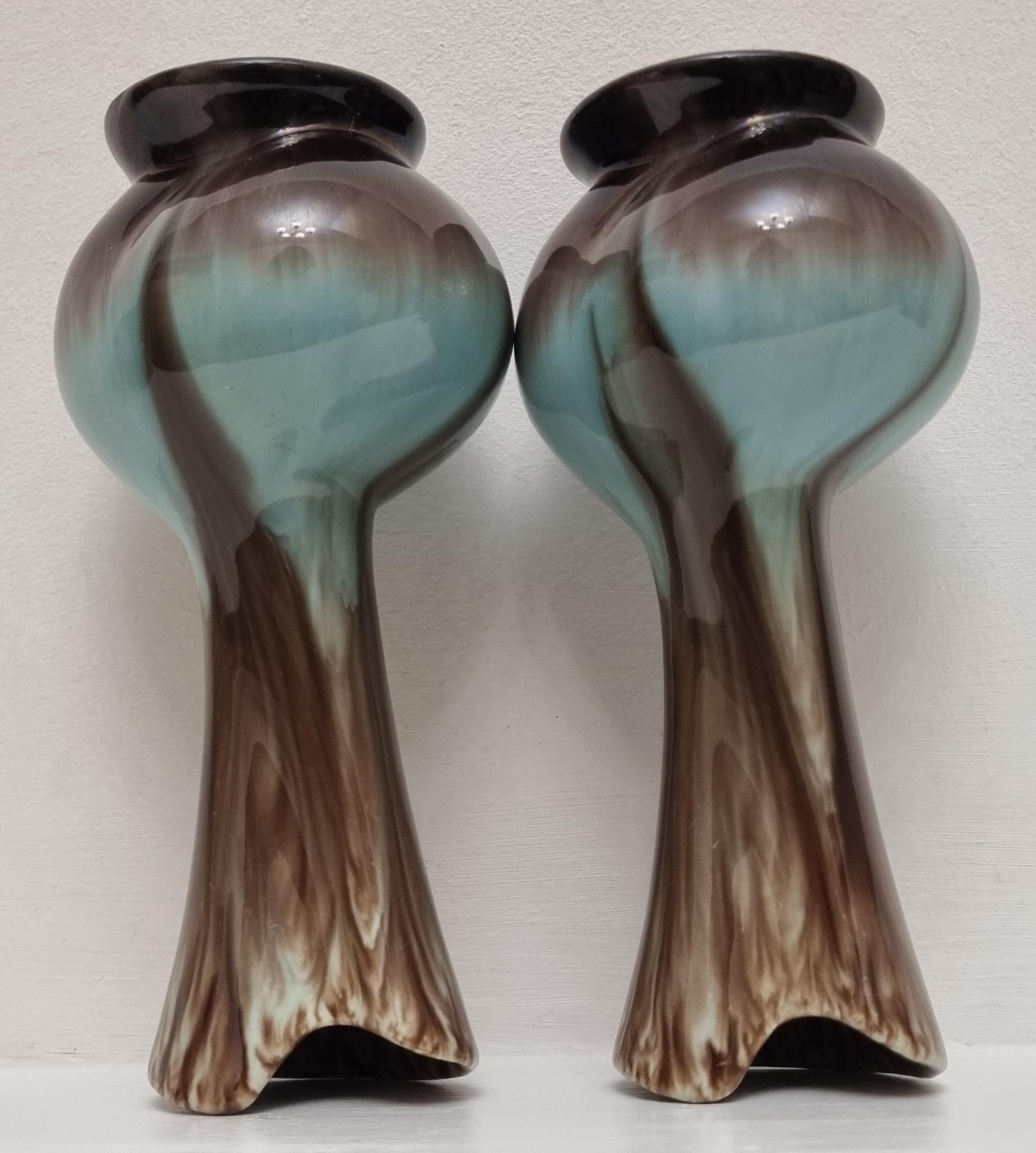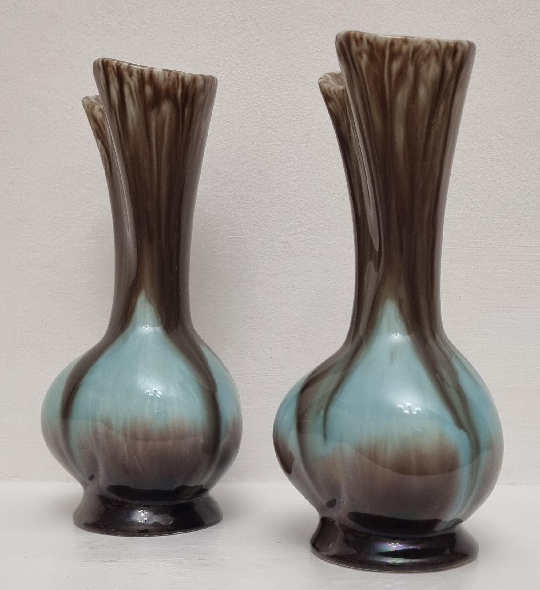 A pair of MCM West German Pottery Ceramic brown drip glaze long neck vases. Model 541 17.