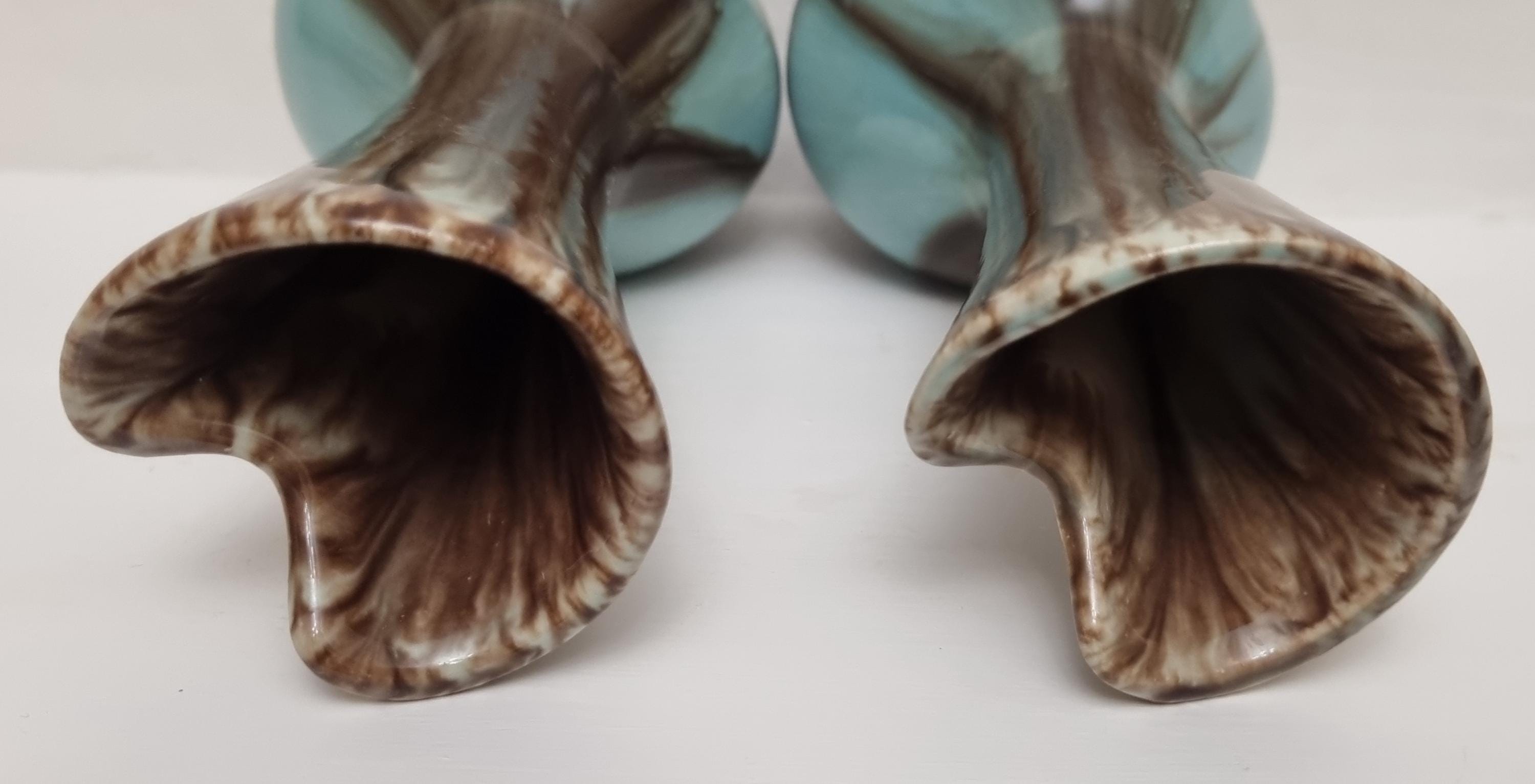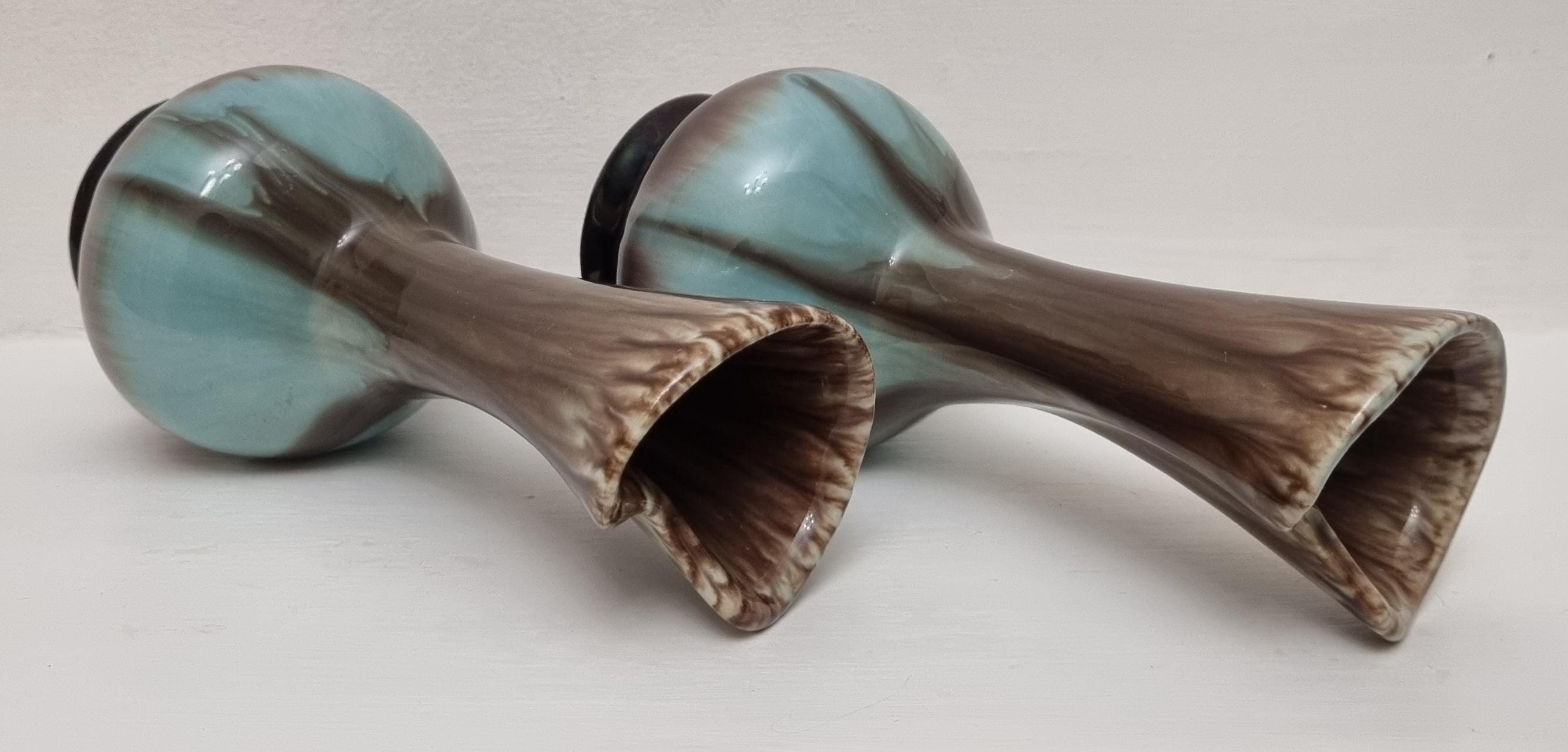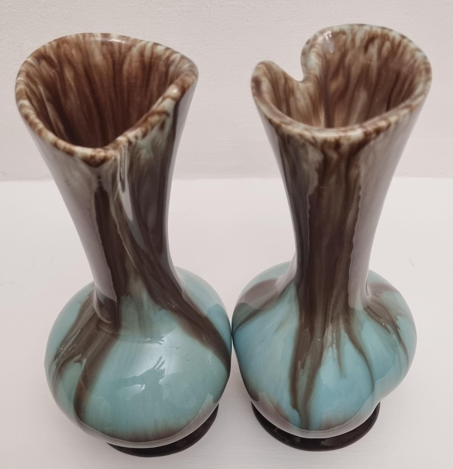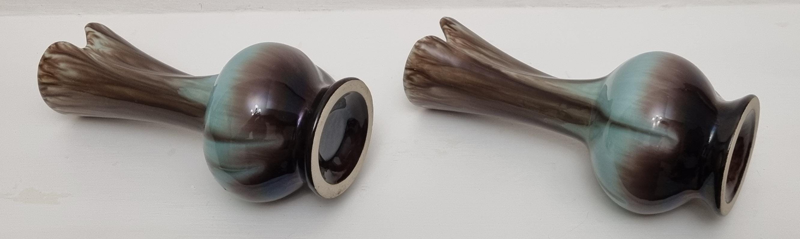 A pair of MCM West German Pottery Ceramic brown drip glaze long neck vases. Model 541 17.