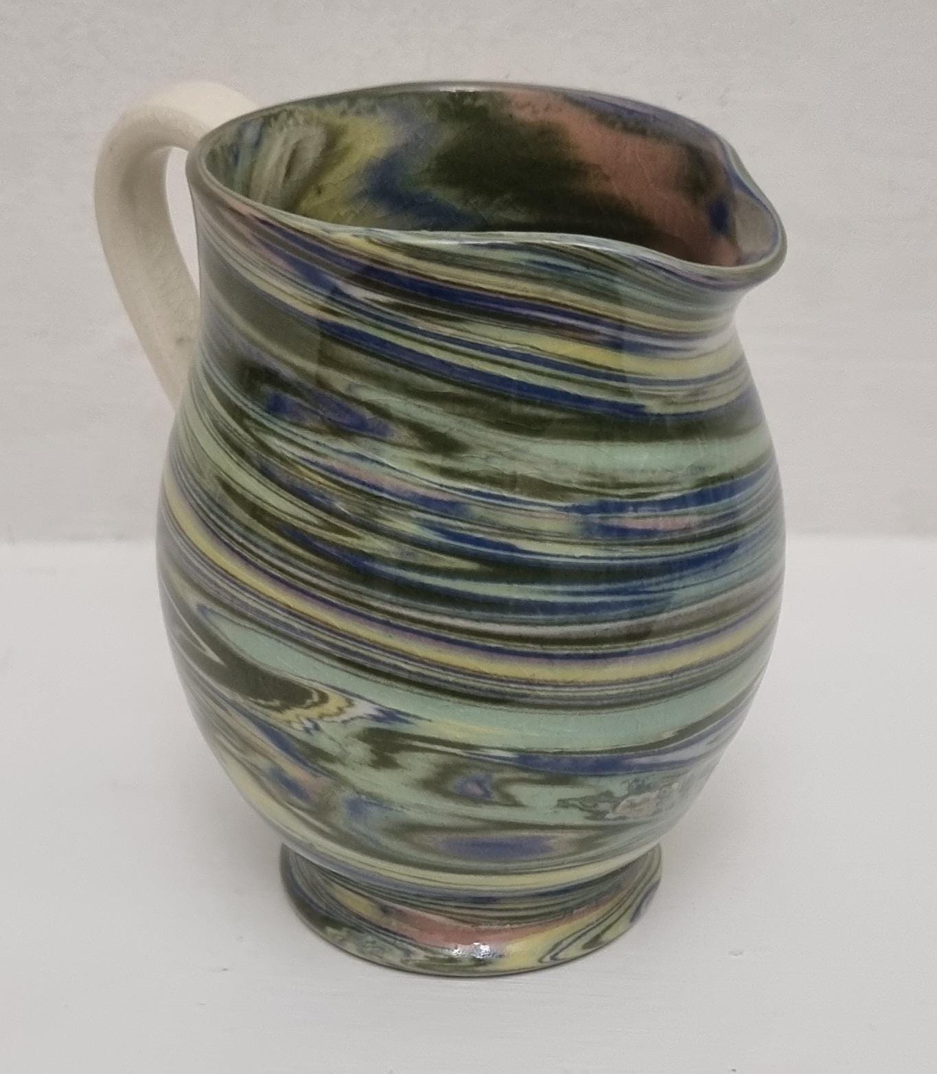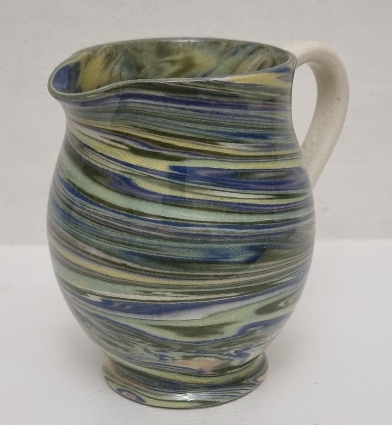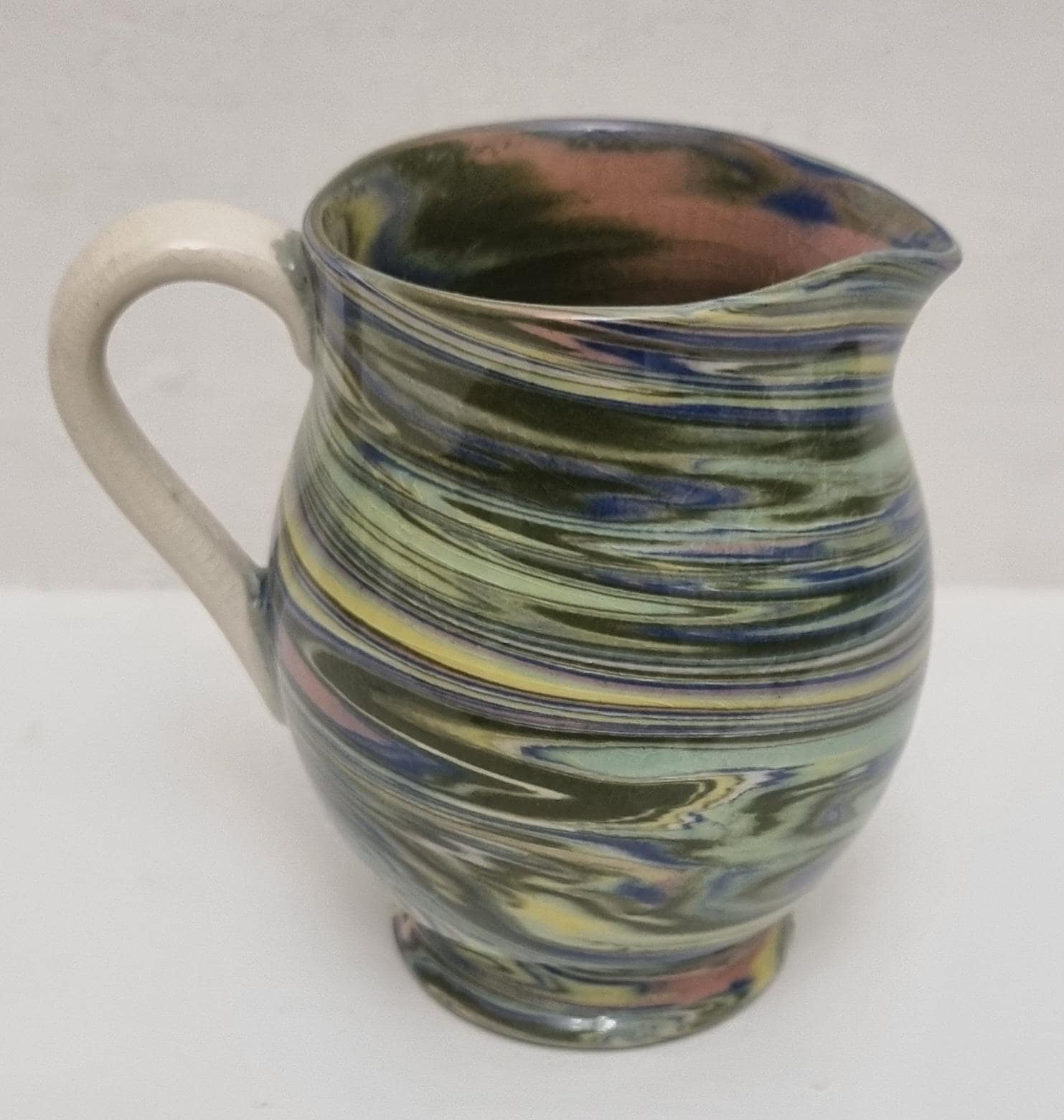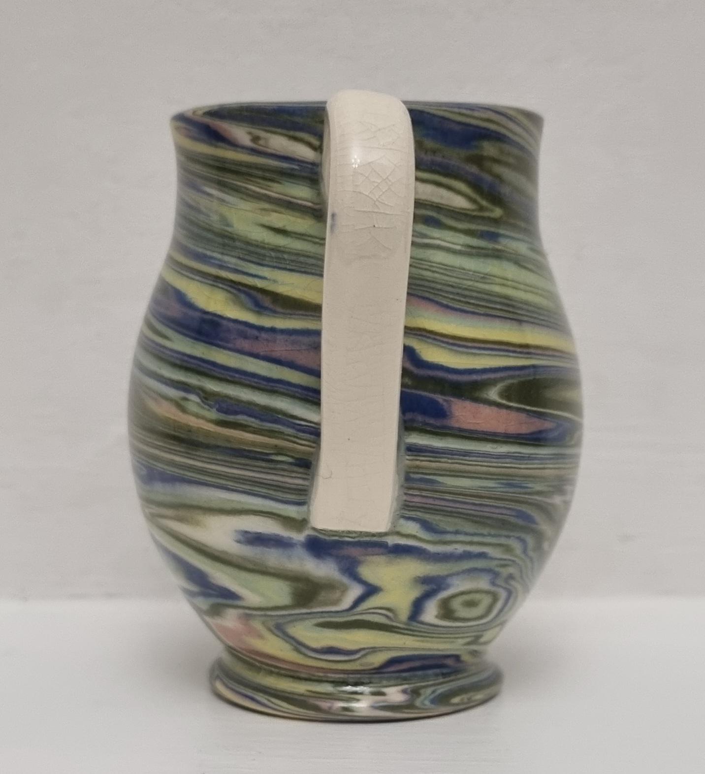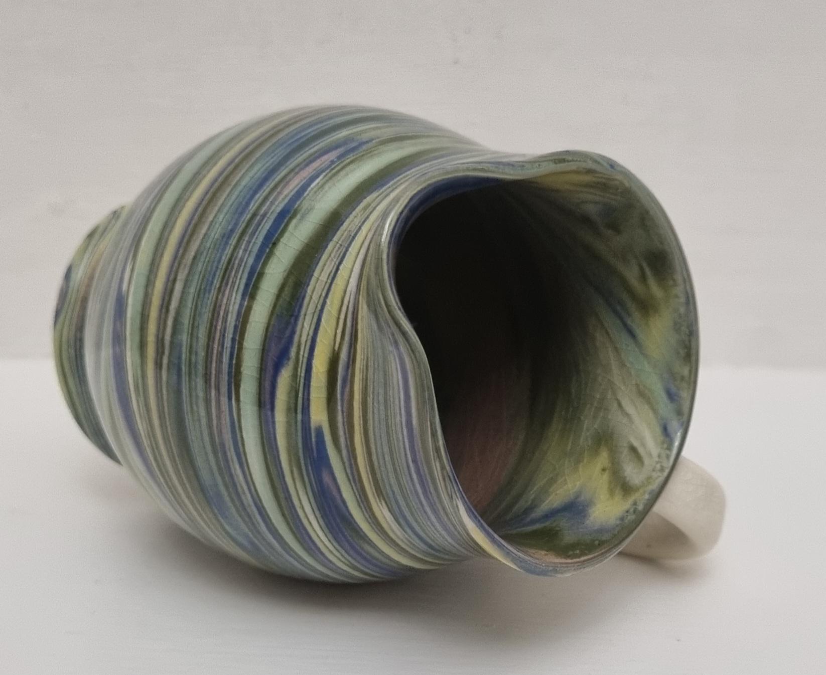 Cute little swirl patterned creamer jug, from Alton Towers studio pottery in Staffordshire, England. The jug features a distinctive marbled or "swirl" pattern created by mixing different coloured clays, a technique known as agateware or nerikomi. Can also be used as a same decorative vase.