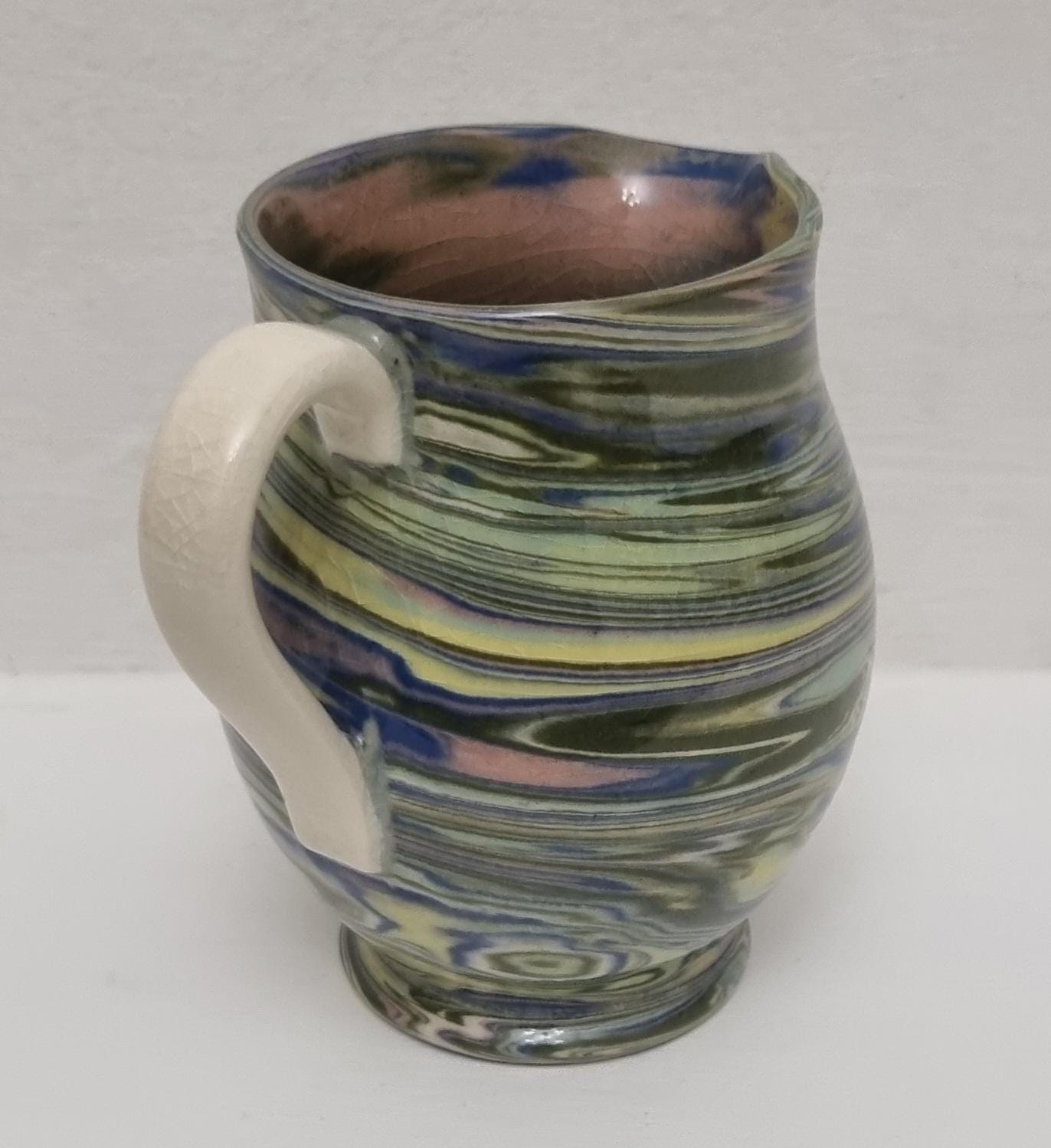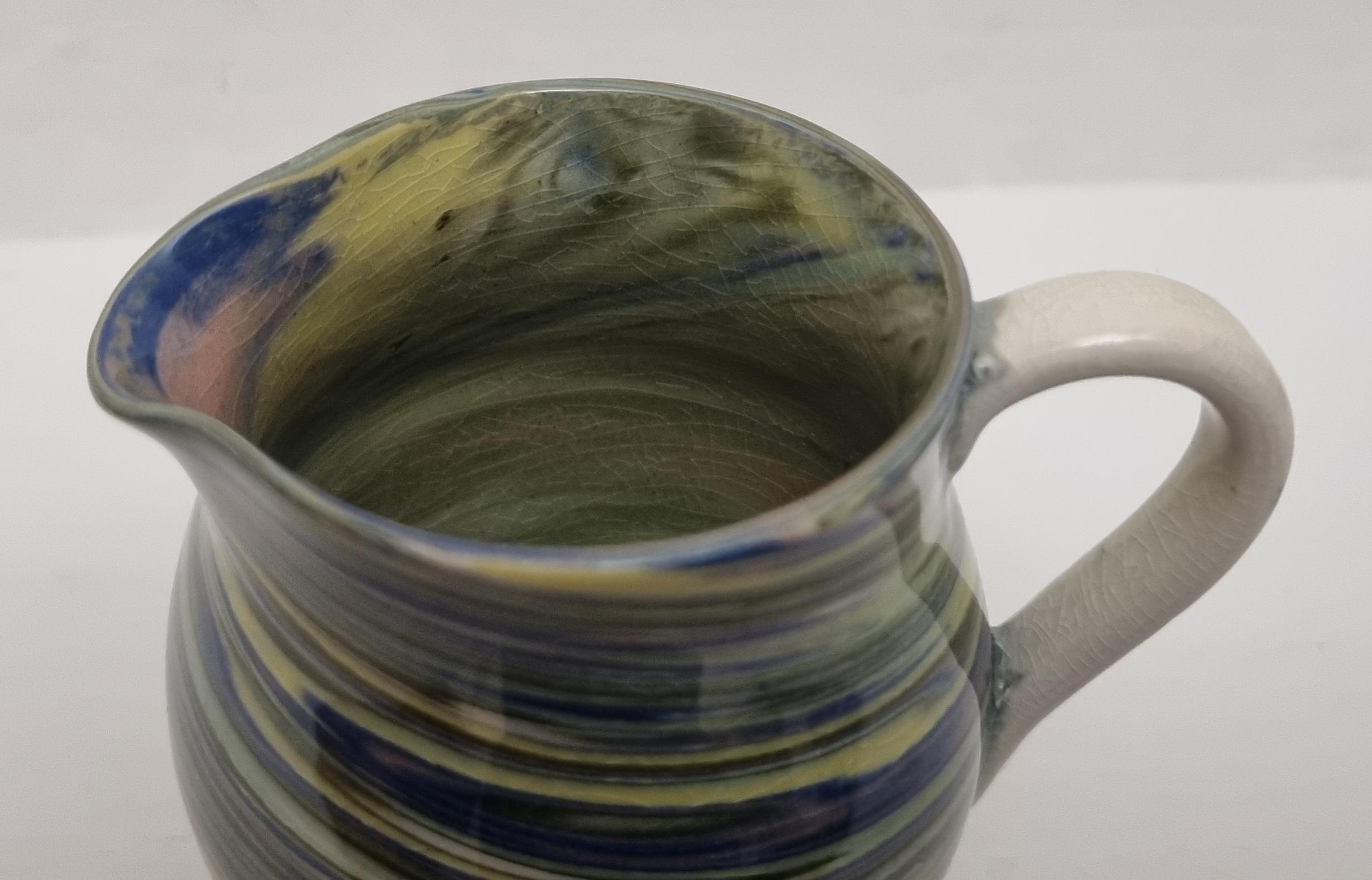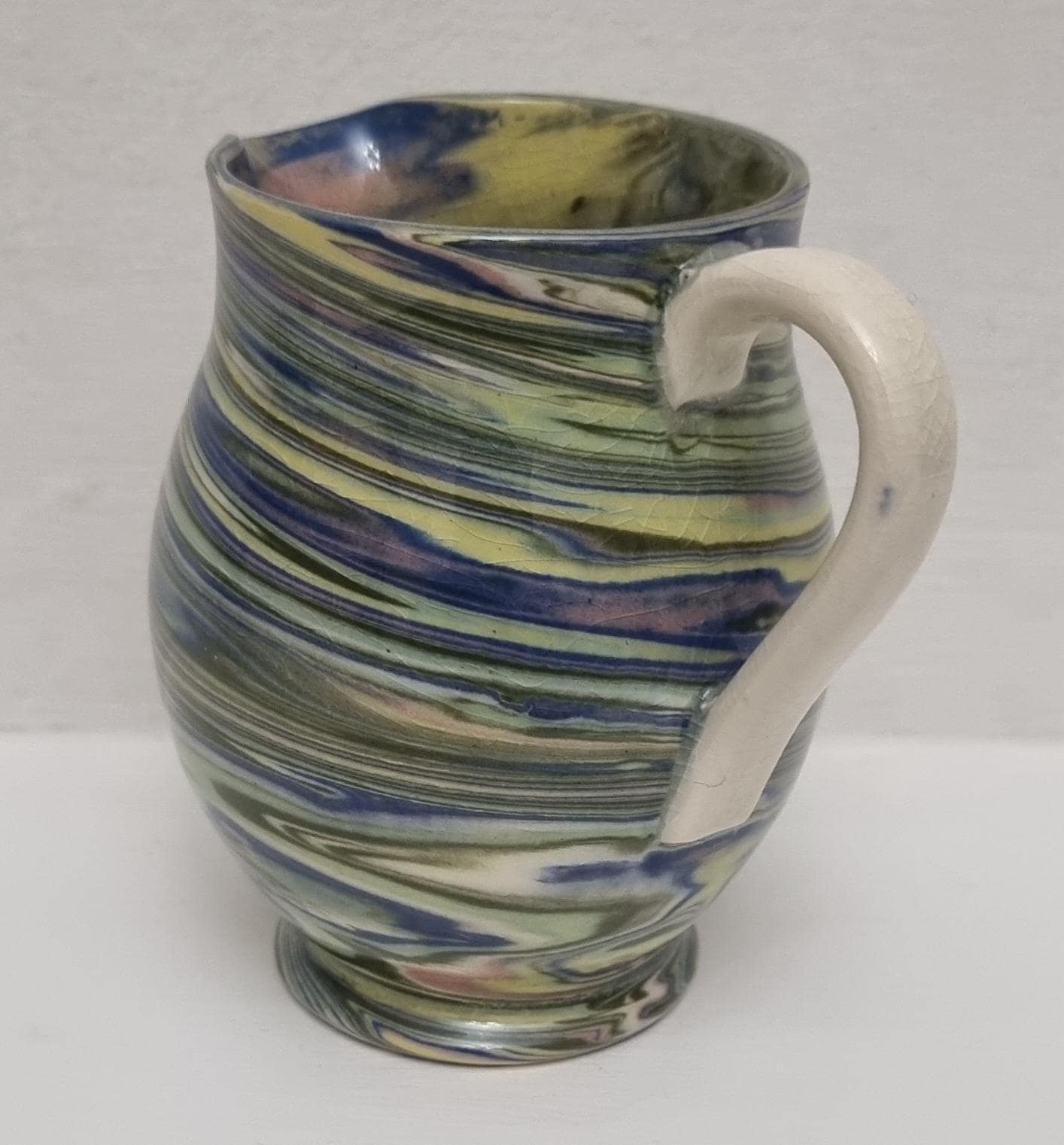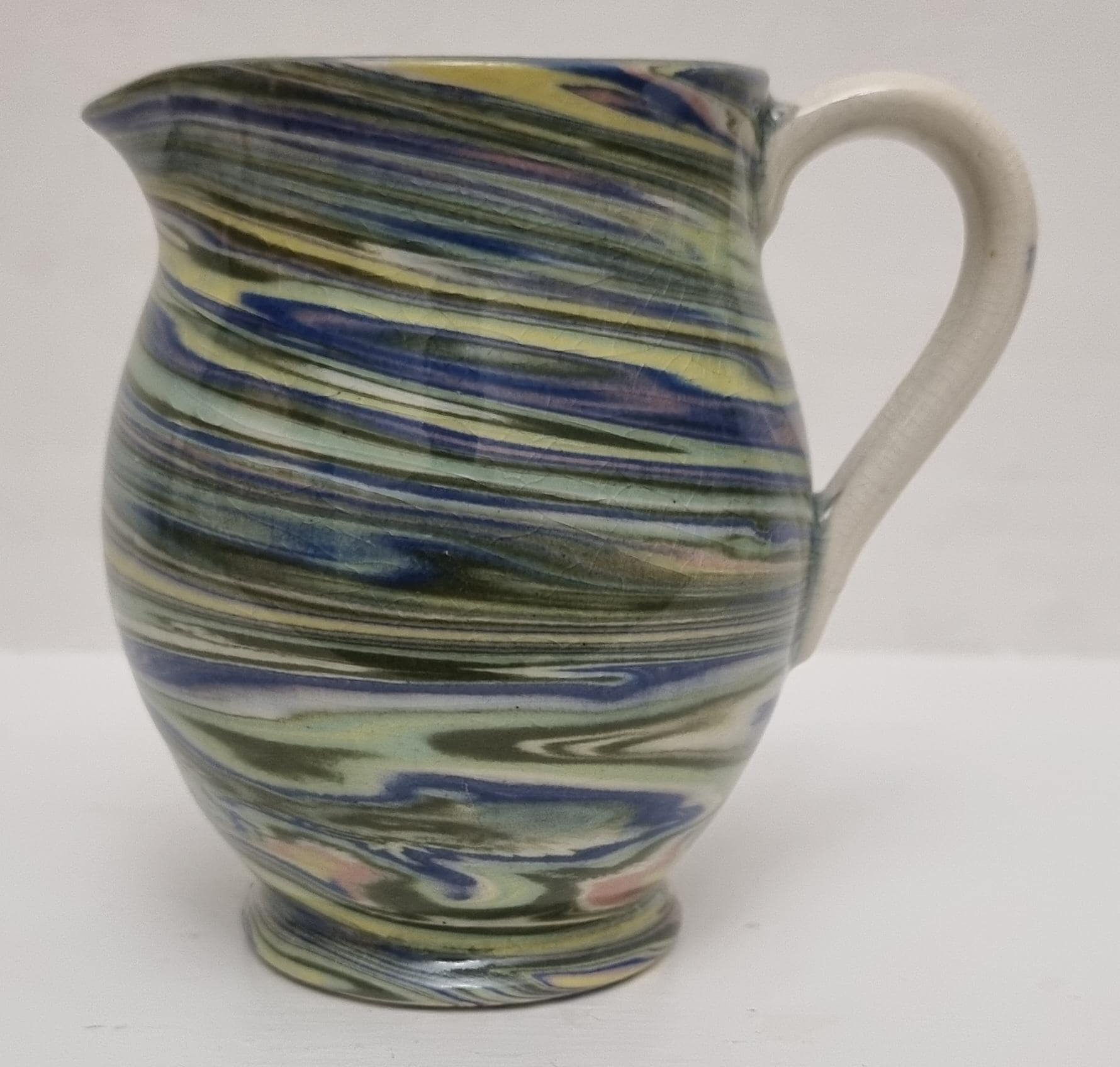Cute little swirl patterned creamer jug, from Alton Towers studio pottery in Staffordshire, England. The jug features a distinctive marbled or "swirl" pattern created by mixing different coloured clays, a technique known as agateware or nerikomi. Can also be used as a same decorative vase.