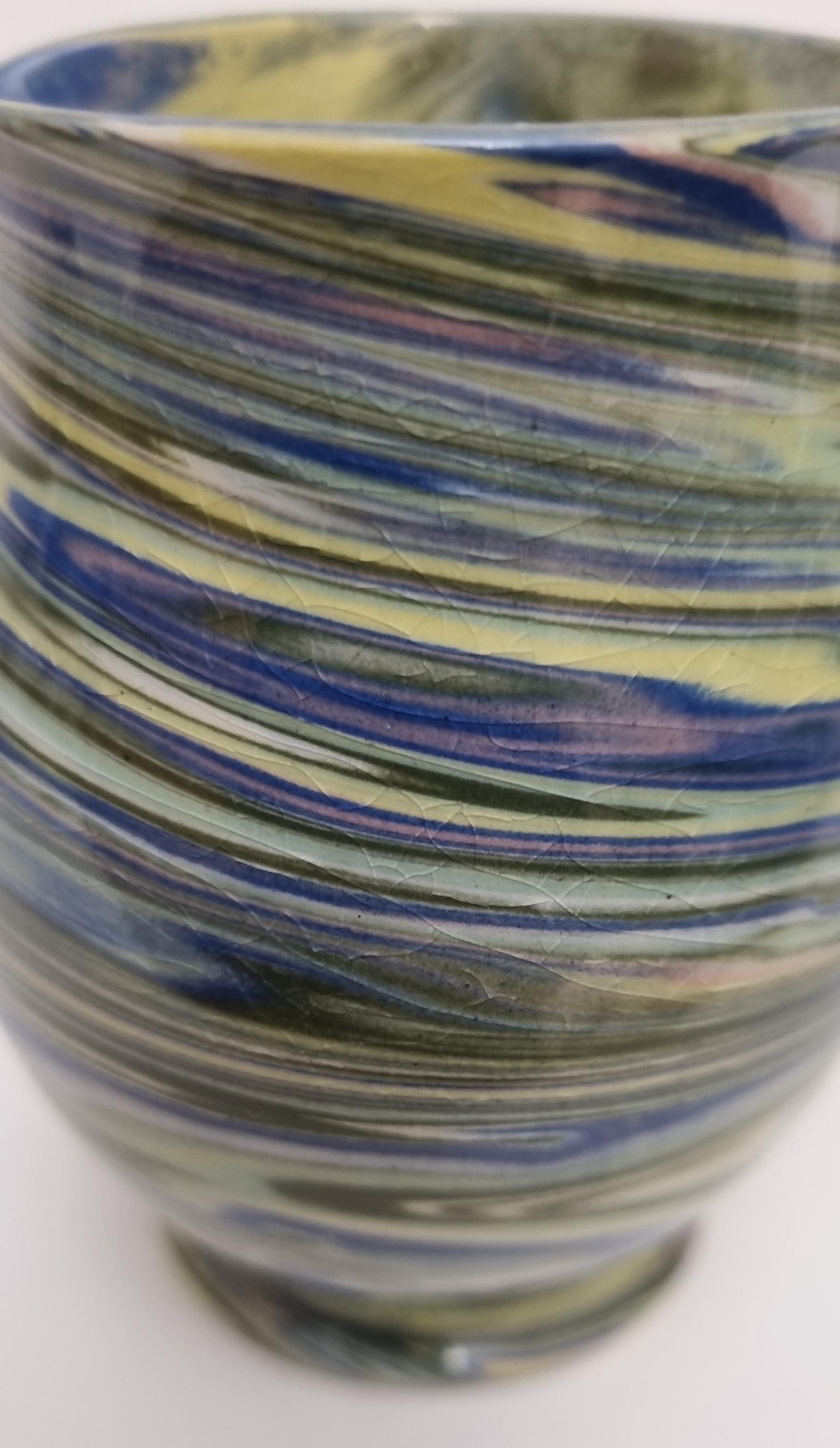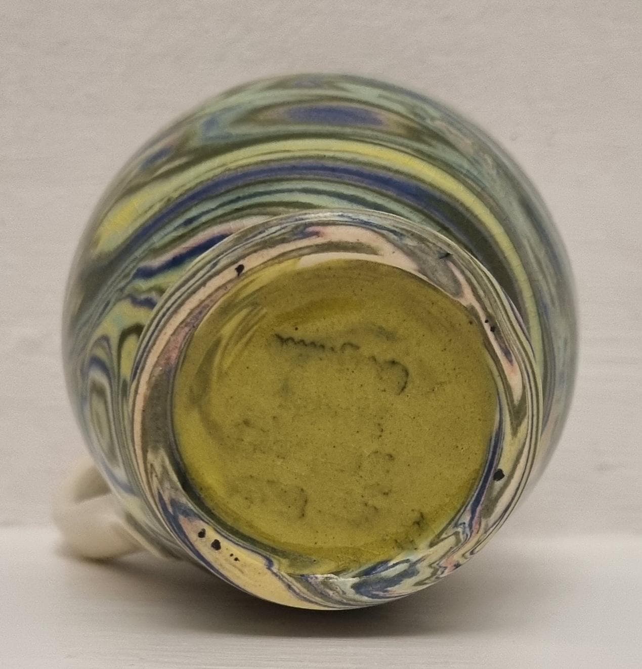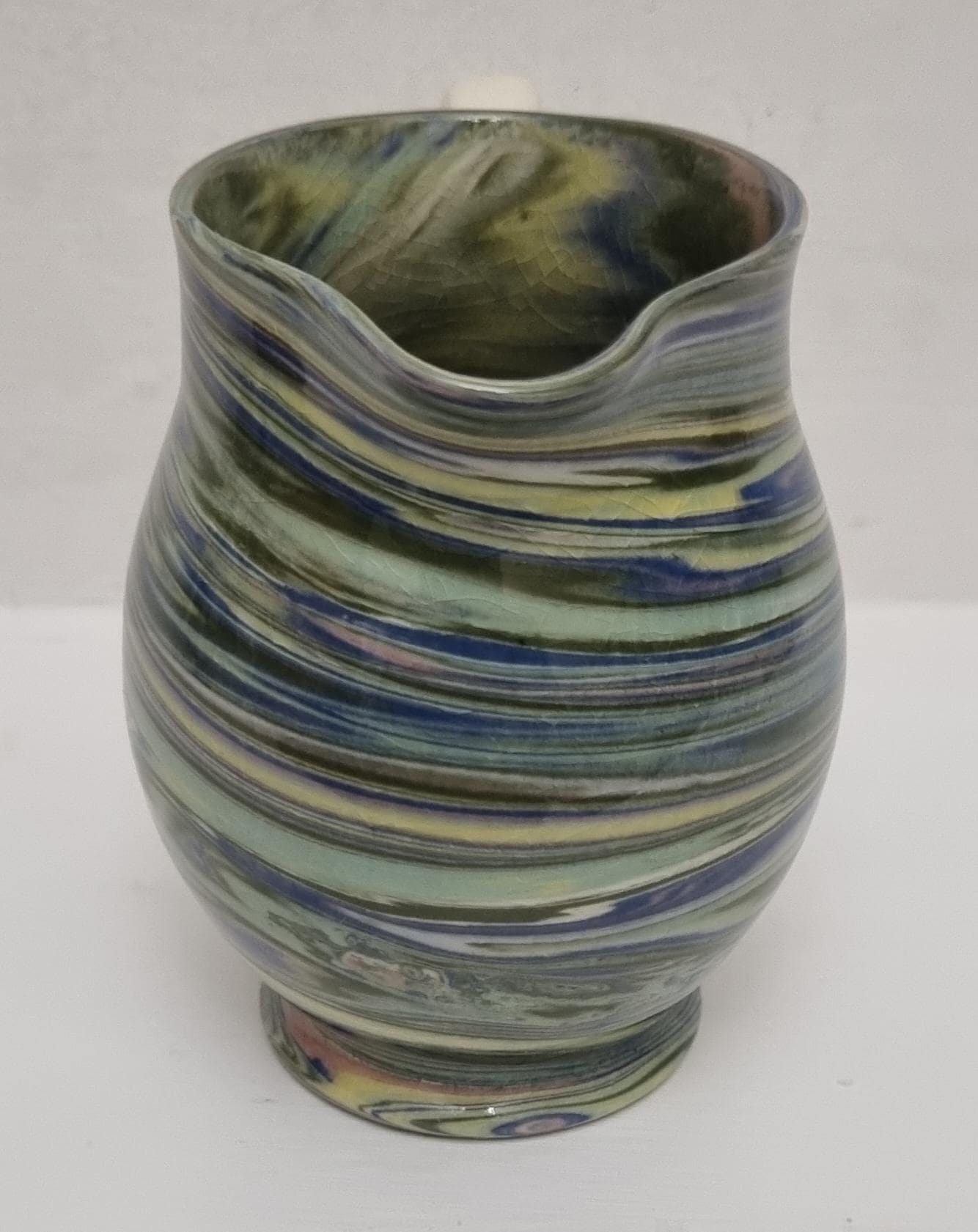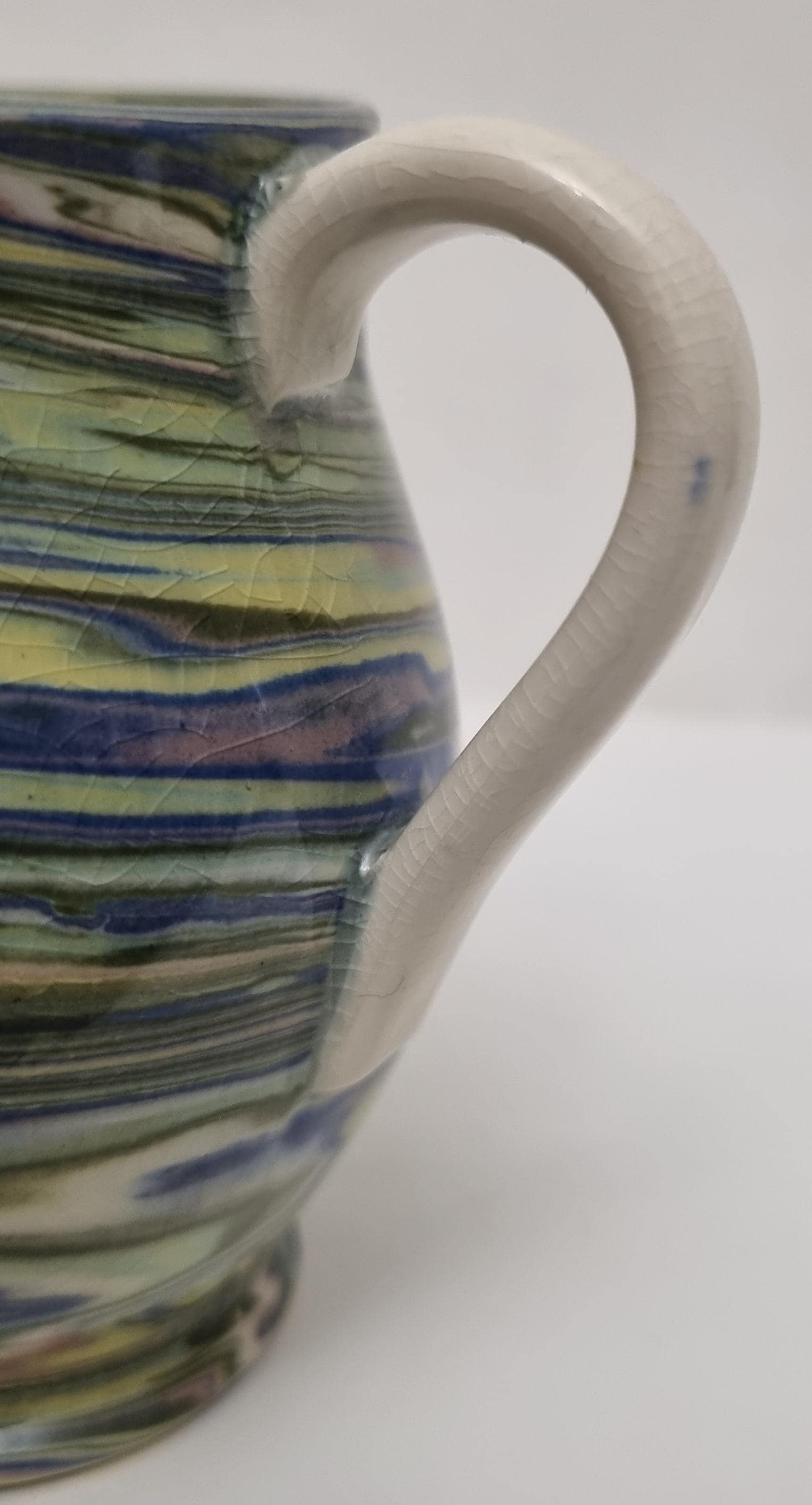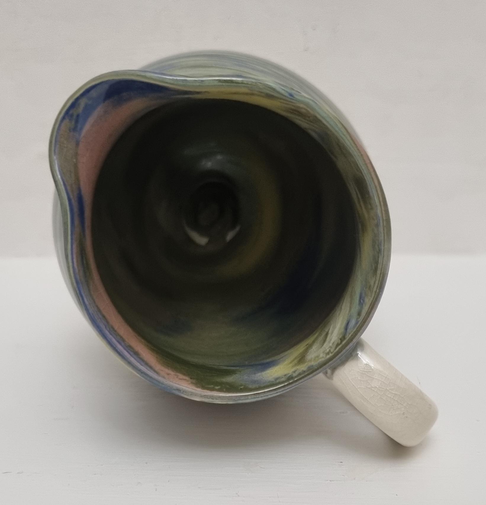 Cute little swirl patterned creamer jug, from Alton Towers studio pottery in Staffordshire, England. The jug features a distinctive marbled or "swirl" pattern created by mixing different coloured clays, a technique known as agateware or nerikomi. Can also be used as a same decorative vase.