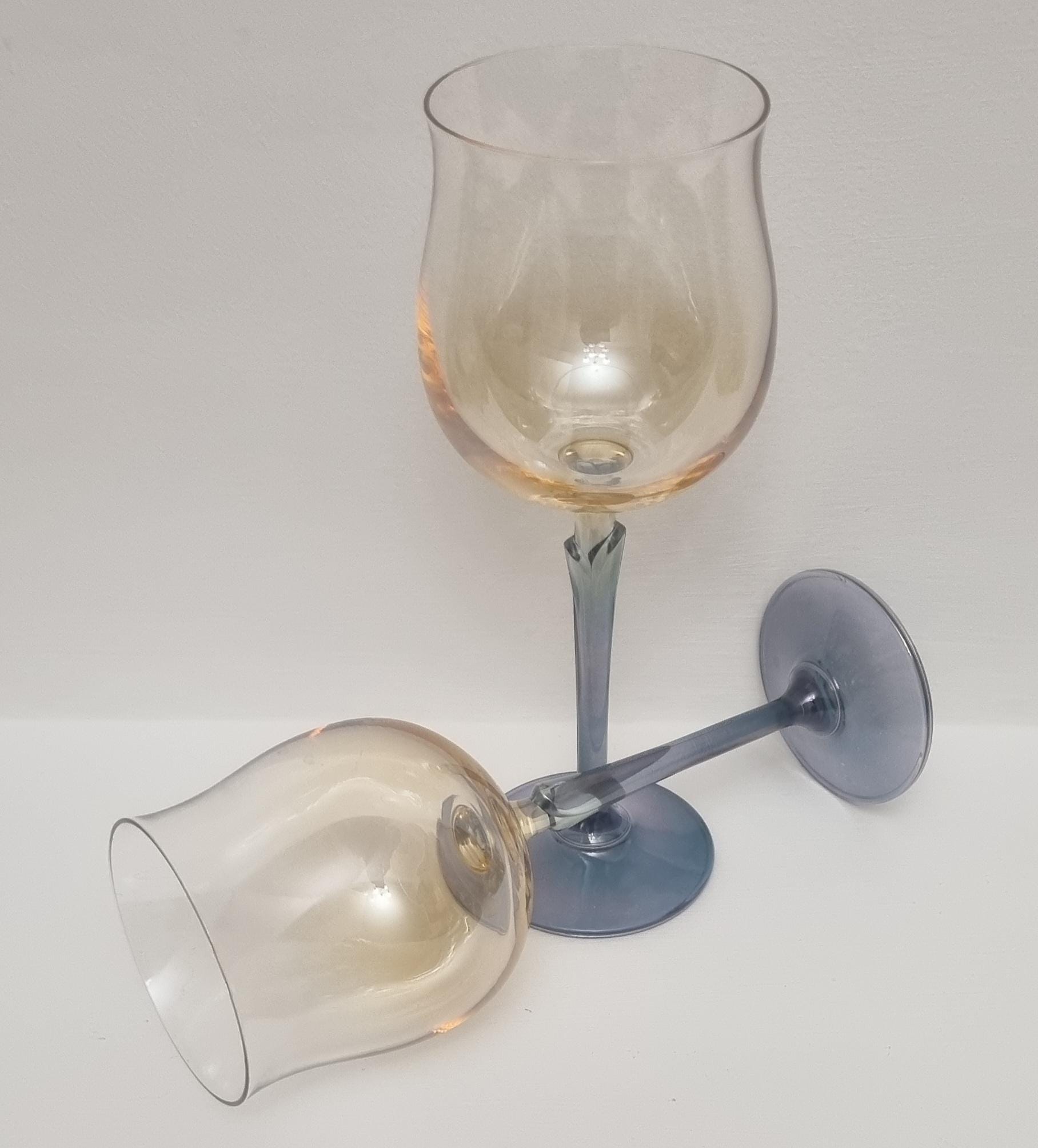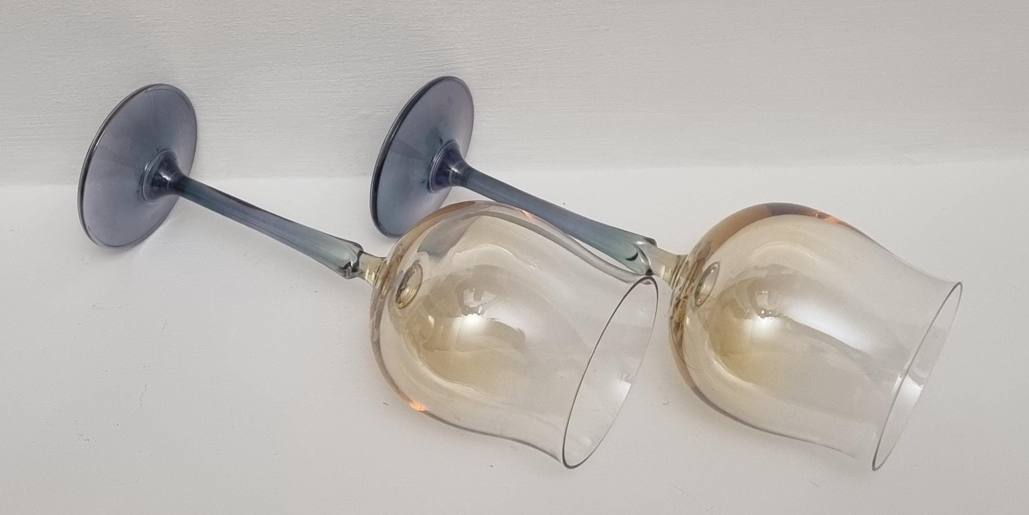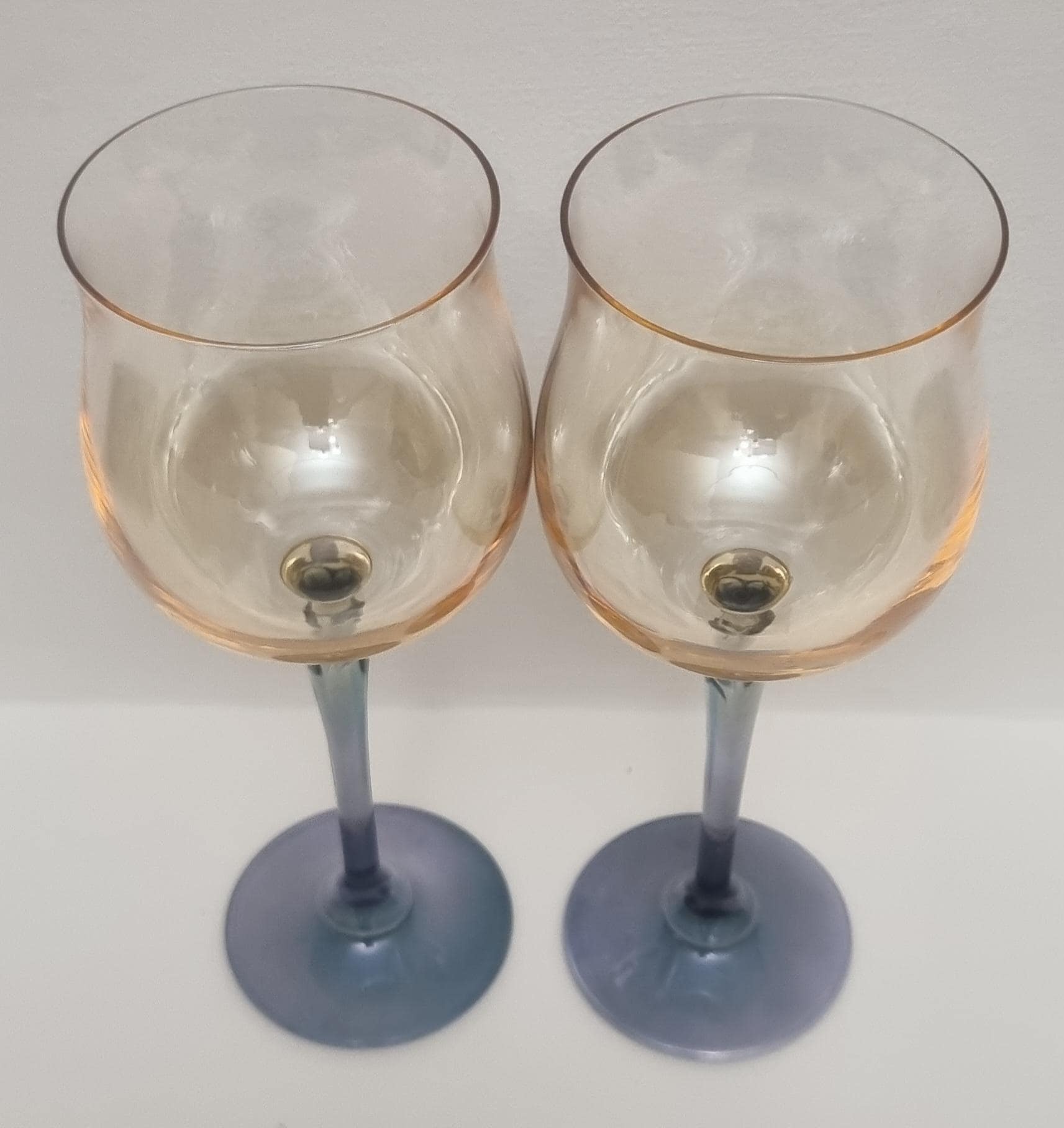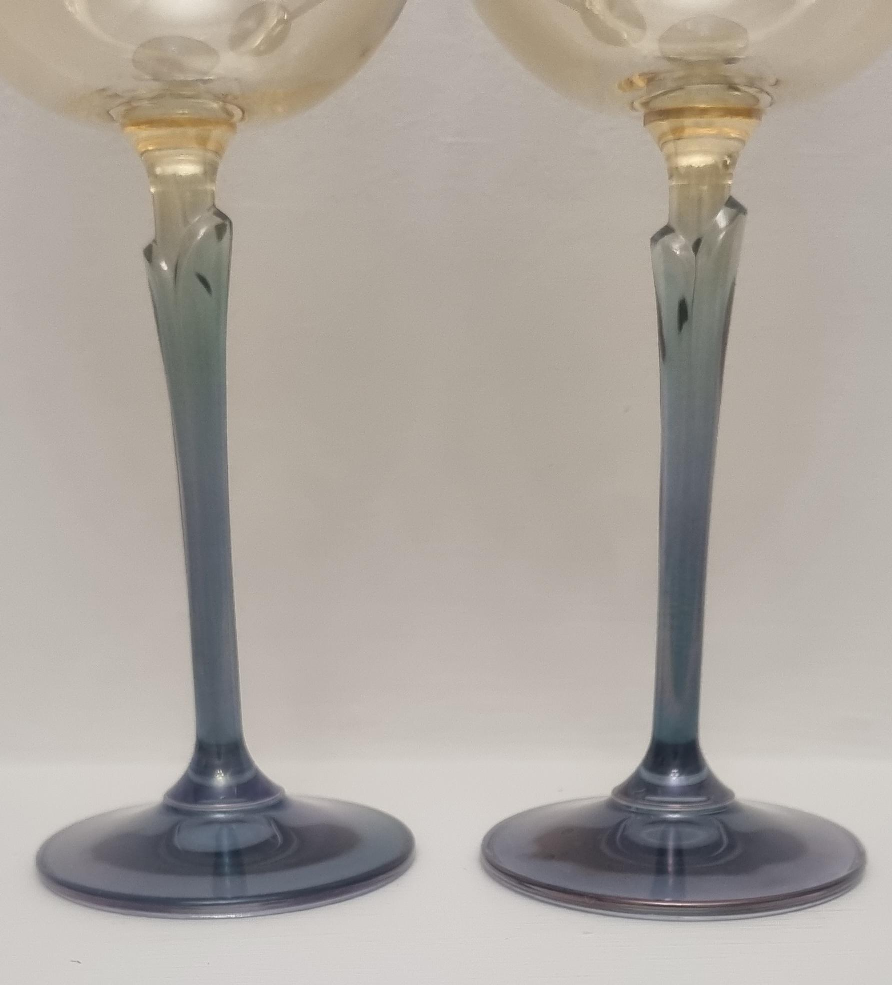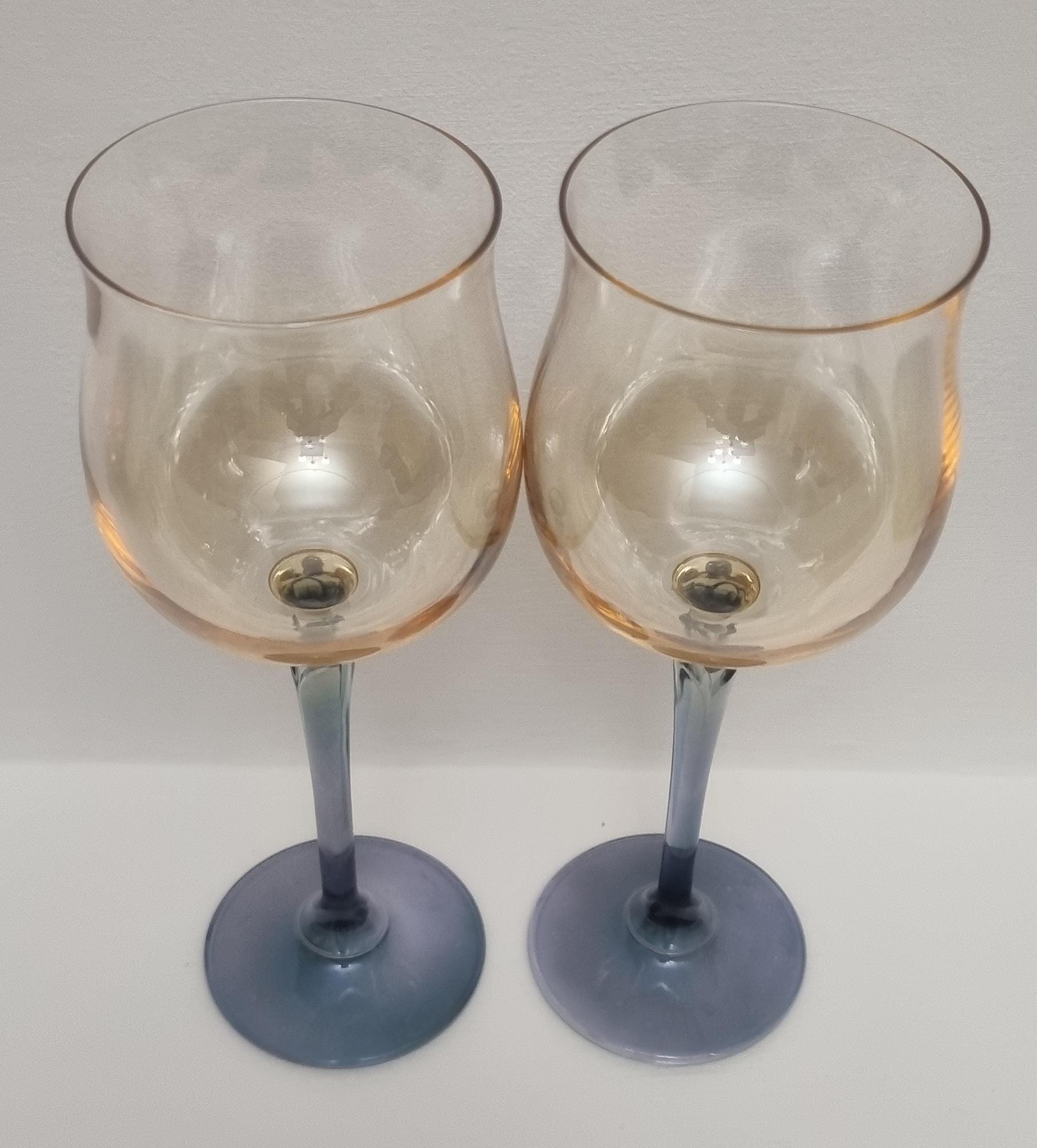 A set of 2 stylish Czech Colony Brigitte wine glasses. Featuring a tulip-shaped bowl with an iridescent pink/amber-tinted finish. They are quite elegant with long slender green coloured/iridescent stems.