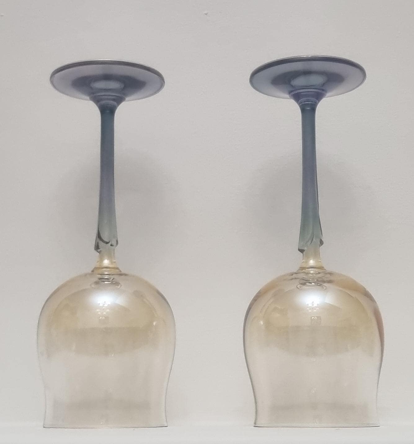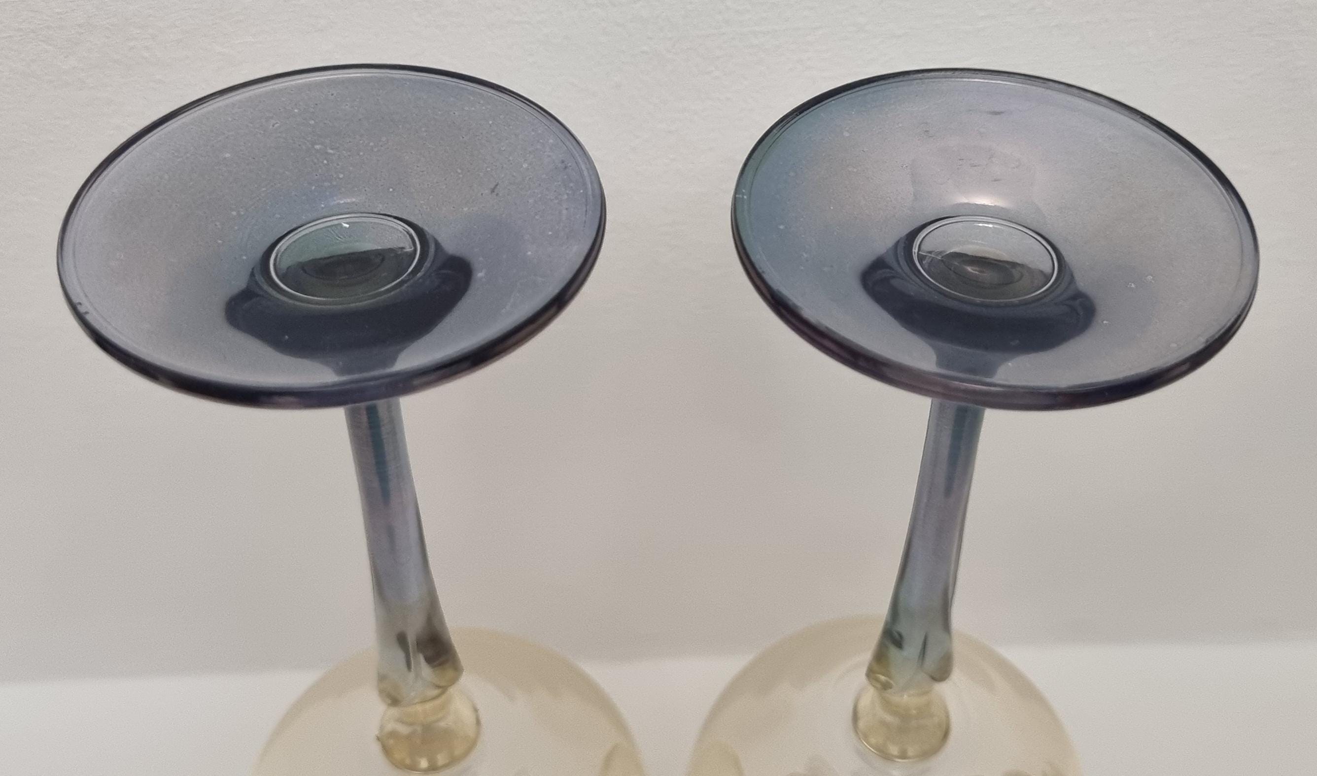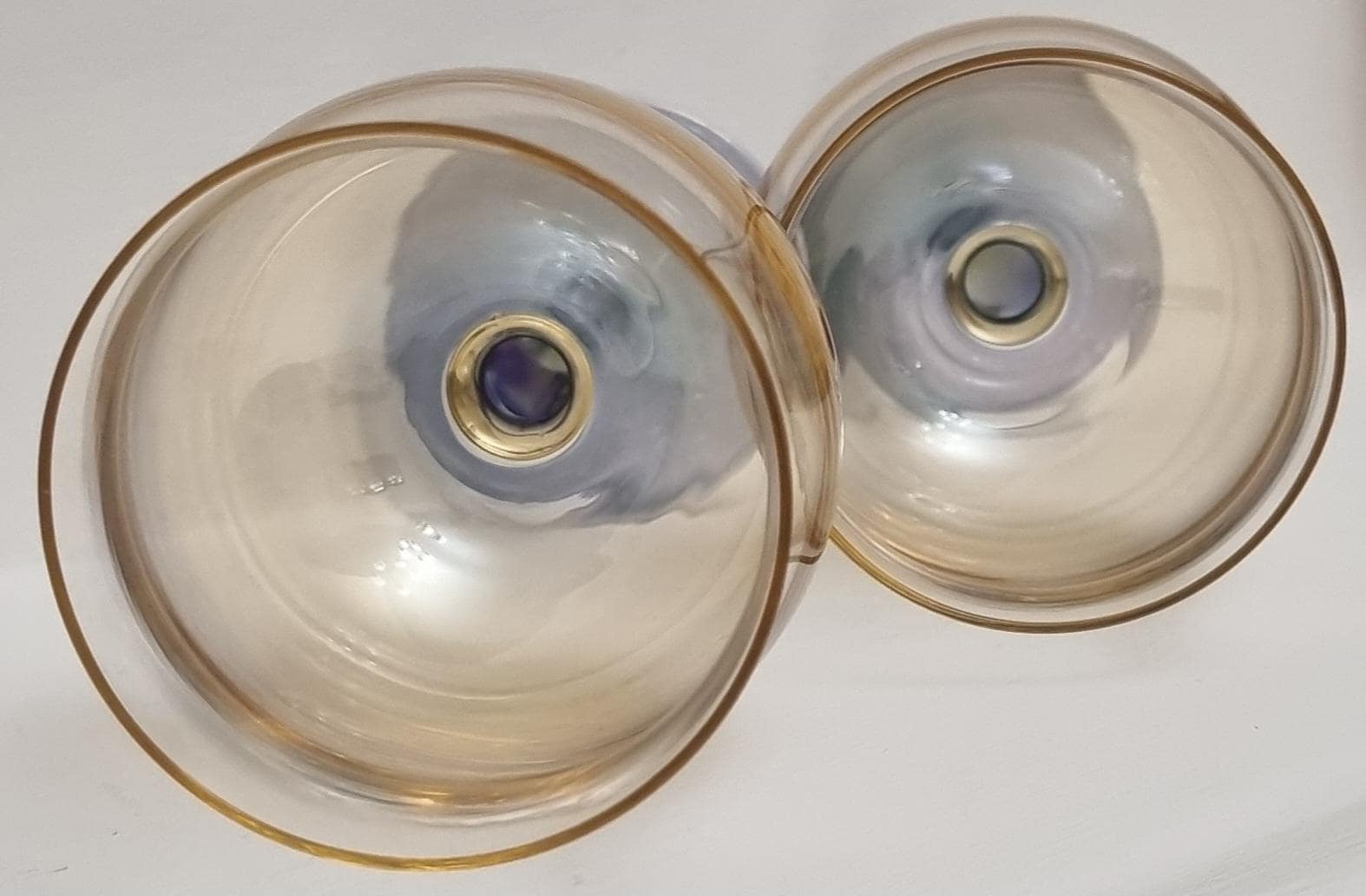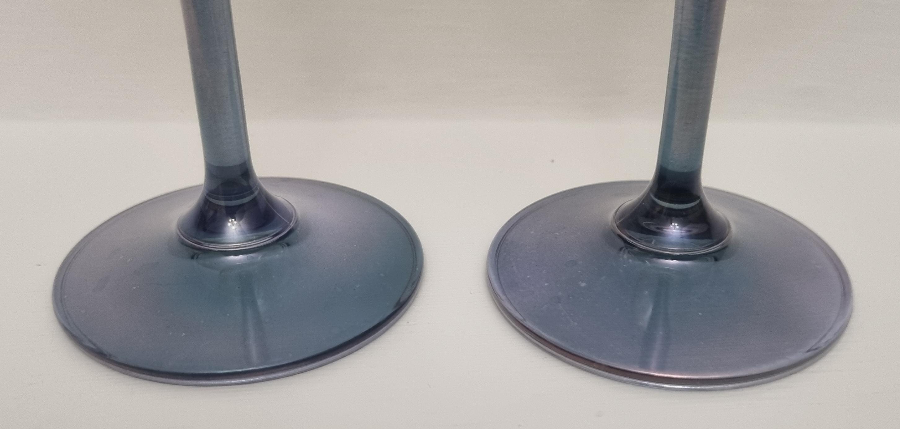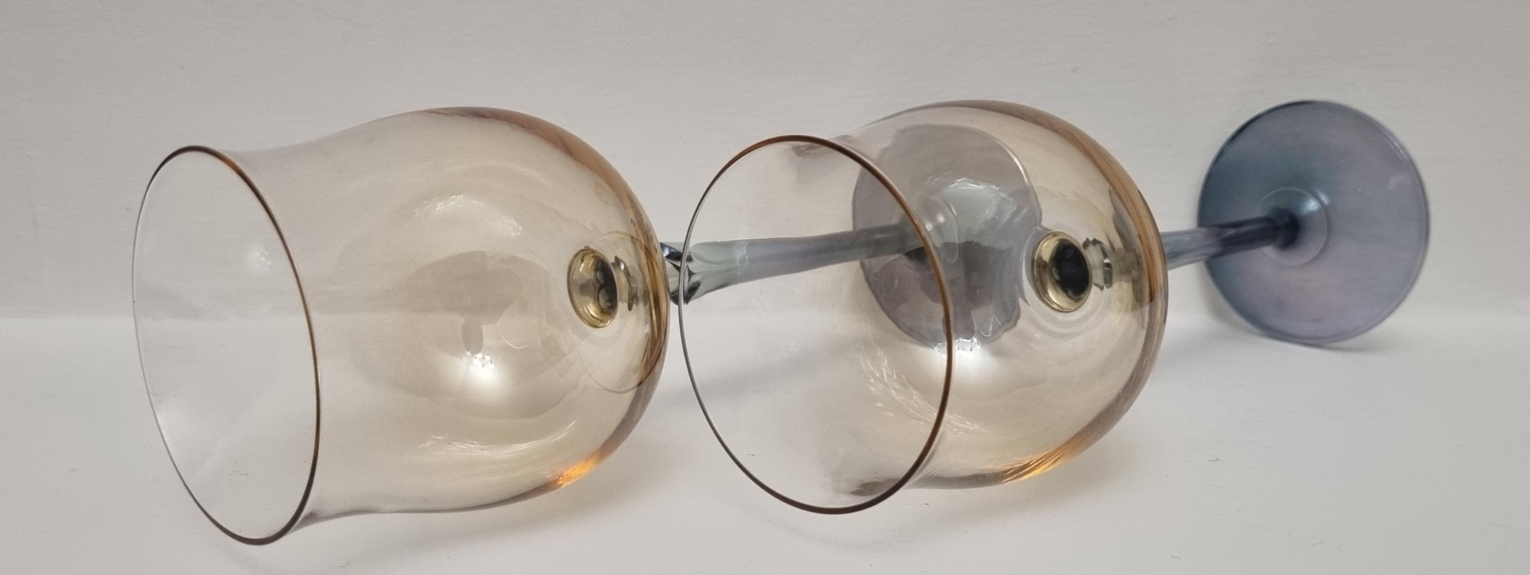 A set of 2 stylish Czech Colony Brigitte wine glasses. Featuring a tulip-shaped bowl with an iridescent pink/amber-tinted finish. They are quite elegant with long slender green coloured/iridescent stems.