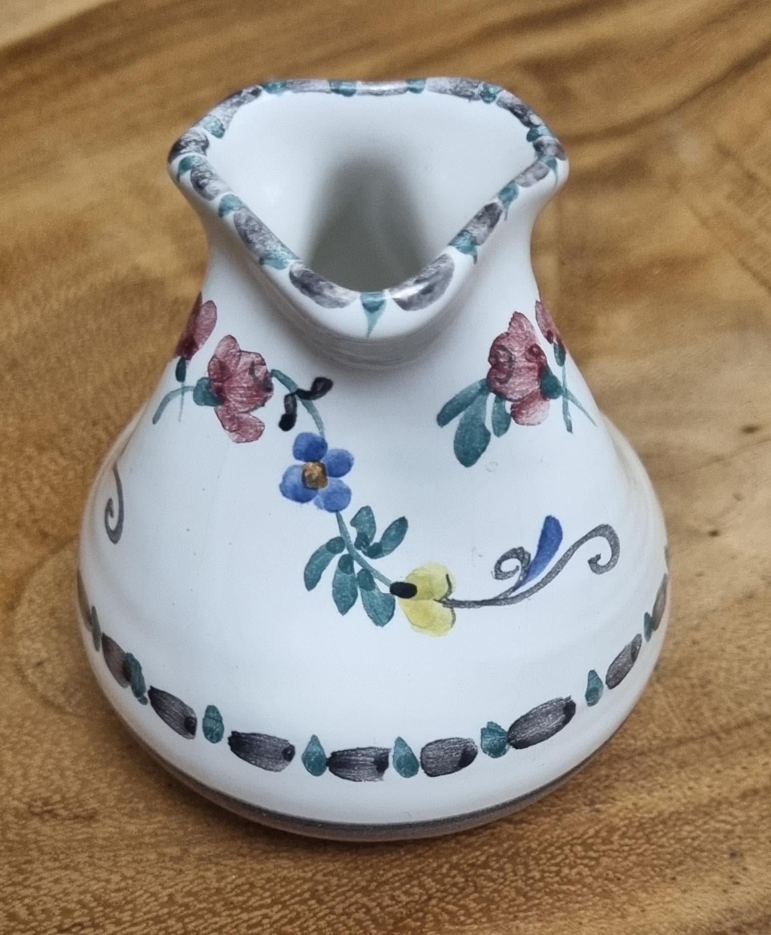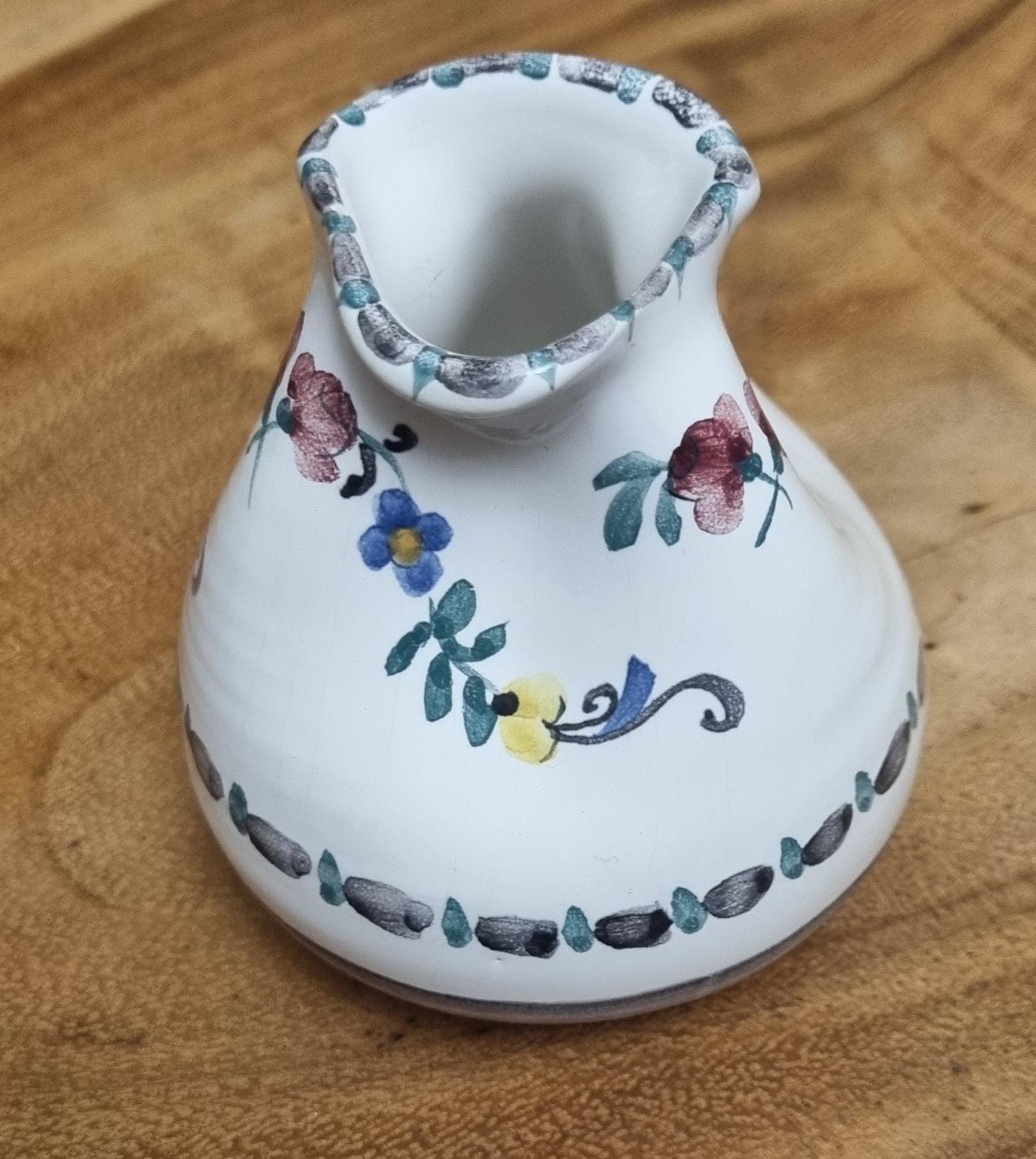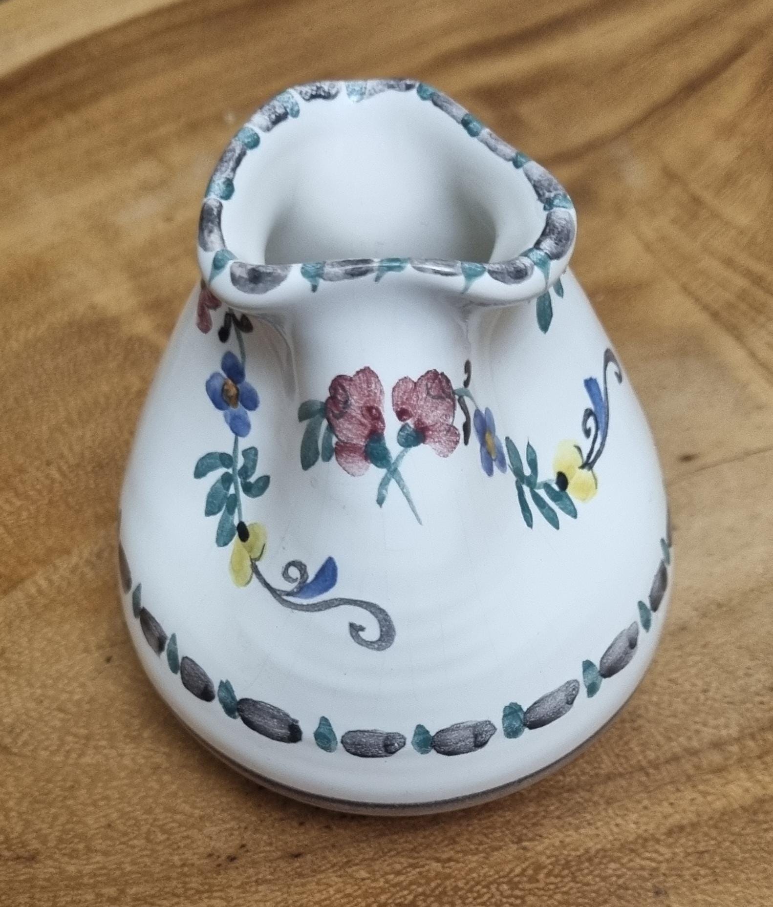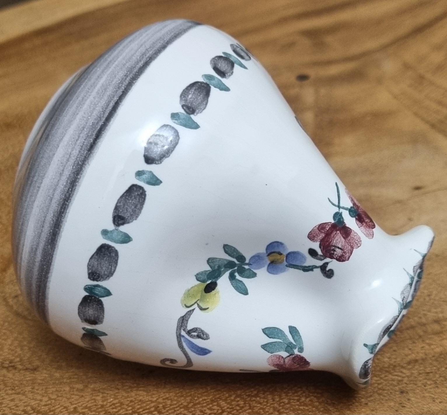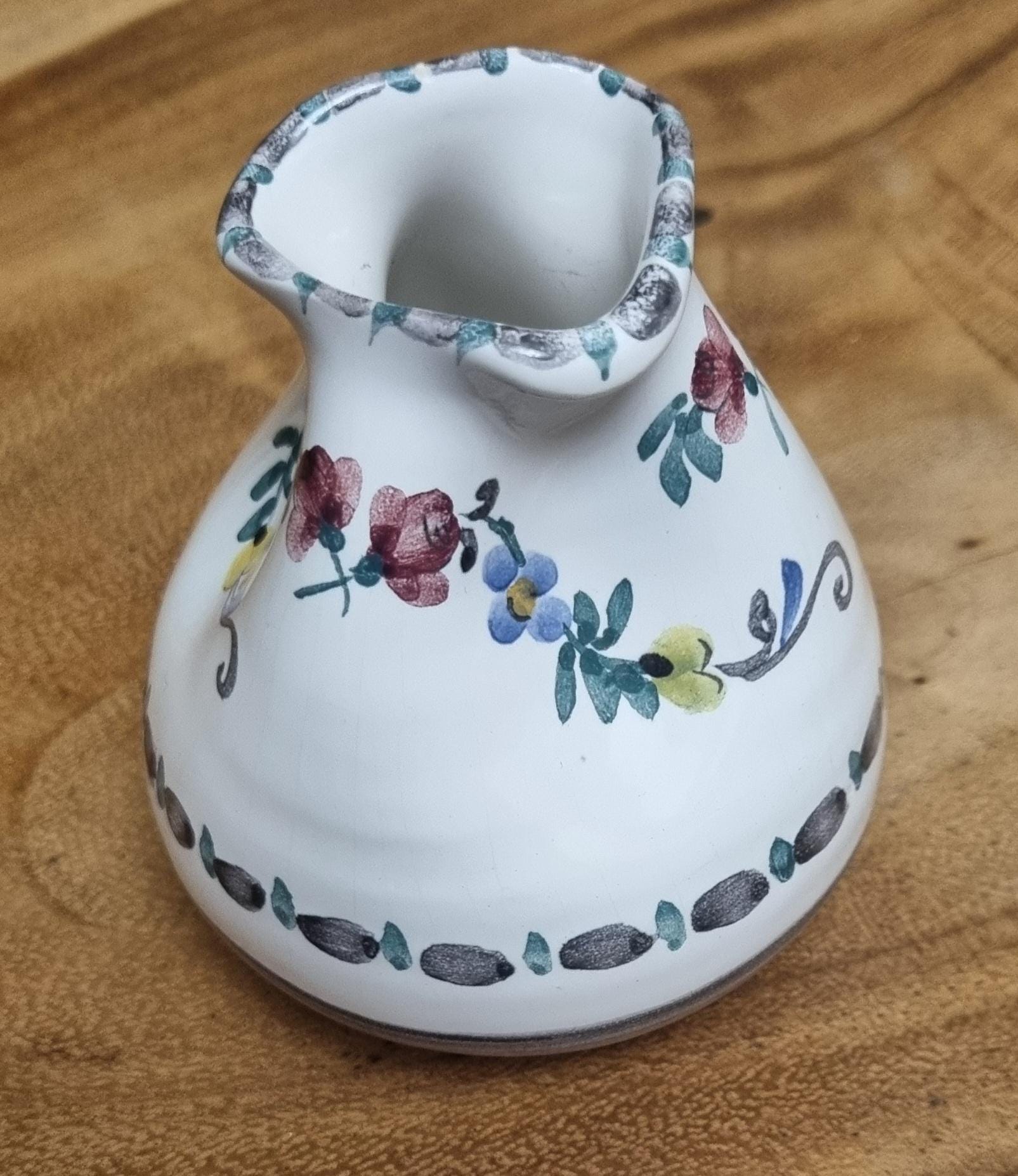 Highly sought after Art Nouveau Gmundner Keramik 3 spout floral creamer or milk pitcher from Austria and designed by Michael Powolny. This hand-painted ceramic piece features a traditional floral design on a white glazed background.