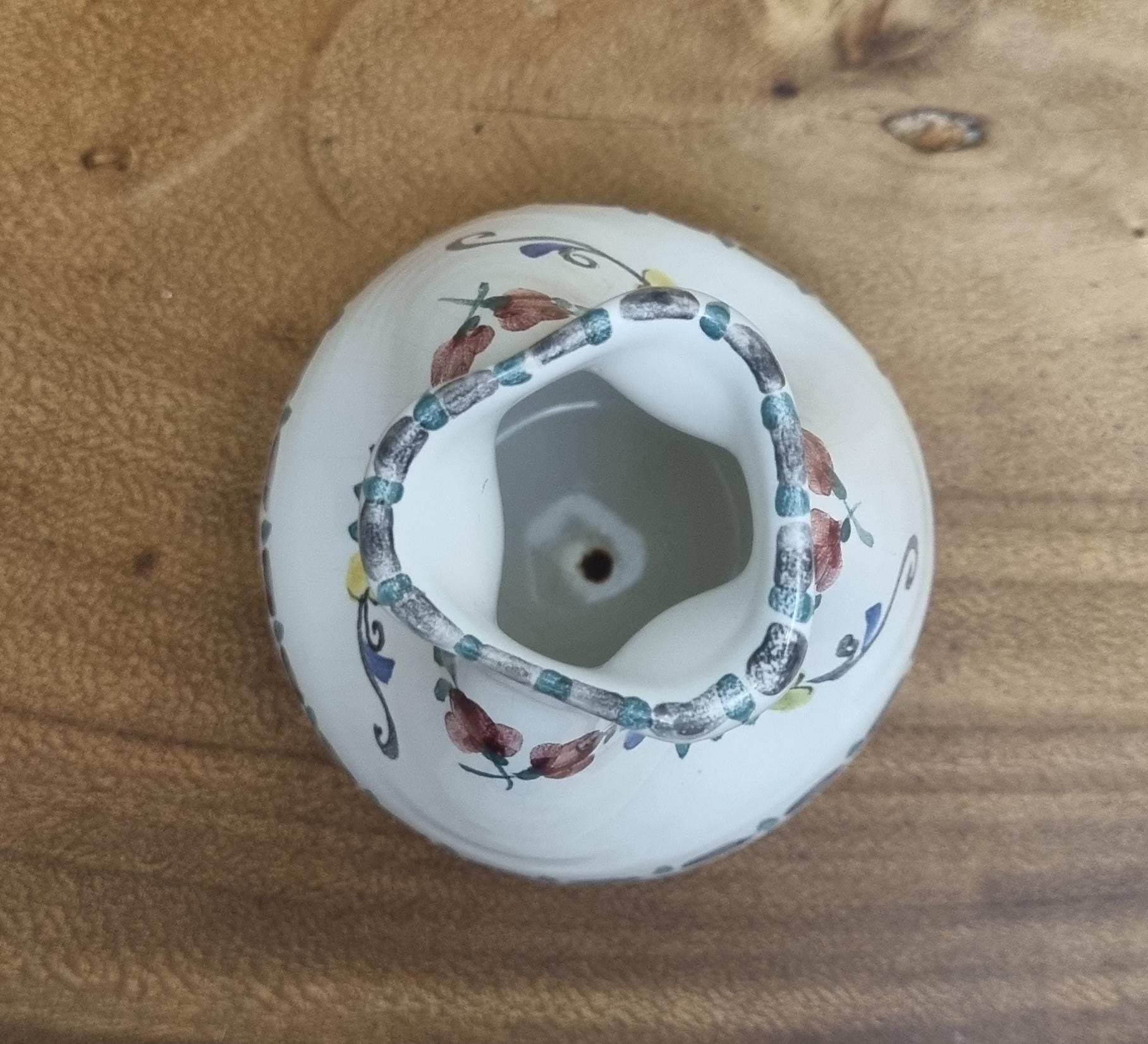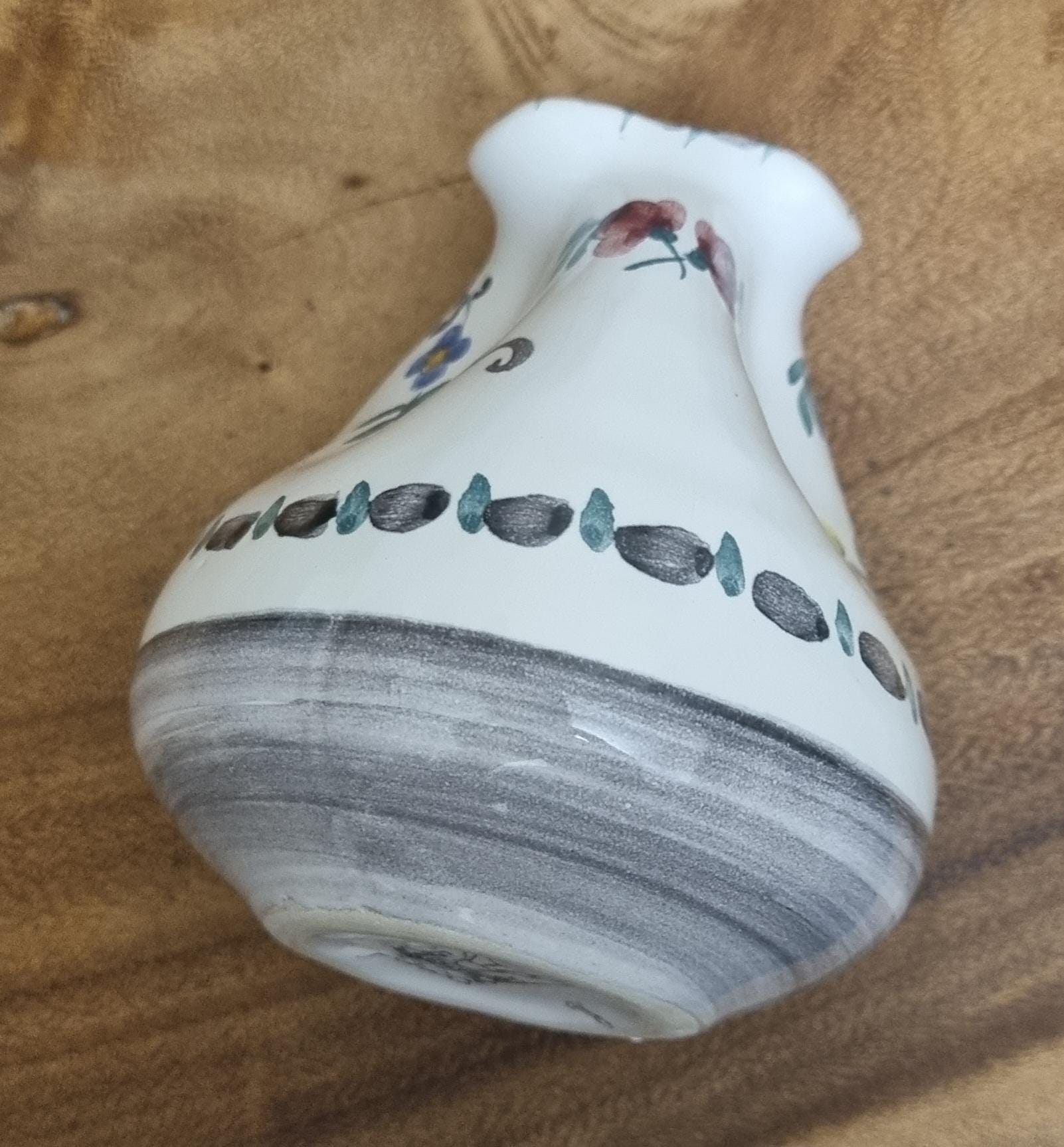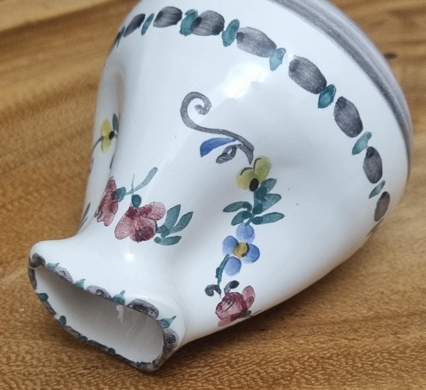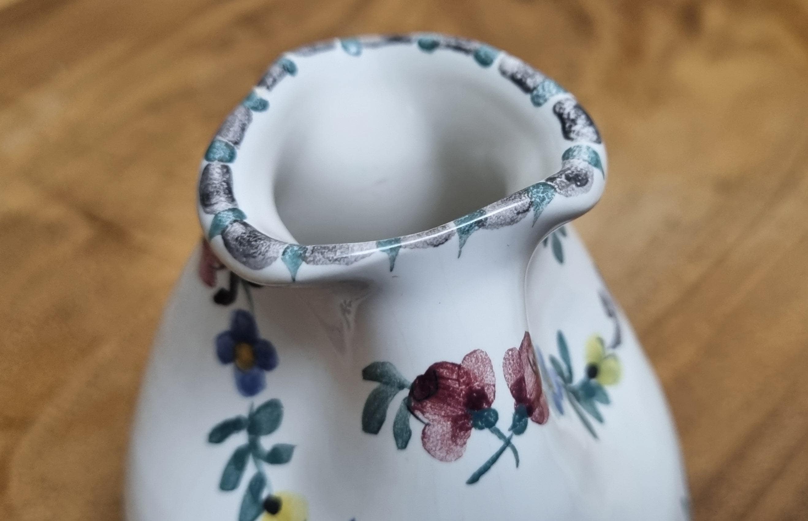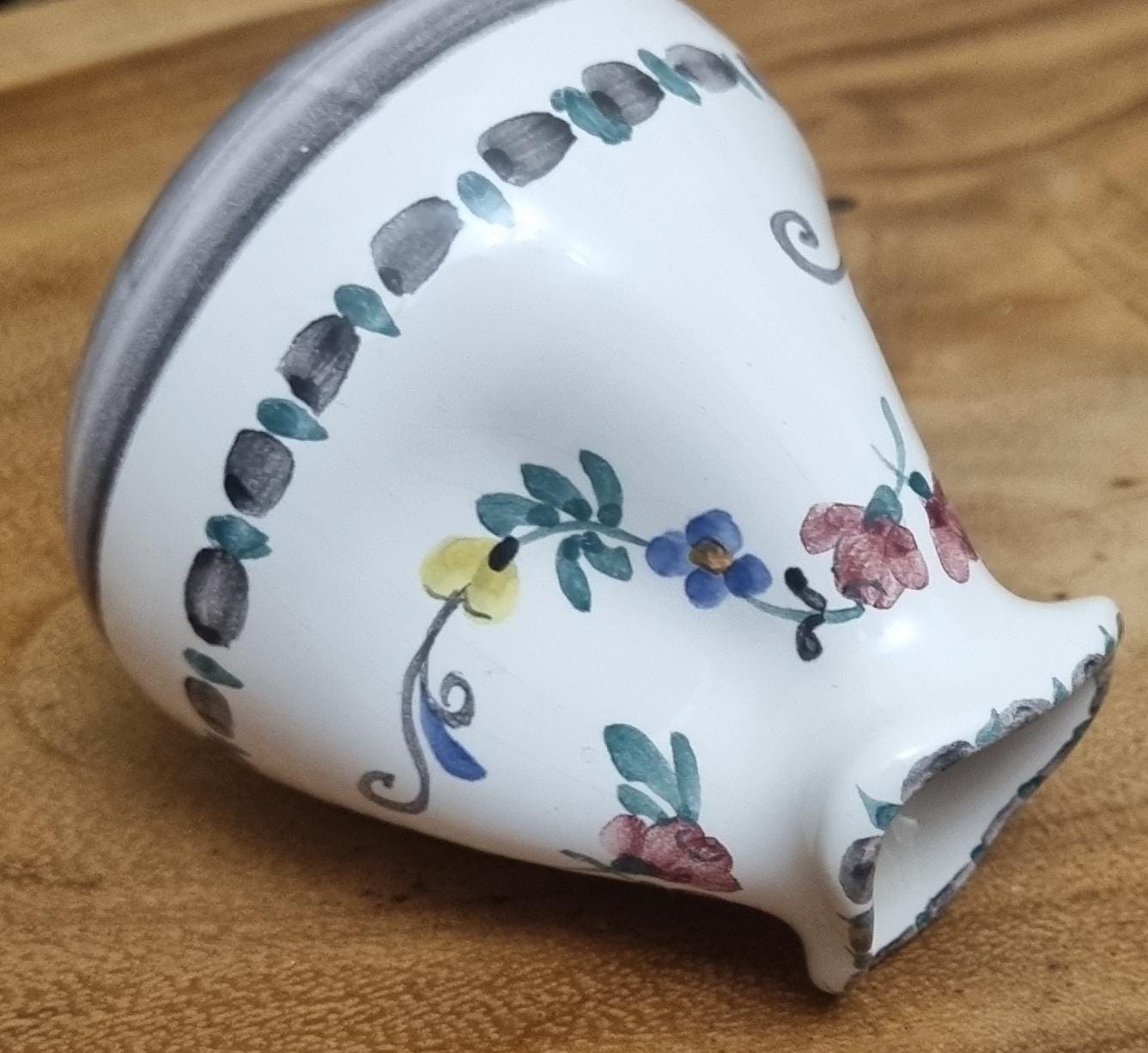 Highly sought after Art Nouveau Gmundner Keramik 3 spout floral creamer or milk pitcher from Austria and designed by Michael Powolny. This hand-painted ceramic piece features a traditional floral design on a white glazed background.