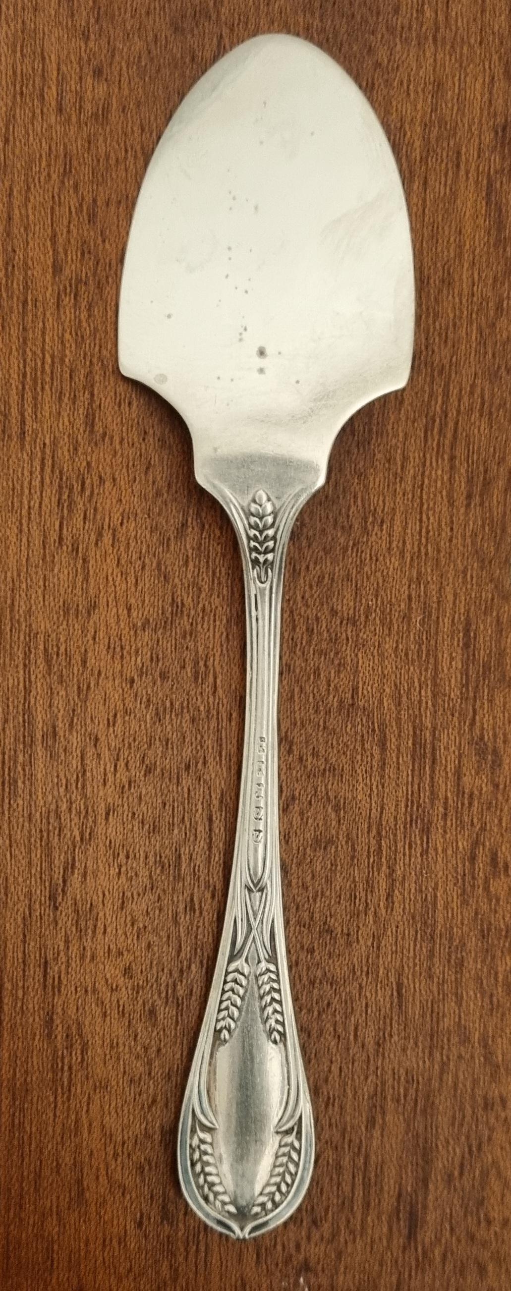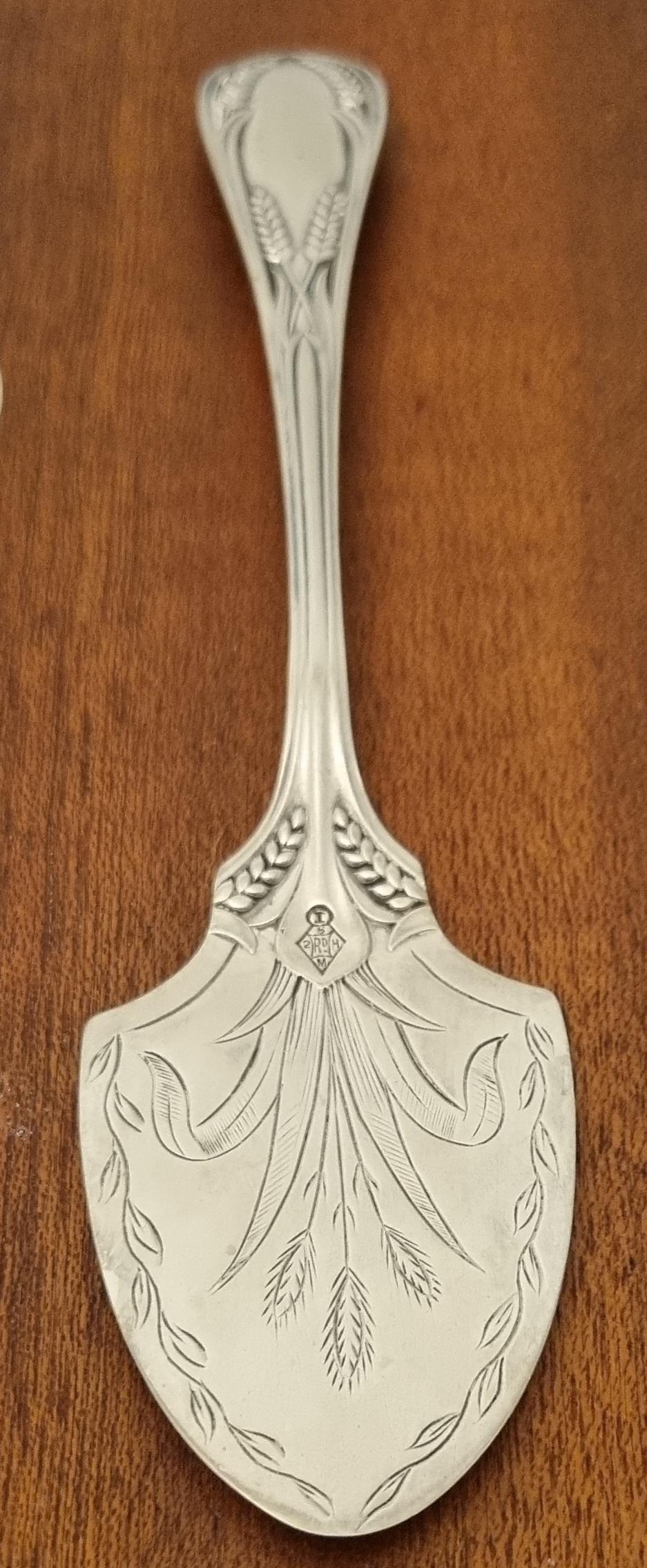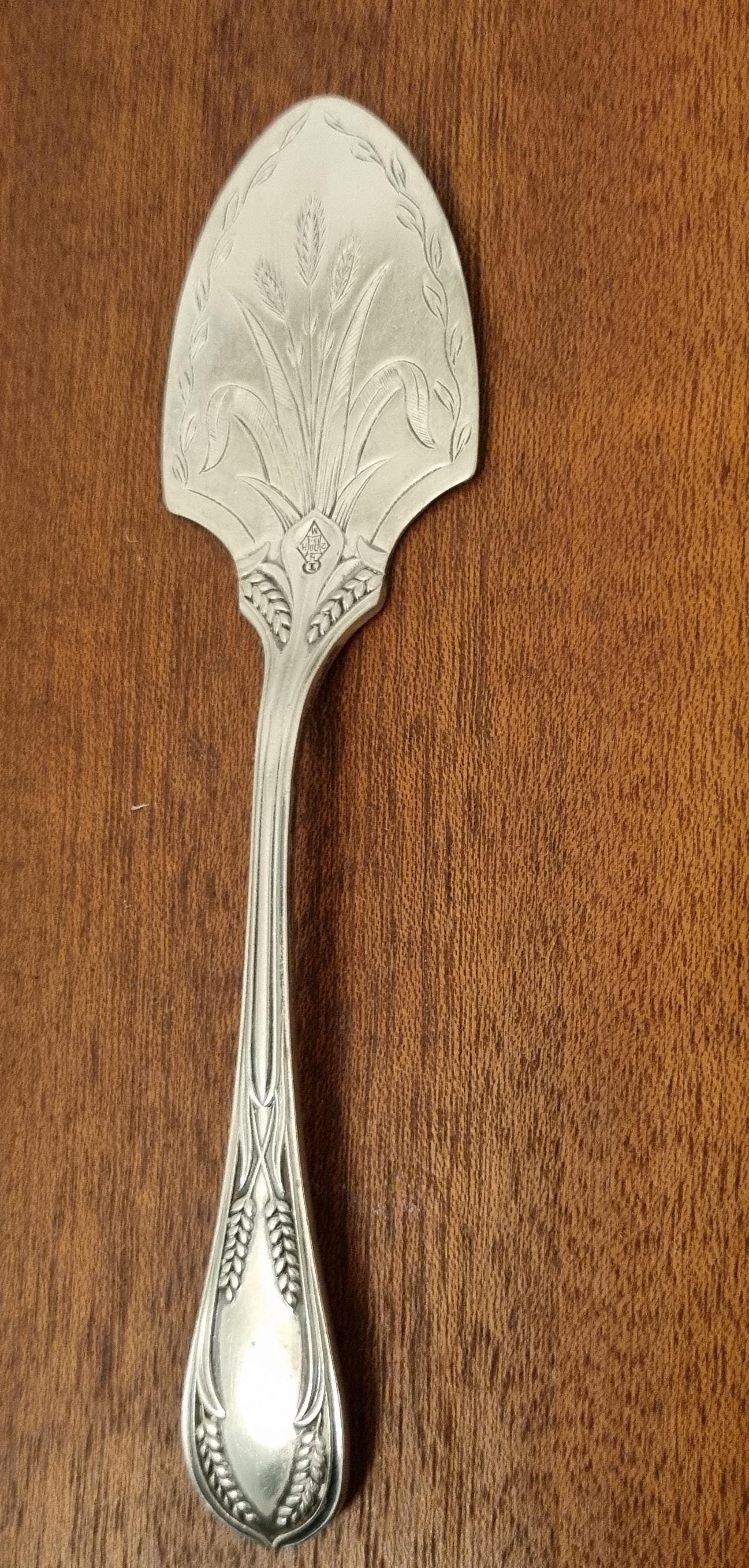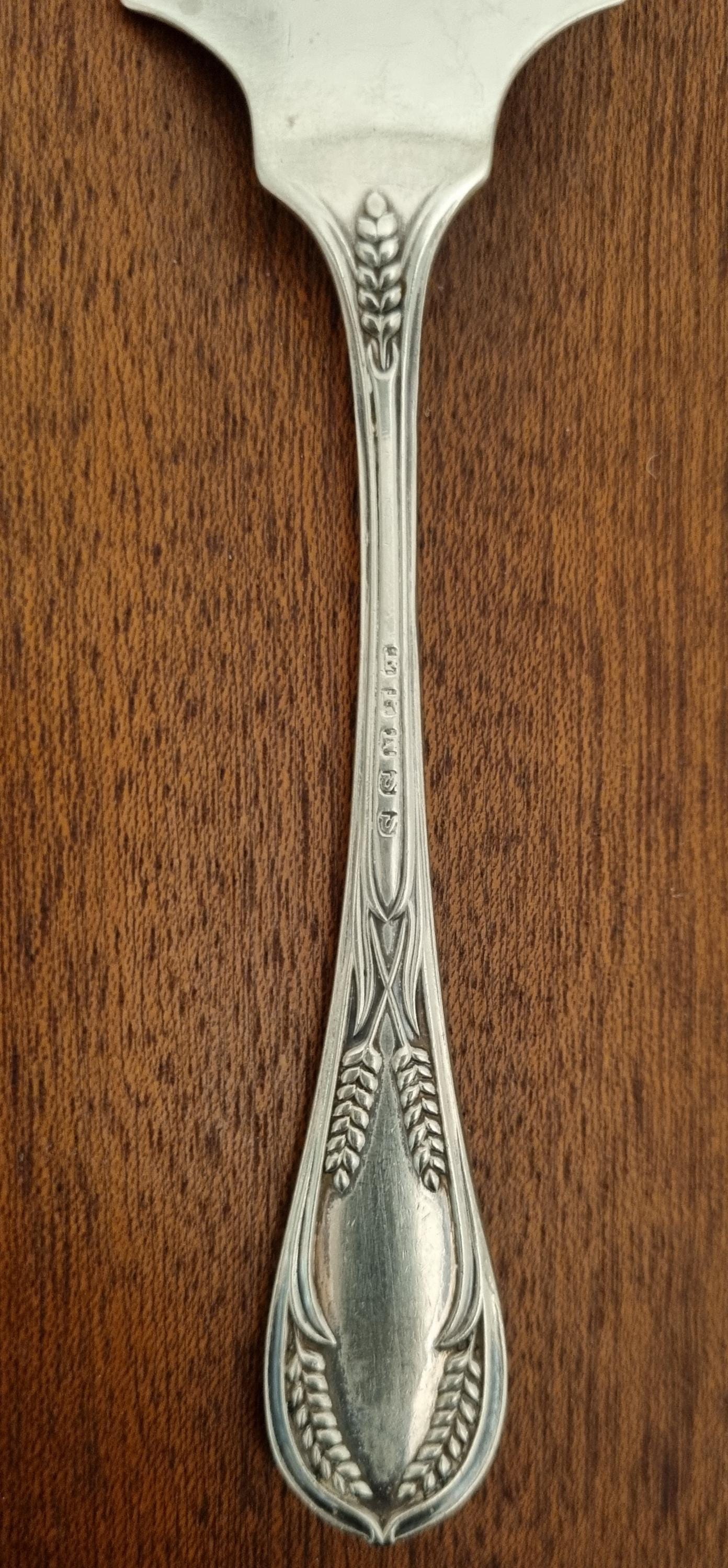 19th century antique silver-plated (EPNS) fish slice, pie or cake server, often featuring decorative engraving like wheat patterns or scrollwork. Designed to be used during formal dining.
