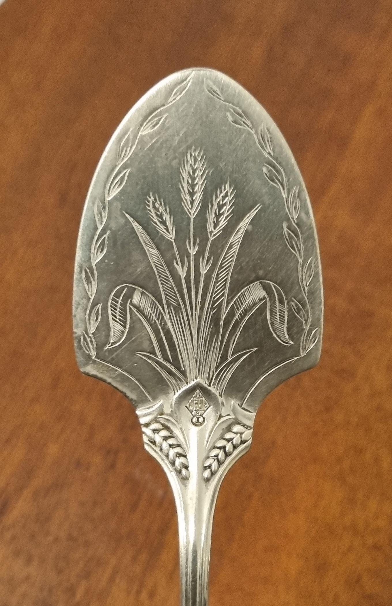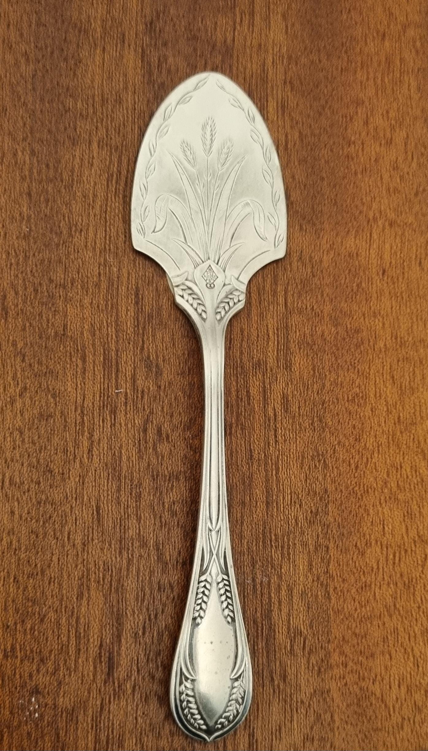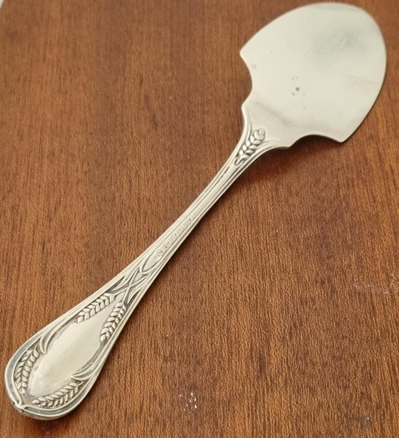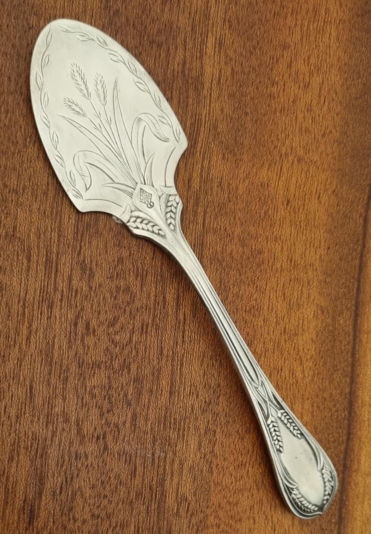 19th century antique silver-plated (EPNS) fish slice, pie or cake server, often featuring decorative engraving like wheat patterns or scrollwork. Designed to be used during formal dining.