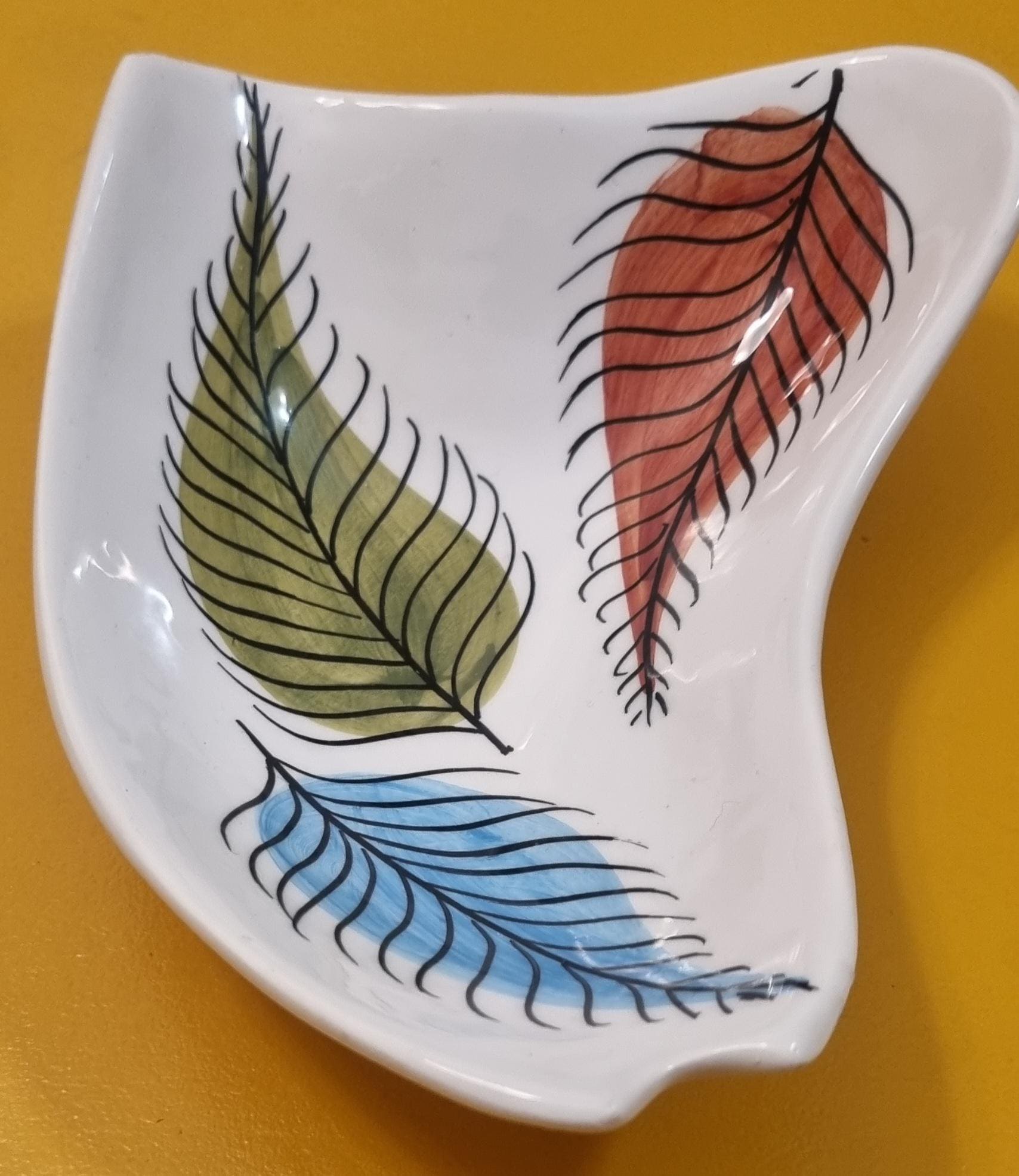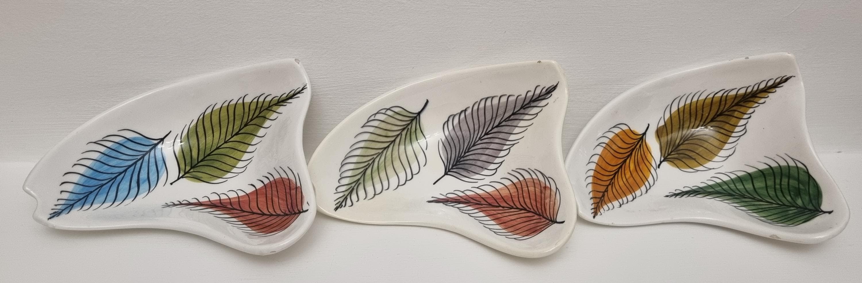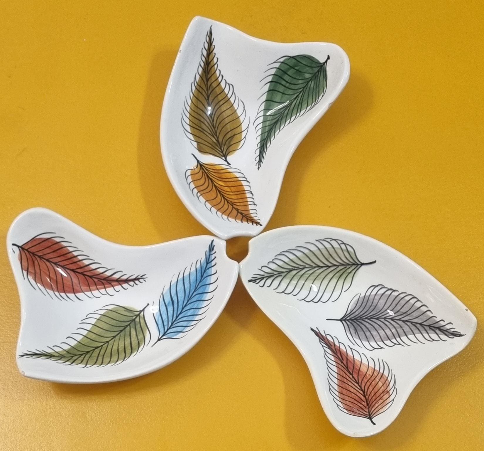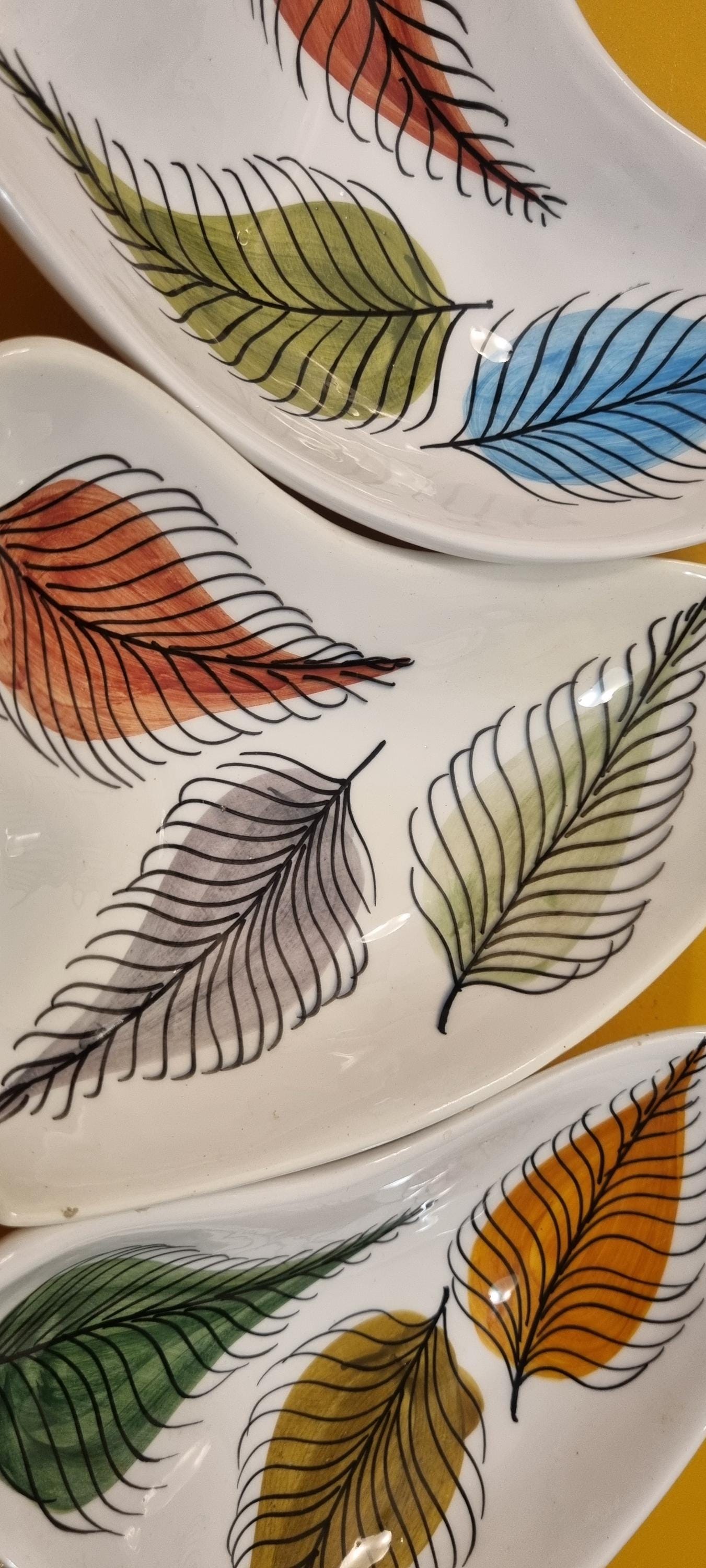 Mid century Italian freeform ceramic serving/snack/dishes/bowls. Wonderfully hand-painted in a colourful feather pattern. Very decorative and collectible and can be used to serve snacks or as display items. Signed and stamped 514 Italy on the base.