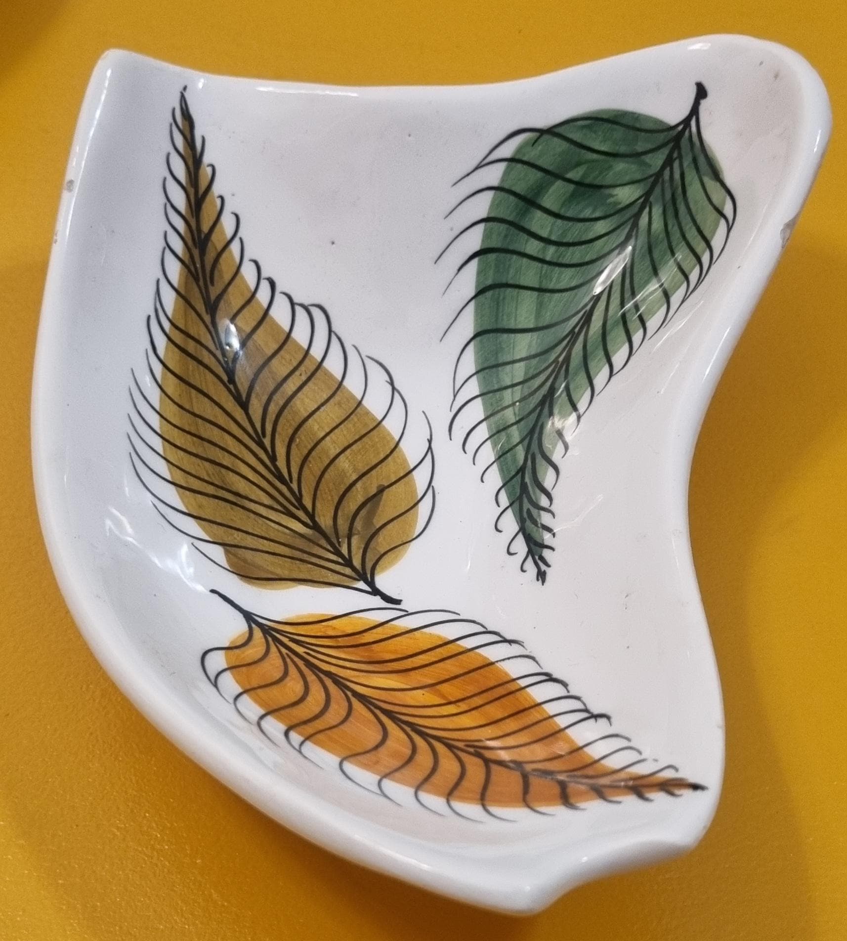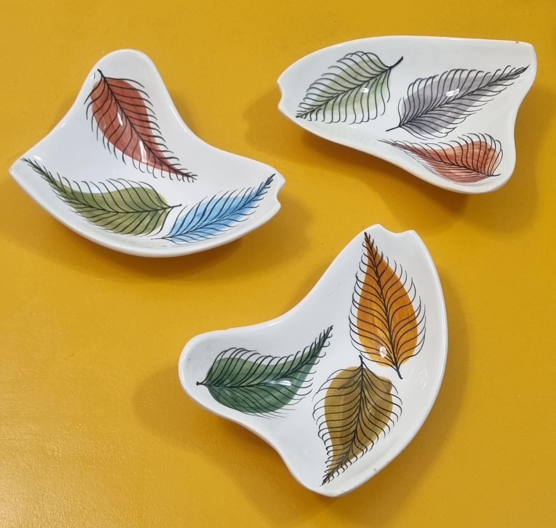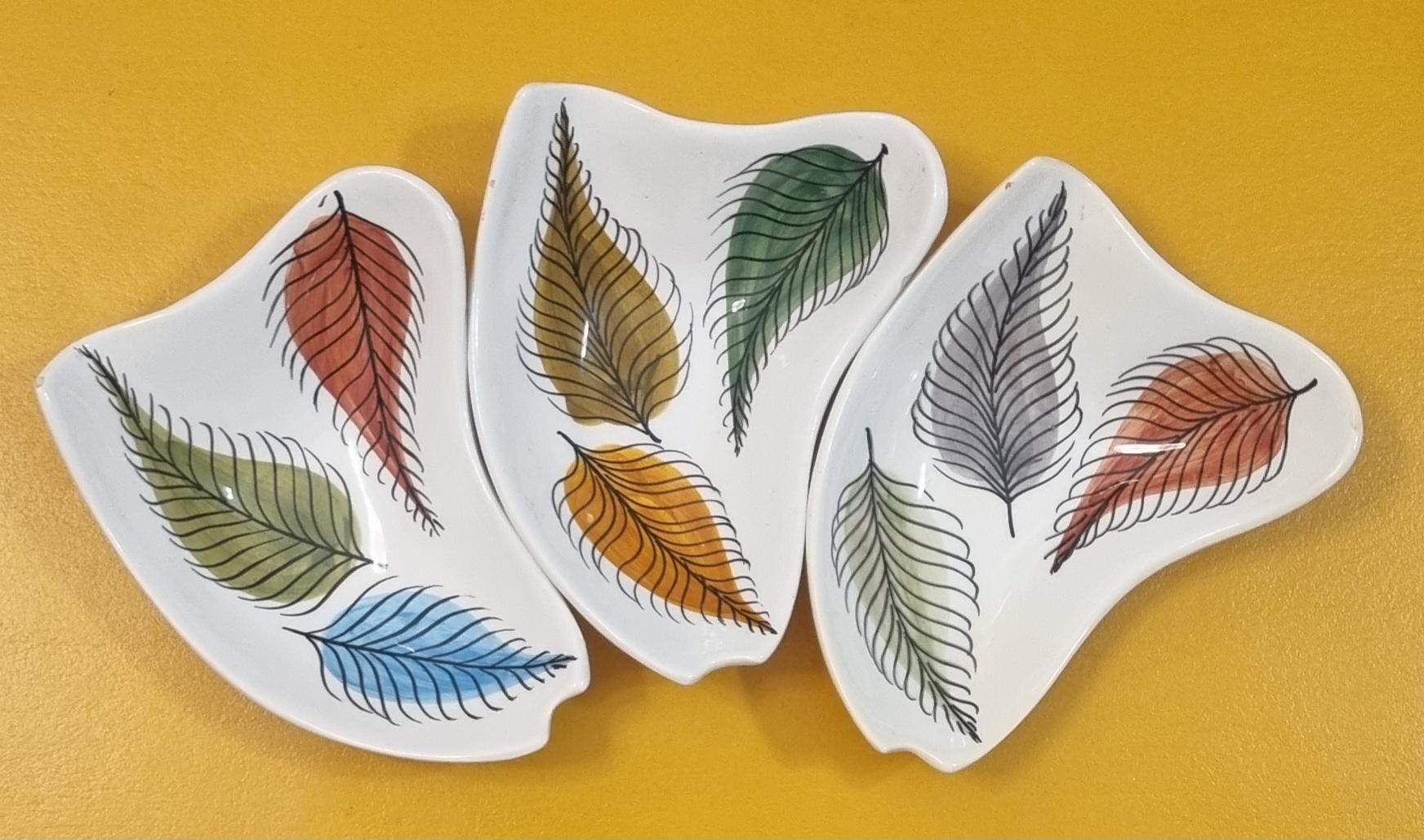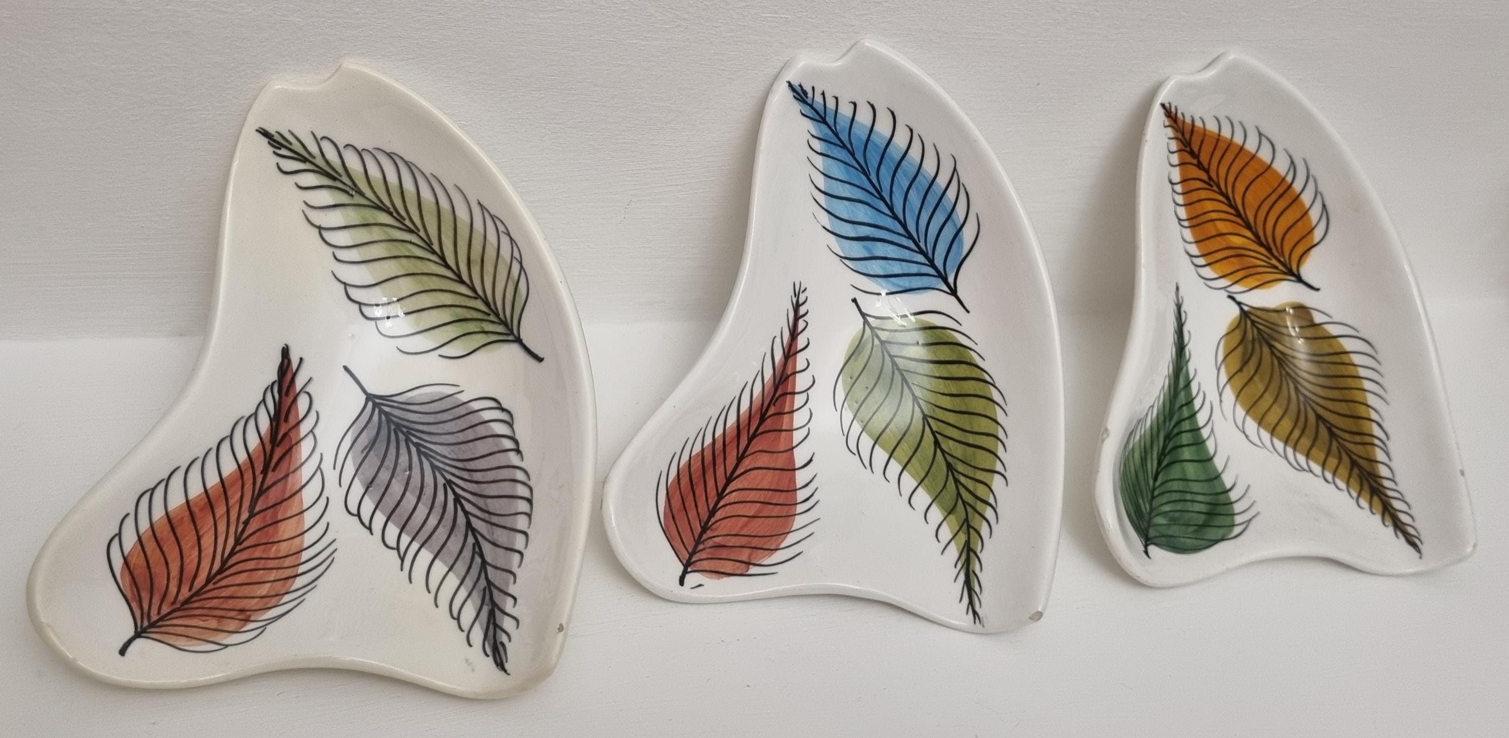 Mid century Italian freeform ceramic serving/snack/dishes/bowls. Wonderfully hand-painted in a colourful feather pattern. Very decorative and collectible and can be used to serve snacks or as display items. Signed and stamped 514 Italy on the base.