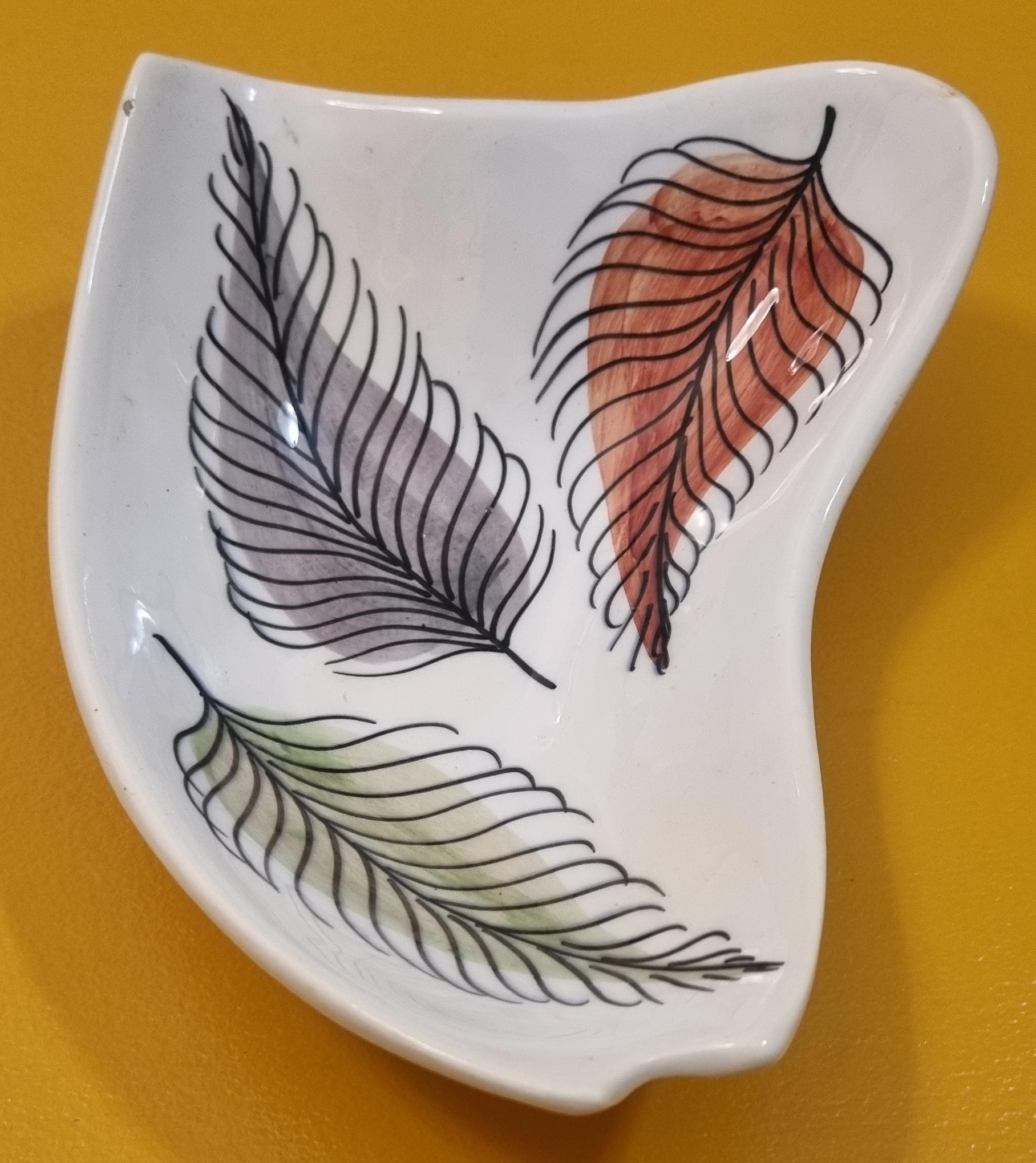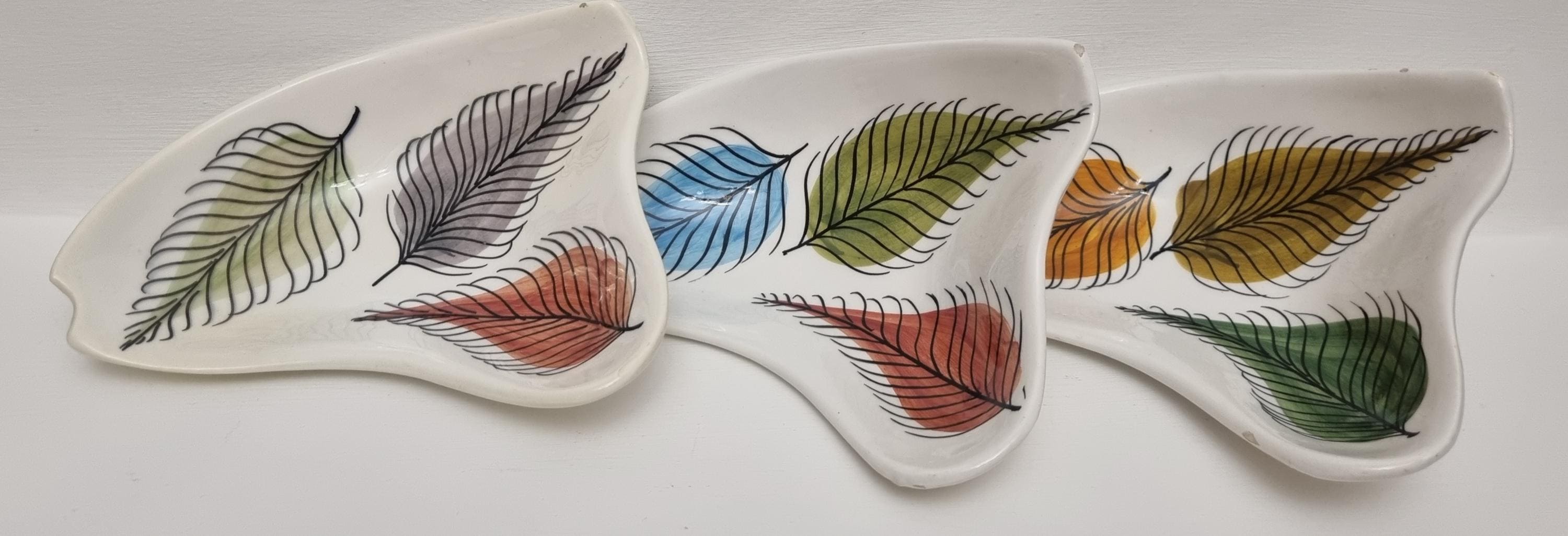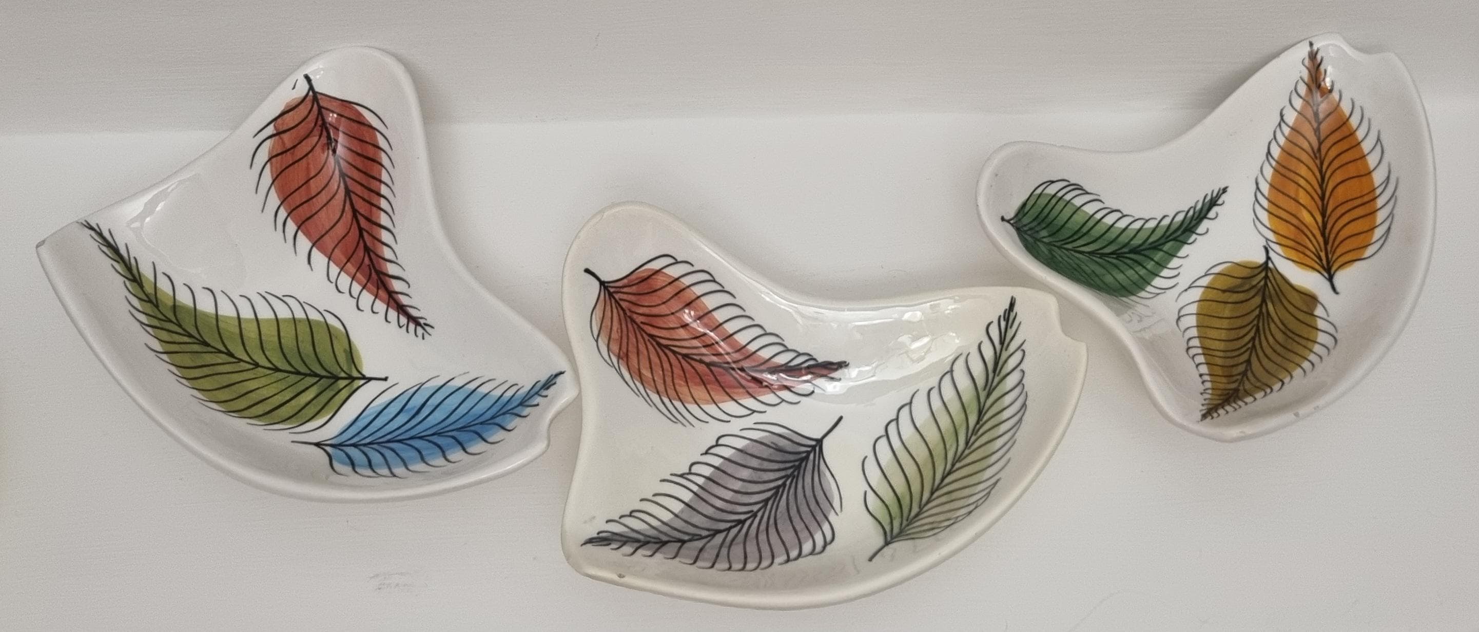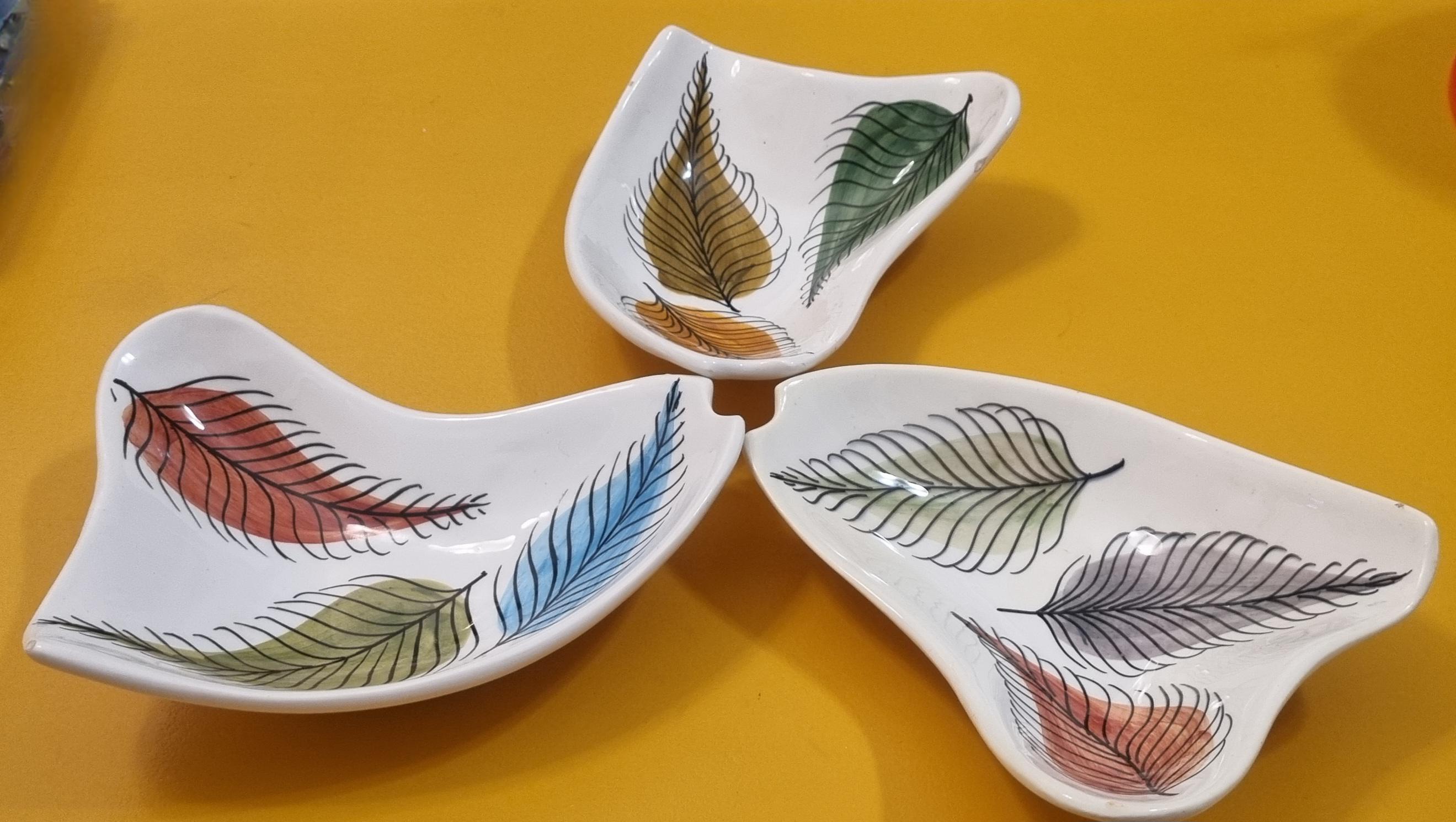 Mid century Italian freeform ceramic serving/snack/dishes/bowls. Wonderfully hand-painted in a colourful feather pattern. Very decorative and collectible and can be used to serve snacks or as display items. Signed and stamped 514 Italy on the base.