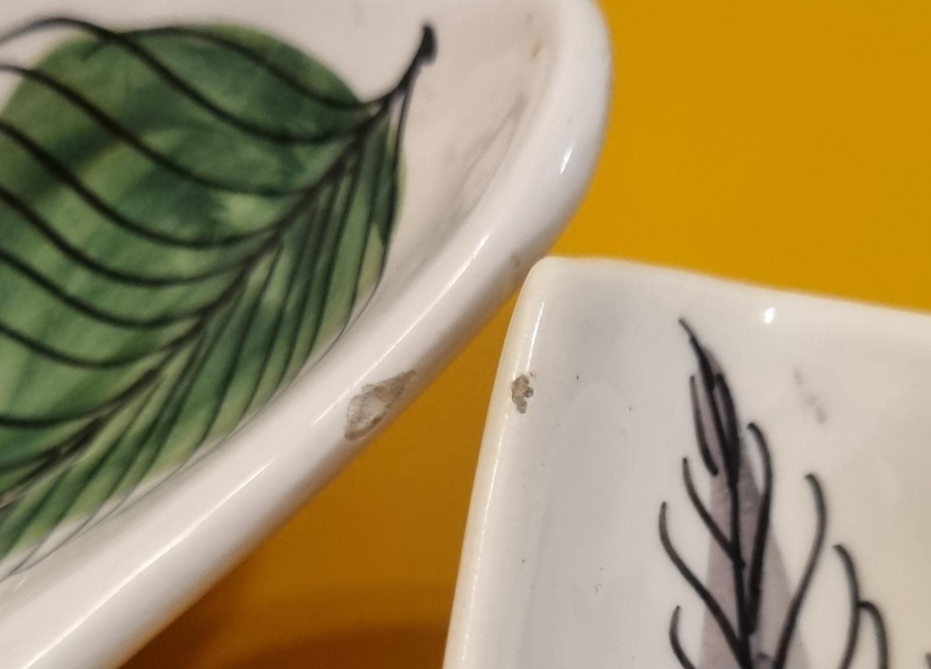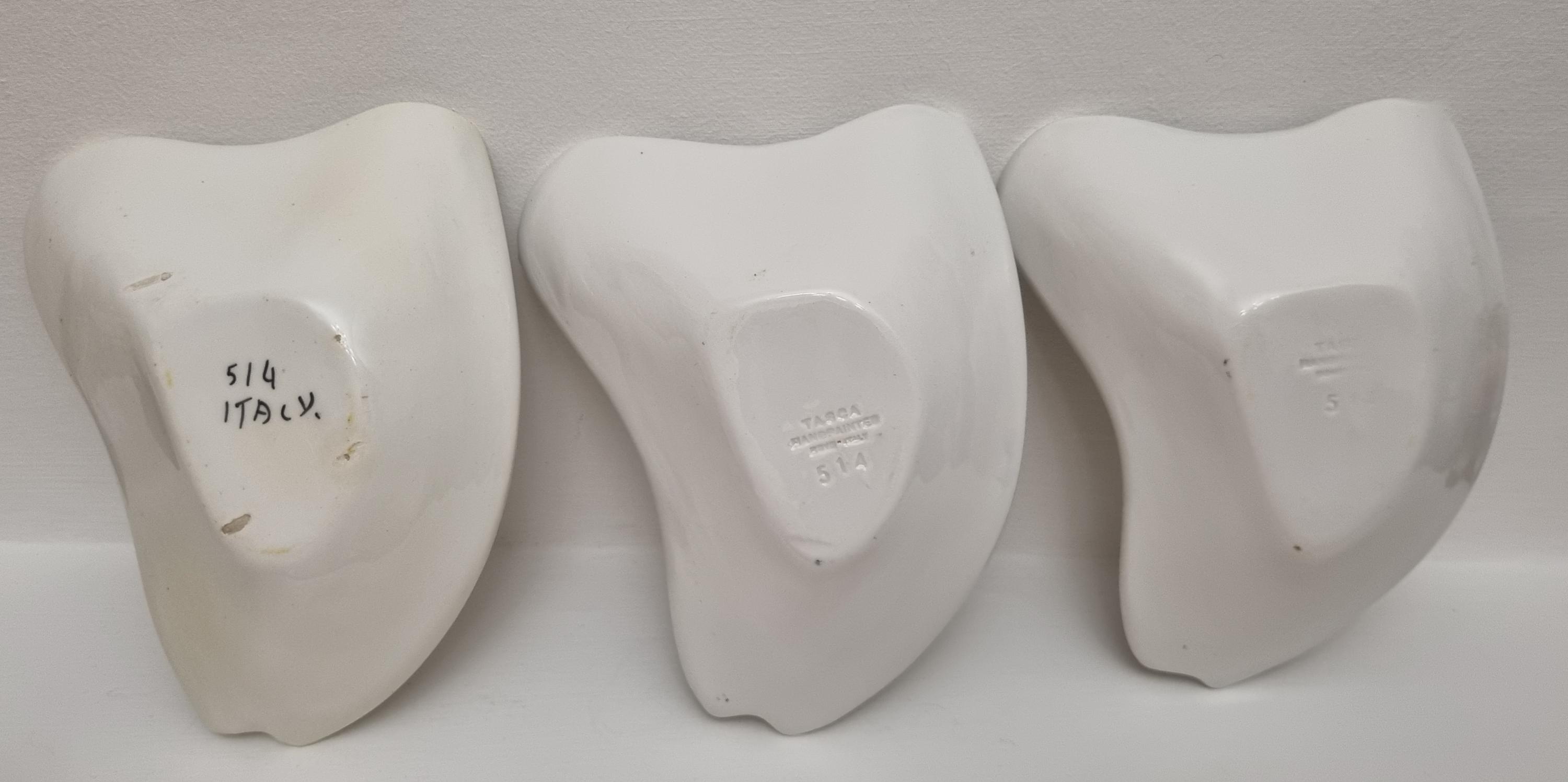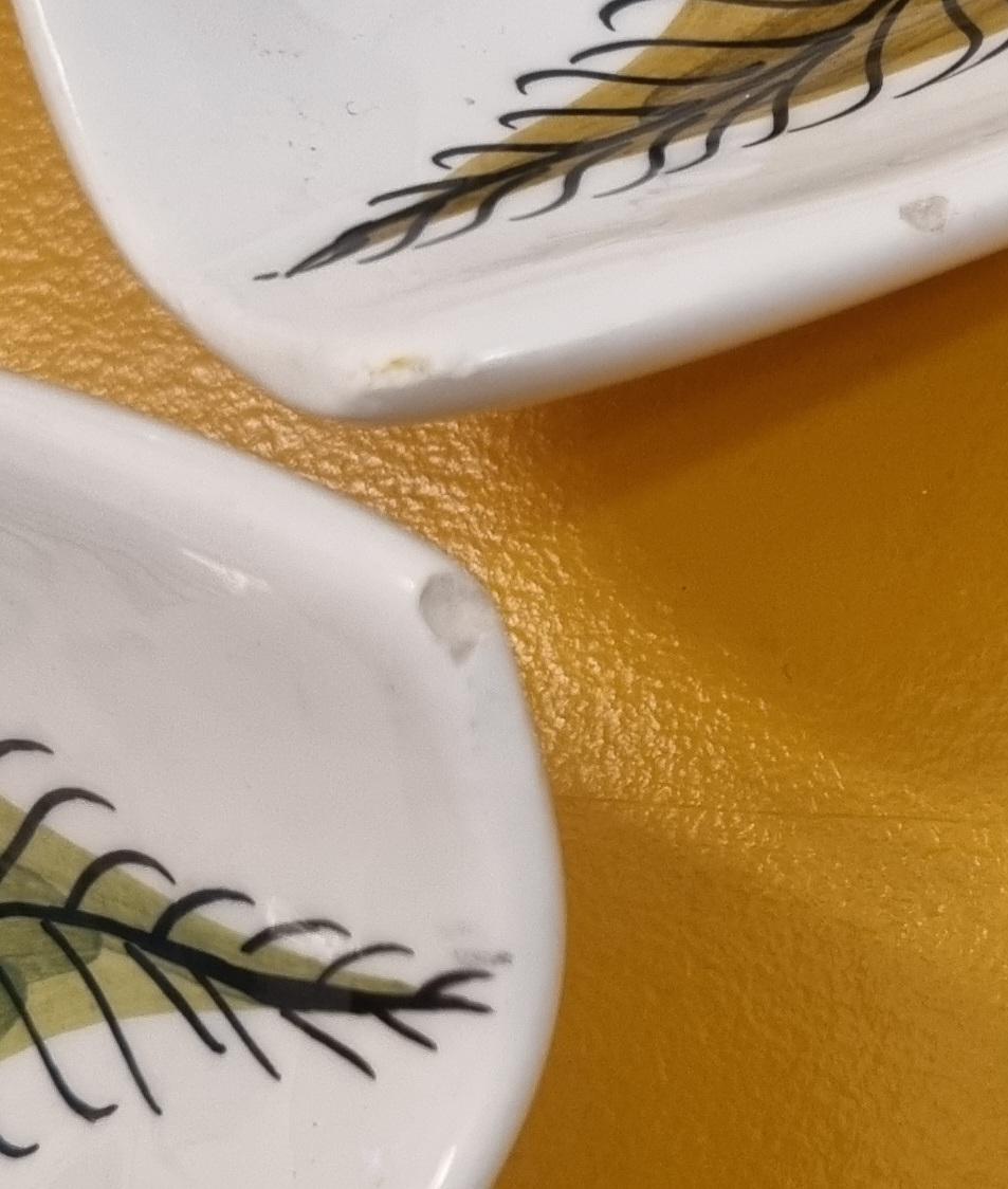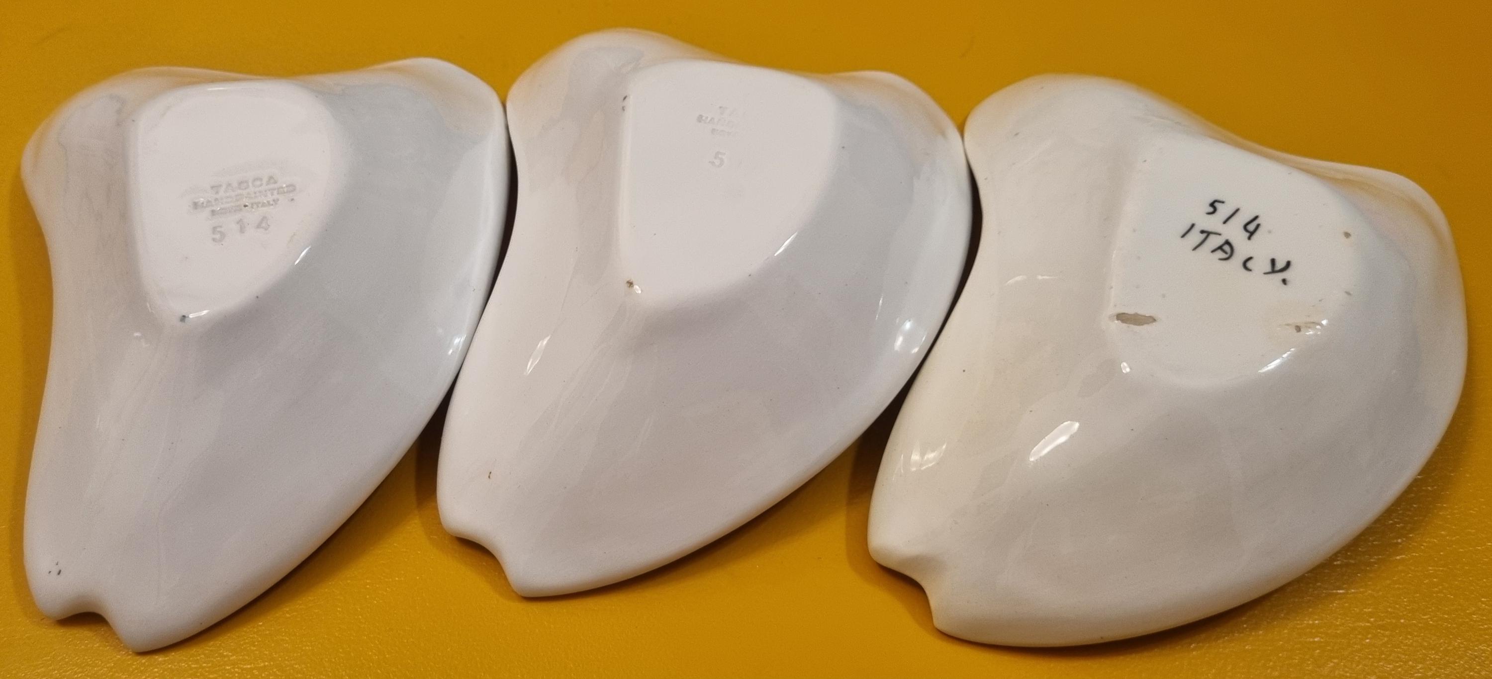 Mid century Italian freeform ceramic serving/snack/dishes/bowls. Wonderfully hand-painted in a colourful feather pattern. Very decorative and collectible and can be used to serve snacks or as display items. Signed and stamped 514 Italy on the base.